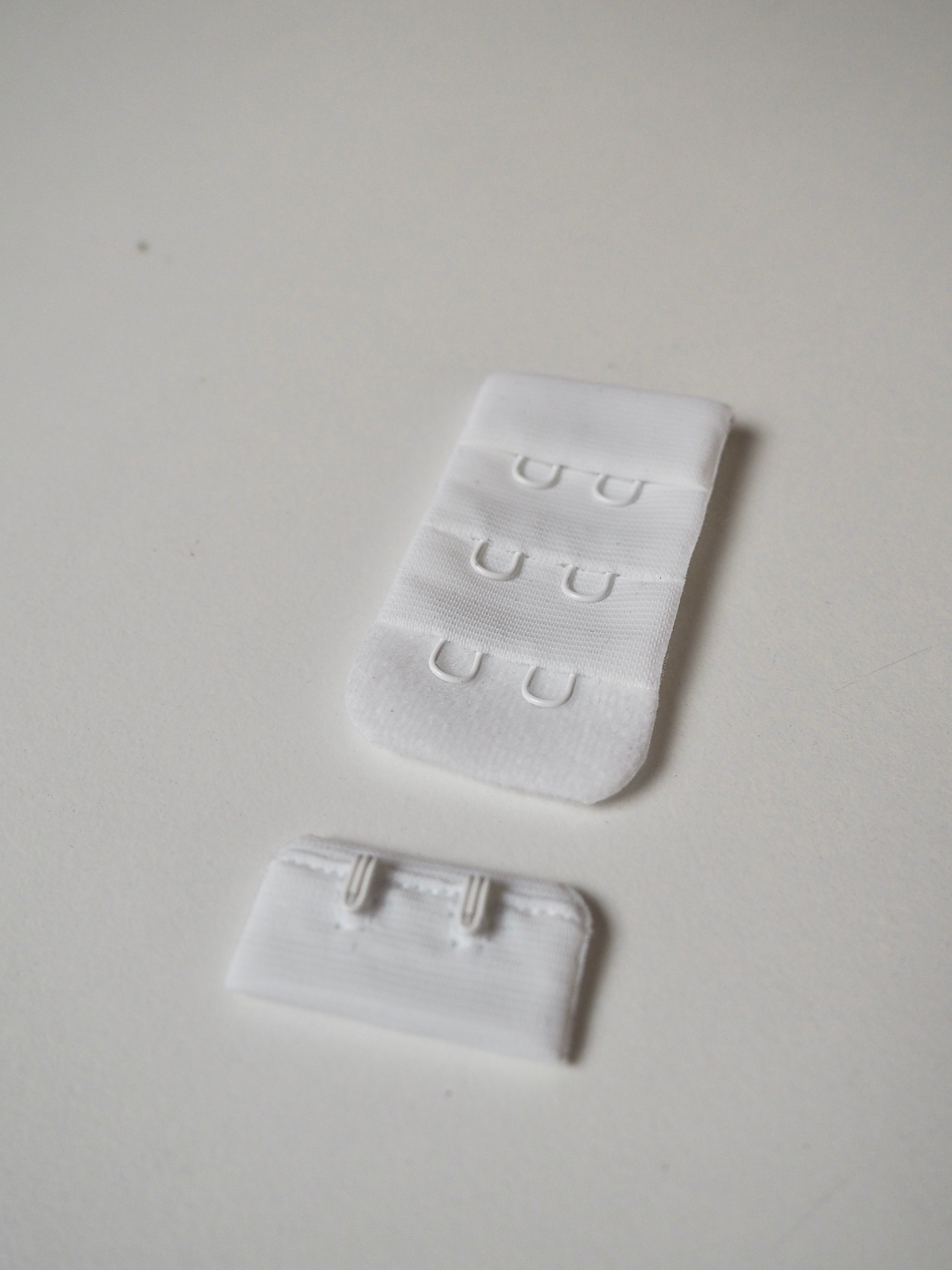 Bra hook and eye fastener. Plush material, soft to the touch. Three double hook and eyes give 4cm of adjustable length. One hook to three sets of eyes. Perfect for bra making!