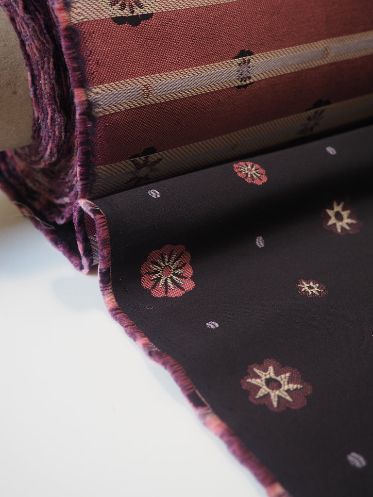 This ex-designer fabric is a unique jacquard. Green daisies are woven onto a black background on this stretch twill. It has a lovely twill texture, nice 10% stretch, and is light to medium weight. Has a great flexible structure to work with and slight sheen finish. Opaque, and great for a fancy dress or voluminous top!