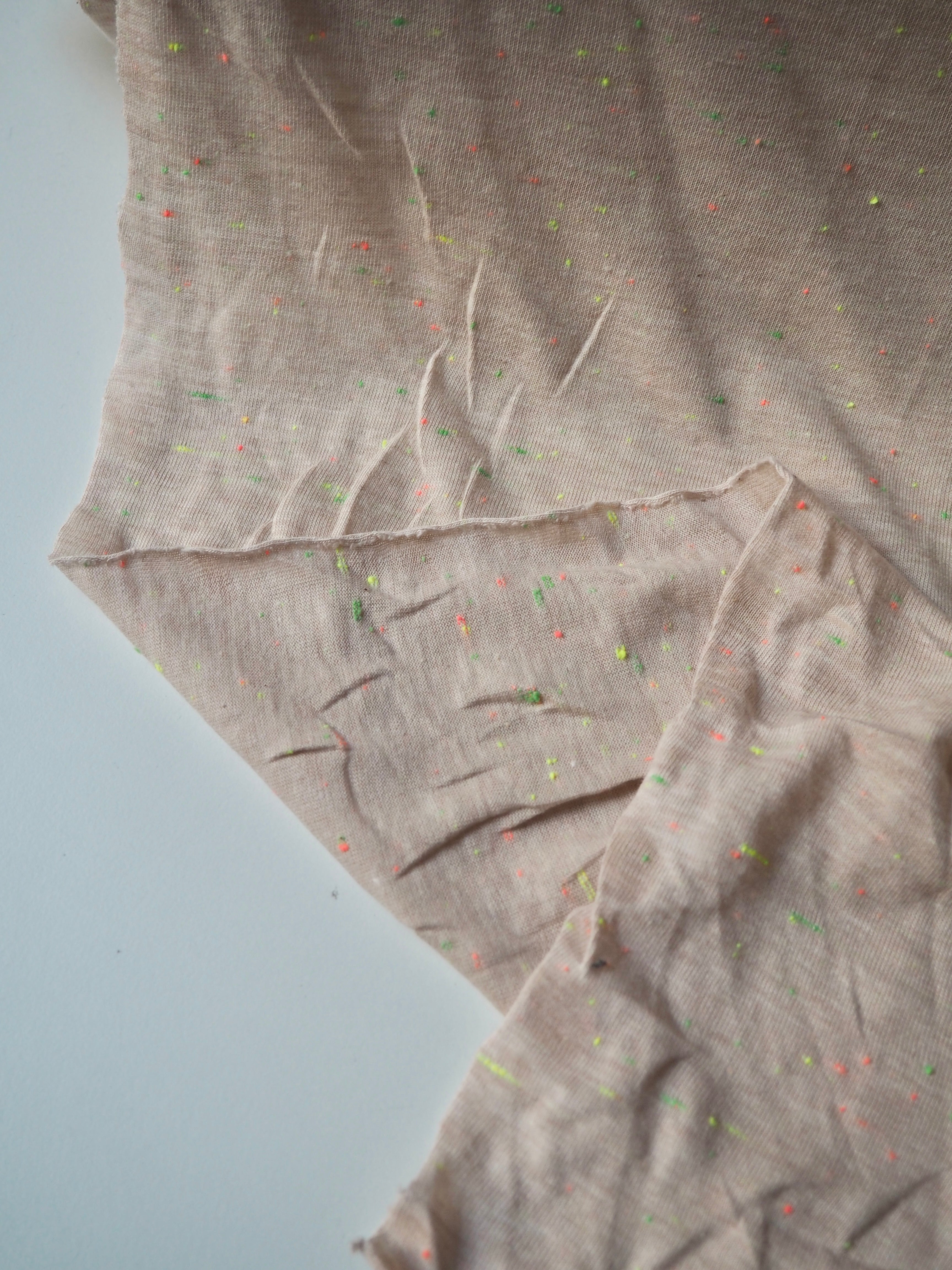 This ex-designer fabric is a cotton jersey. It's in a fun confetti dotted colourway on a blush apricot background. It is lightweight with a soft, gentle drape. It has a single jersey t-shirt weave with a 30-40% stretch width-ways, and about 10% length ways. Mostly opaque but a little sheer due to colour, and ideal for everyday basics, would make a great classic t-shirt! From British designer Stalf Studio.