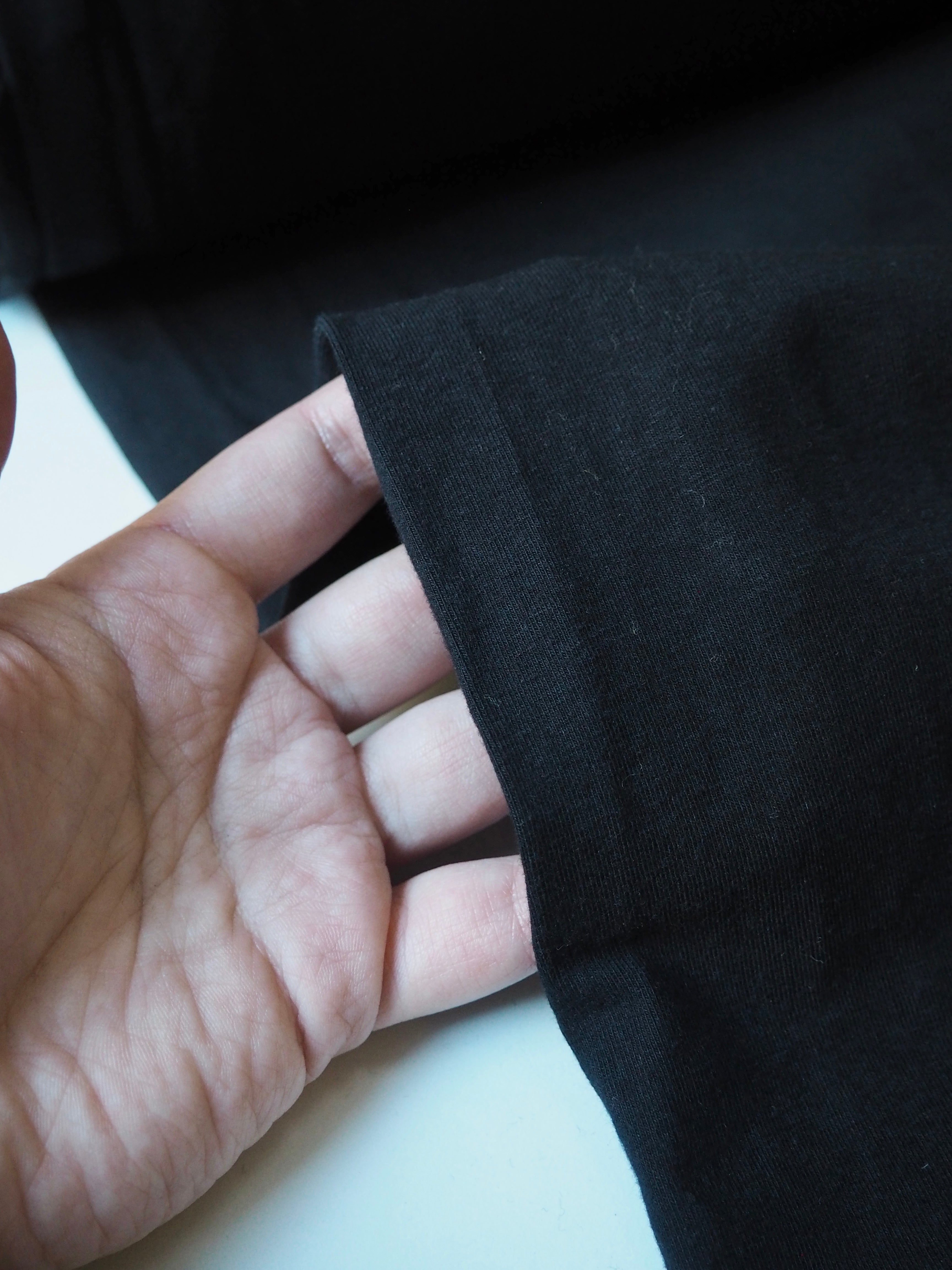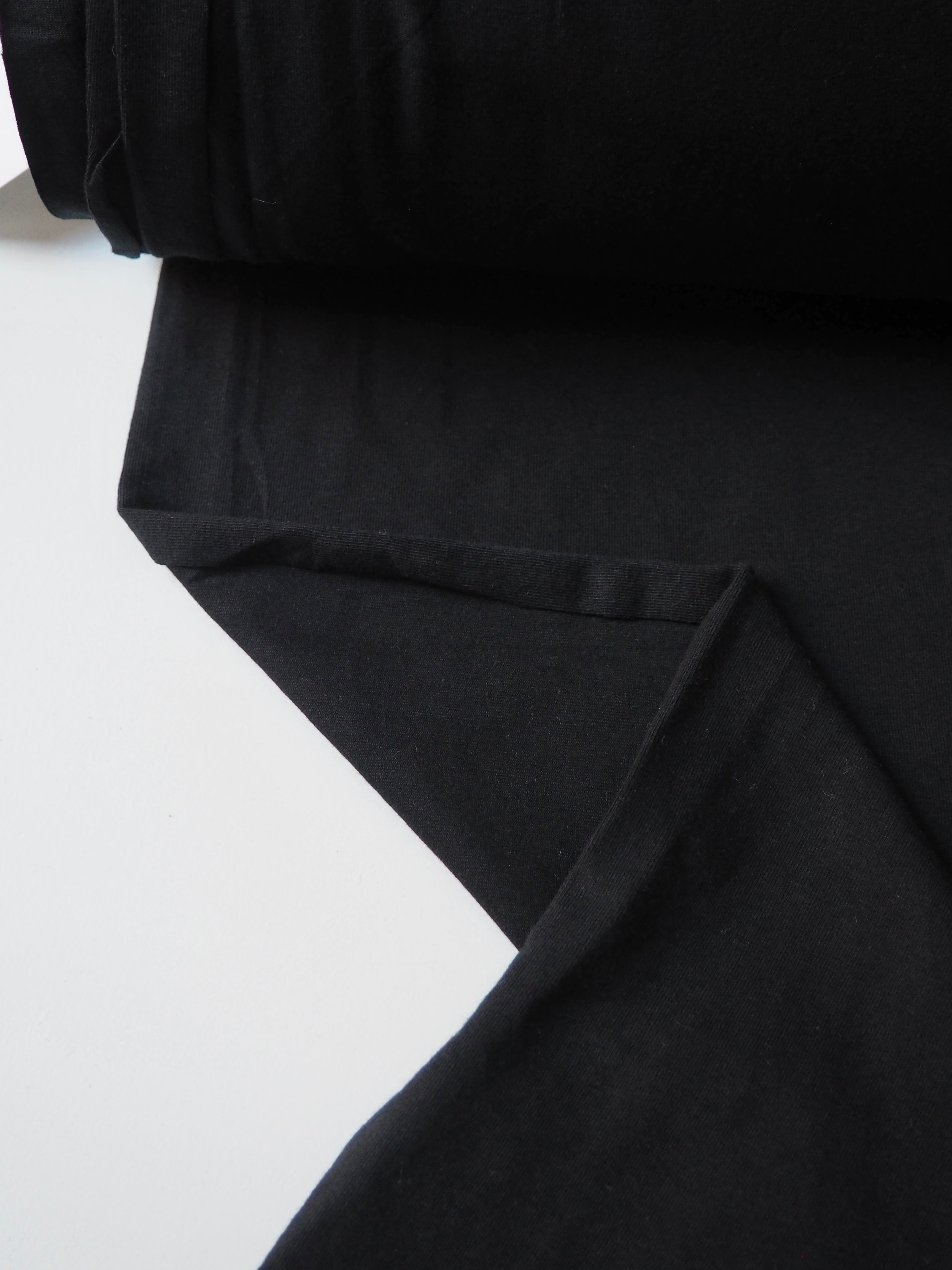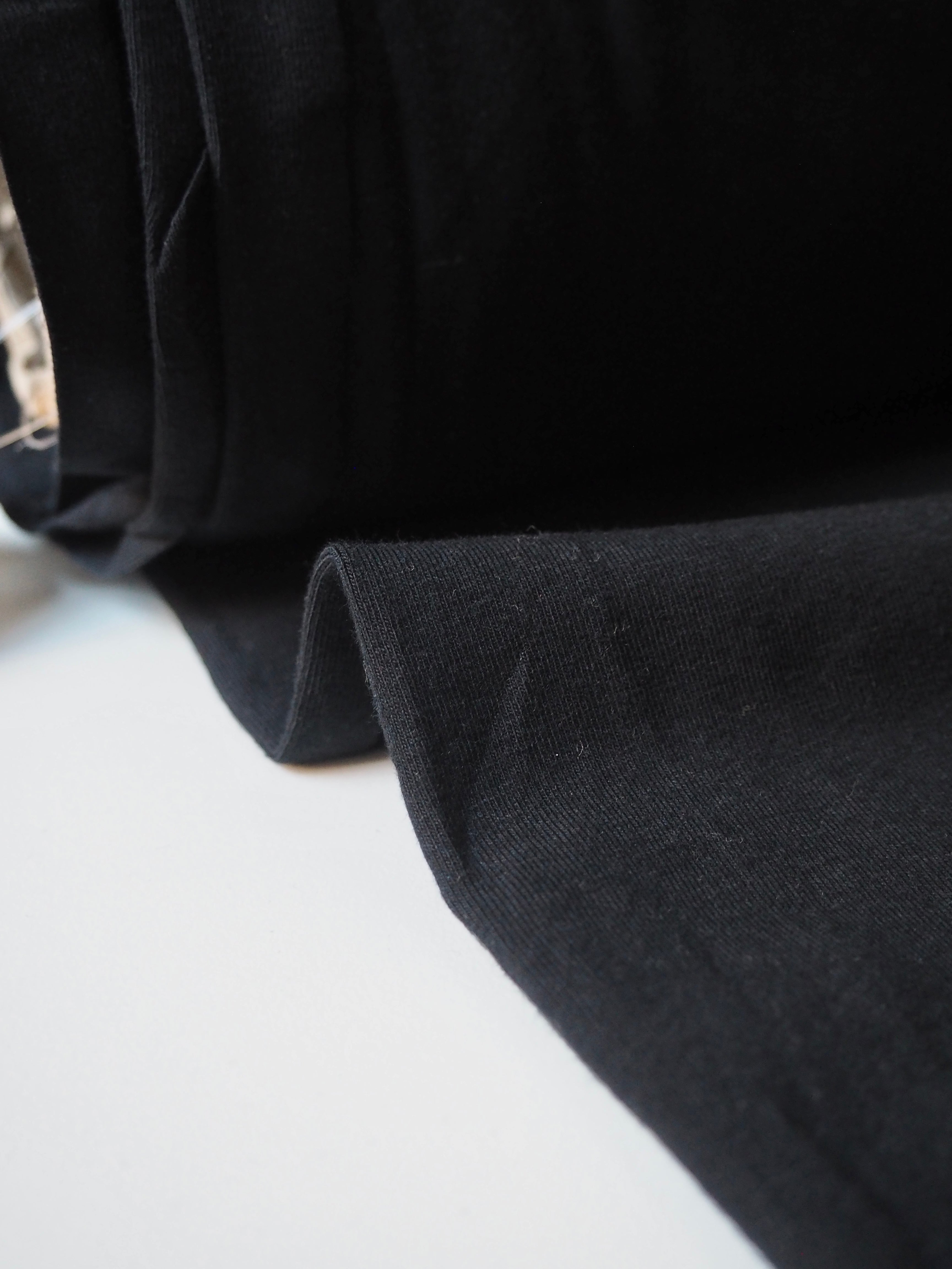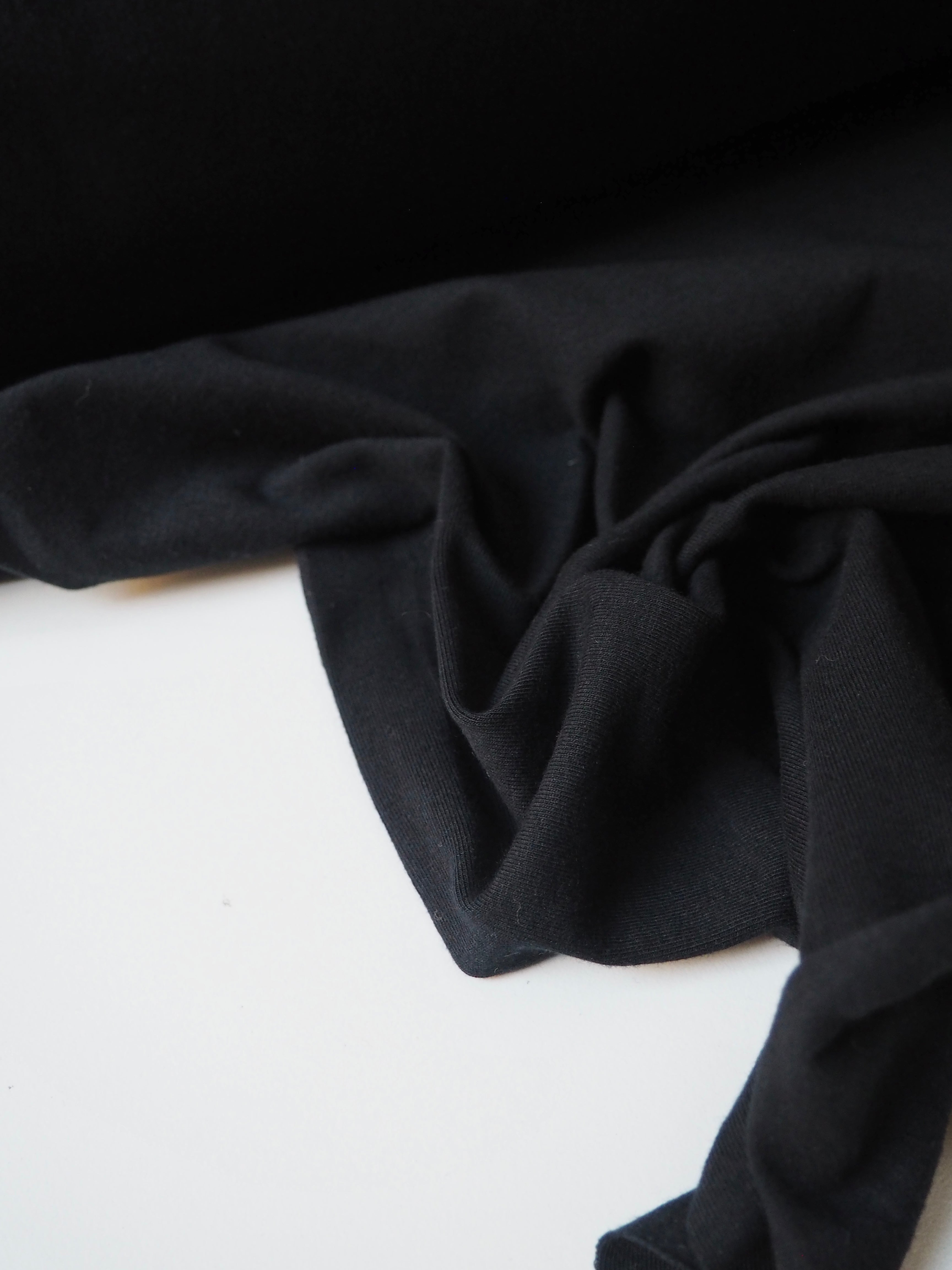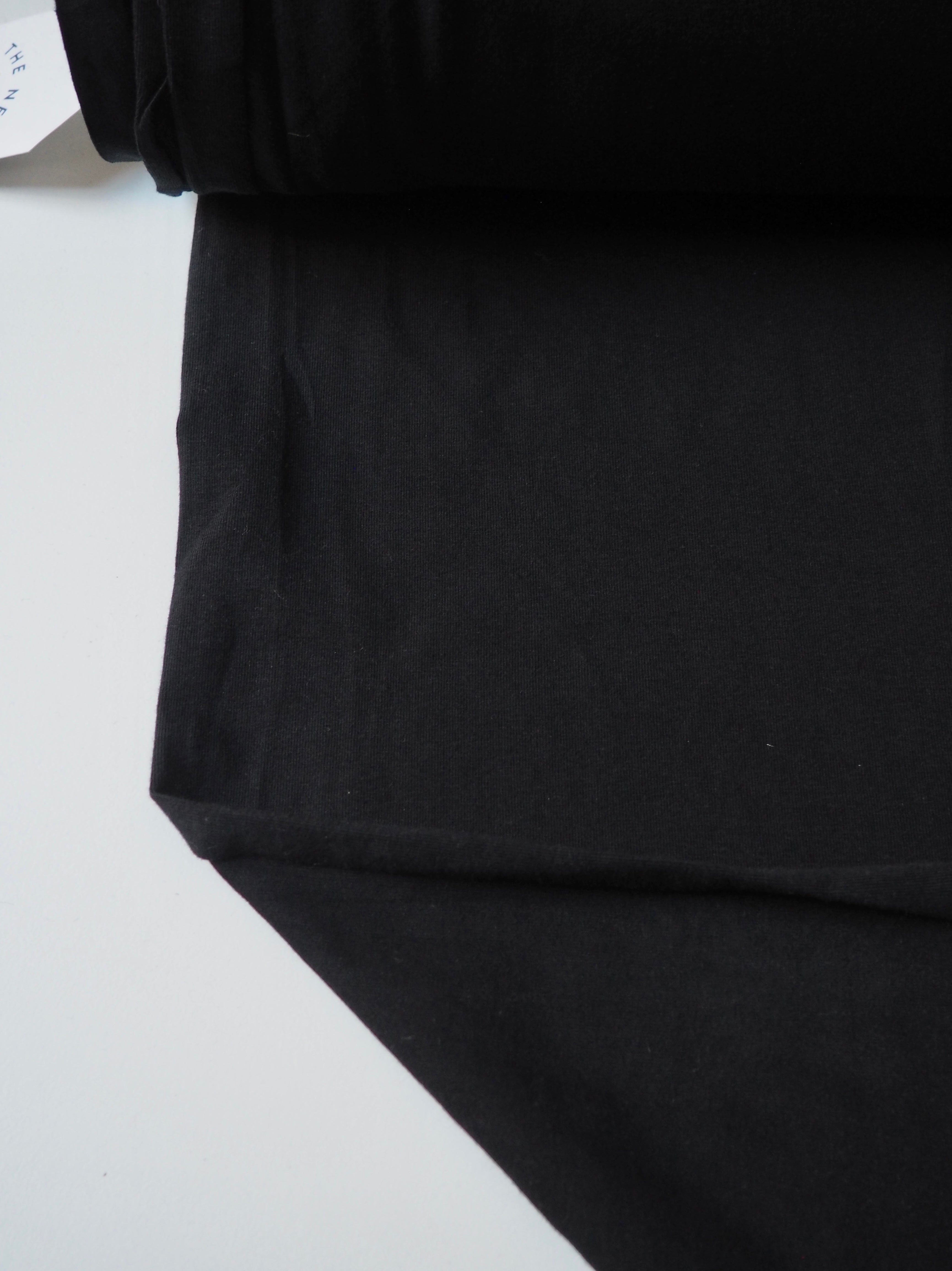 This ex-designer fabric is a cotton jersey. It is lightweight with a soft, gentle drape. It has a single jersey t-shirt weave with a great 40-50% stretch. Opaque and ideal for everyday basics, would make a great classic t-shirt!