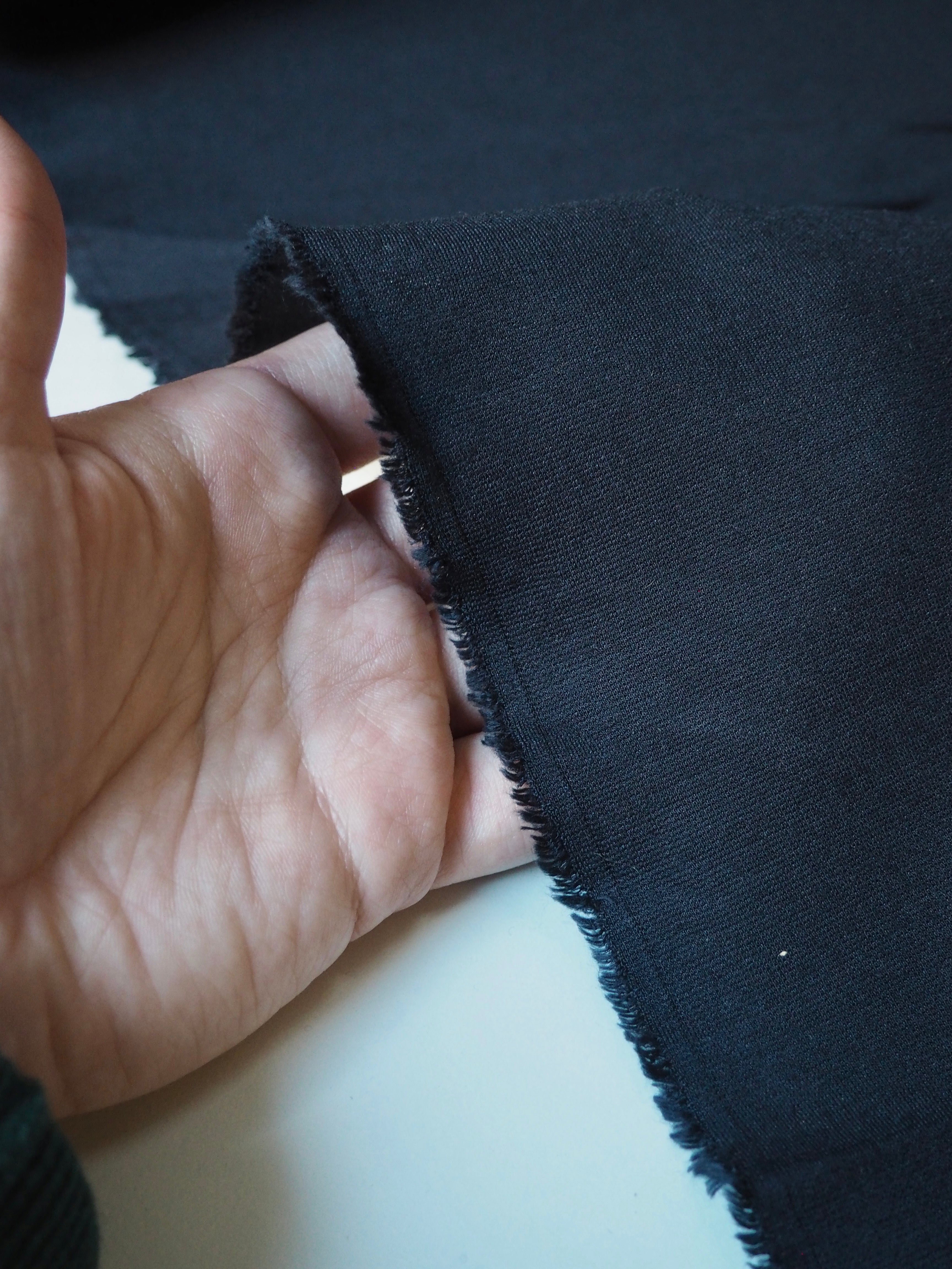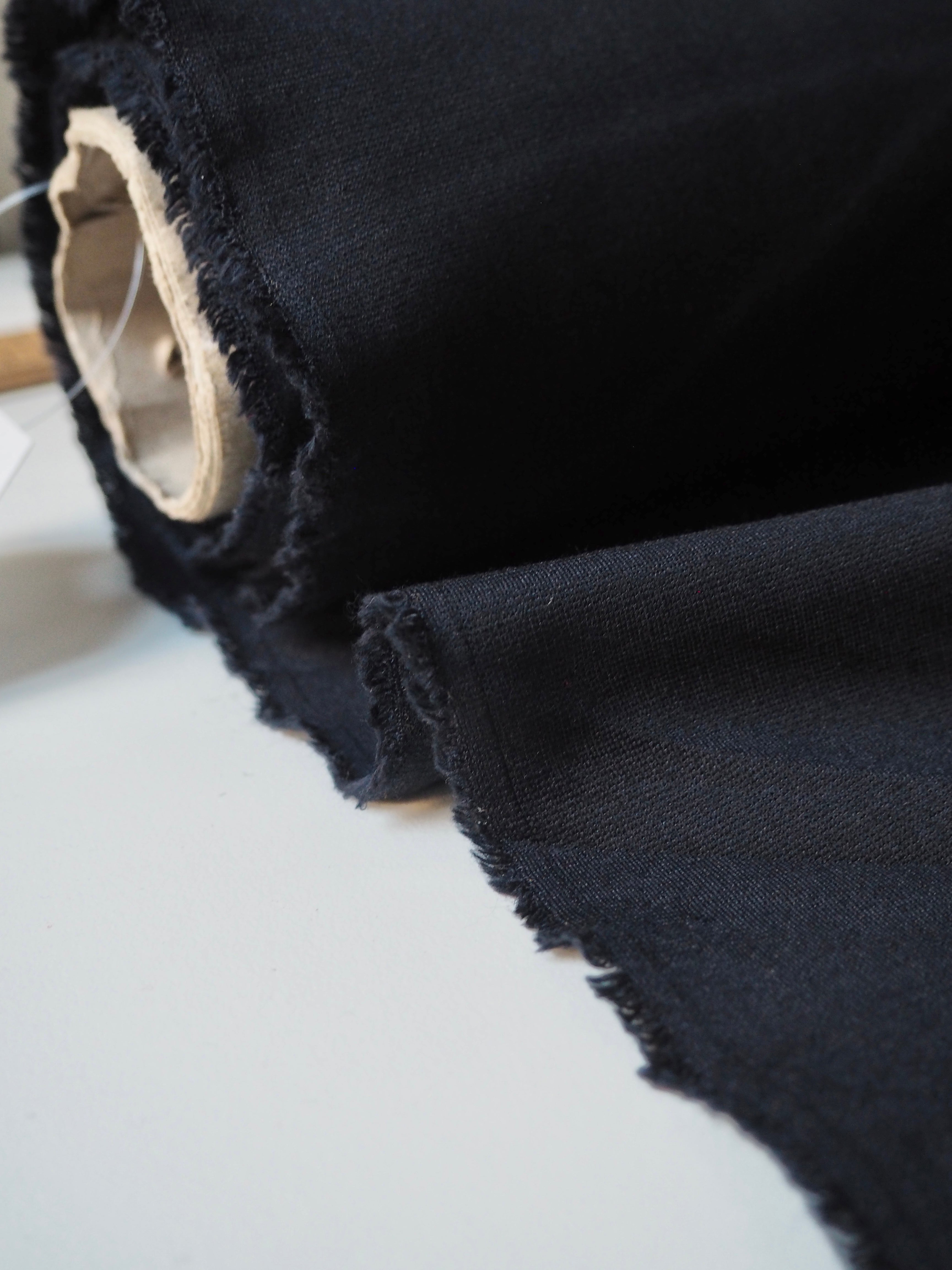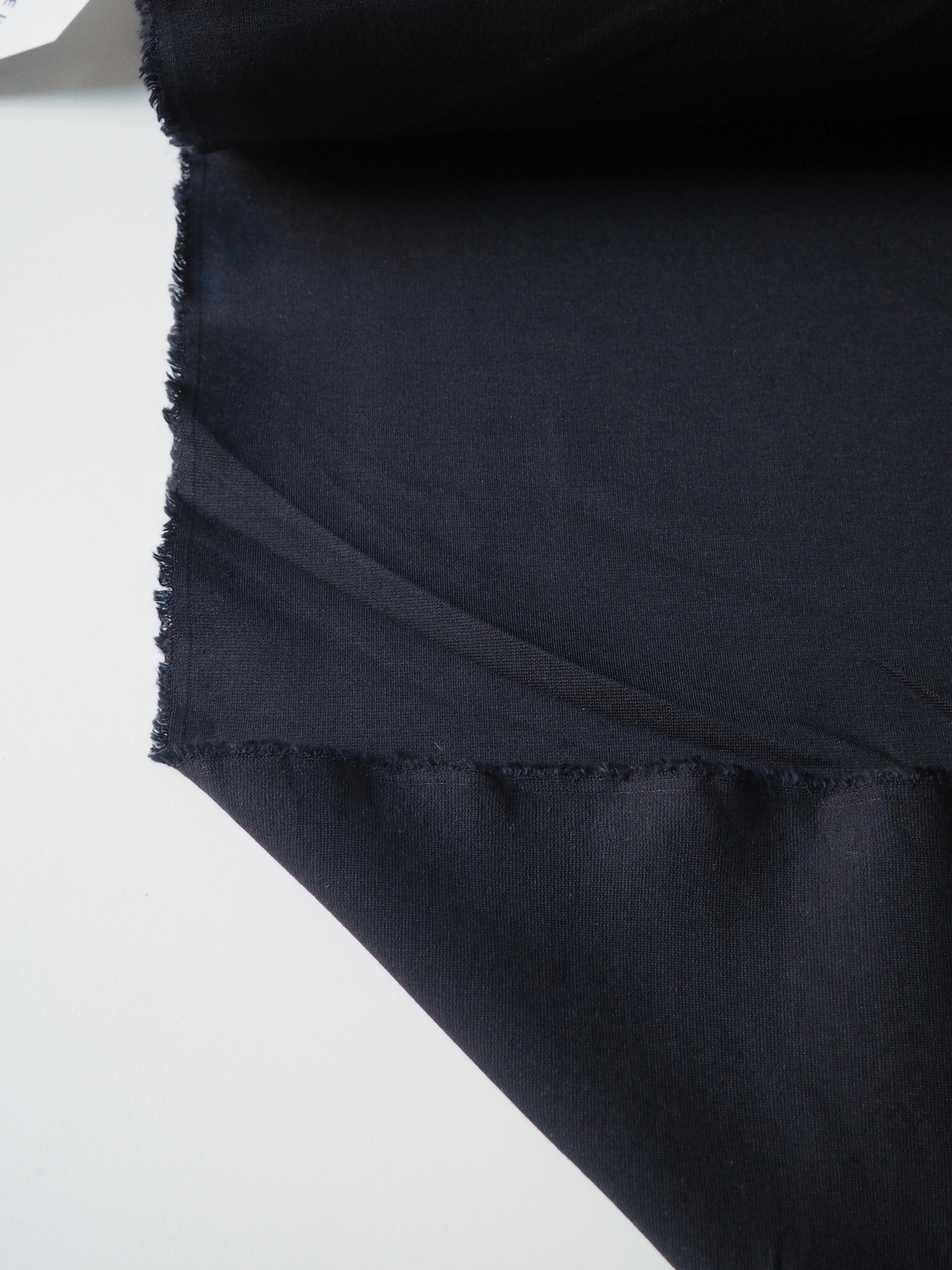This ex-designer fabric is a jersey. Ponte di Roma is a double interlock jersey with a medium weight. It's quite dense, and has a great structure to play with. It has a very soft and lovely handle. Has a good 40% stretch both ways, and great recovery. Perfect for staple pieces!