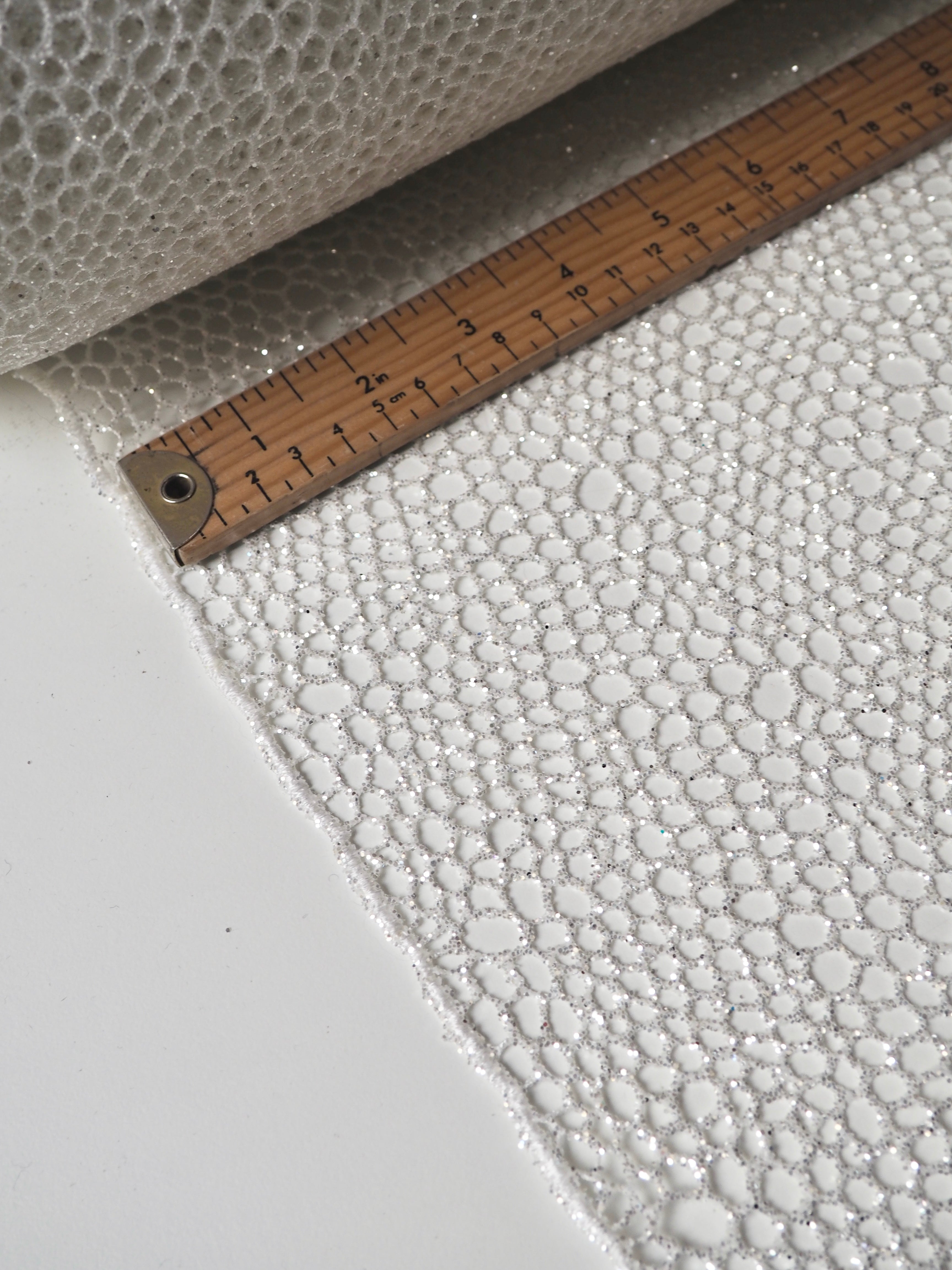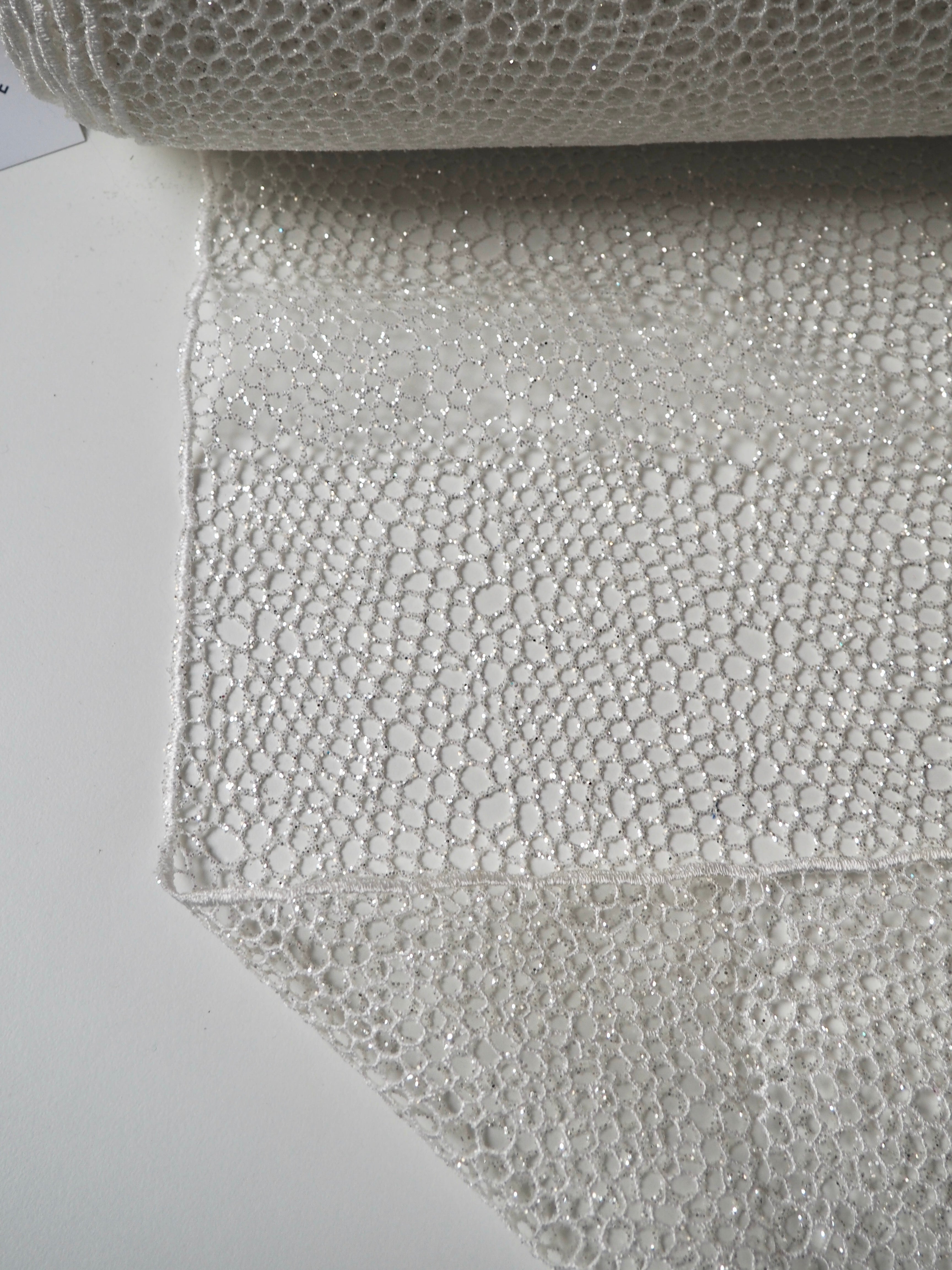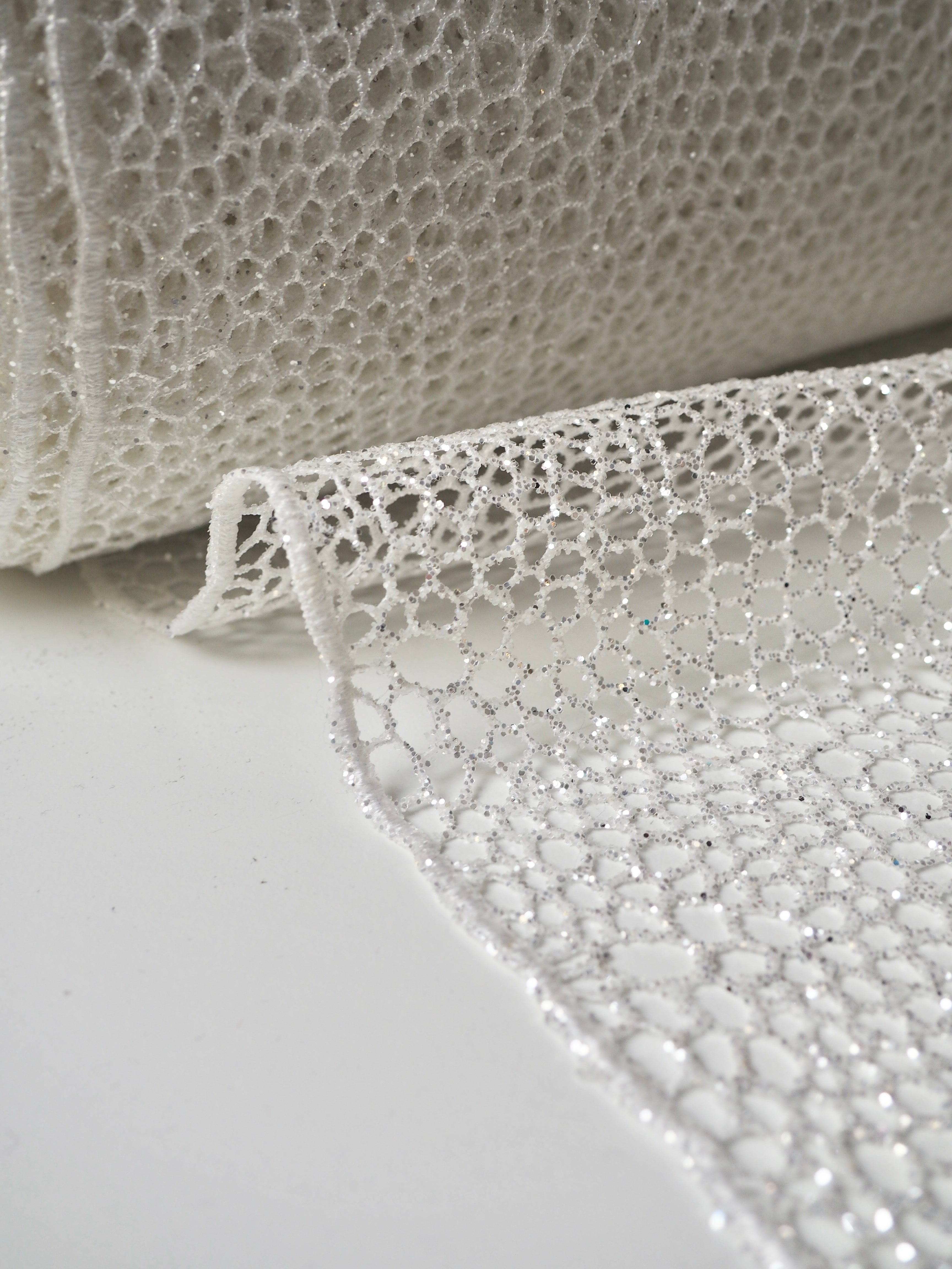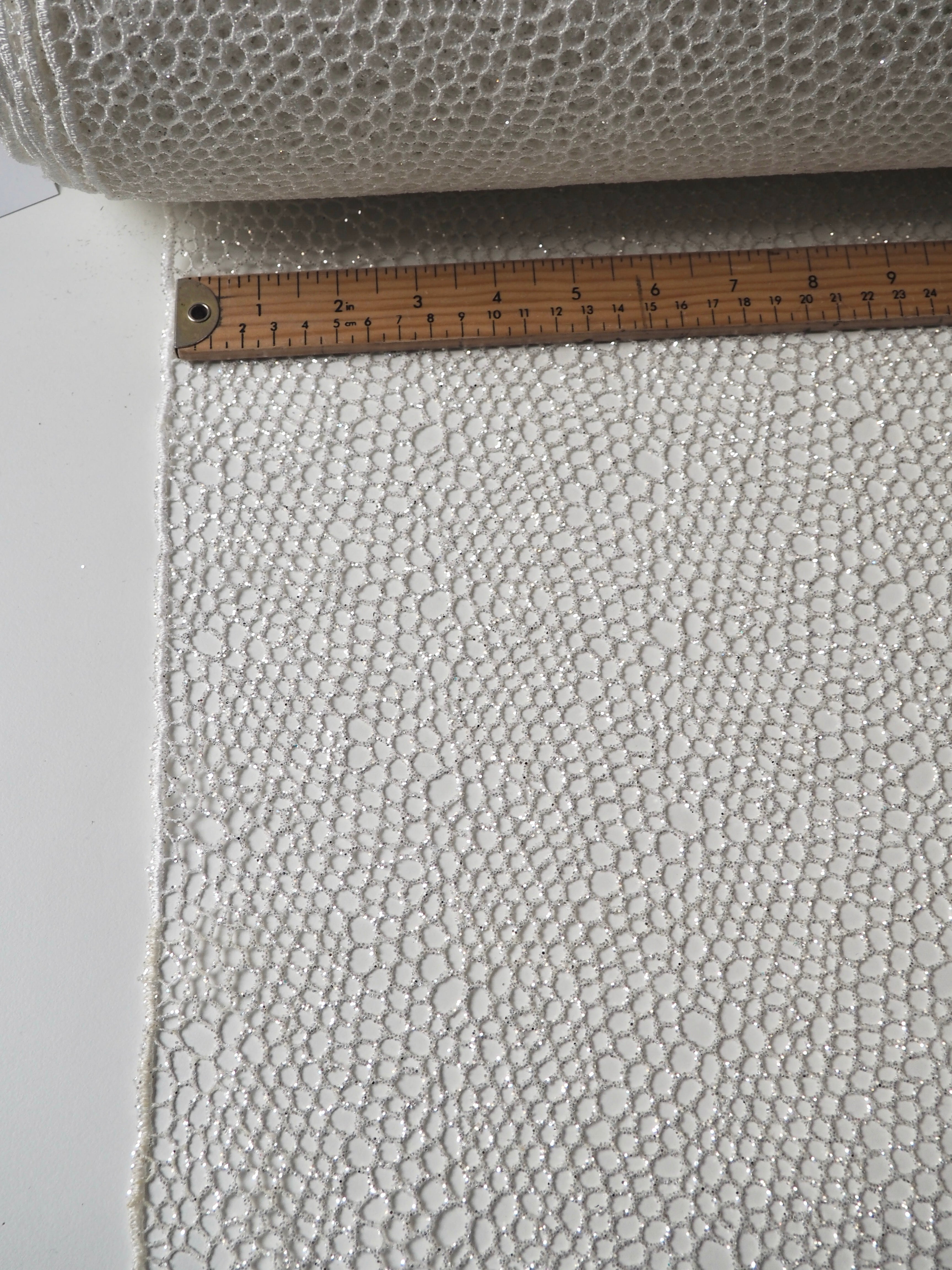 This ex-designer fabric is a unique netting. It's a white guipure-like lace, but more similar to a netting, with a glittered finish. It's light to medium weight, with an interesting structure to play with. Has a great thickness. It has a sturdy handle, but the glitter does shed onto hands and surfaces as you move it around. Can easily be sprayed with adhesive to stay in place! Great as an overlay, or to be used for a sheer top, or even a bag!