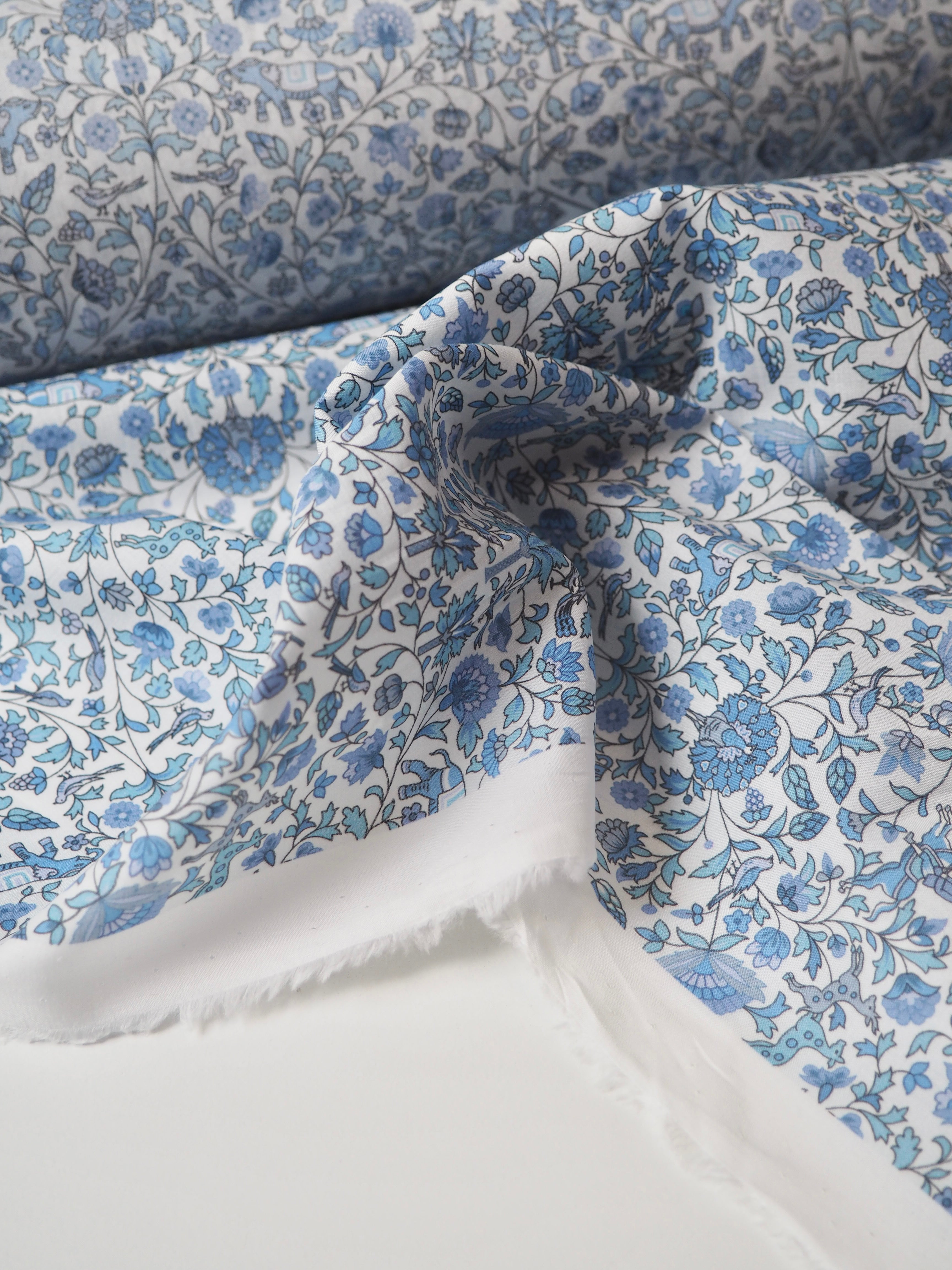 This ex-designer fabric is a classic Liberty Tana Lawn. It's in a classic light blue and white Imran print of elephants, peacocks, and leaves. A top-quality Liberty cotton, and super lightweight! Soft with a lovely drape and slight crispness. Has a wonderful cotton handle. Mostly opaque but lets a little light in. We would love to see it in a blouse or even for quilting!
