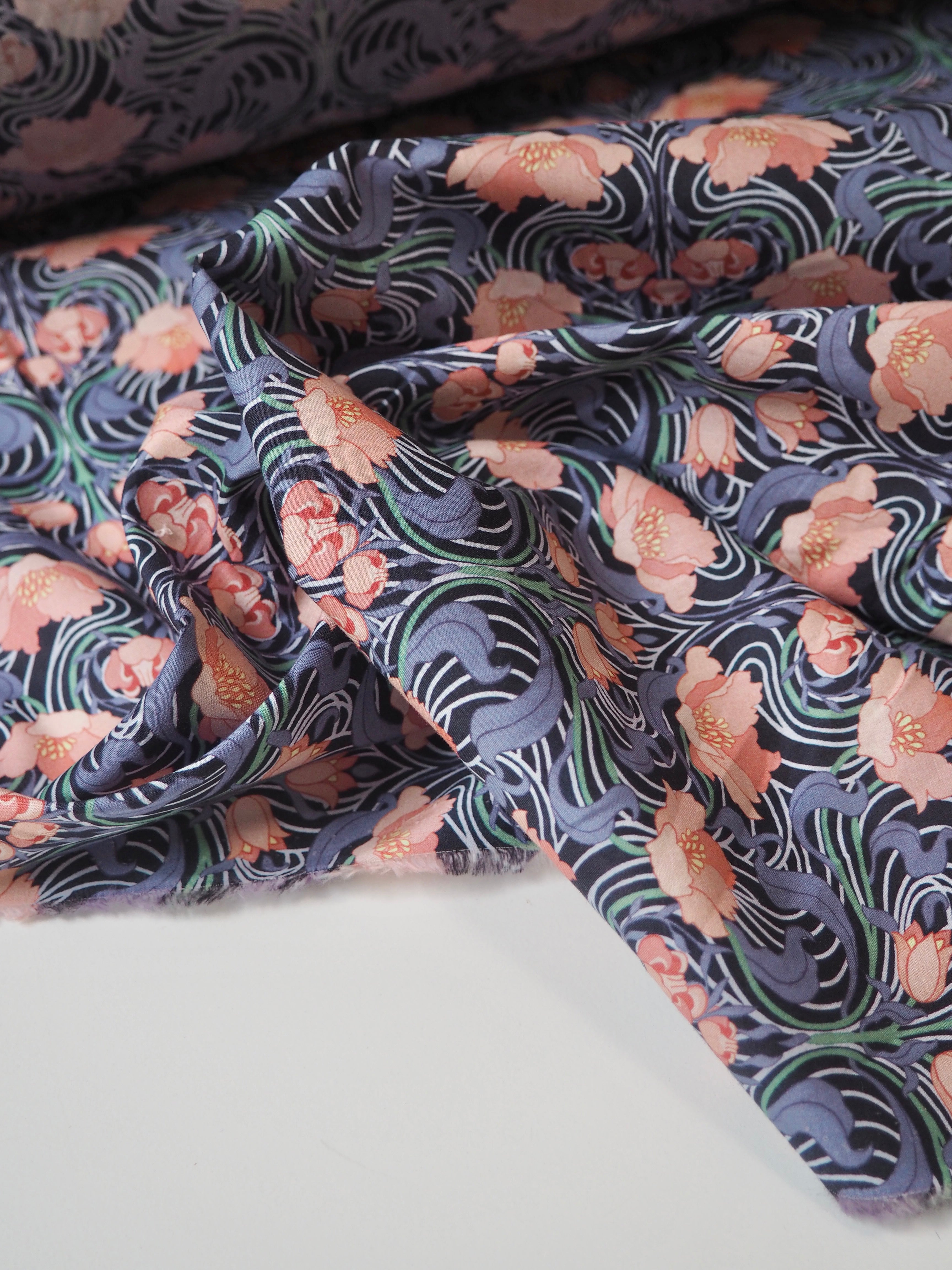 This ex-designer fabric is a classic Liberty Tana Lawn. It's in a swirling blue and pink tulip and floral colourway. A top-quality Liberty cotton, and super lightweight! Soft with a lovely drape and slight crispness. Has a wonderful cotton handle. Mostly opaque but lets a little light in. We would love to see it in a blouse or even for quilting!