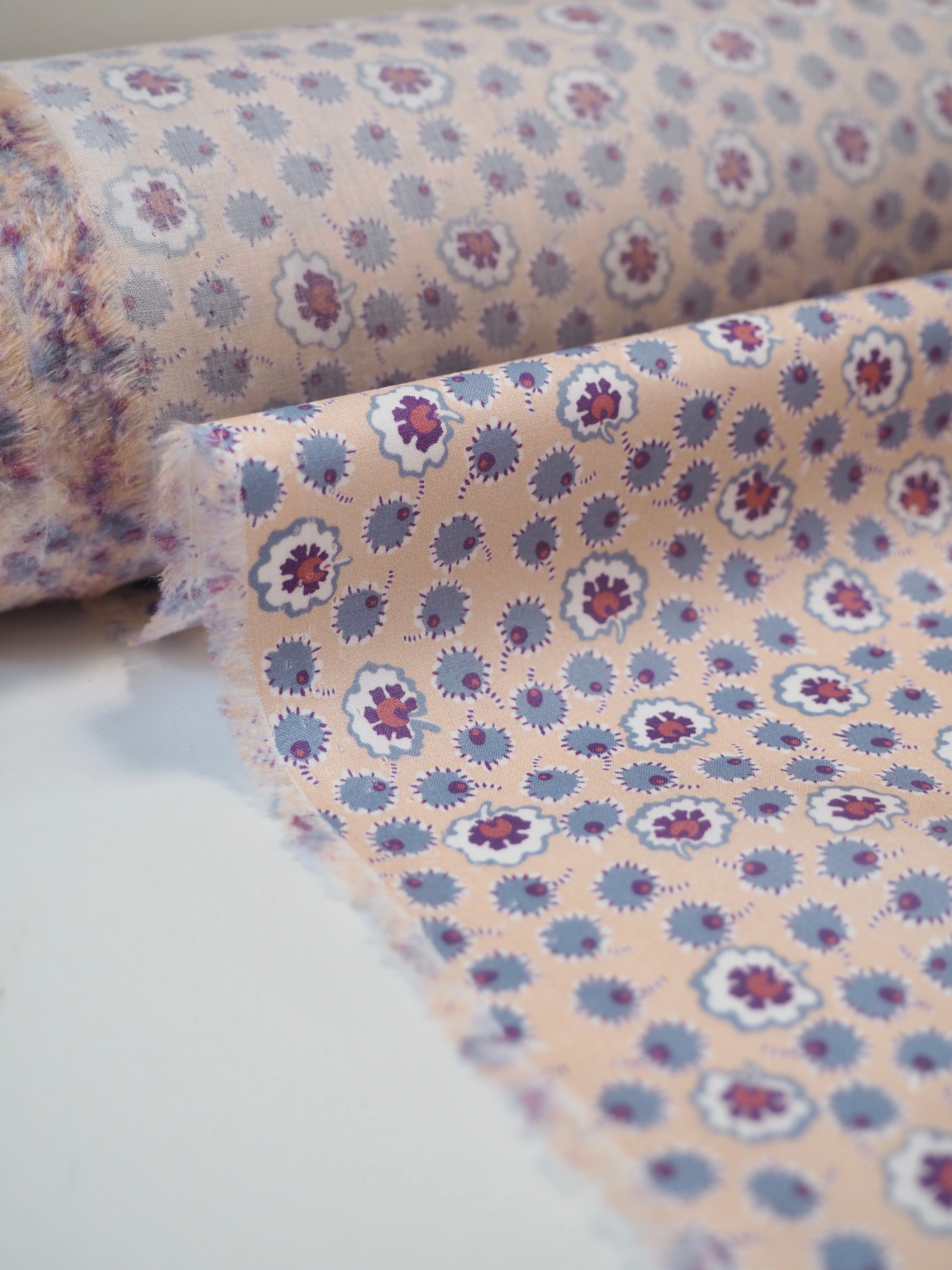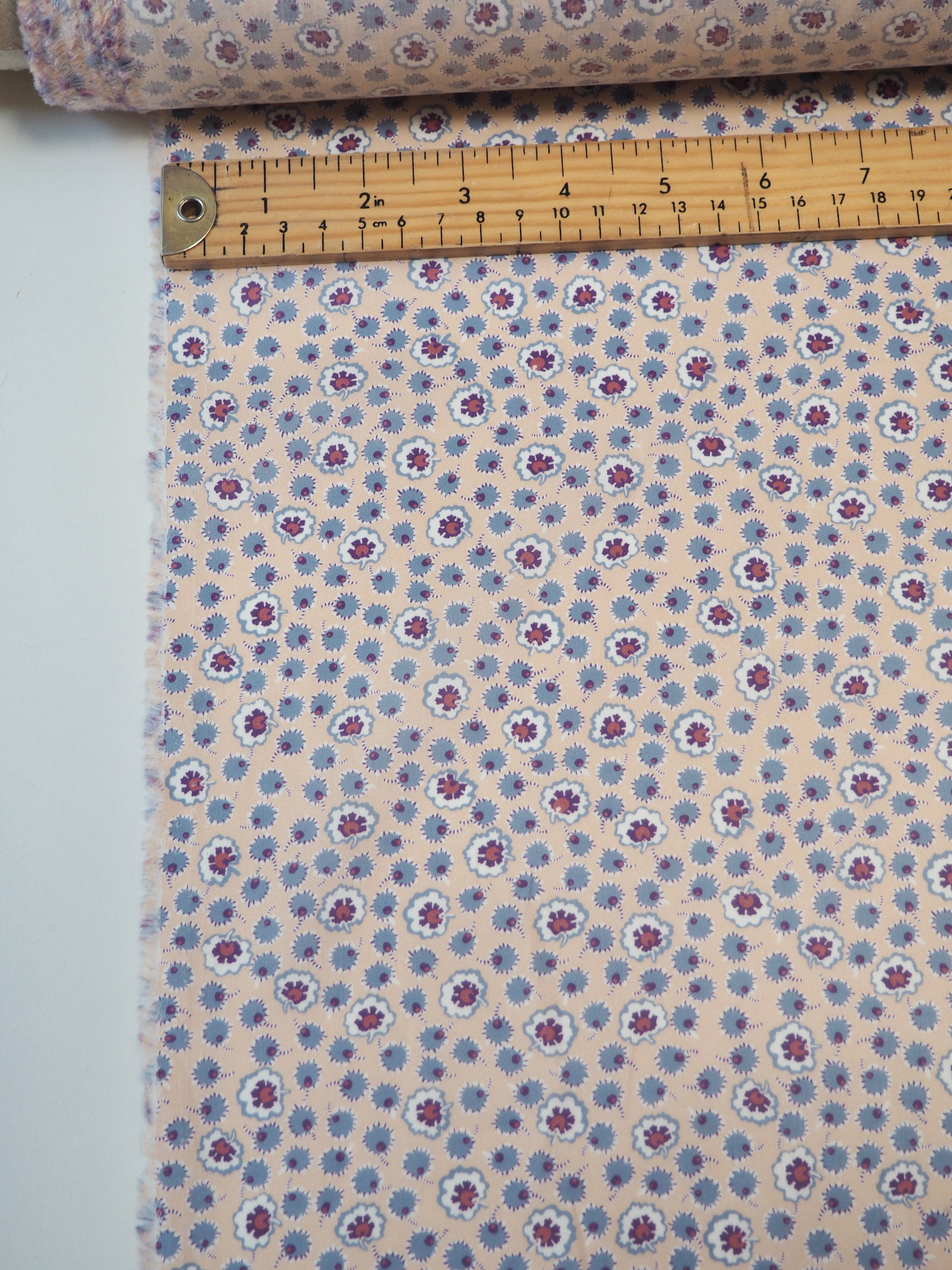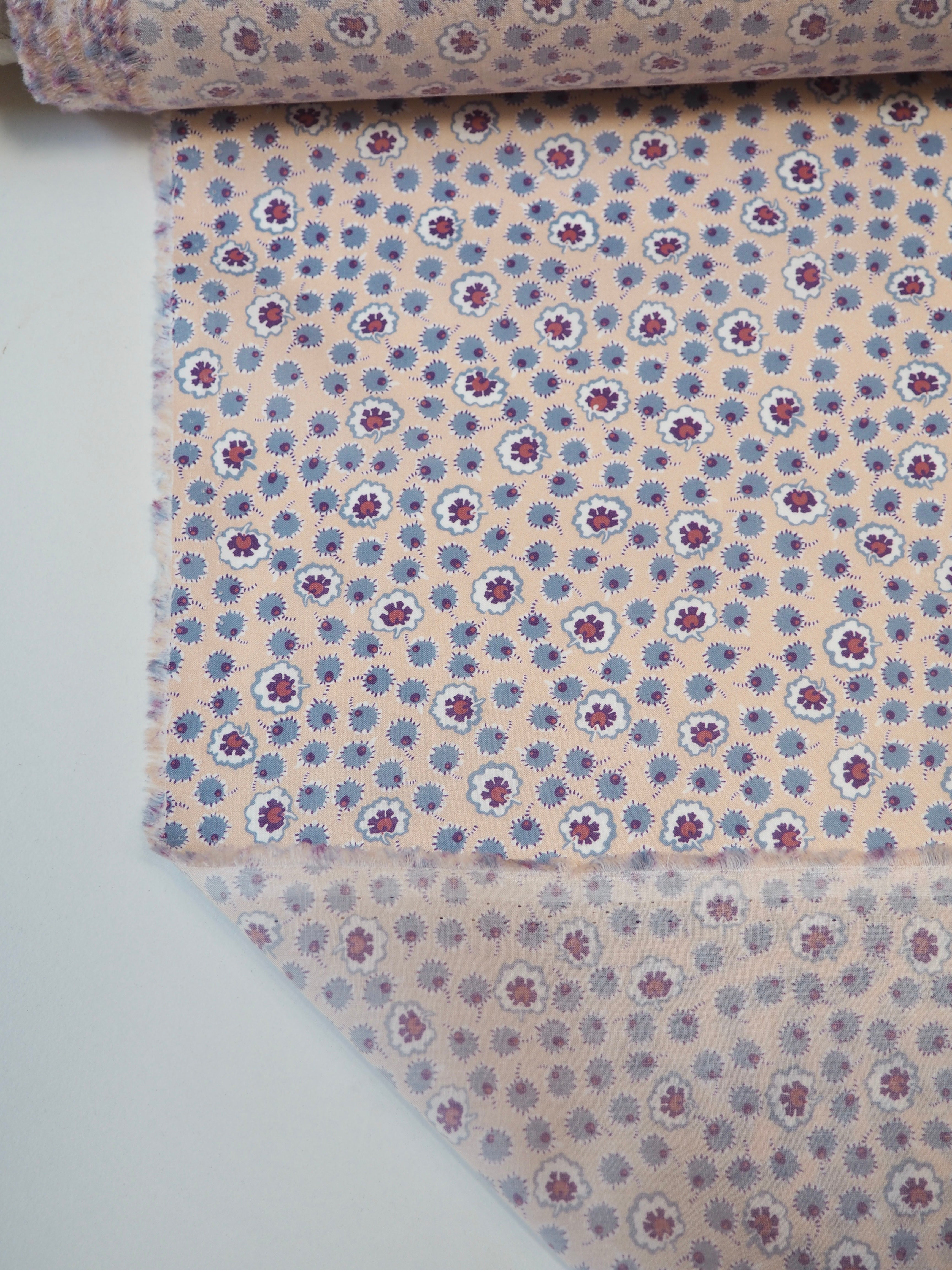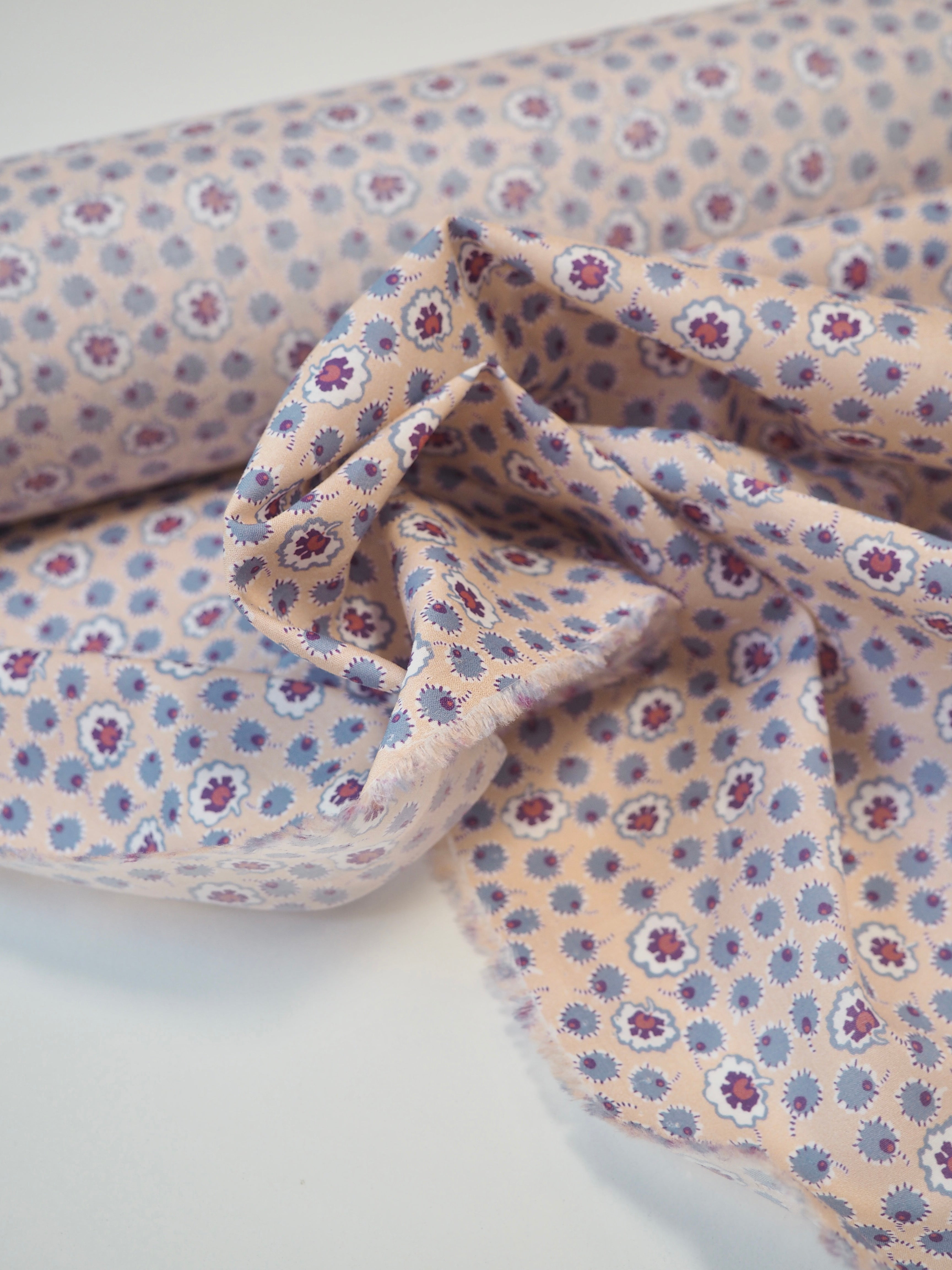 This ex-designer fabric is a classic Liberty Tana Lawn. It's in an exclusive print of pink and blue flowers on a pink background. A top quality Liberty cotton, and super lightweight! Soft with a lovely drape and slight crispness. Has a wonderful cotton handle. Mostly opaque but lets a little light in. We would love to see it in a blouse or even for quilting!