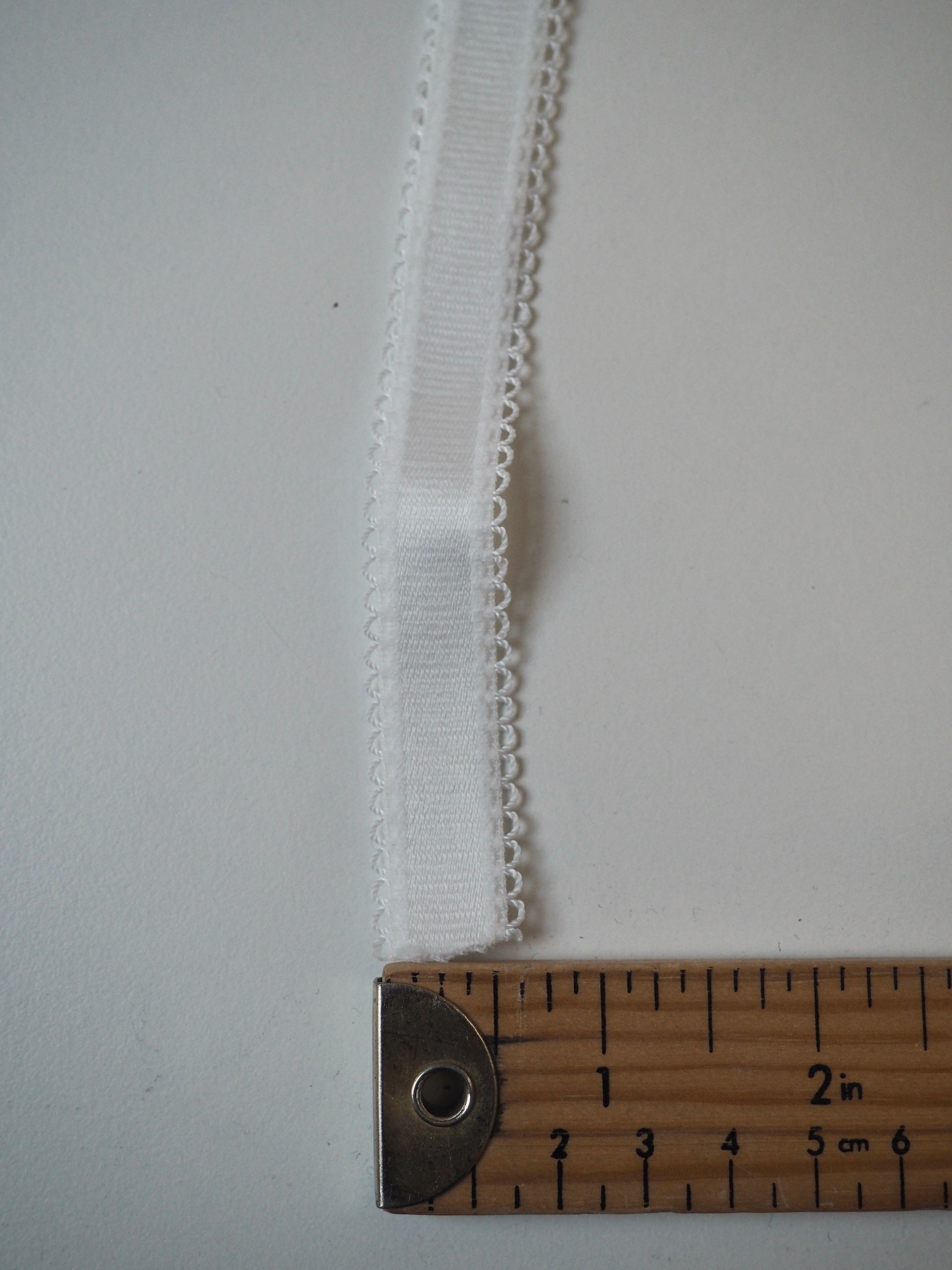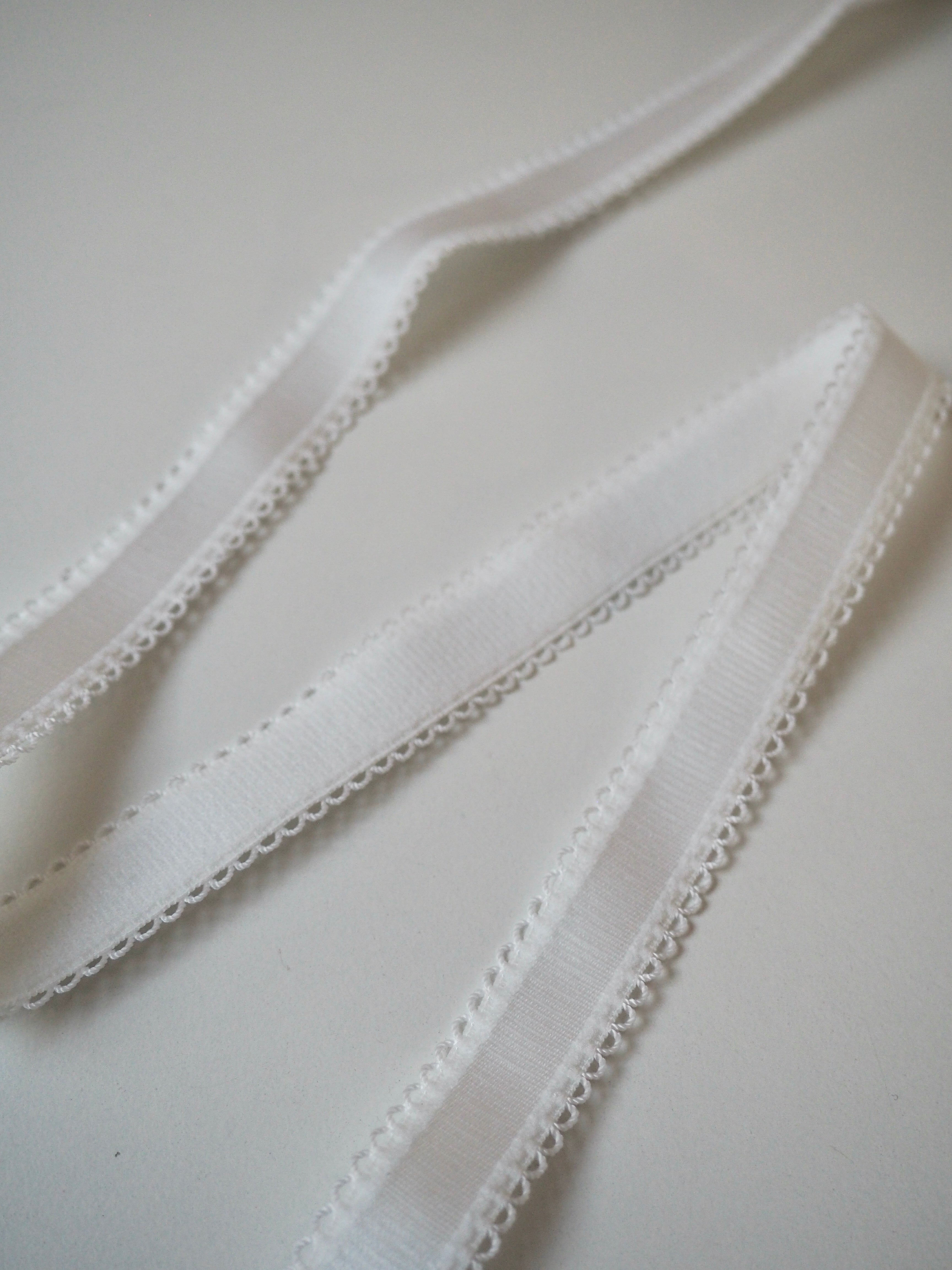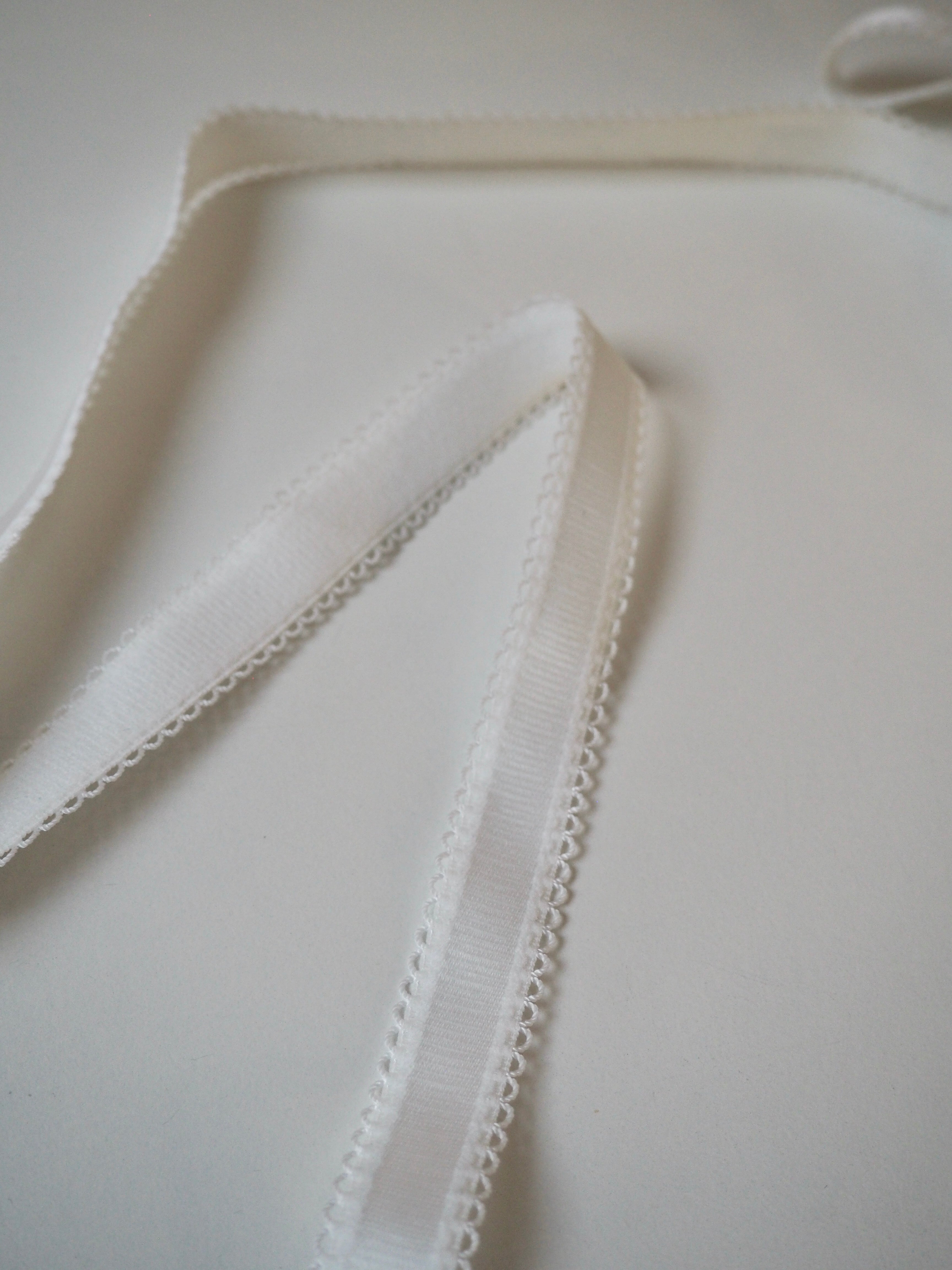This dead stock trim is a creamy white elastic. It’s a strong elastic suitable for straps with great recovery and super soft to the touch. One side has a satin finish and both edges are finished with the lace like loops characteristic of picot elastic. Perfect for bra straps and lingerie!