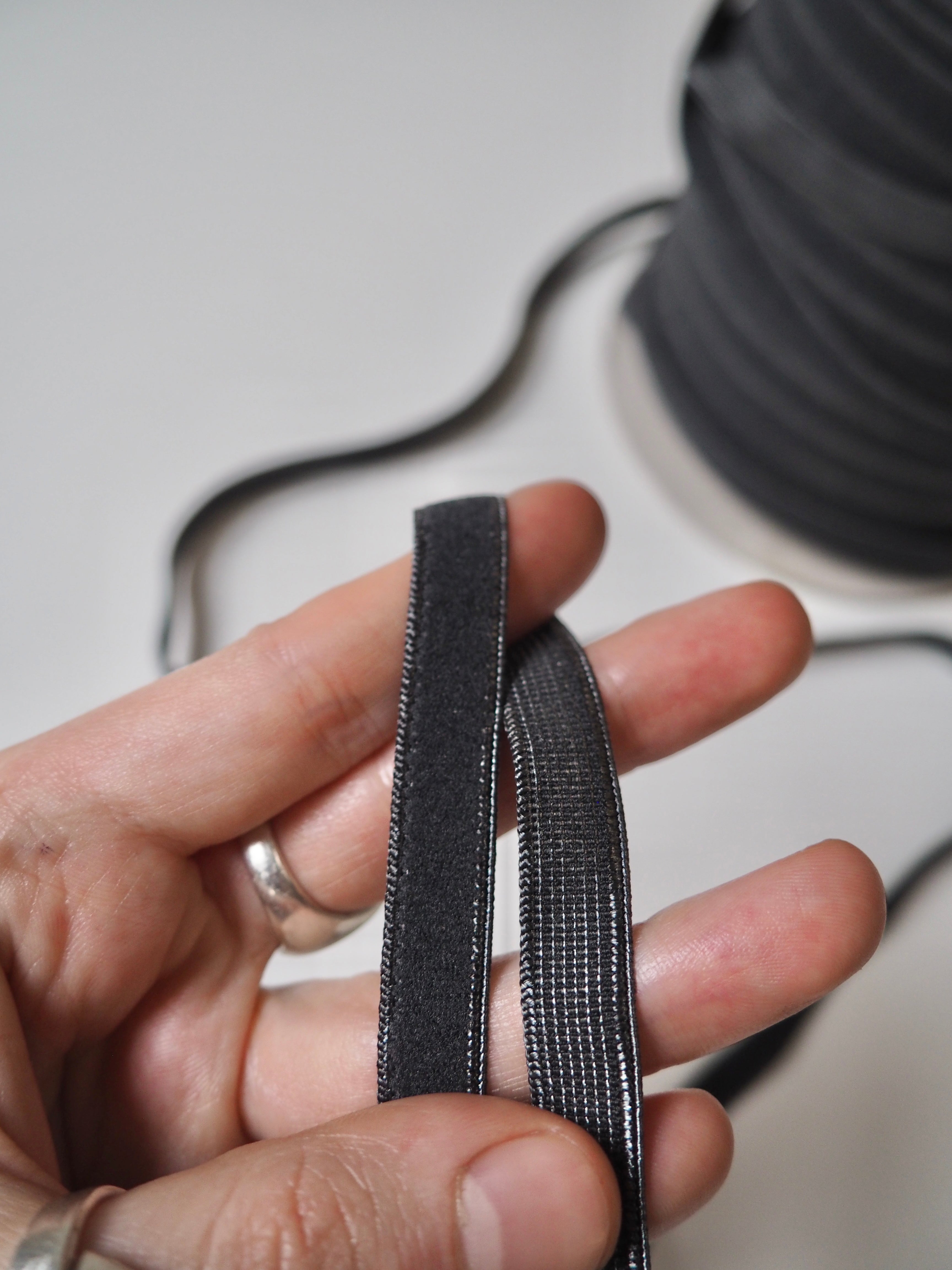 This ex-designer trim is a Charcoal elastic. One side is a typical textured elastic feel with a lighter grey woven in, and the other a plush with a soft feel. Great stretch and recovery. Good for smaller casings on trousers and tops, and even waistbands and lingerie straps. Lingerie patterns here!