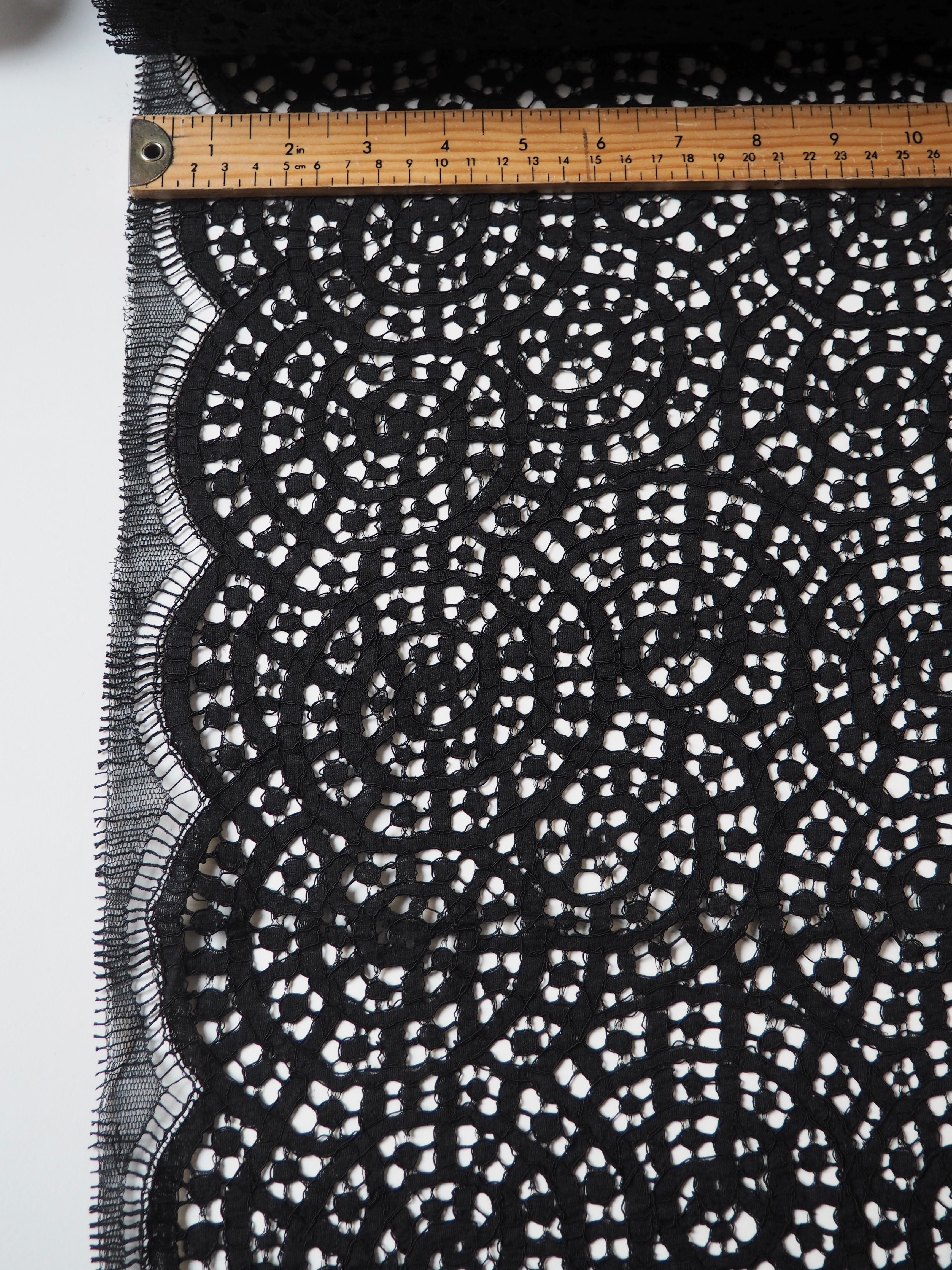 This ex-designer fabric is a corded lace. It's corded with a swirling pattern. The fabric can be used as one piece or the motifs could be cut out and appliqued on for denser coverage. Lovely light thickness and comfortable cotton blend handle. A medium coverage lace design. Scalloped eyelash edges to be cut away as desired. Perfect for lingerie, fancy dresses, or adding a lace embellishment to a dress!