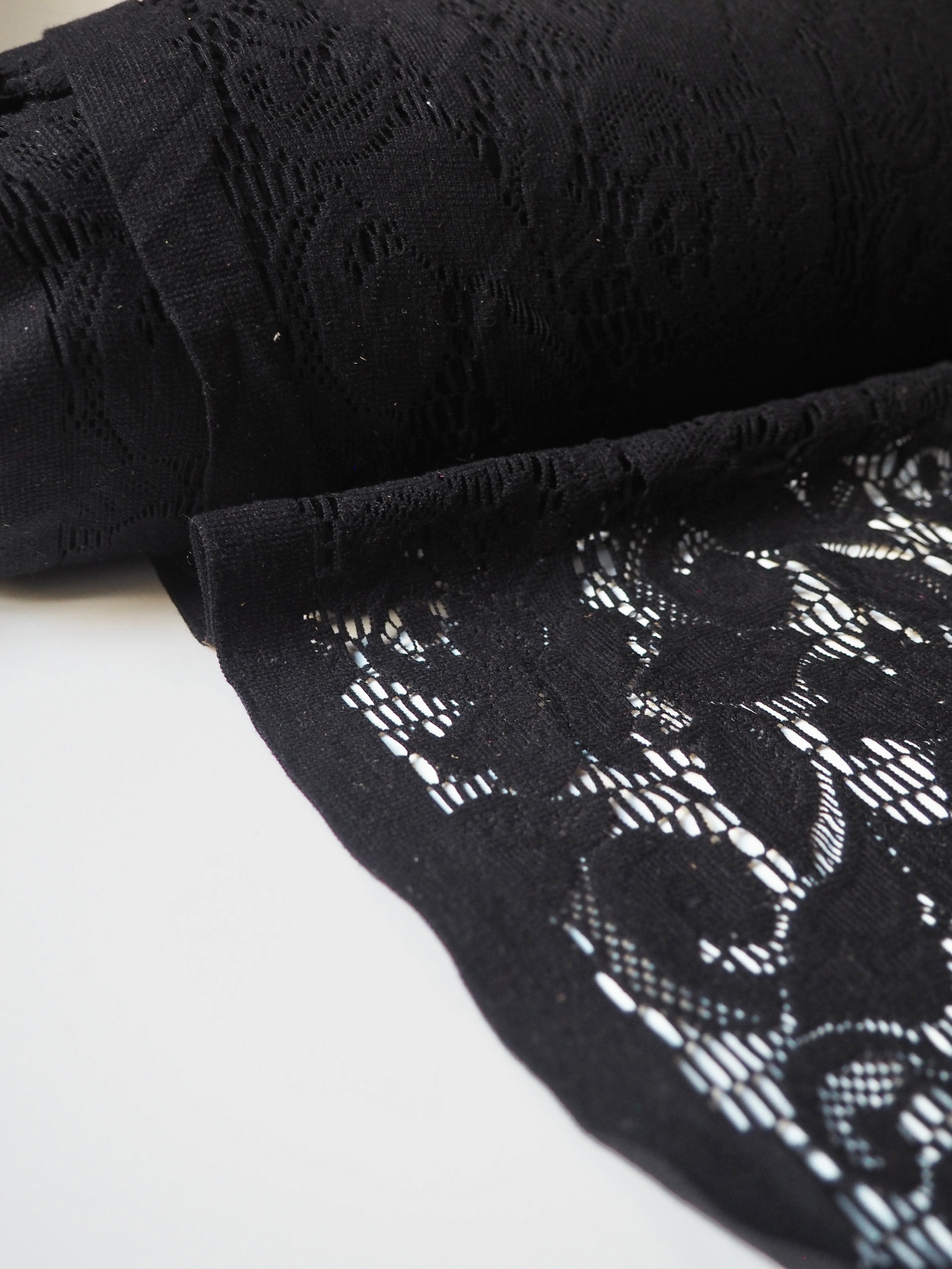 This ex-designer fabric is a stretch lace. It's in an floral print with medium coverage design. It has about 40% width-ways stretch. It's light to medium weight and very drapey, with a super soft chenille-like handle. Ideal for lingerie, sheer panels on garments, and accessories!