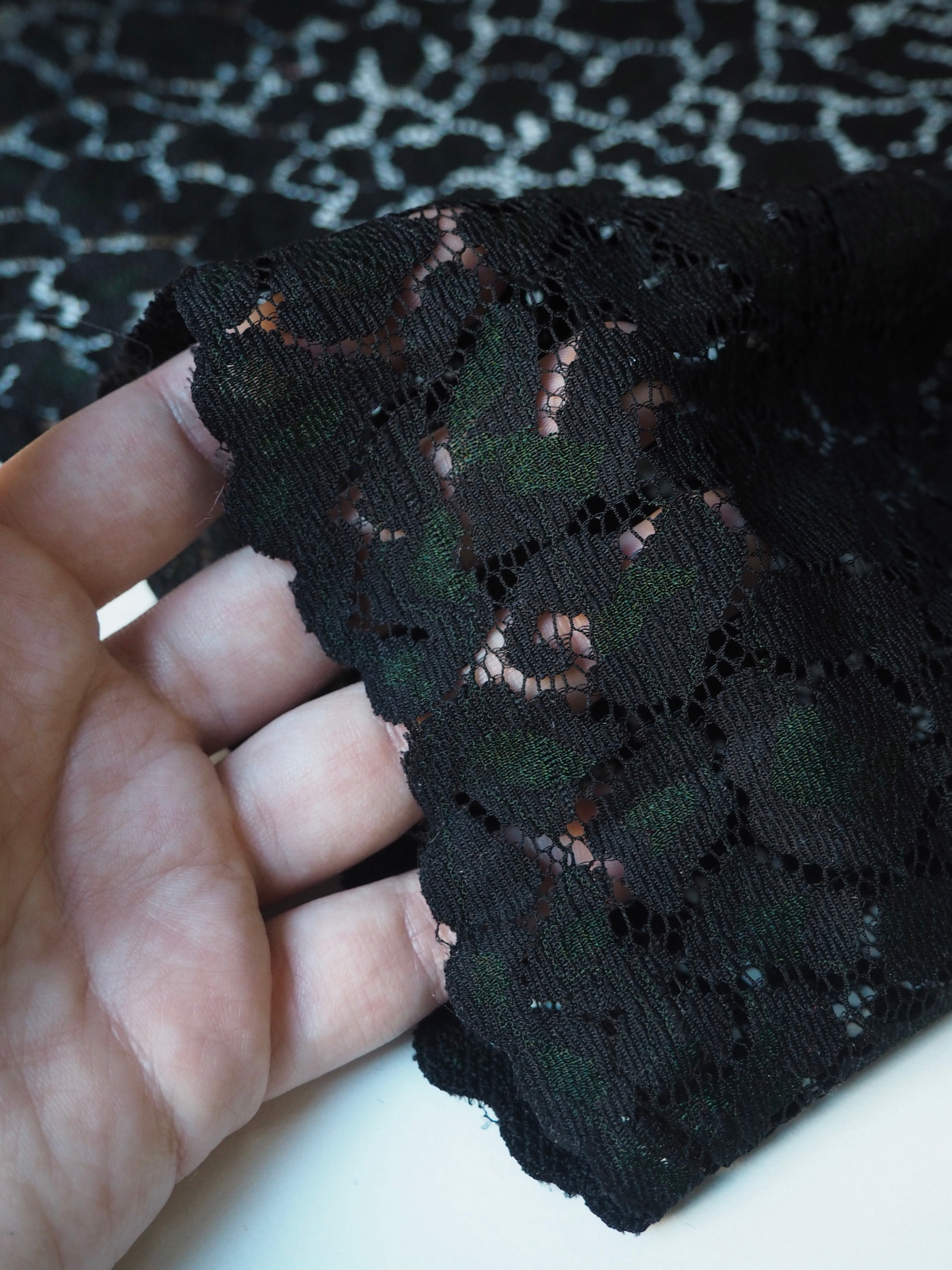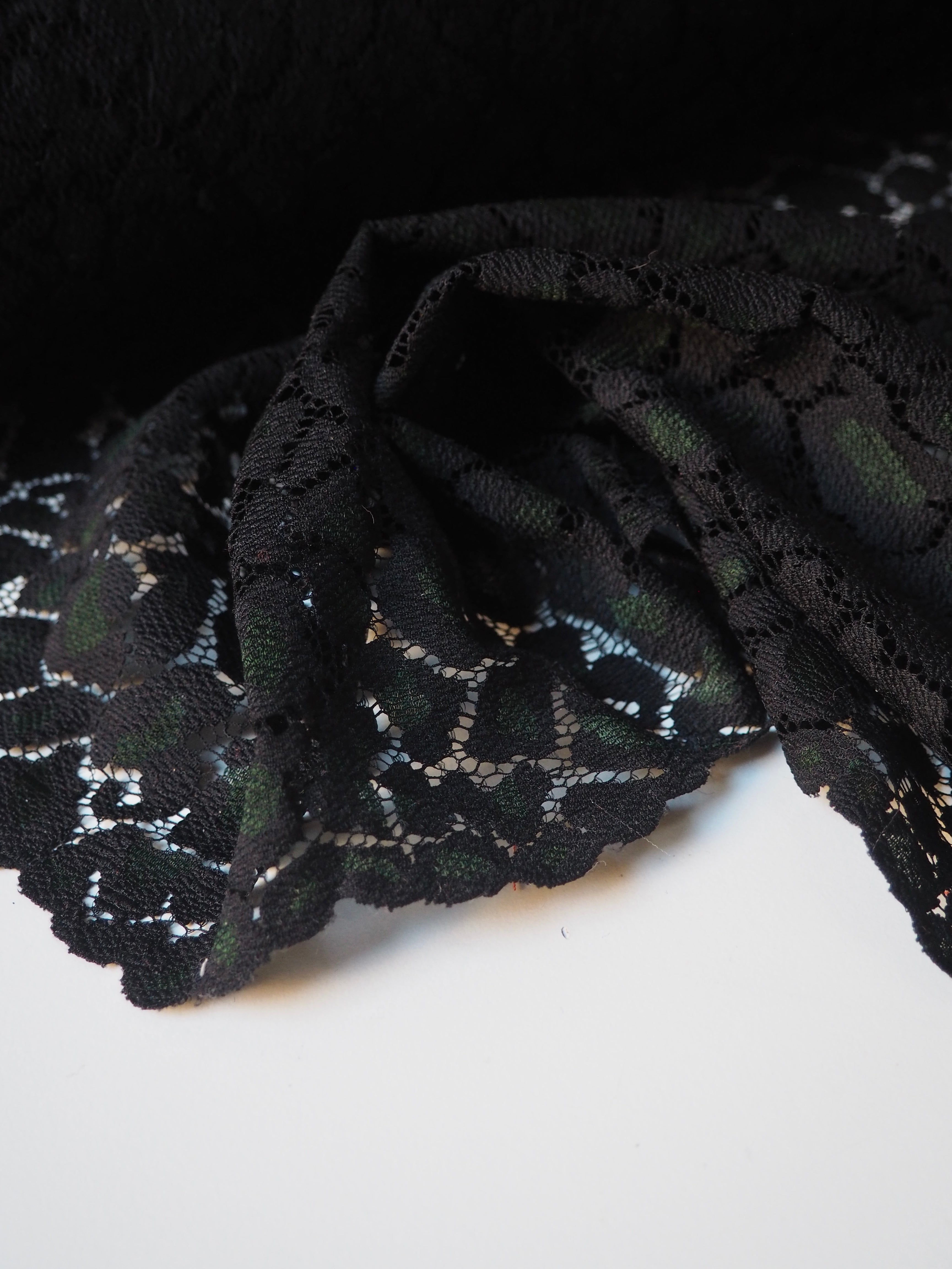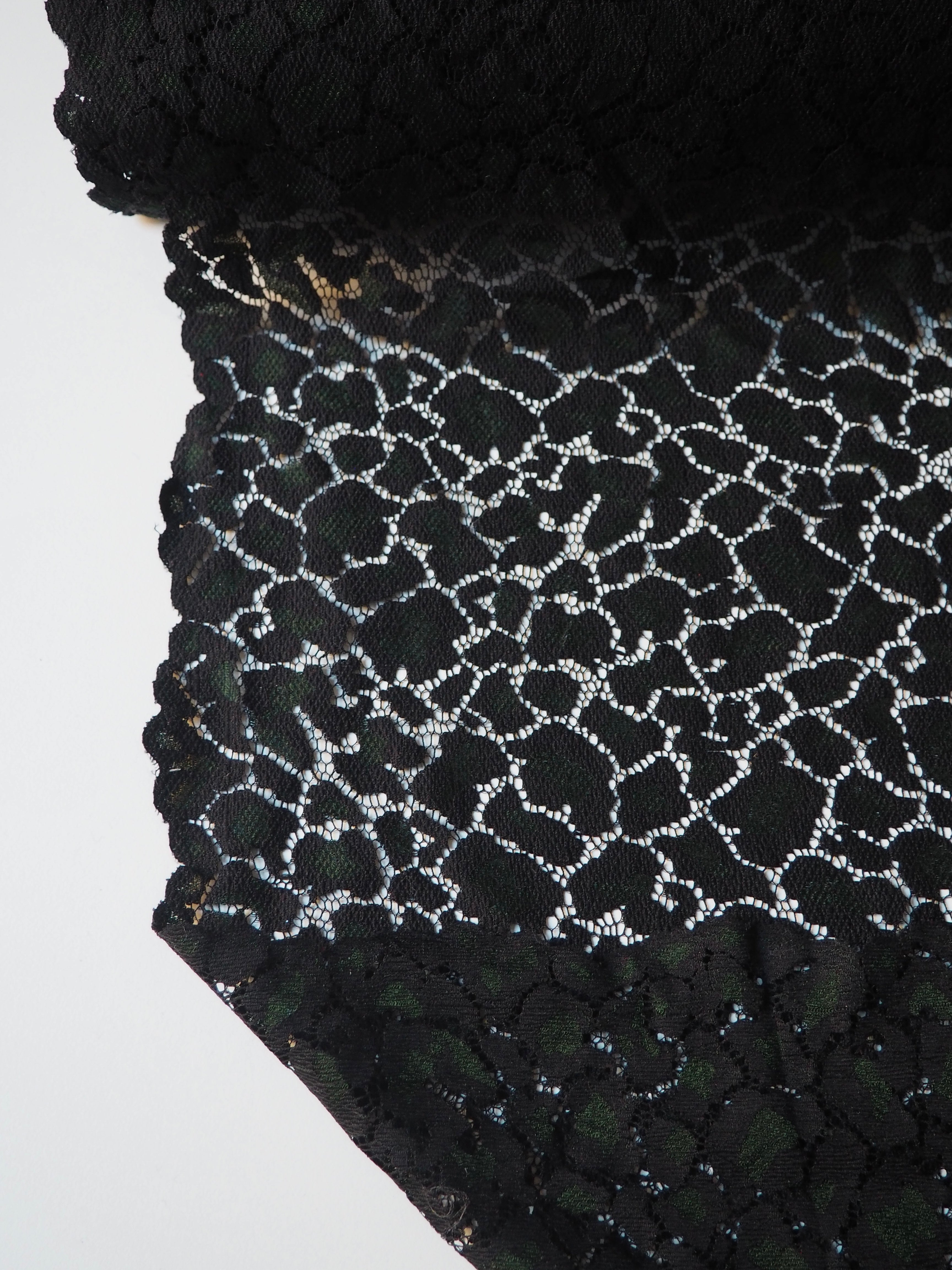 This ex-designer fabric is a unique lace. It's a leopard design in black and green with scalloping at the selvedges. The fabric can be used as one piece or the motifs could be cut out and appliqued on for denser coverage. Lovely sheen and lightweight thickness with a smooth handle. A medium to denser coverage lace design. Drapes beautifully! Perfect for lingerie, or sheer tops!