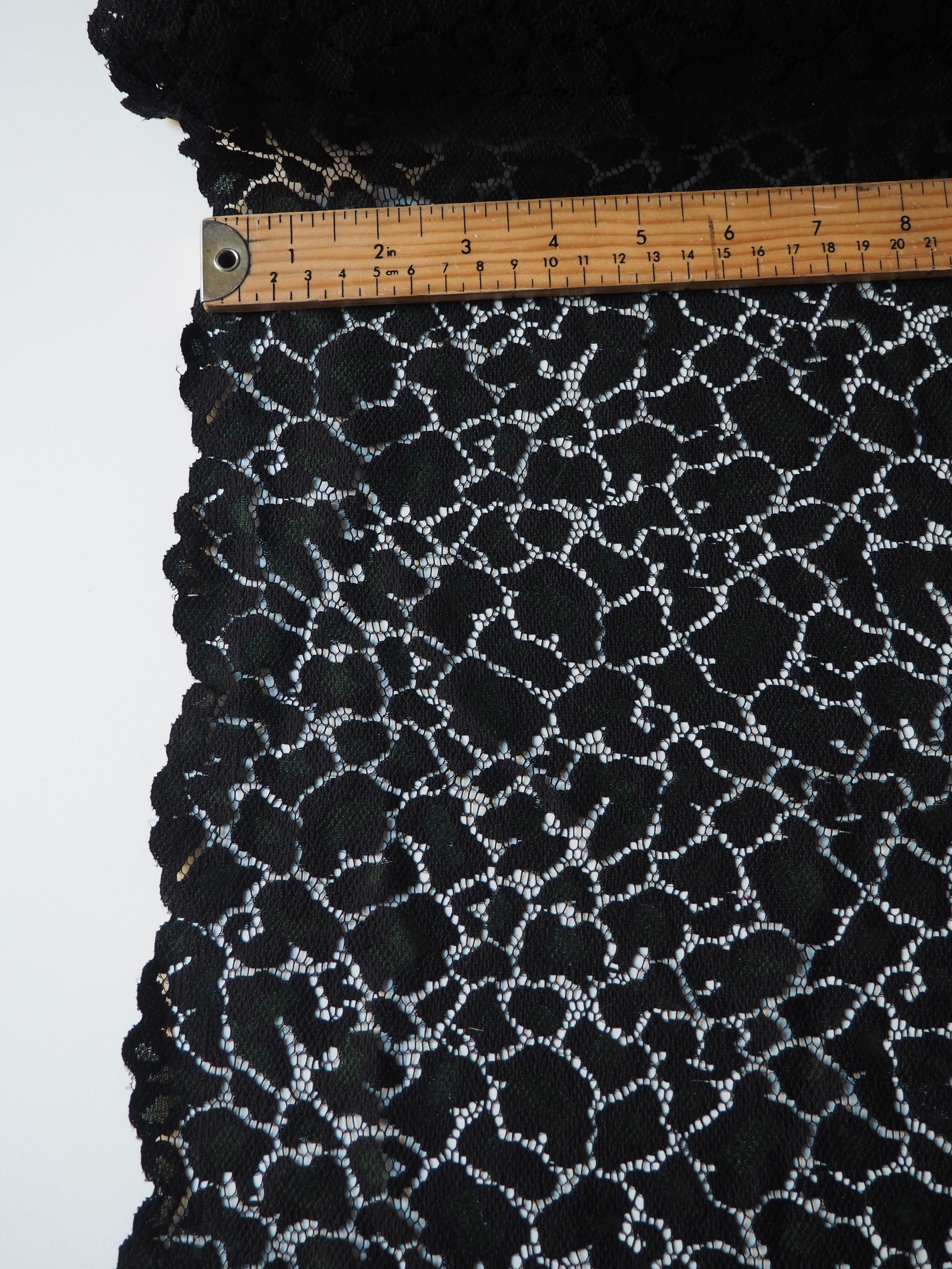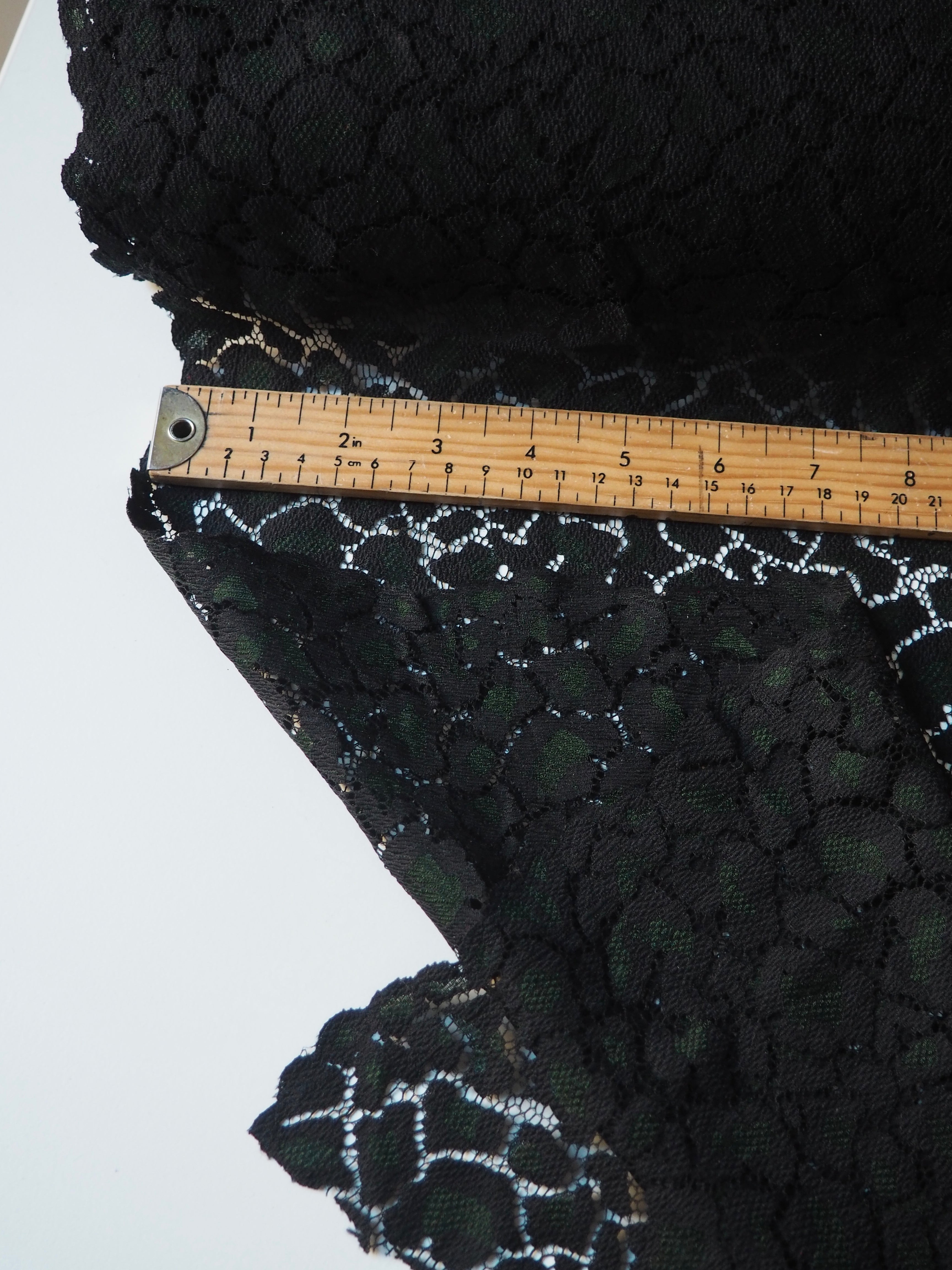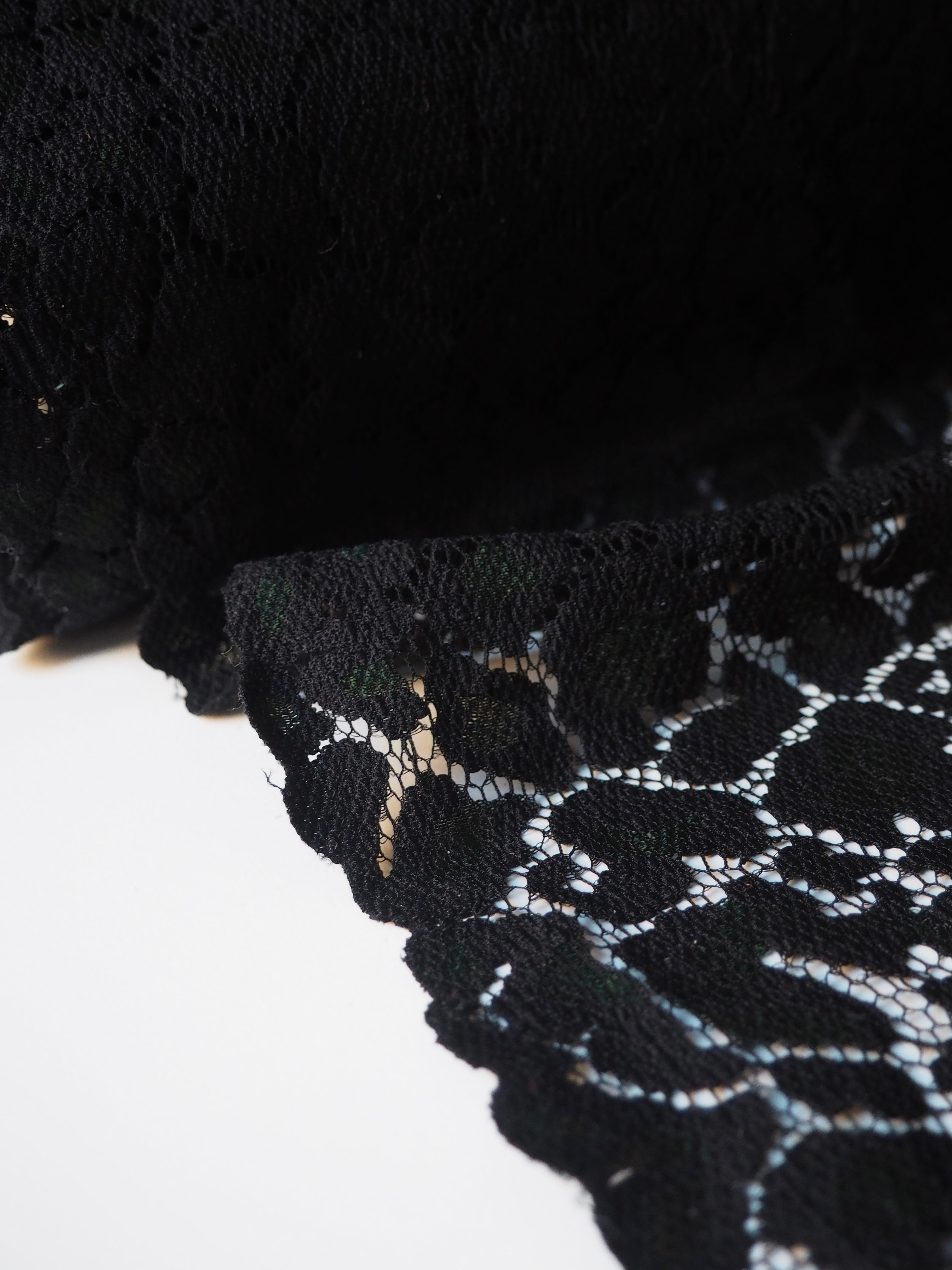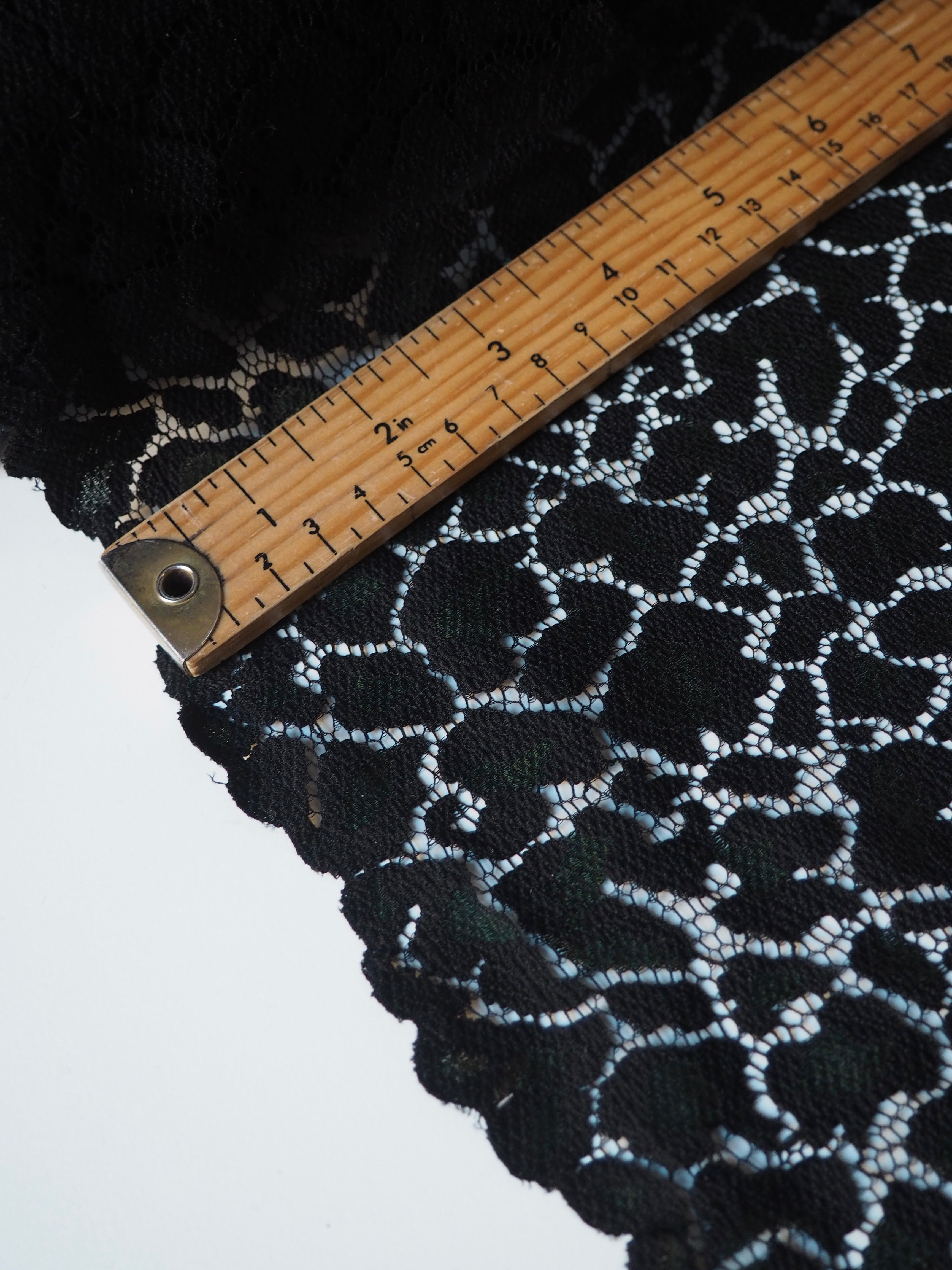This ex-designer fabric is a unique lace. It's a leopard design in black and green with scalloping at the selvedges. The fabric can be used as one piece or the motifs could be cut out and appliqued on for denser coverage. Lovely sheen and lightweight thickness with a smooth handle. A medium to denser coverage lace design. Drapes beautifully! Perfect for lingerie, or sheer tops!