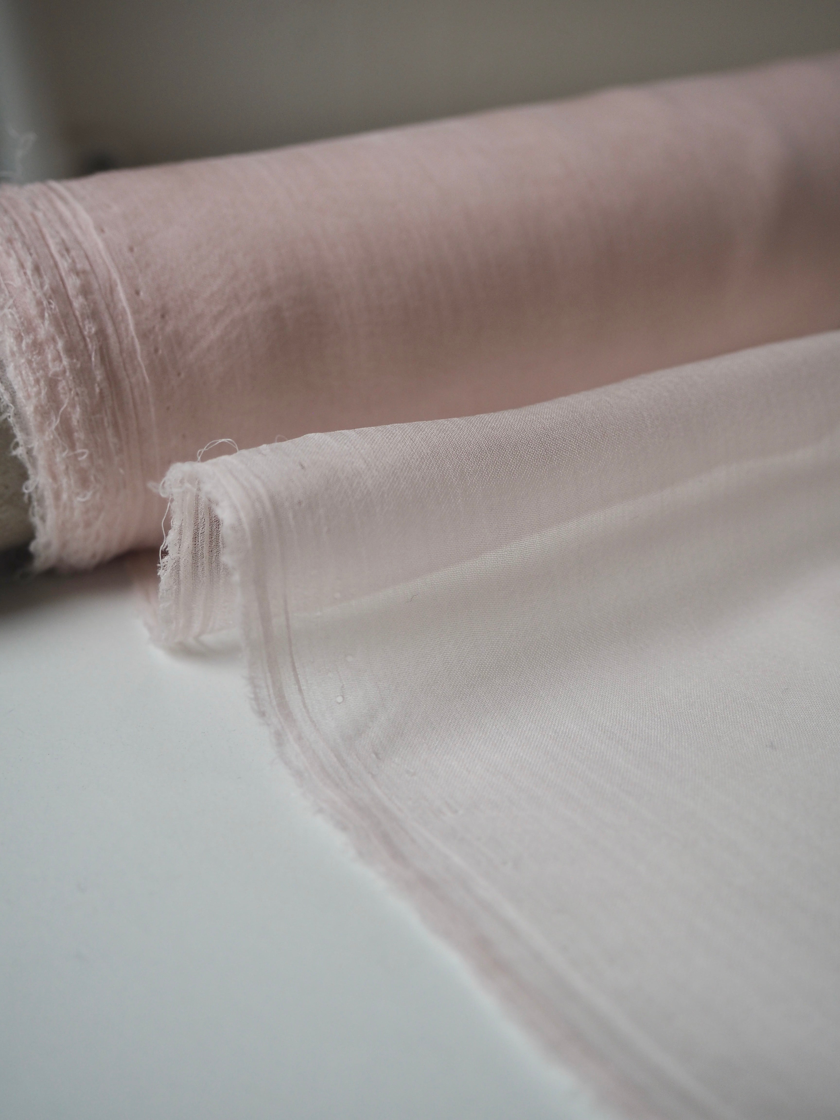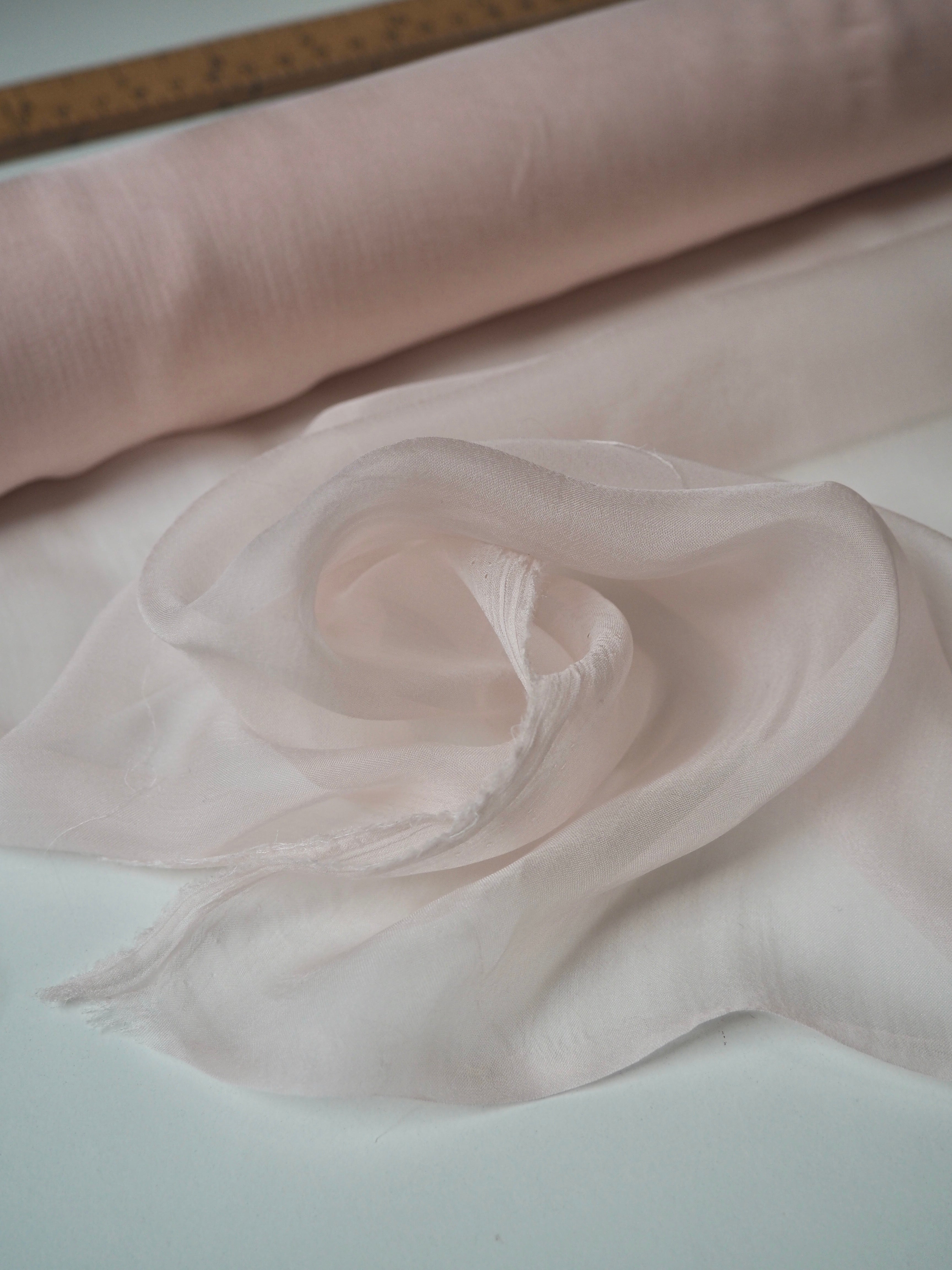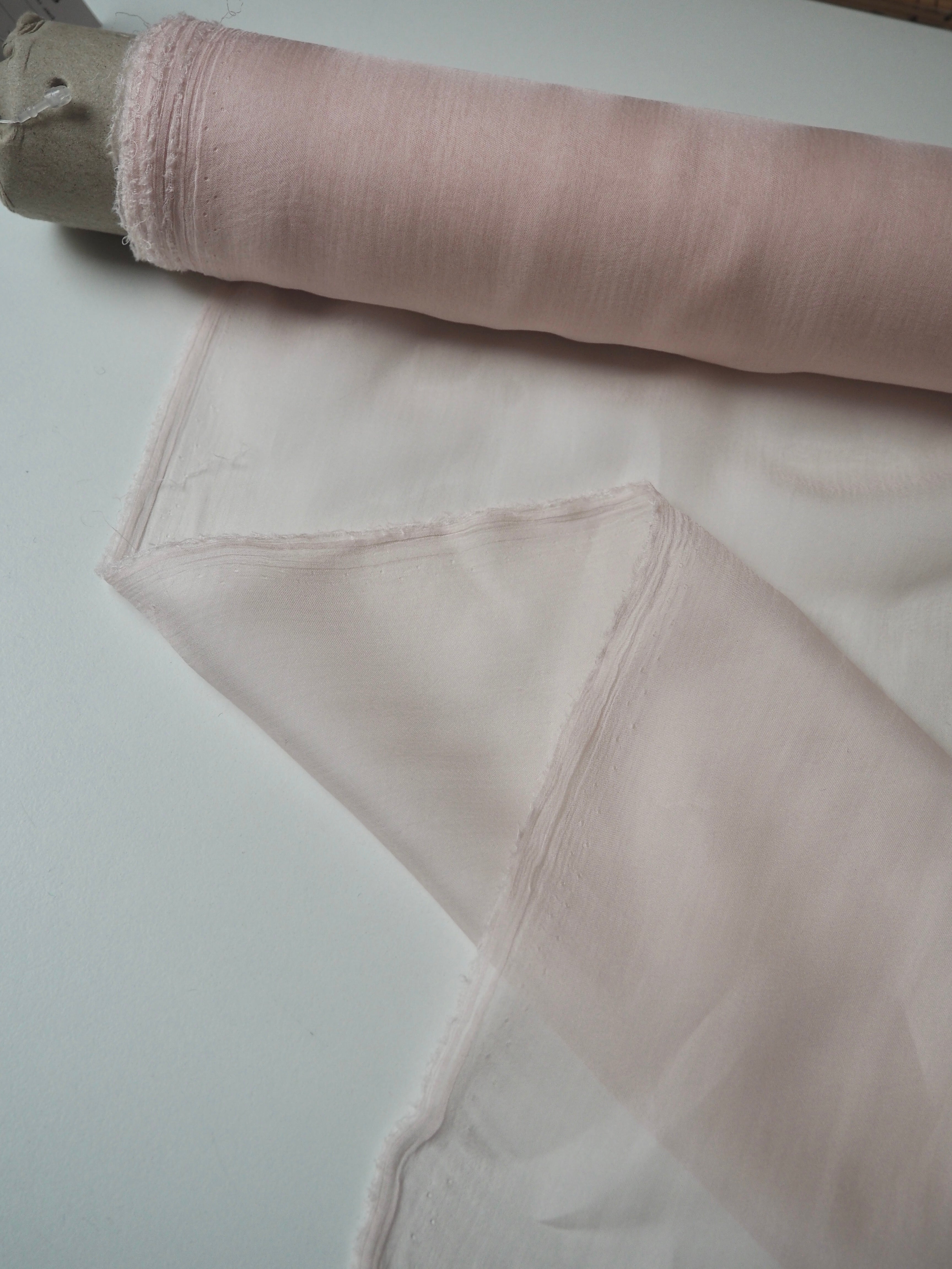 This ex-designer fabric is a lightweight silk chiffon. In a pale pink colour, and quite sheer. Has a great silky handle with a subtle crepe-like texture. Super light and airy, ideal for lingerie, or using for a floaty top or dress!