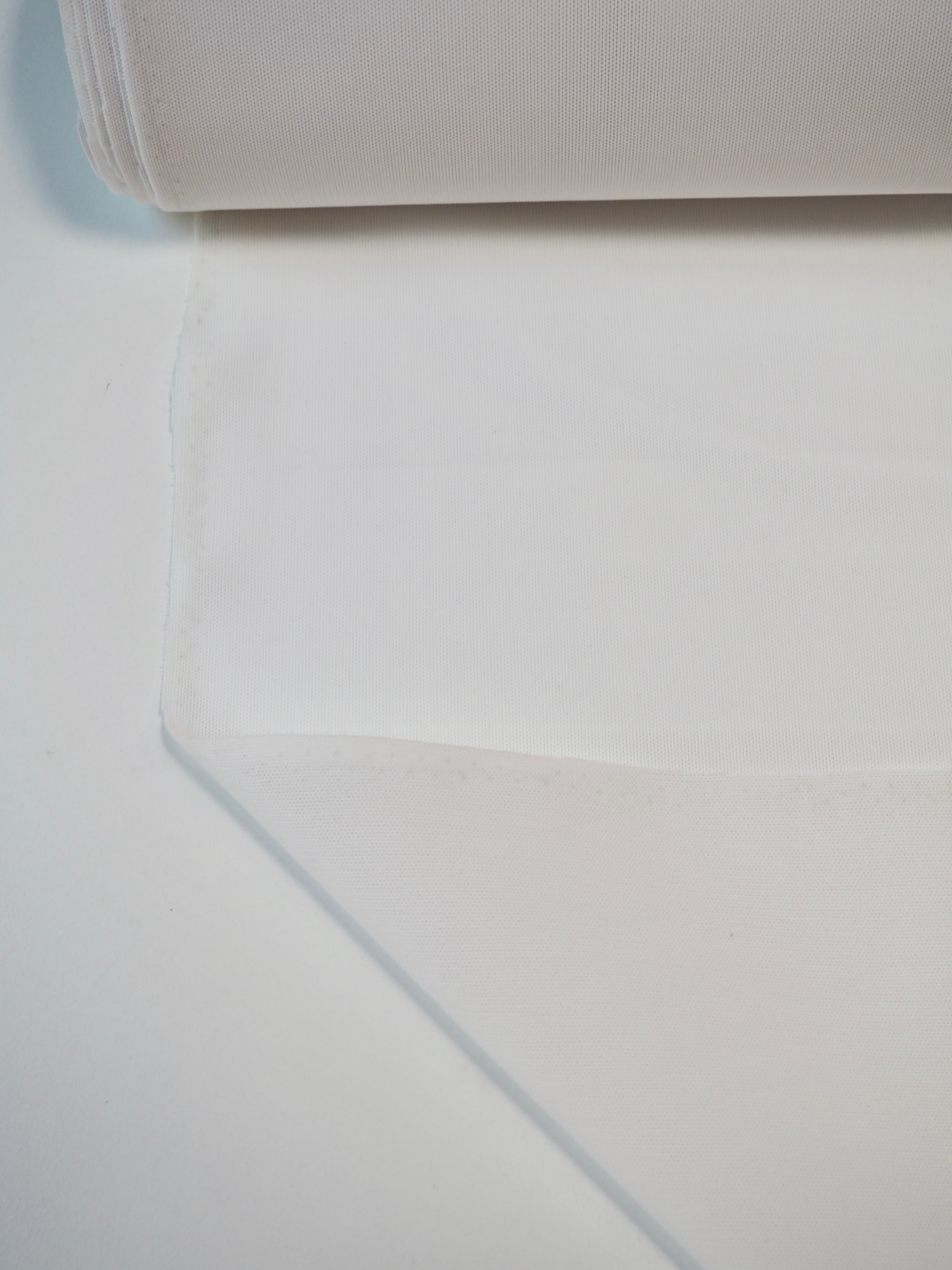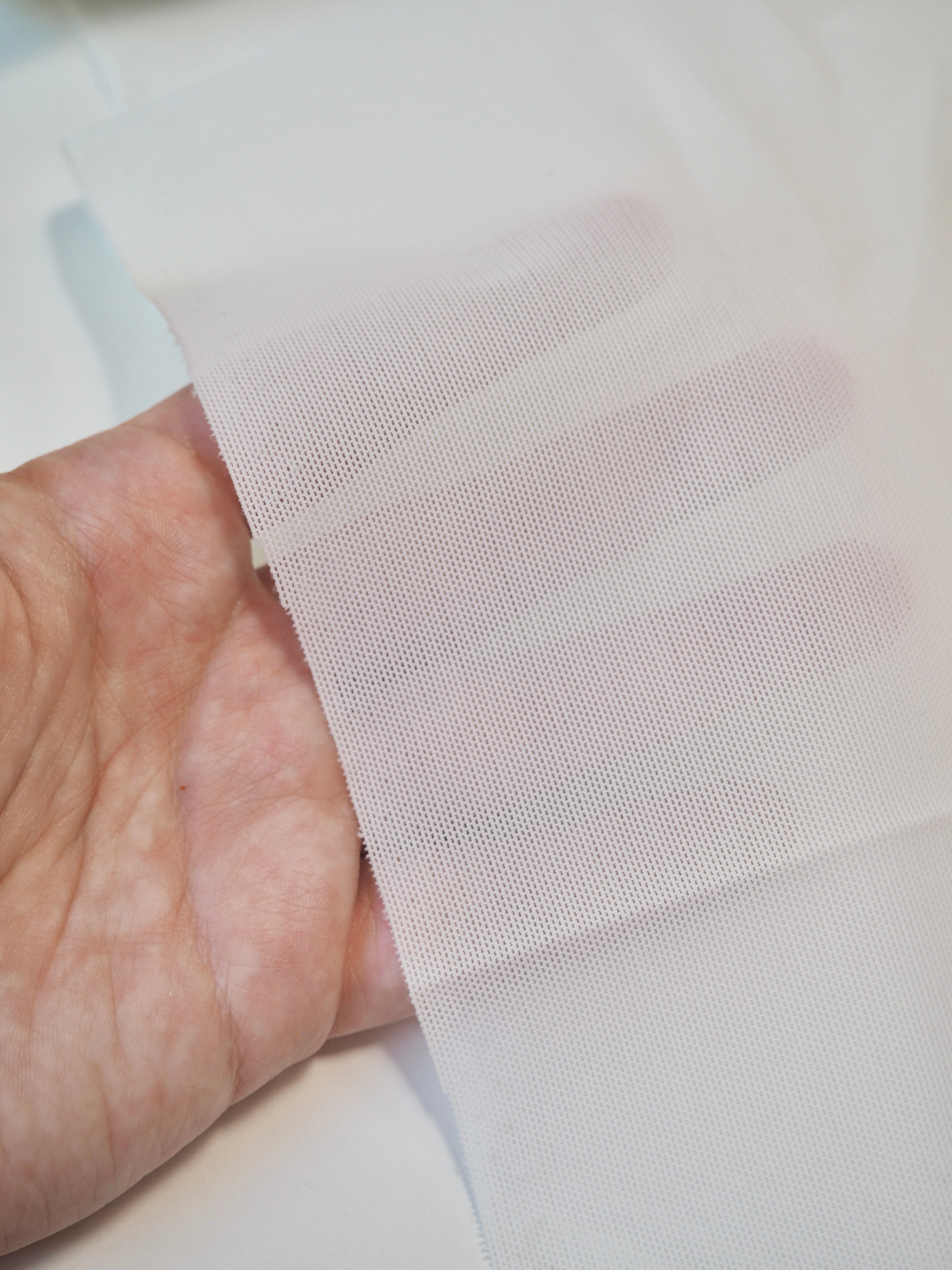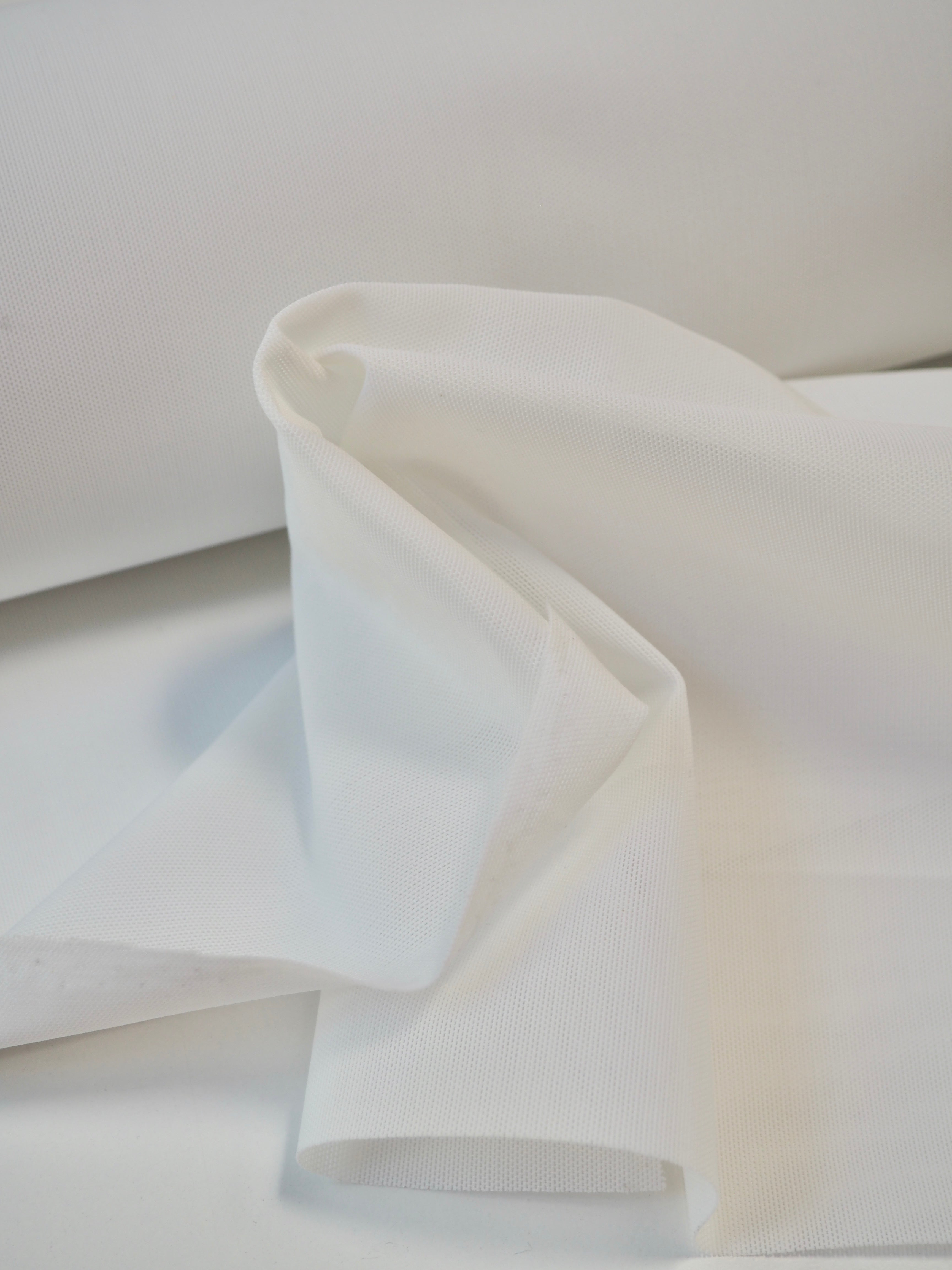 This ex-designer fabric is a white stretch powernet with extra rigidity. Powernet is a high-stretch (40% Two-way) fuller coverage mesh, with excellent recovery and great breathability. It's common for performance wear and undergarments. It's medium weight and has great support with its dense structure, but still slight sheerness when stretched. Perfect for our lingerie patterns, and we even have bra finding kits!