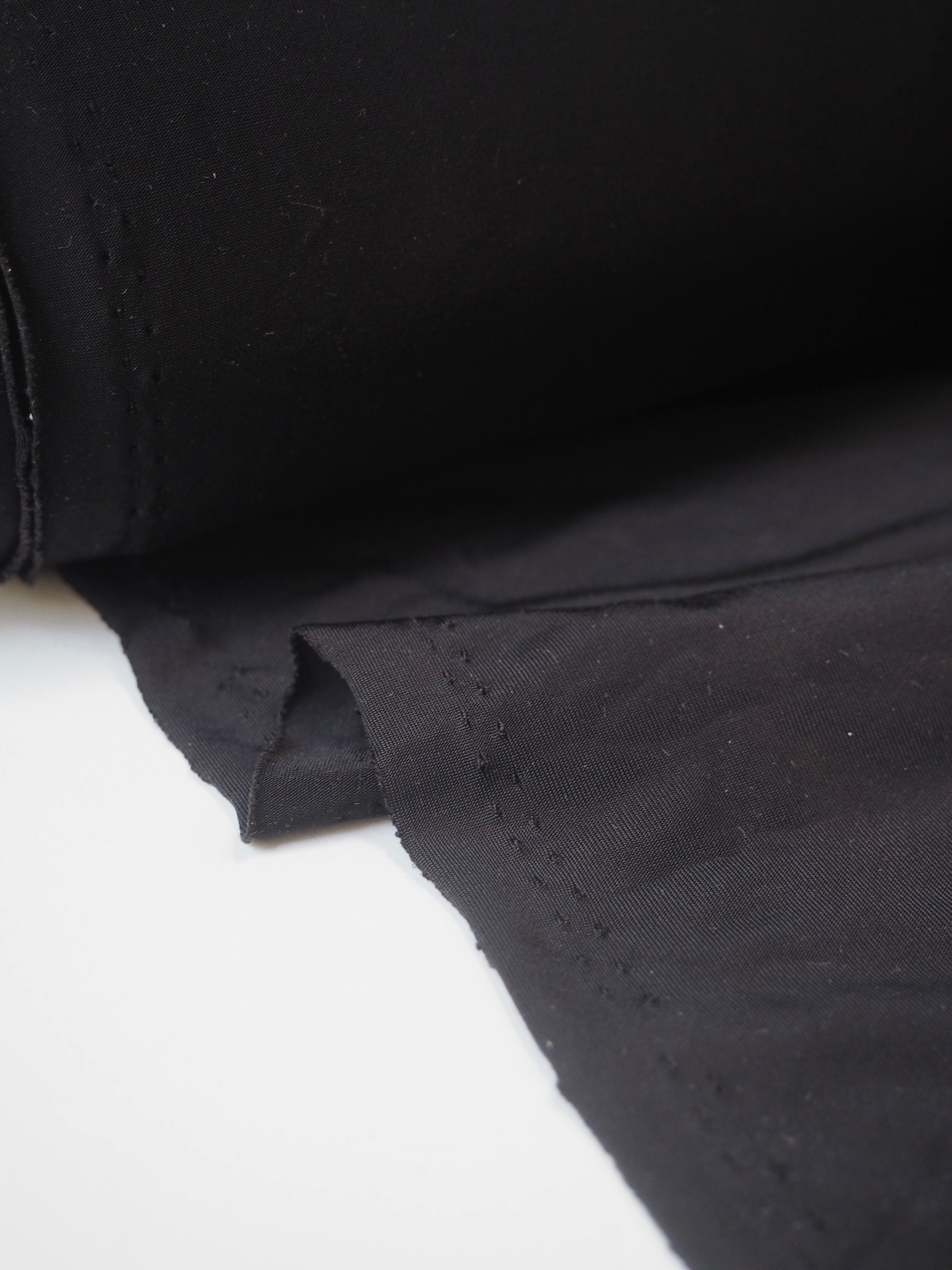 This ex-designer fabric is a single jersey. It's opaque and lightweight. It has a slight sheen finish and very soft, slinky handle. About 50% stretch each way and great recovery. Super drapey and lovely movement. Great for everyday basics, fitted dresses, and perfect for dress linings!