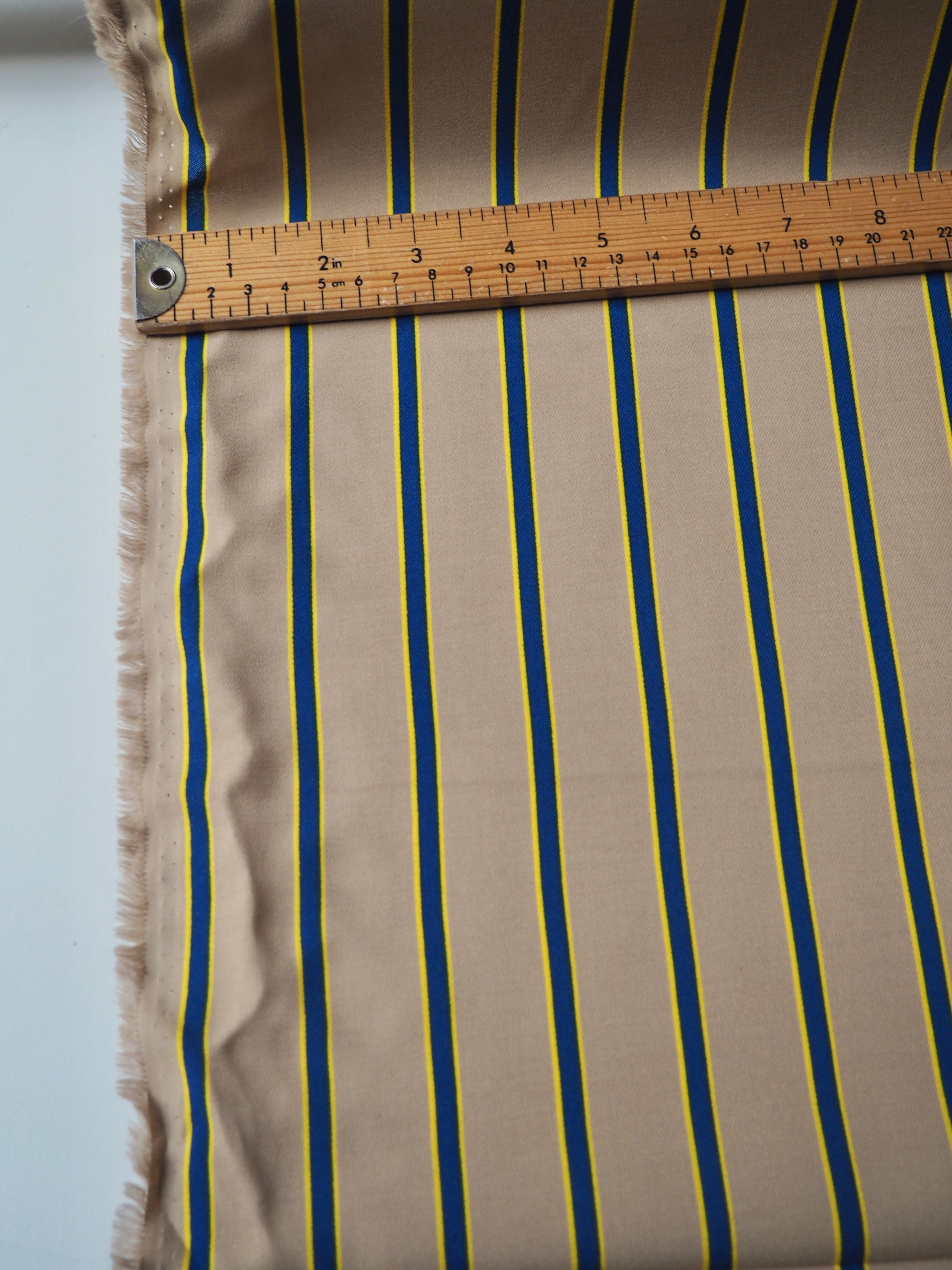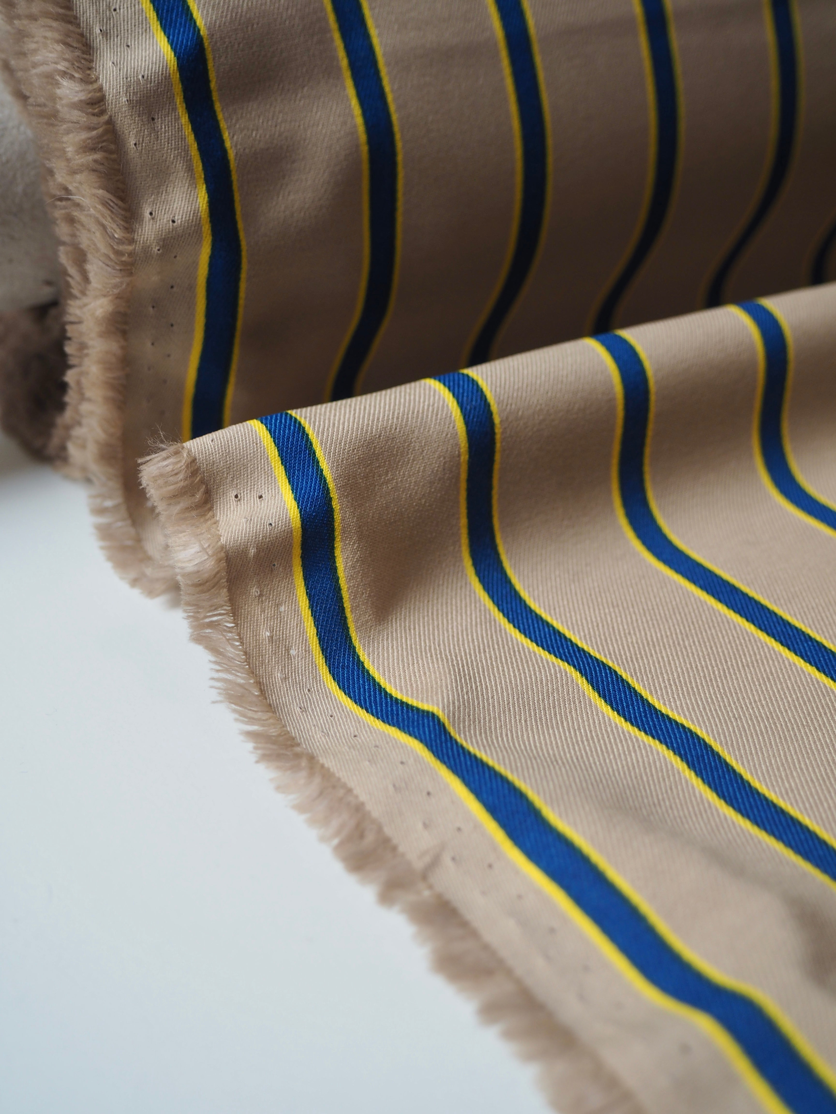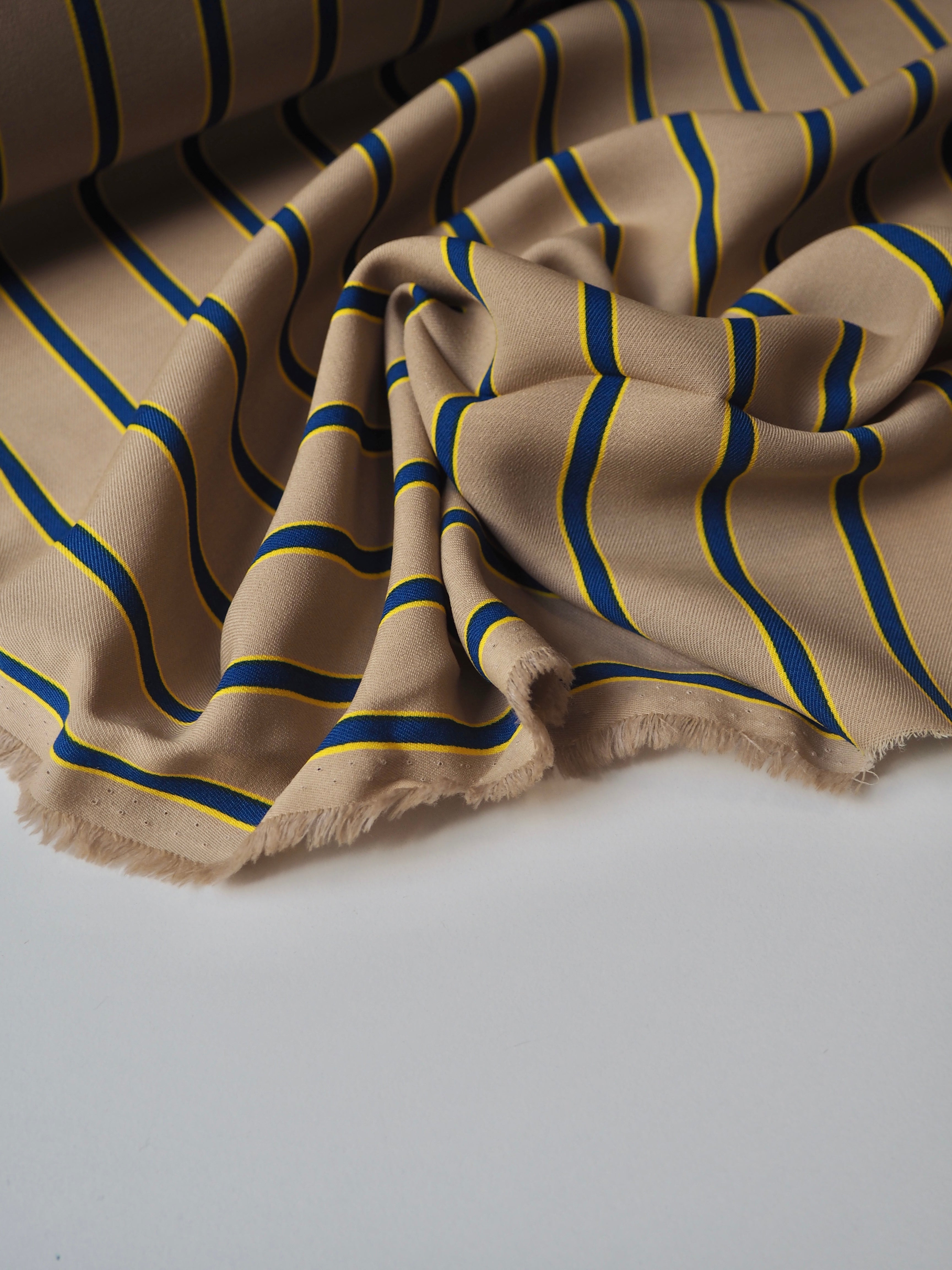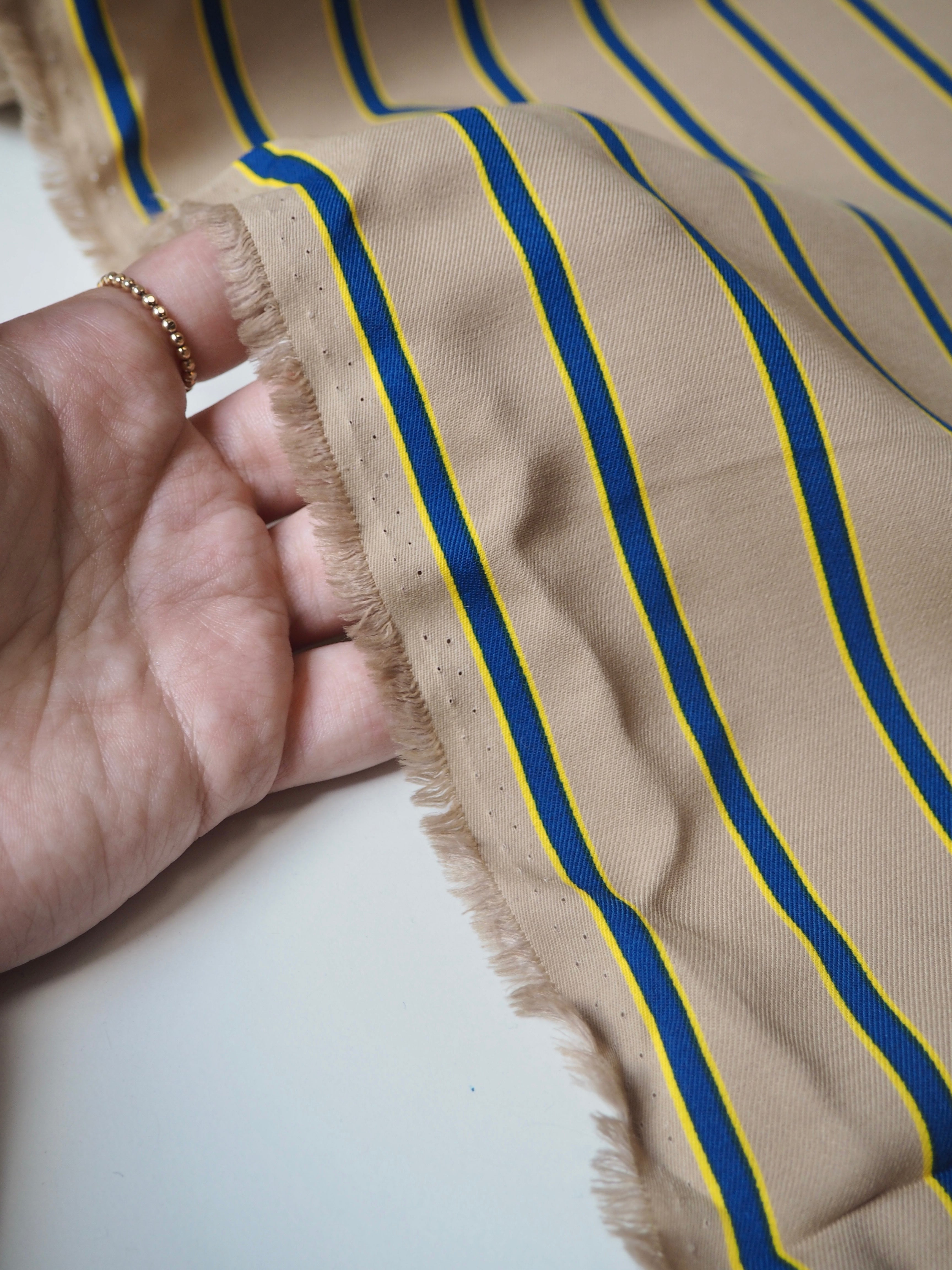 This ex-designer fabric is a twill. It's a yellow-ish beige with blue and yellow stripes. It has a very soft and quite drapey handle. It's a twill, with a very subtle sheen finish. Lightweight and opaque. Perfect for a jacket lining, or a shirt!