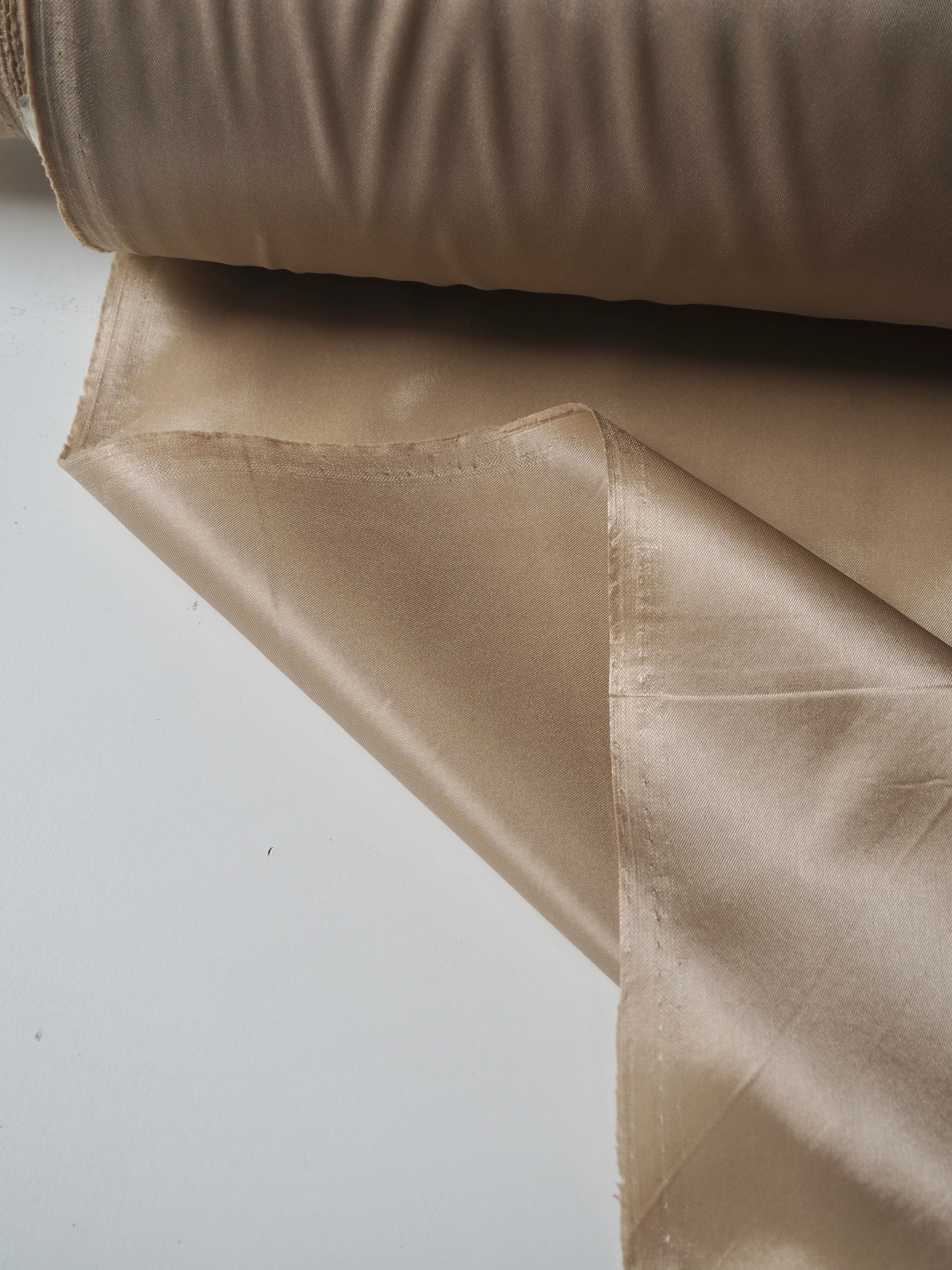 This ex-designer fabric is a stretch lining. It has a twill weave in a soft and slinky acetate fibre. Has a gentle 10% stretch width-ways. Lightweight with a gentle drape and nice satin finish. Has a slight structure to it as well. Slightly sheer. Ideal for lining any garment, especially a suit jacket or coat!