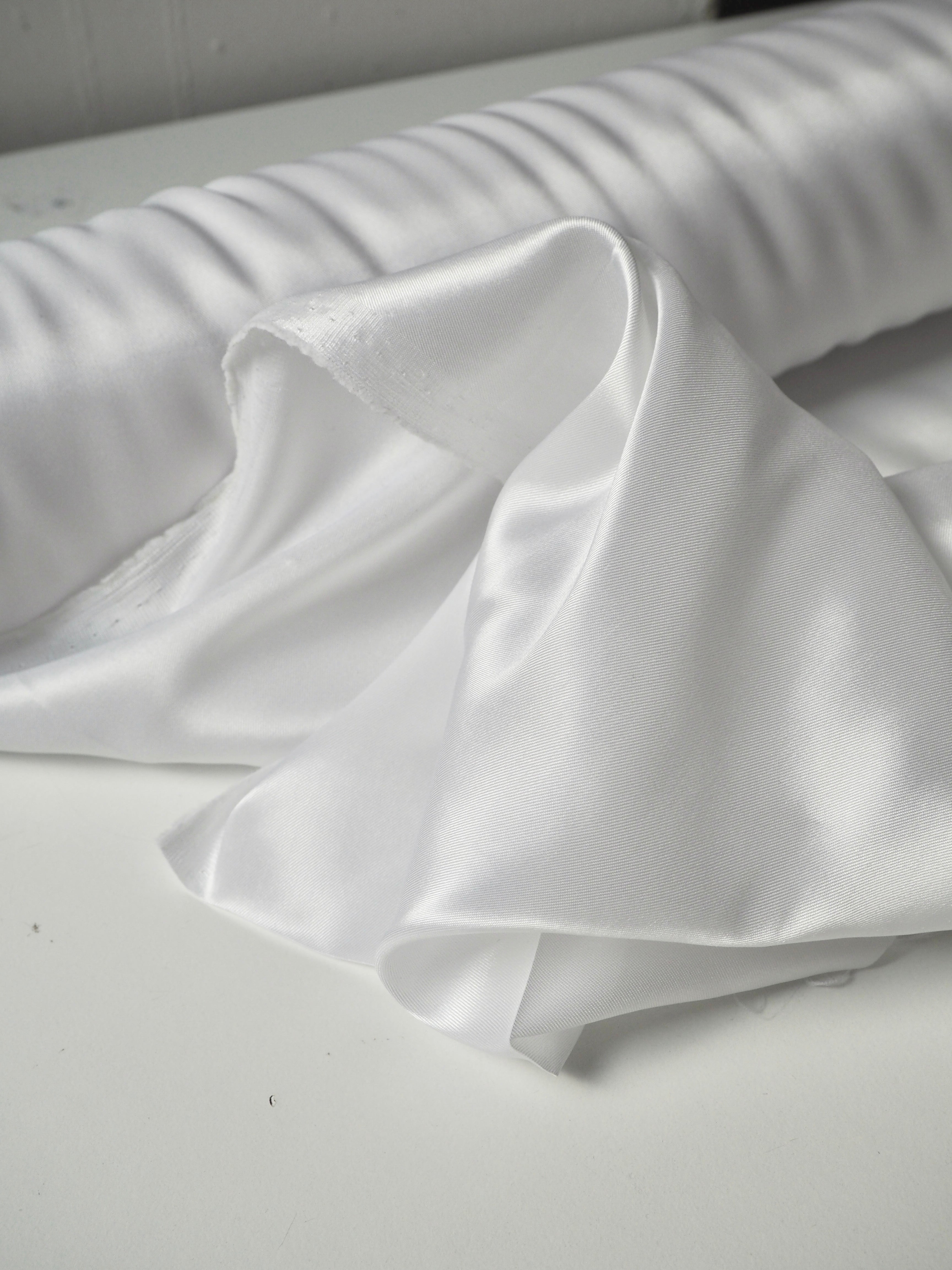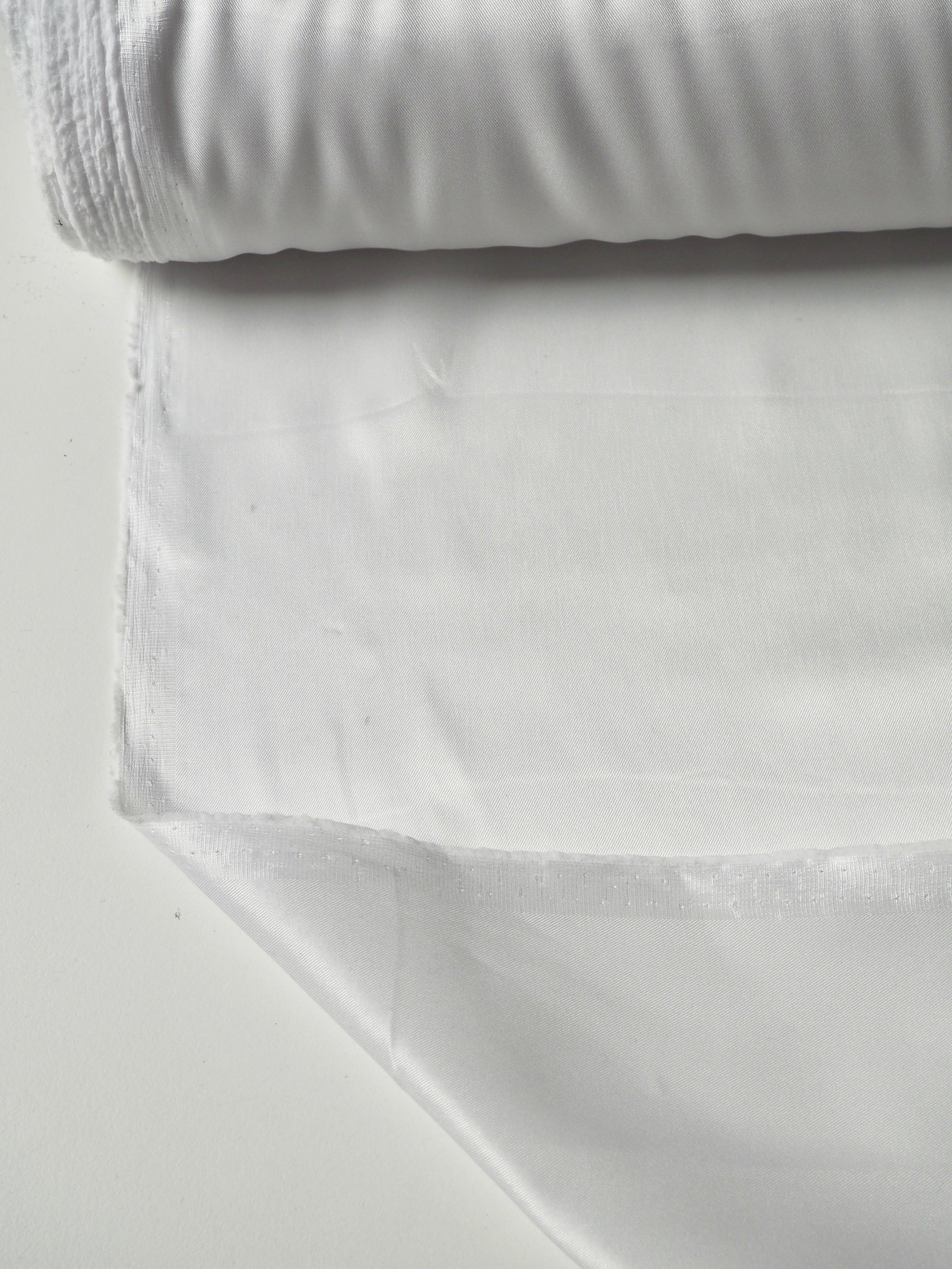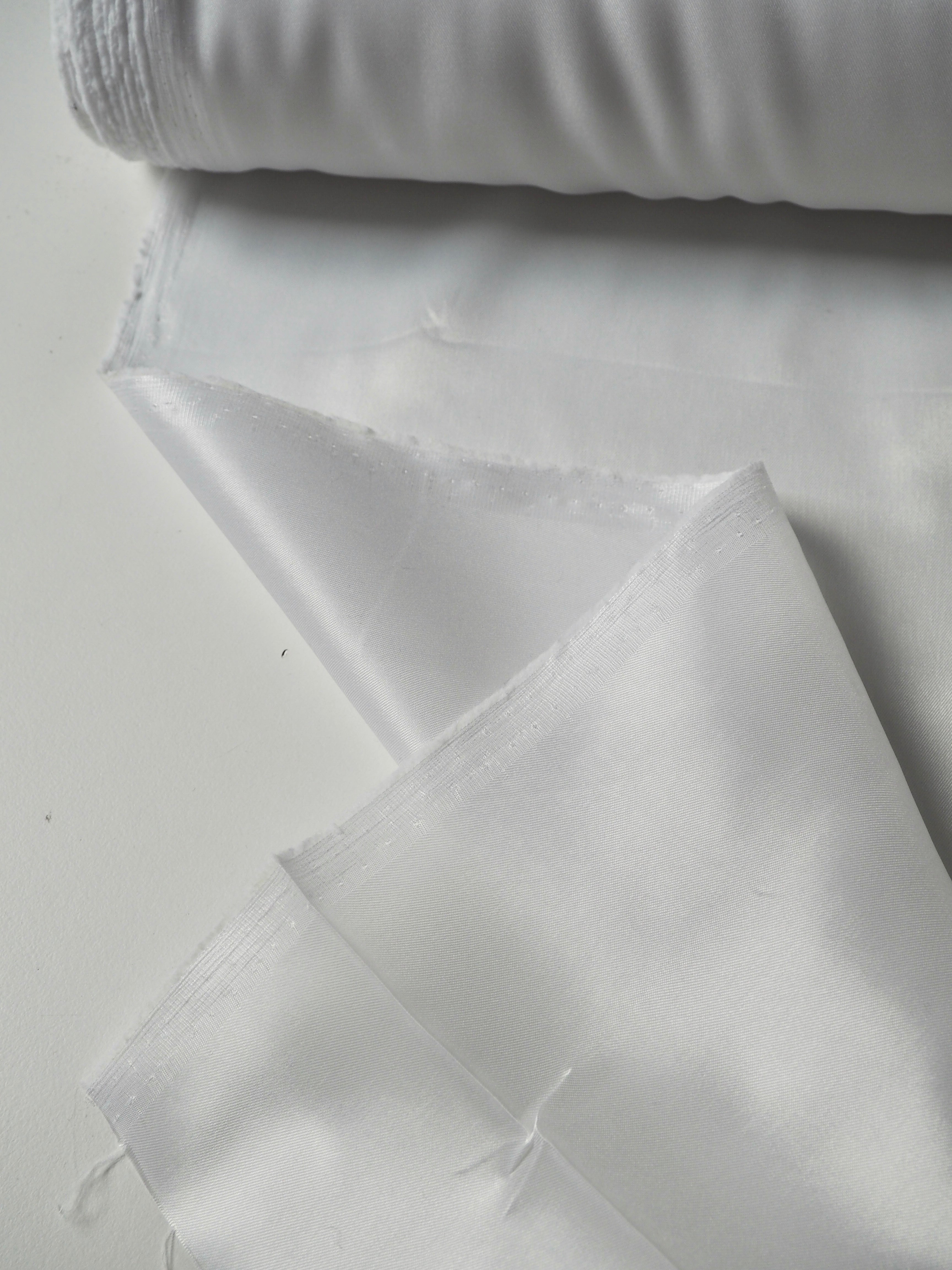 This ex-designer fabric is a lining. It has a subtle twill weave in a soft acetate fibre. Has about 10% stretch, width-ways. Lightweight with a gentle structure and light satin finish. Holds shape quite well, and is more sheer than opaque. Ideal for lining any garment, especially for bridal!