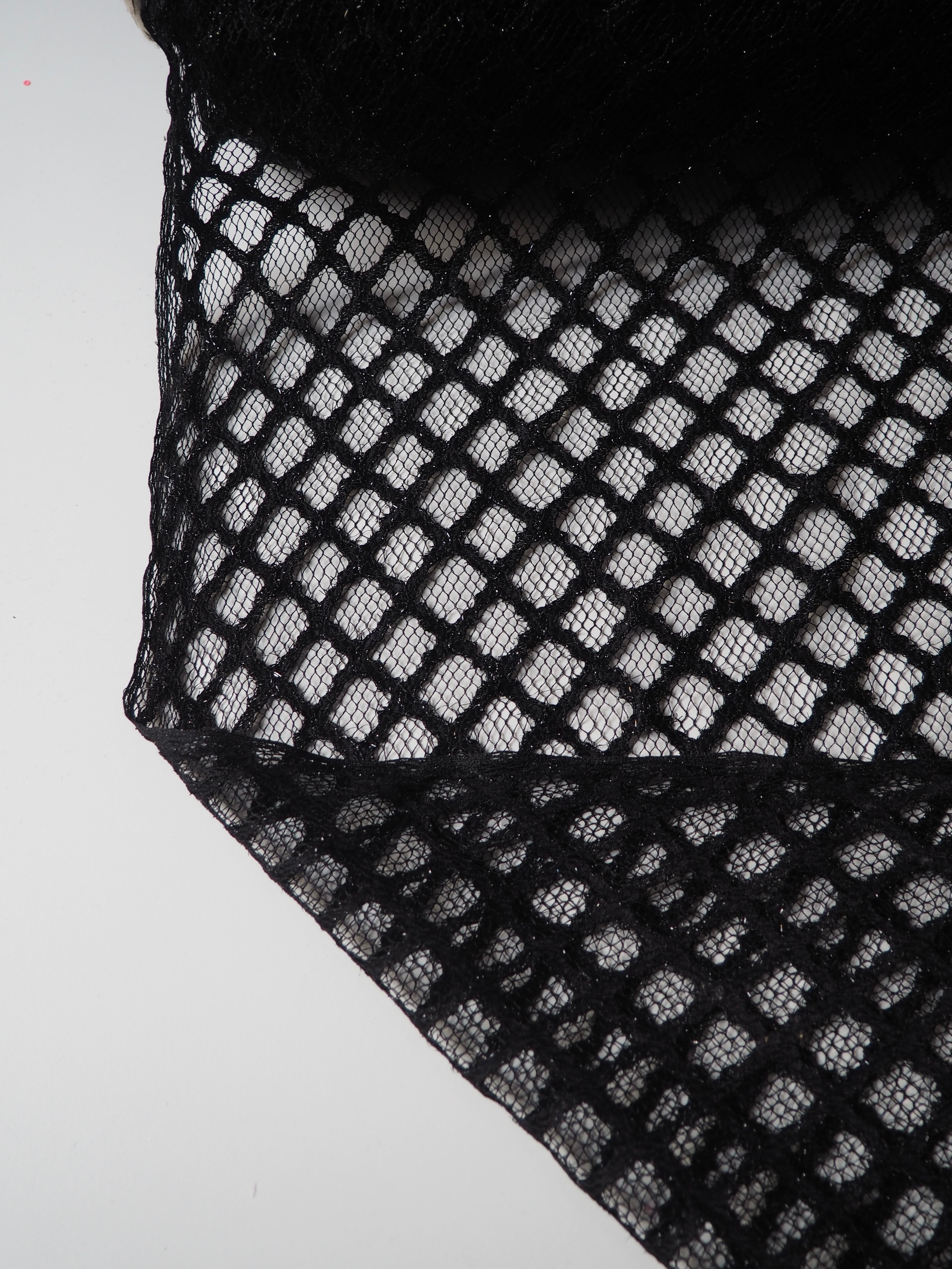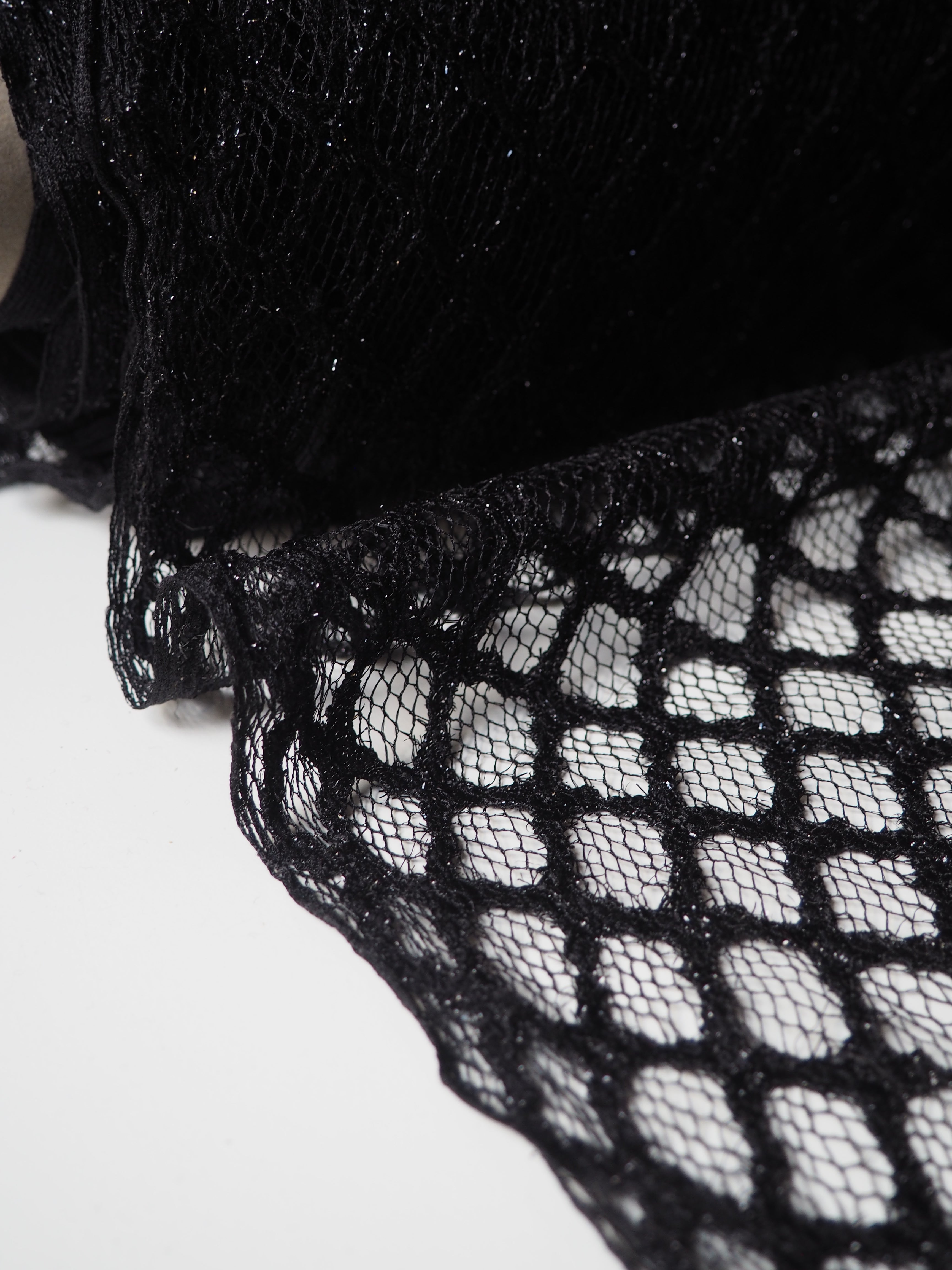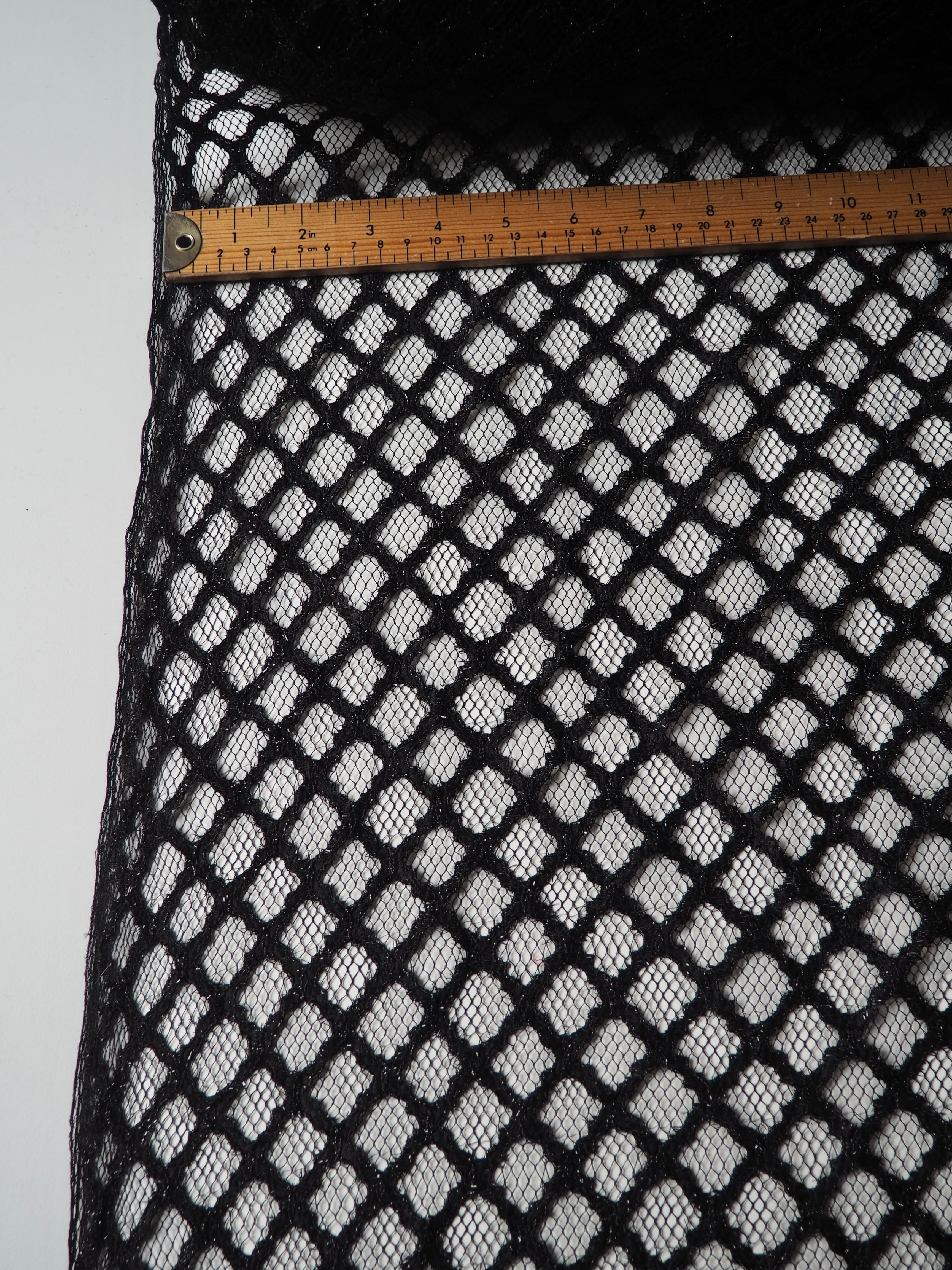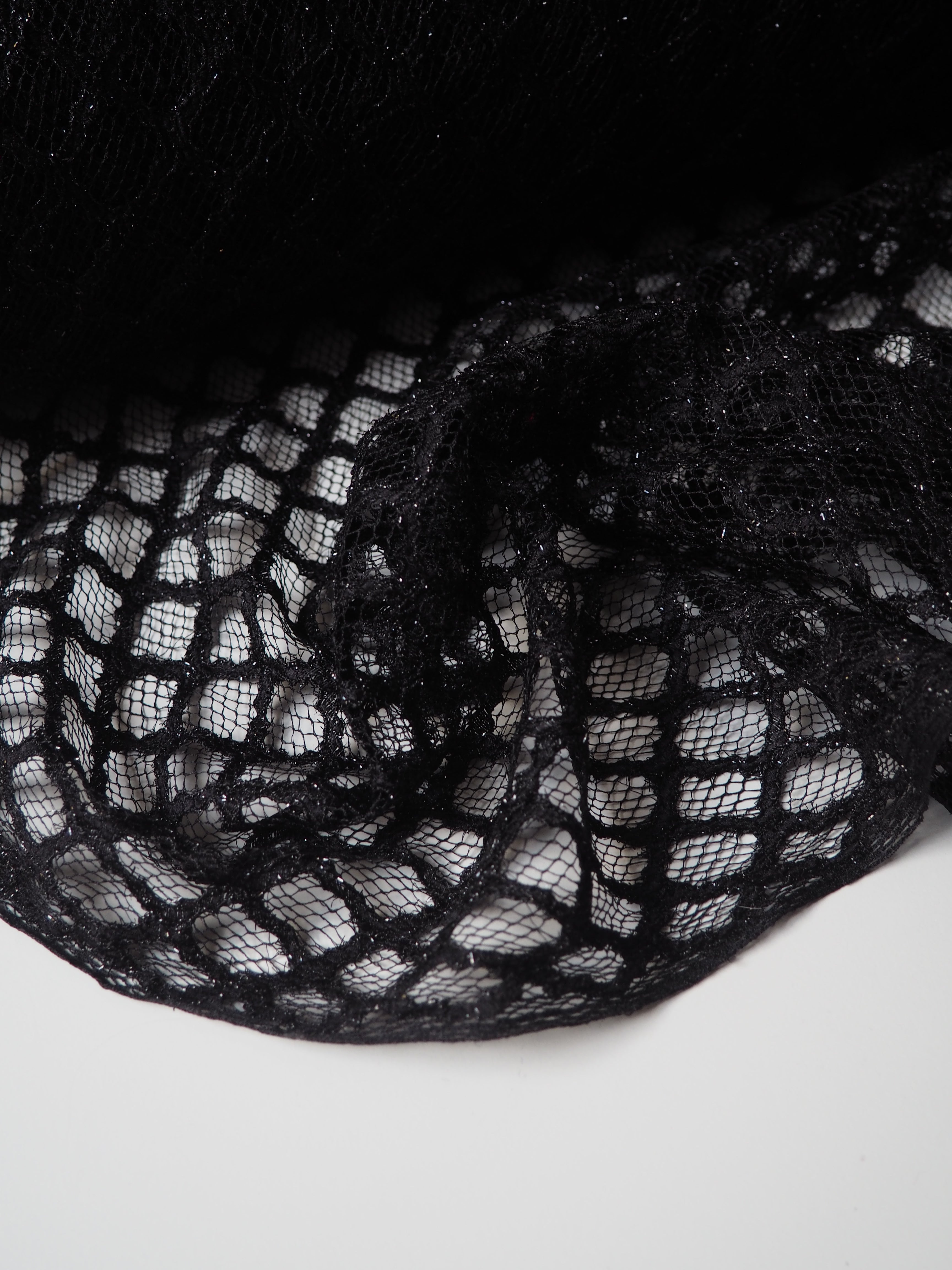 This ex-designer fabric is a lurex lace. It has a fishnet/honeycomb weave, with black lurex threads giving it a bit of sparkle. It has a gentle diamond cording, and looks quite luxe. It's very lightweight and has a wonderful drape and movement. This is made for showstopping projects, from sheer tops to overlays, and even lingerie!