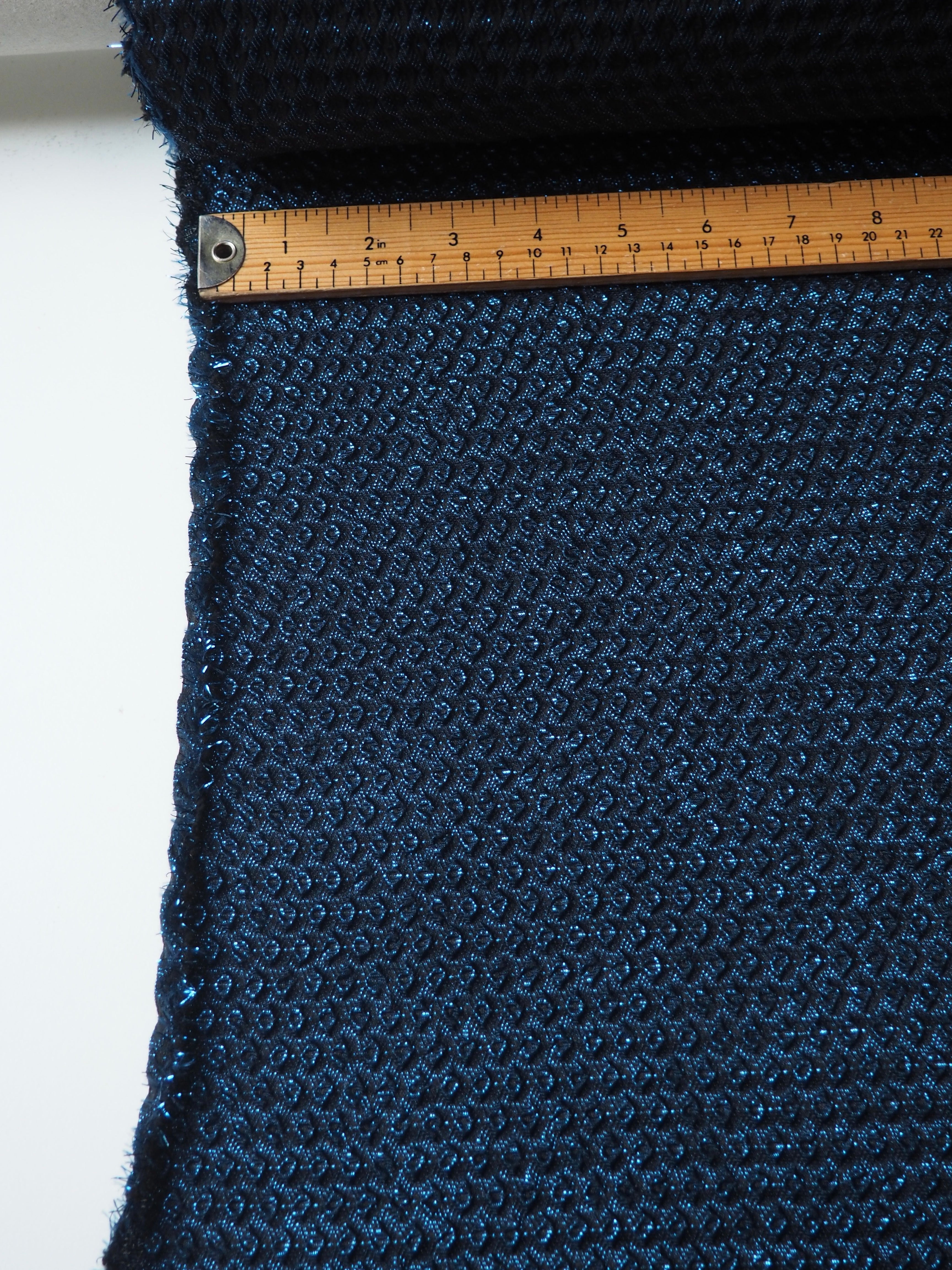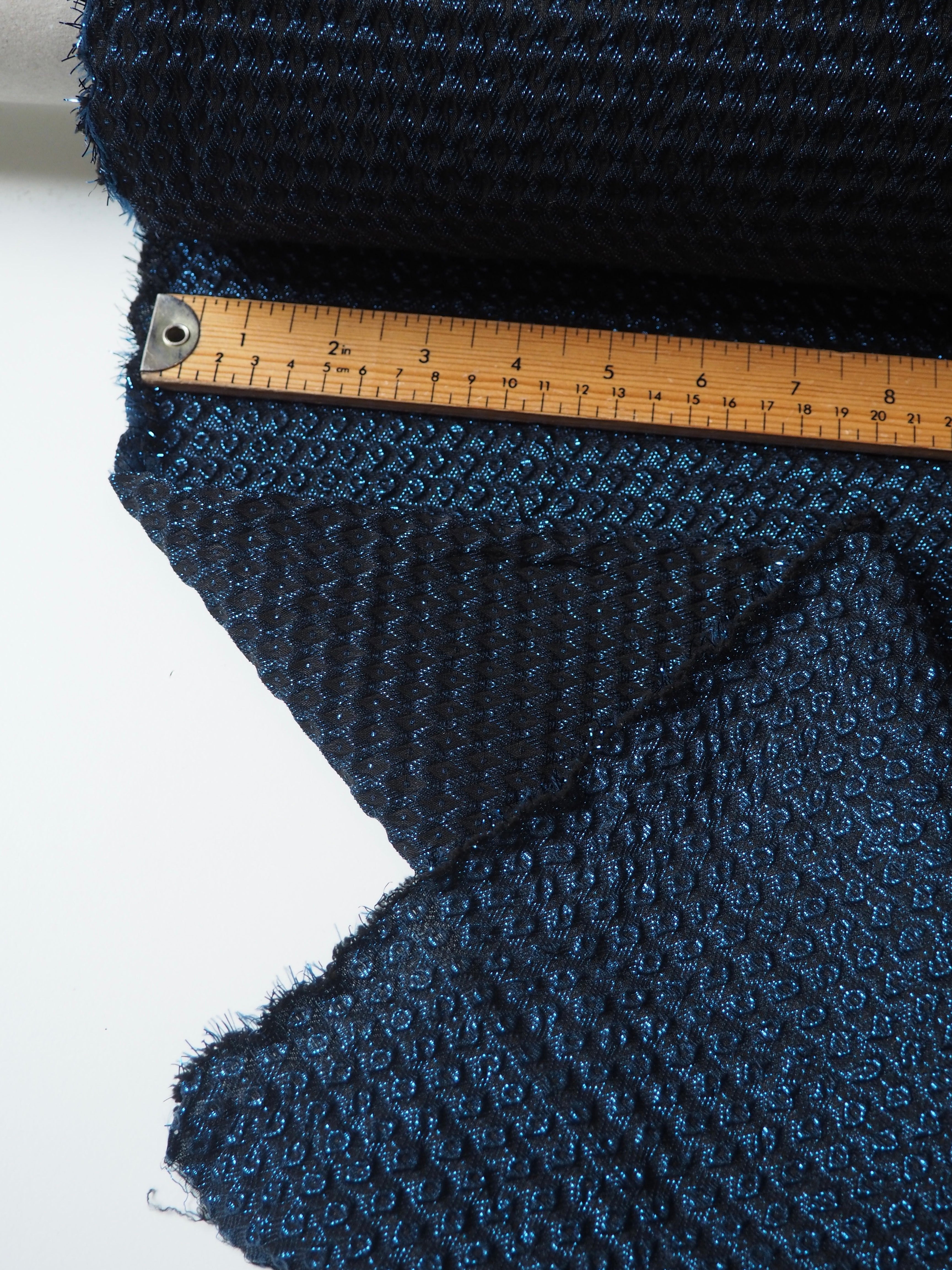 This ex-designer fabric is lovely cloqué. It is a black and blue cloth with a dotted weave on one side, and a diamond weave on the other. This makes it plush and gives it a quilted look. Lightweight, great structure to play with, and eye-catching with the metallic threads. So fun for a light jacket, waistcoat, or puffy dress or Everyday Top!