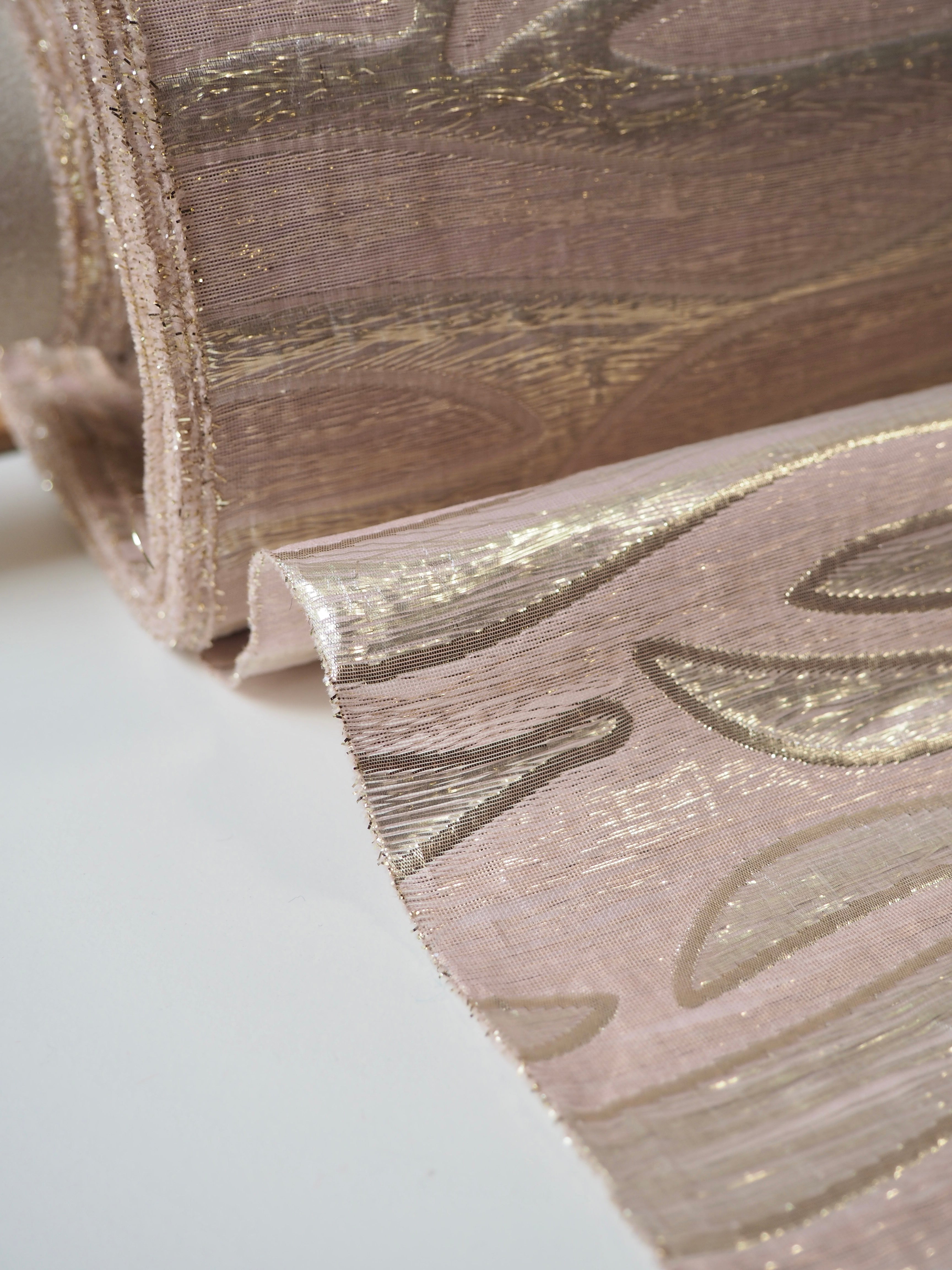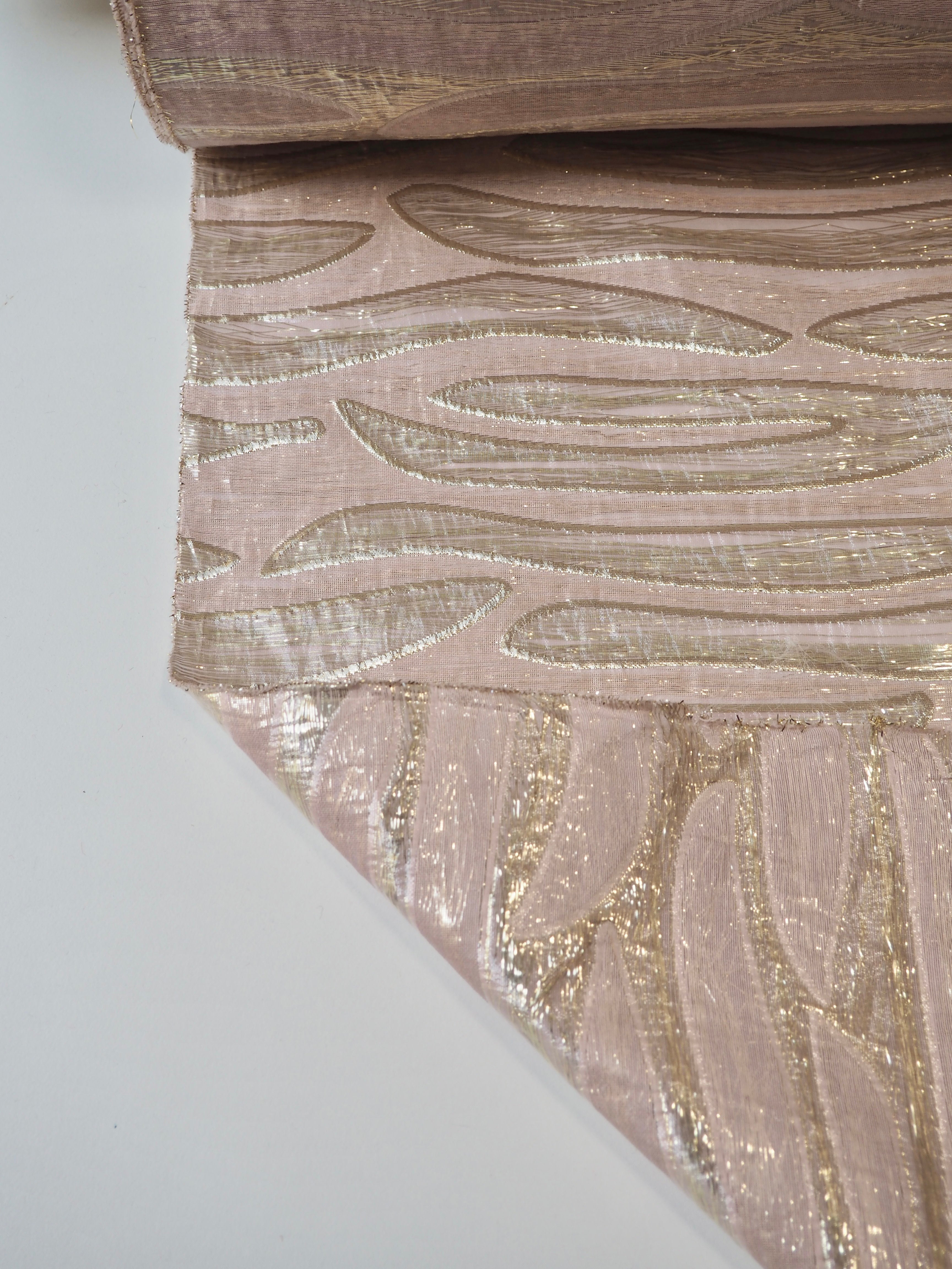 This ex-designer fabric is a stunning jacquard. It's a double-layer organza, with half-jacquard, half-sandwiched metallic threads that move freely within the sheer zebra design.  It's so eye-catching and quite smooth in handle. It has fantastic structure to play with, is semi-sheer, and quite lightweight. It's one-of-a-kind and great for a top, or even a lined dress!