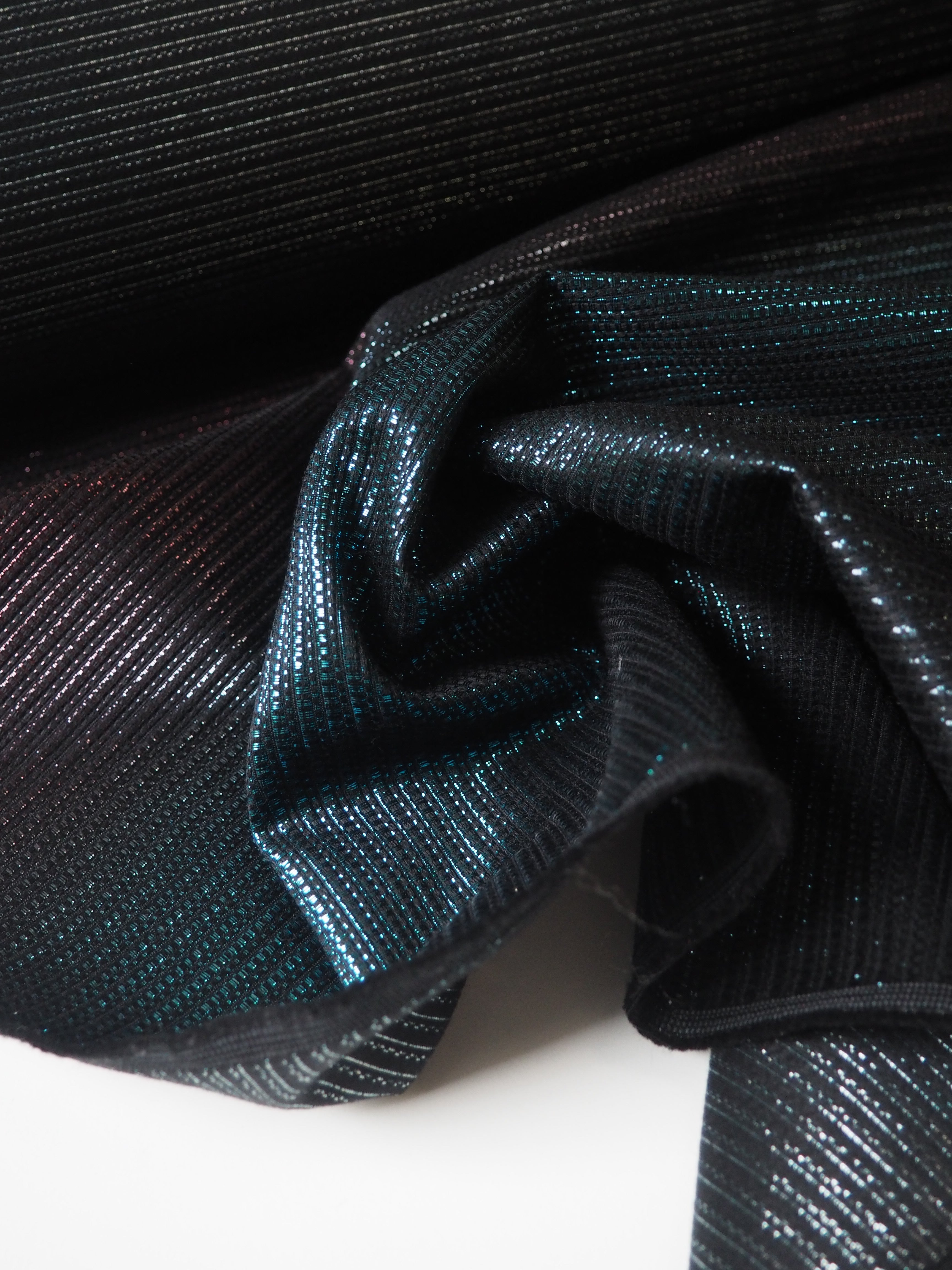 This ex-designer fabric is a jacquard. It's a wool and lurex jacquard, with green and pink ombre threads alternating across the black. It's sturdy, with a wool-y feel and beautiful sheen finish that catches the light quite well. Medium weight, and has lots of flexible structure. Opaque, looks so special! Perfect for a boxy cropped jacket or coat!