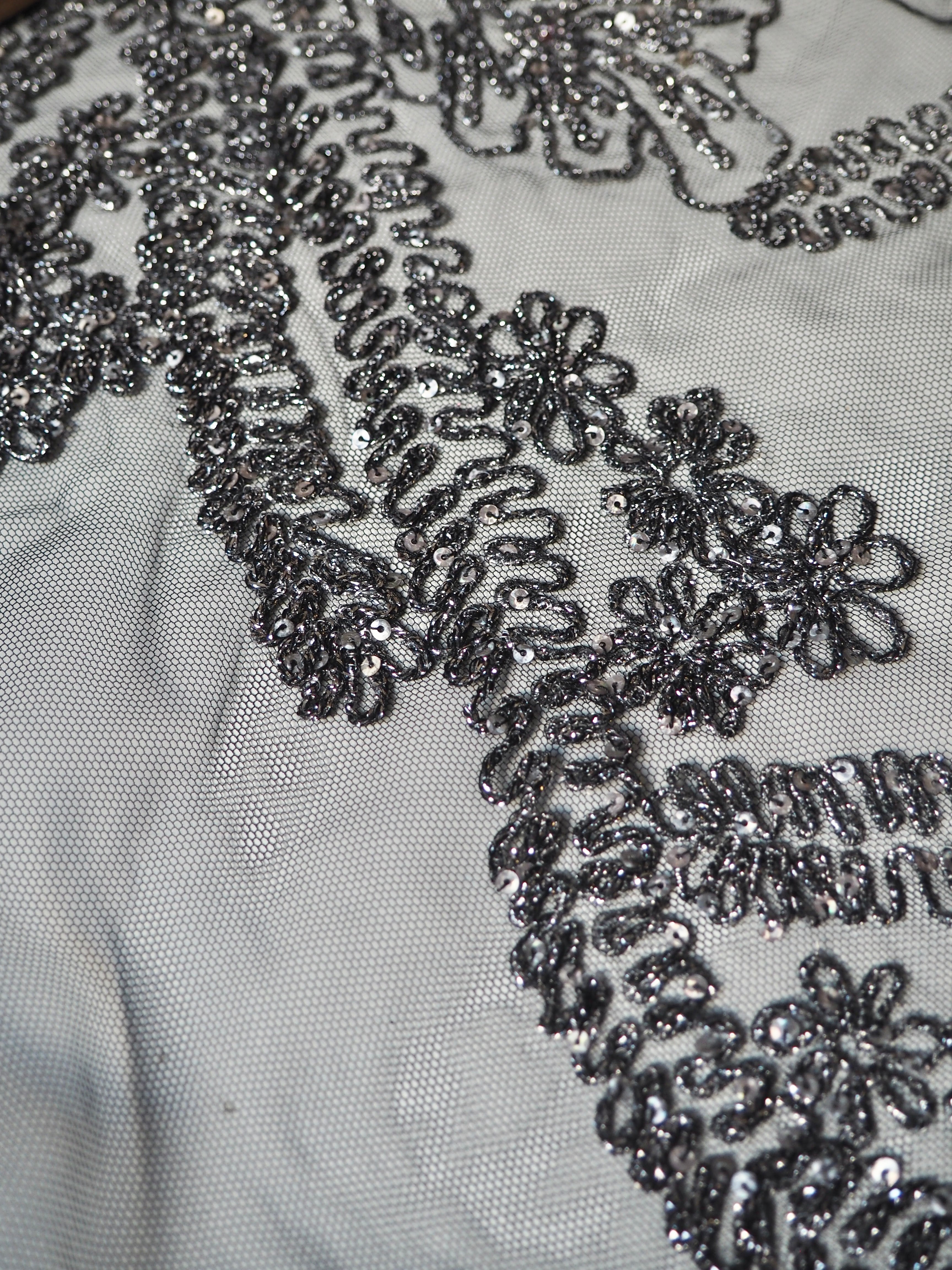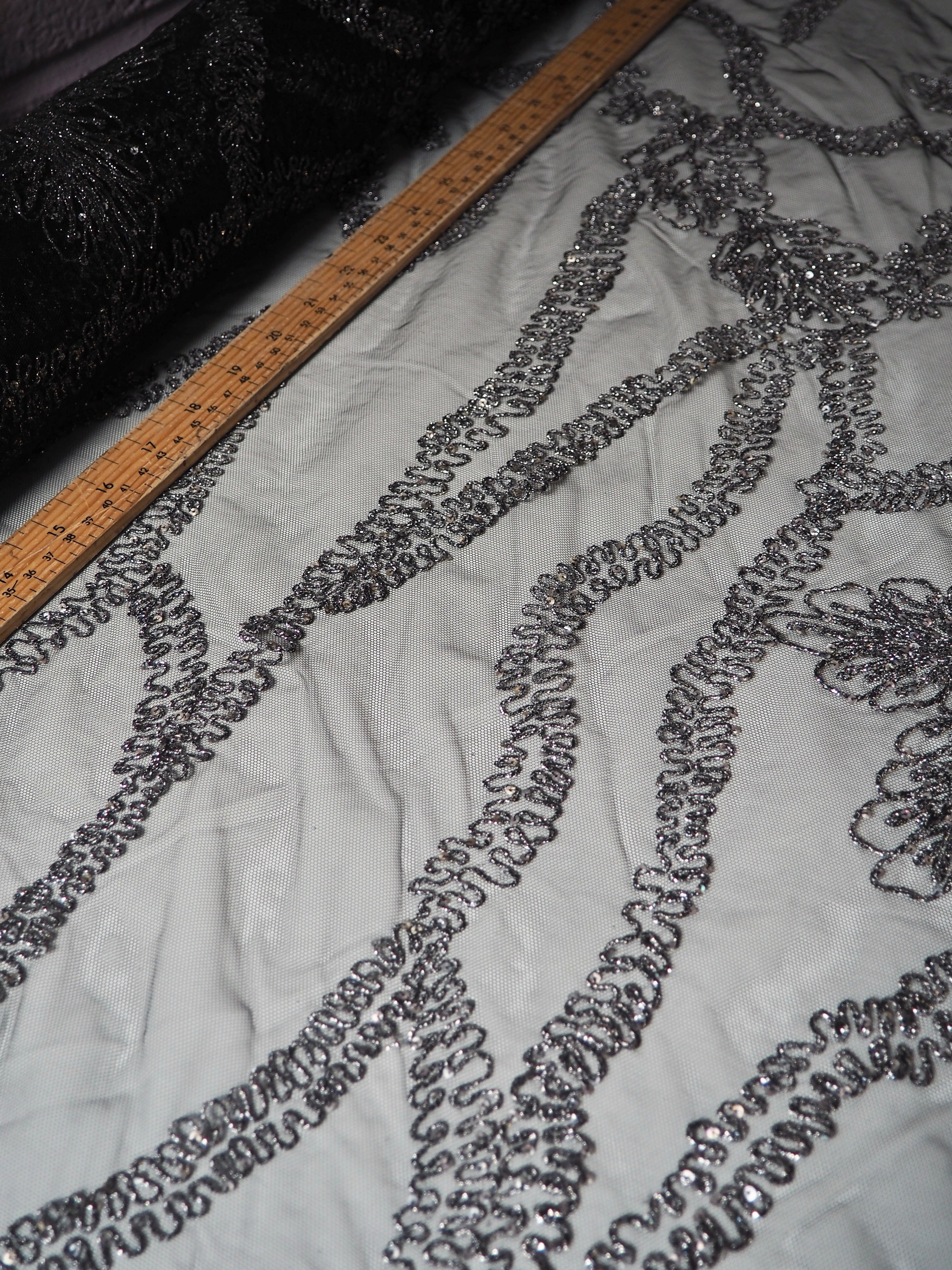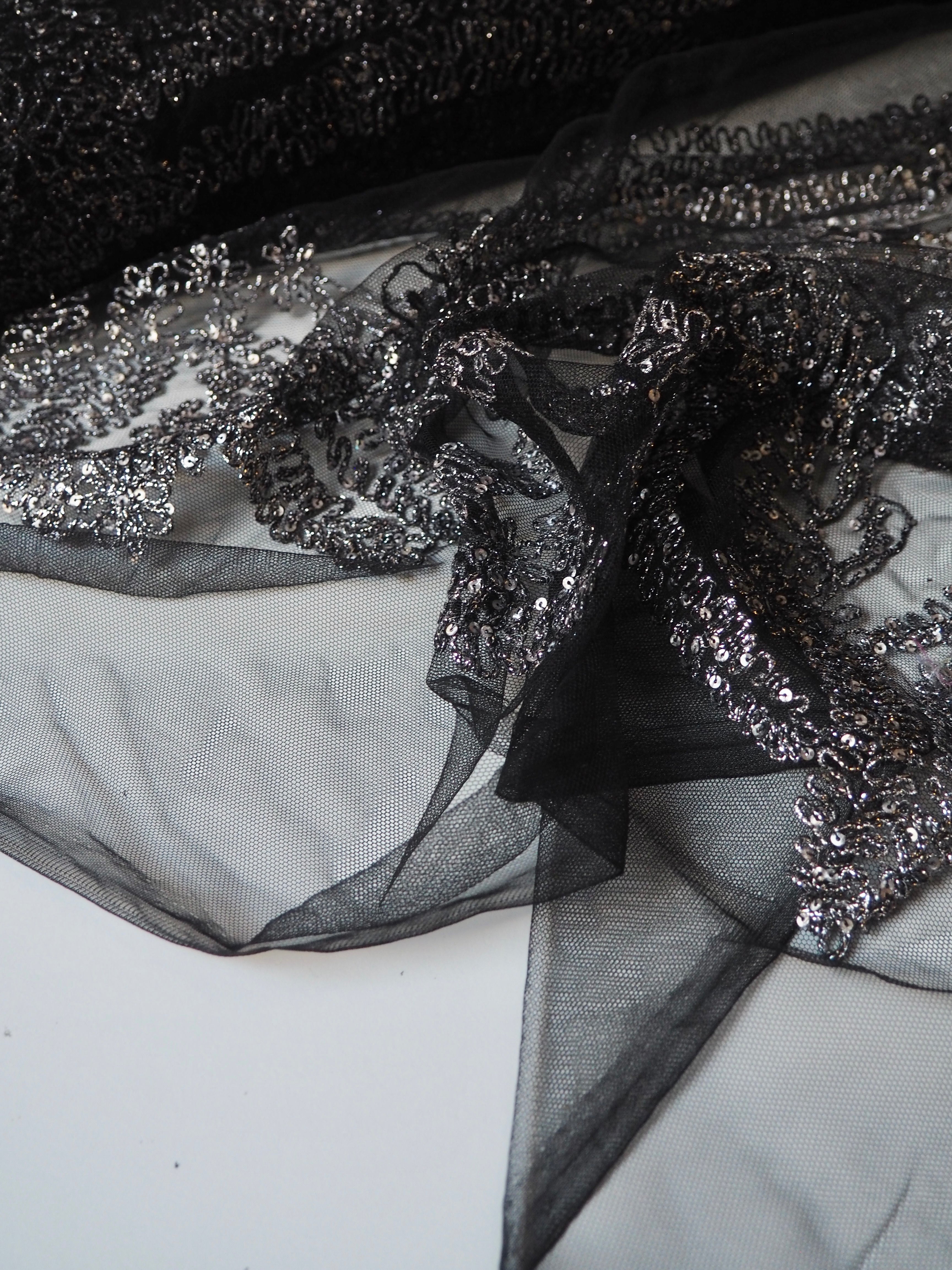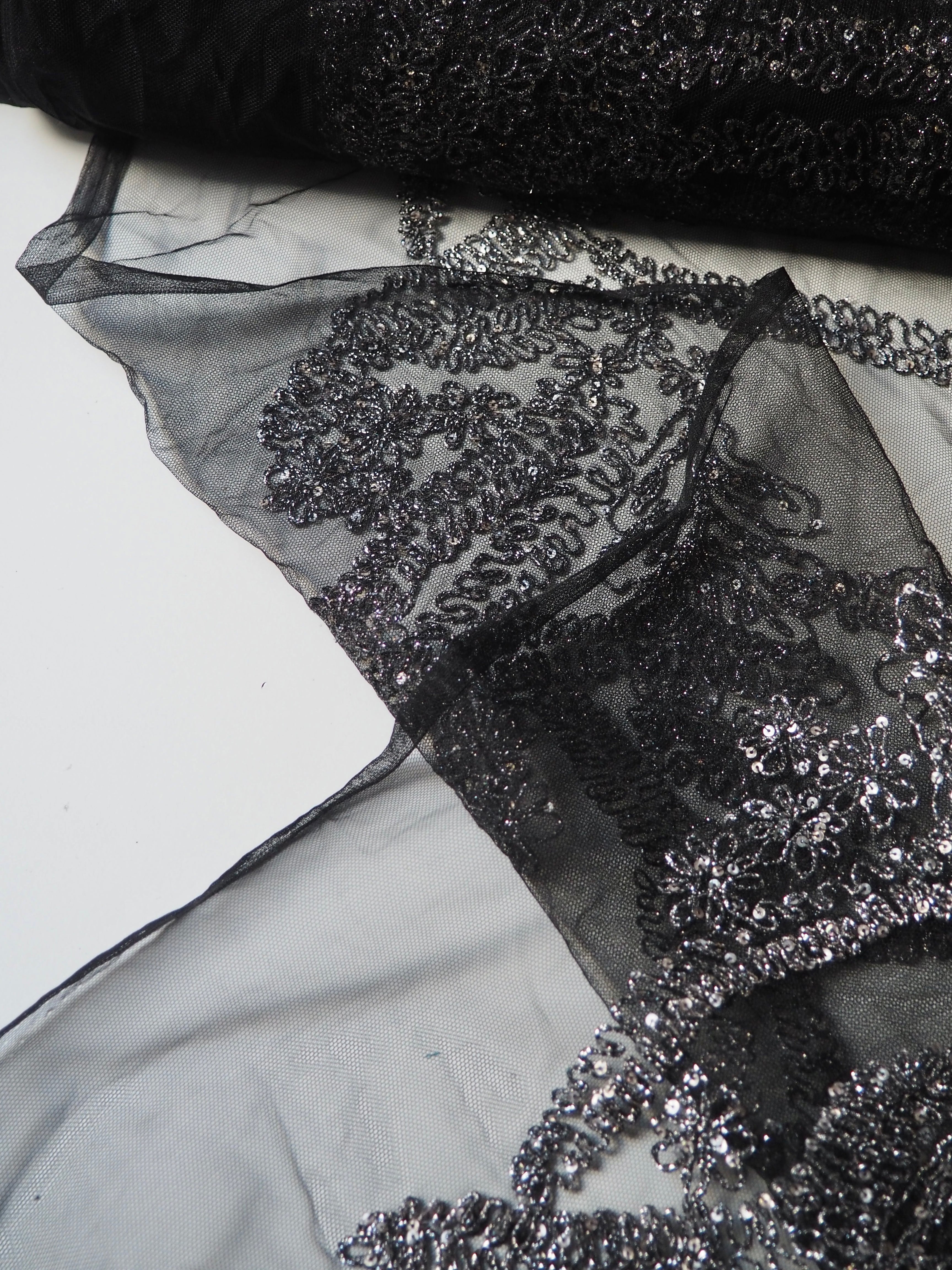 This ex-designer fabric is a gorgeous tulle. Gunmetal lurex and sequin trim is embroidered into vine and garland-like designs on this black tulle in medium coverage. Has a soft handle, lovely movement, and a gentle structure. Lightweight and semi-sheer. The cloth could be cut out and reapplied, or be used as is for lingerie, evening wear, or an exquisite dress or top!