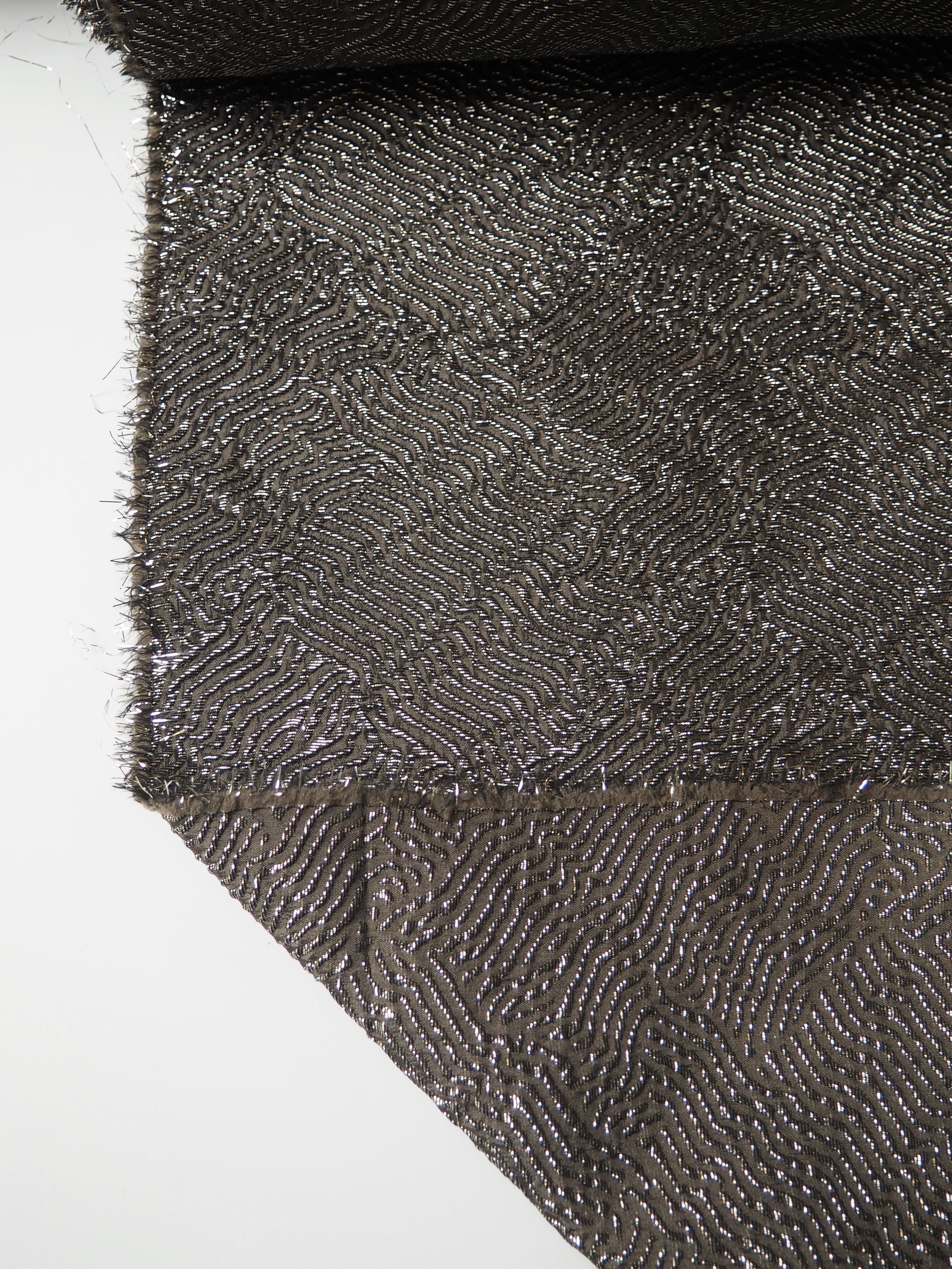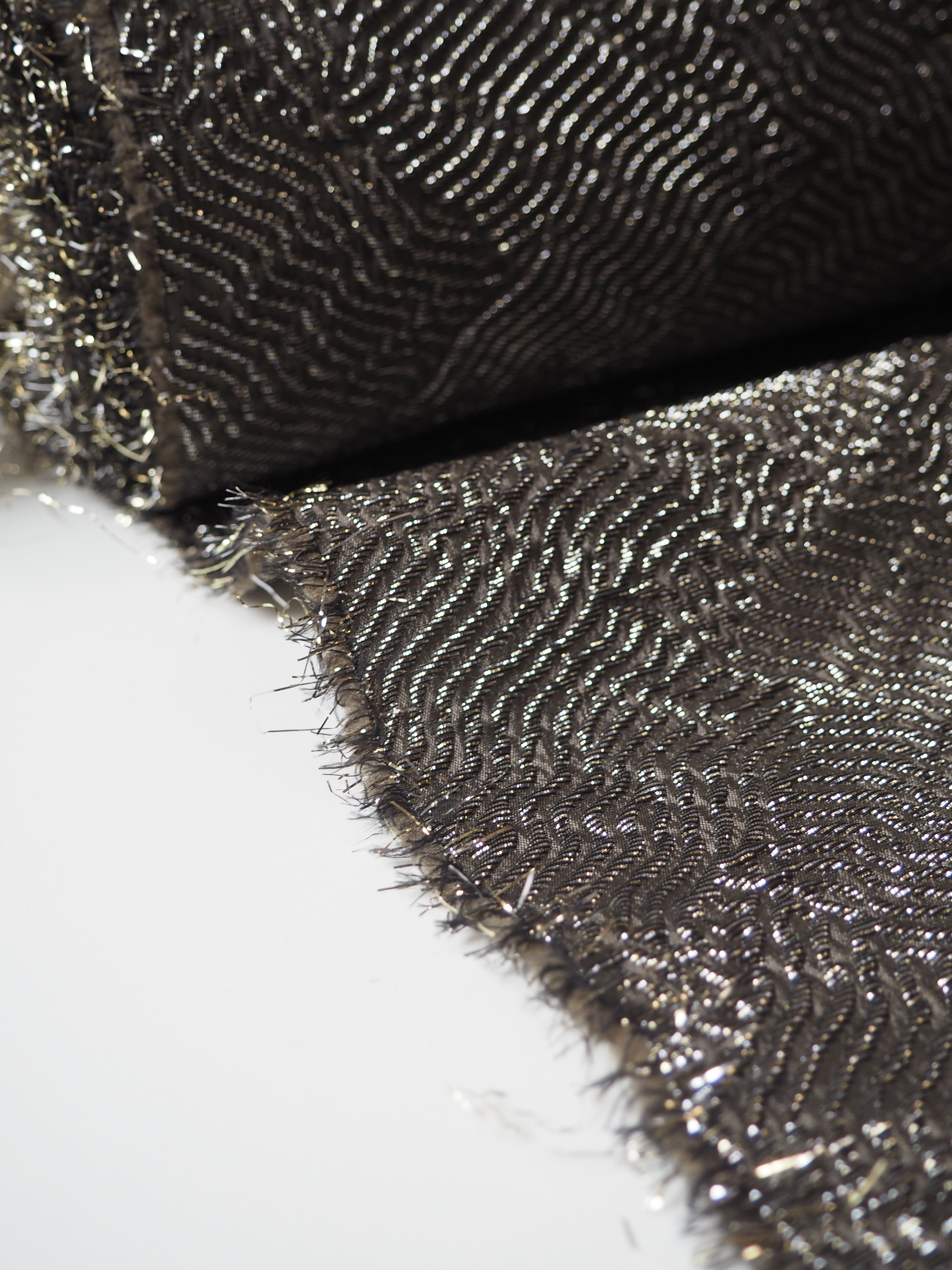This ex-designer fabric is a metallic jacquard. A wavy jacquard design is woven with metallic threads for a lightweight luxurious cloth. It sparkles so beautifully in the light, has a bouncy and flexible structure, and a plush, metallic-y handle. Perfect for a special dress or even a bag!