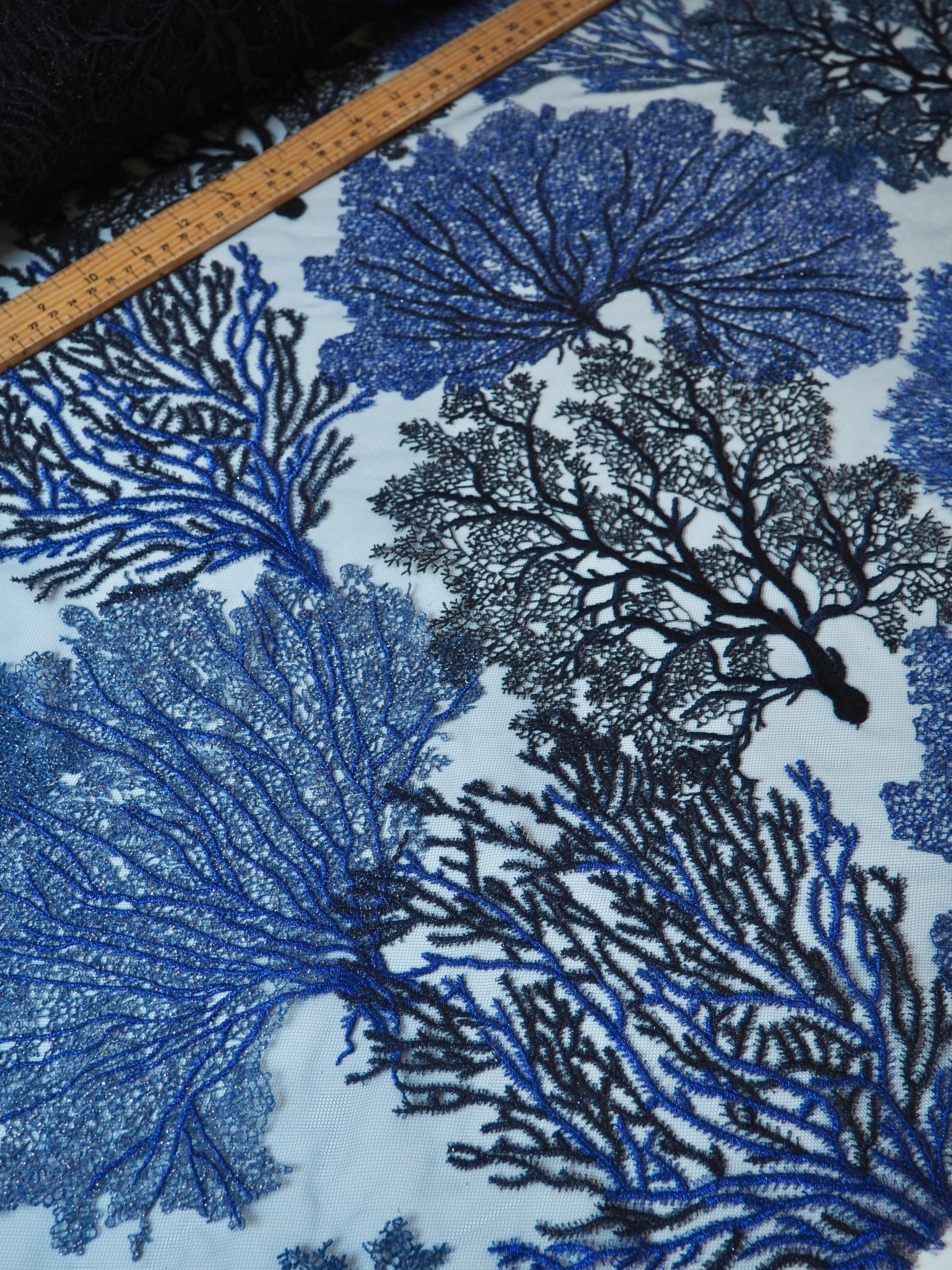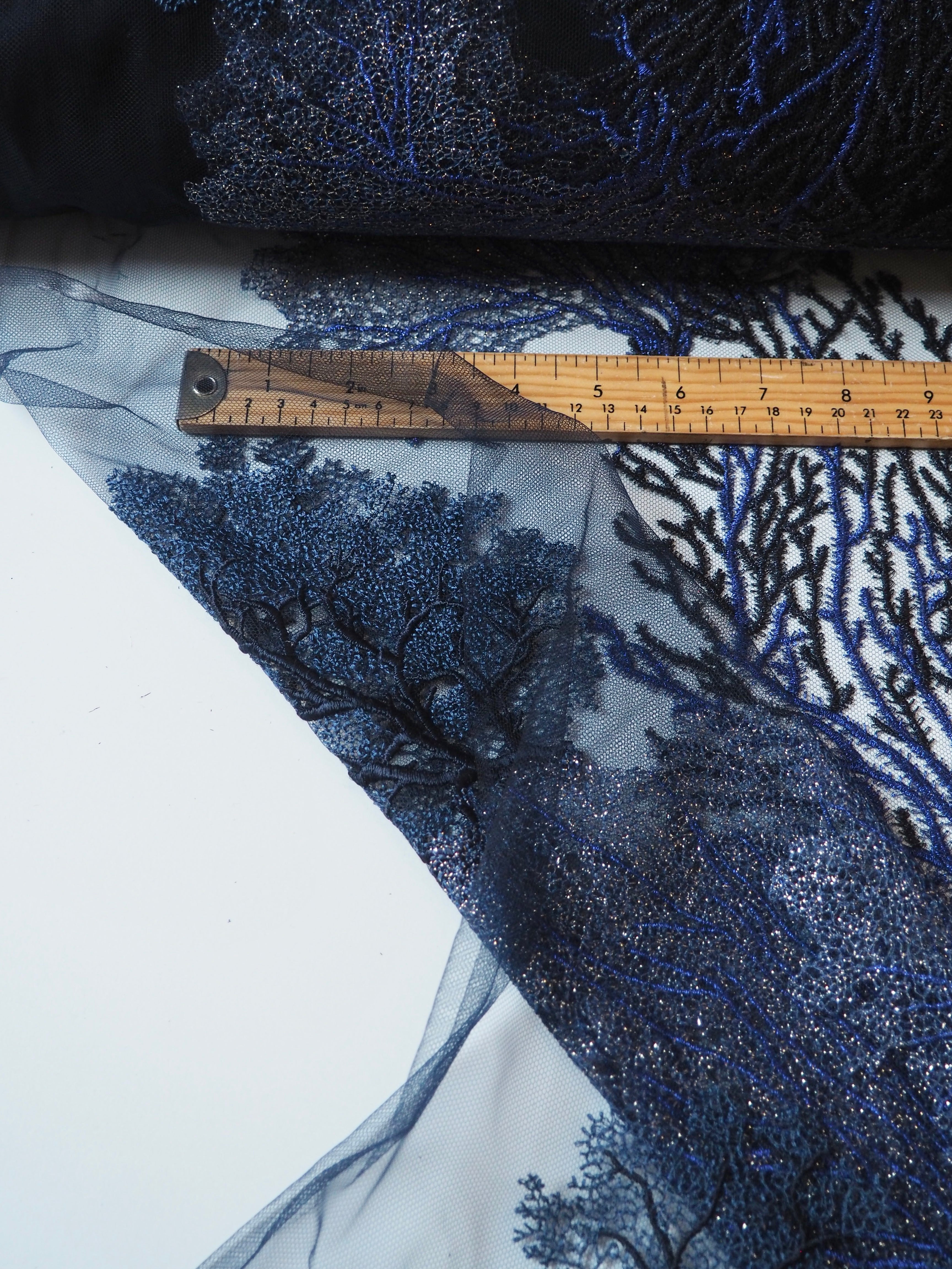 This ex-designer fabric is a gorgeous tulle. Rich purple and blue coral reef designs are embroidered into this midnight blue tulle in medium coverage. Has a soft handle, lovely movement, and a romantic swishy feel. Lightweight and semi-sheer. The cloth could be cut out and reapplied, or be used as is for lingerie, evening wear, or an exquisite dress or top!
