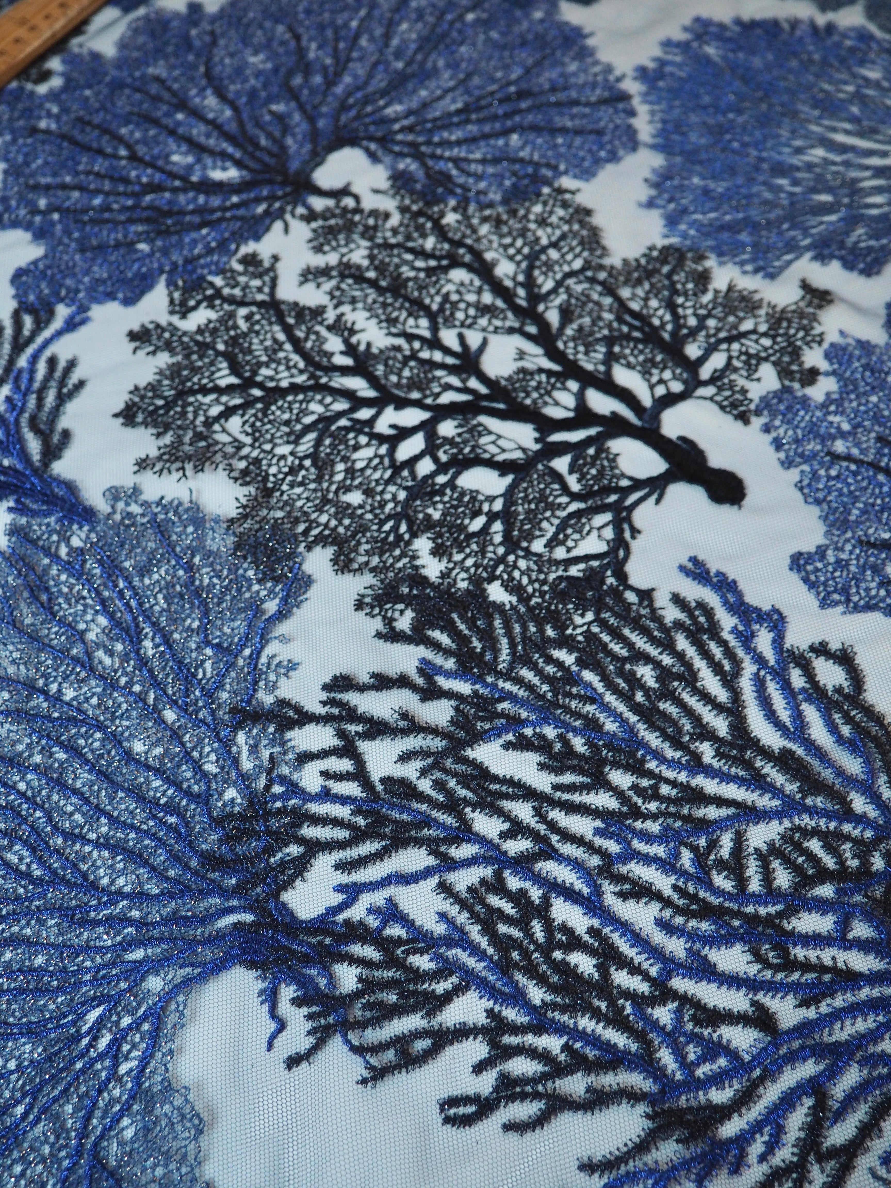 Rich Indigo Coral Lurex Embroidered Tulle