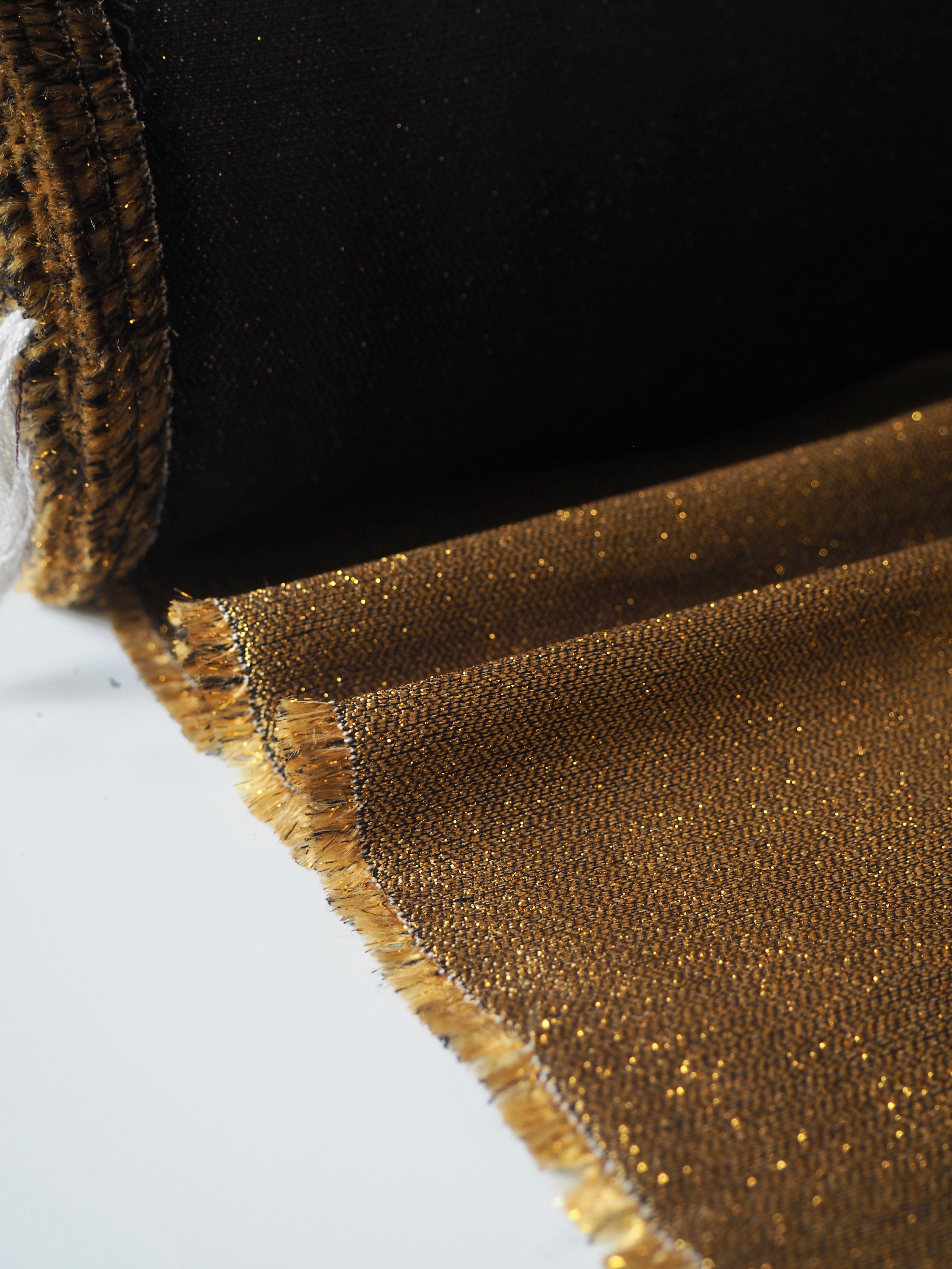 This ex-designer fabric is a cotton jacquard. This black jacquard mixes with yellow gold lurex threads into this two sided jacquard. It catches the light so beautifully and has a great structure. It's lightly textured, has a medium weight, and a typical lurex like handle.  Opaque, feels quite sturdy, and has a bright metallic finish. Would love to see a statement gilet or fitted dress or skirt!
