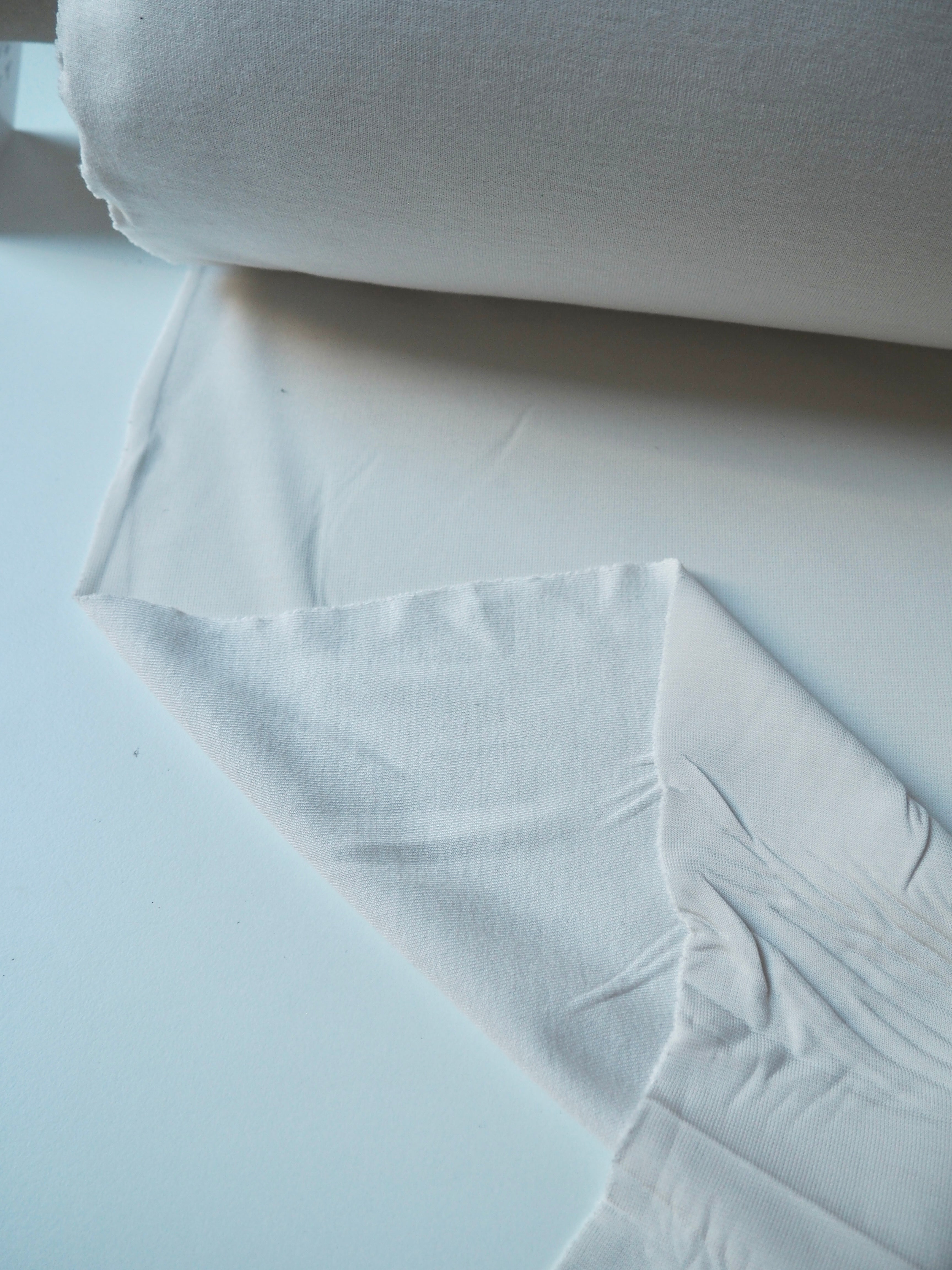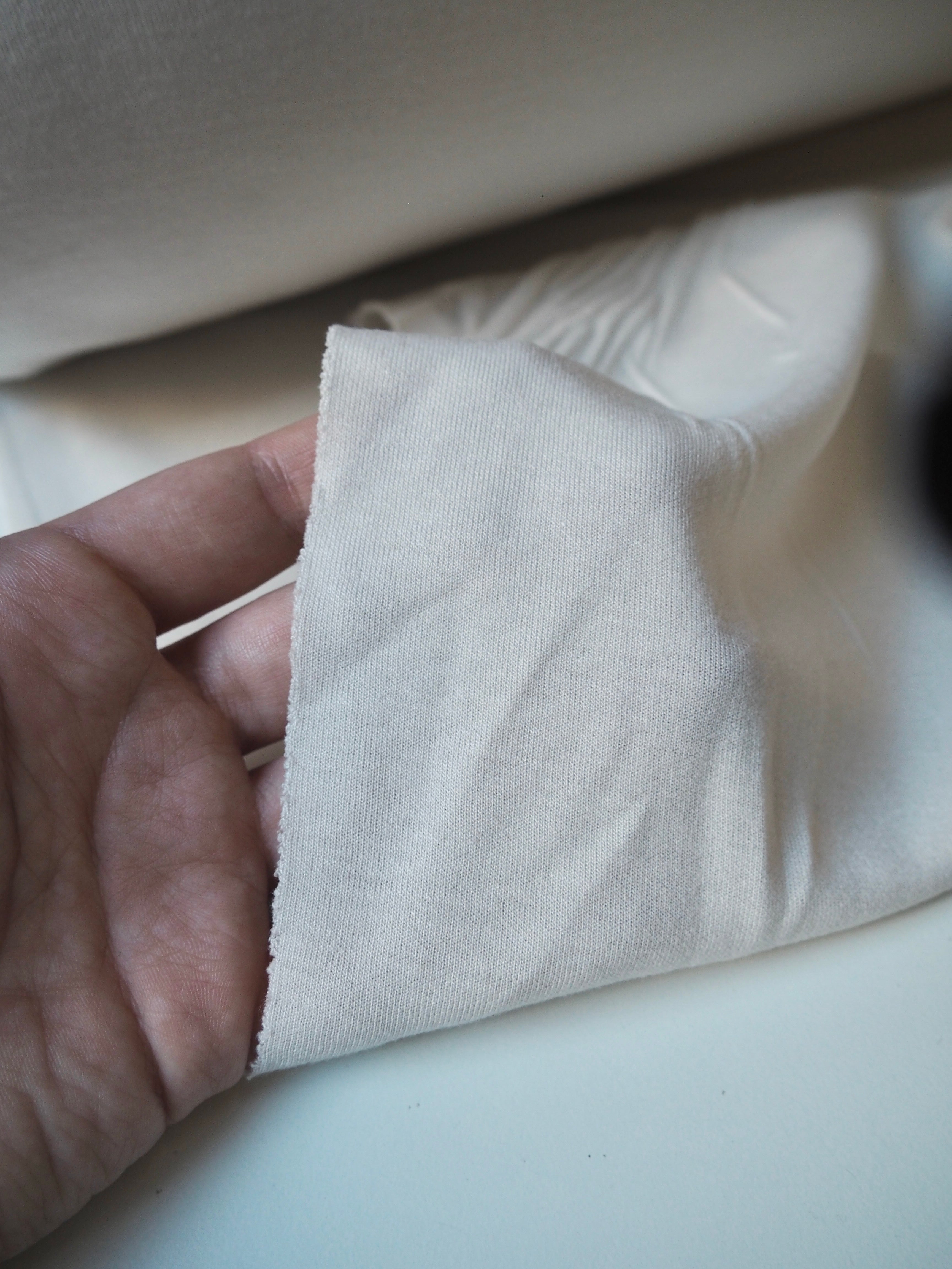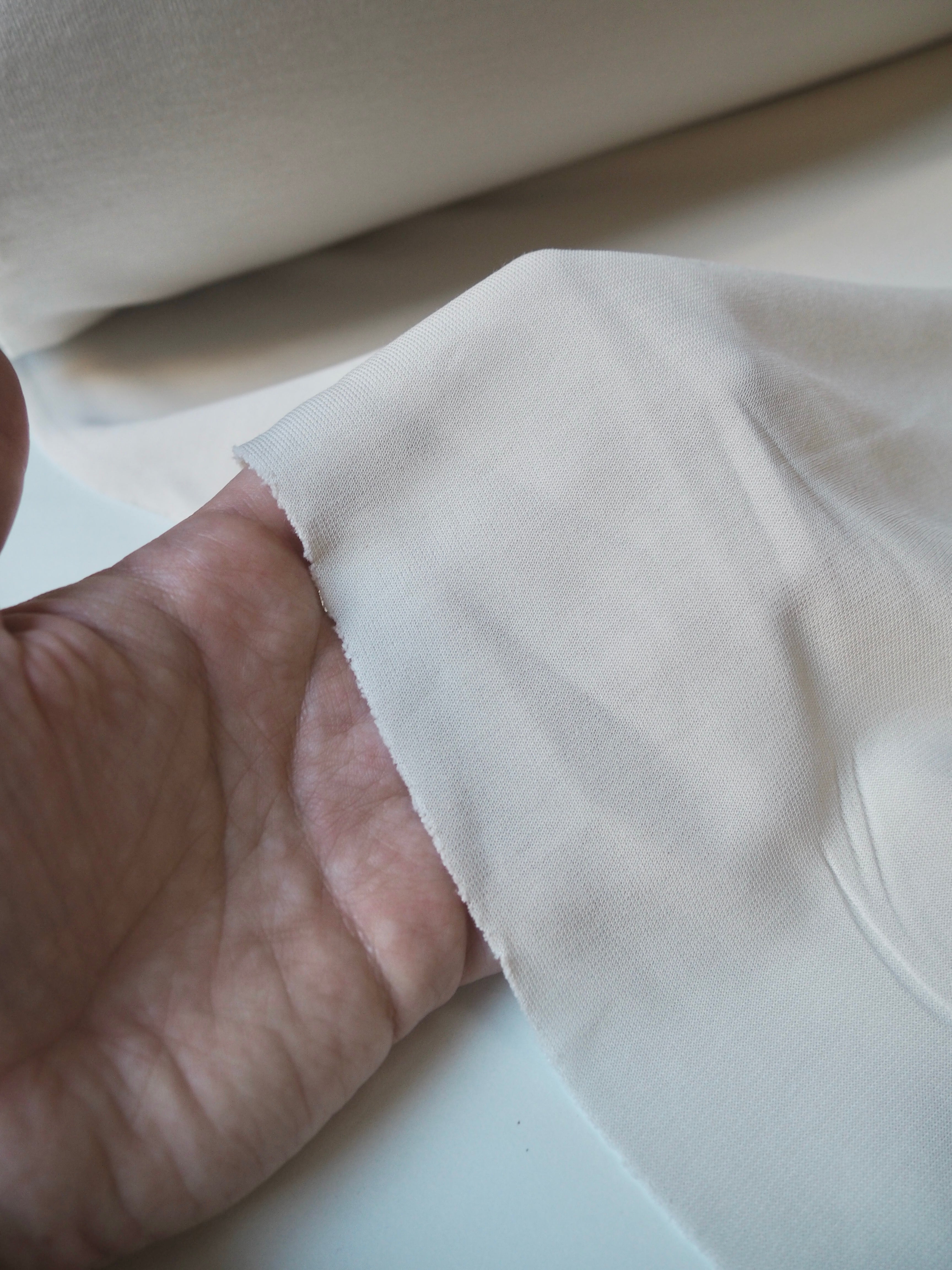This ex-designer fabric is a jersey. It's a double jersey with one side in viscose and the other in nylon. It has a beautiful drape that’s quite swishy, and a soft and slightly slinky handle. Quite lightweight! Has about 20% stretch both ways, and great recovery. Mostly opaque, only slightly sheer in the light. Perfect for tops or a skirt!