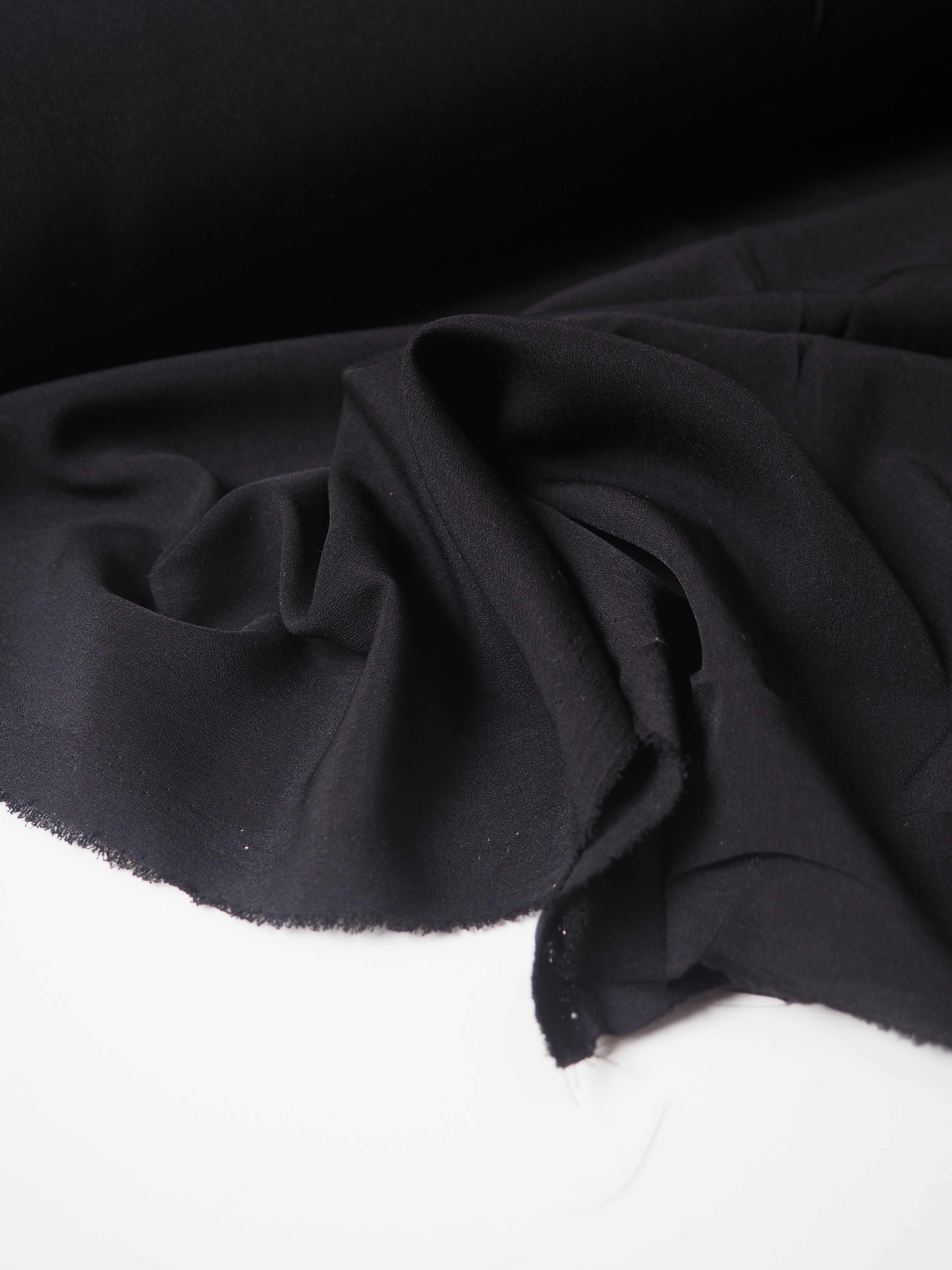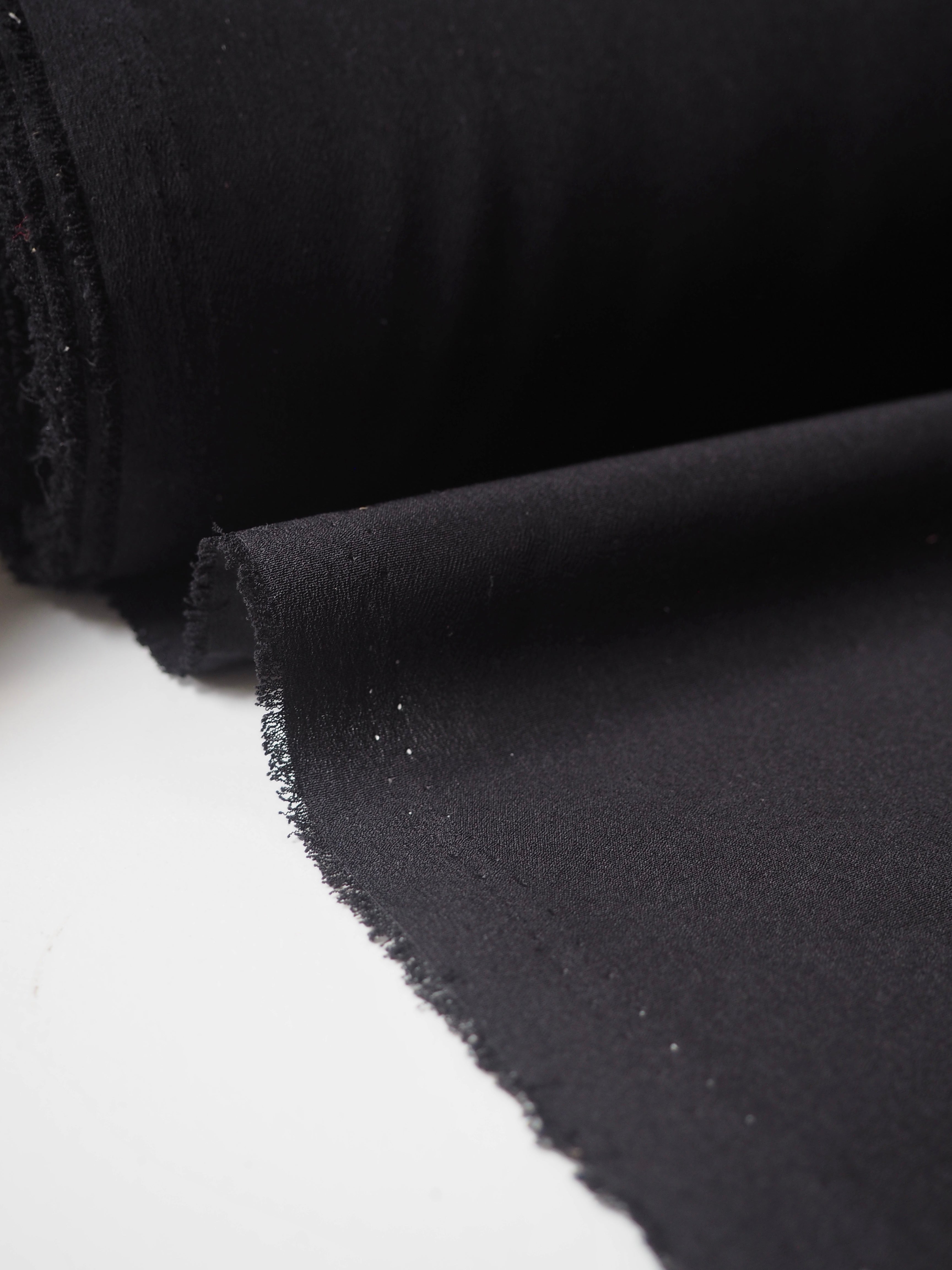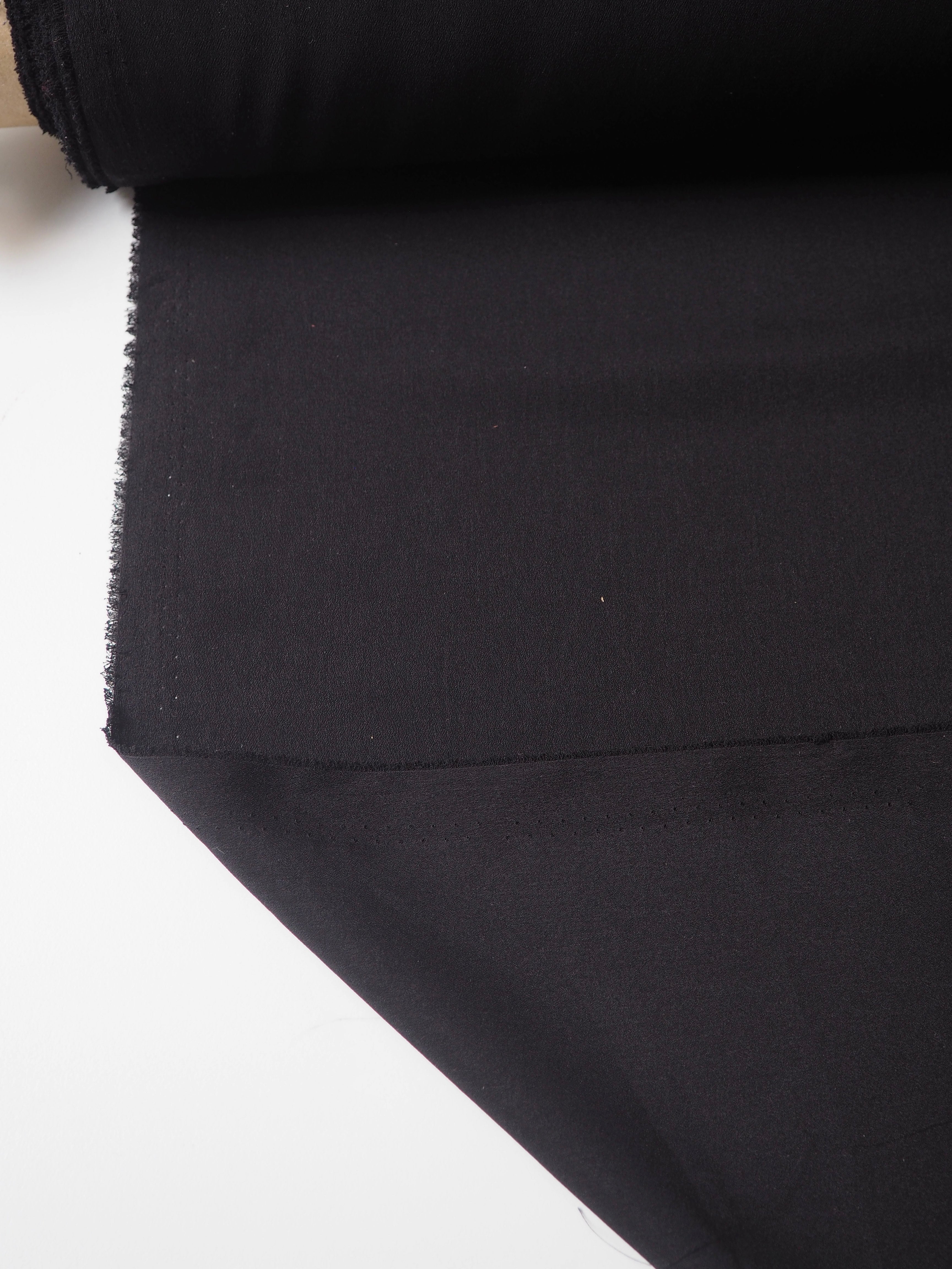 This ex-designer fabric is a crepe lining. This black cloth is a classic lightweight crepe that's great for basics and linings. It's smooth and comfortable on the skin, and lightweight with a lovely gentle drape. It's also almost fully opaque. Perfect for a jacket or trouser lining!