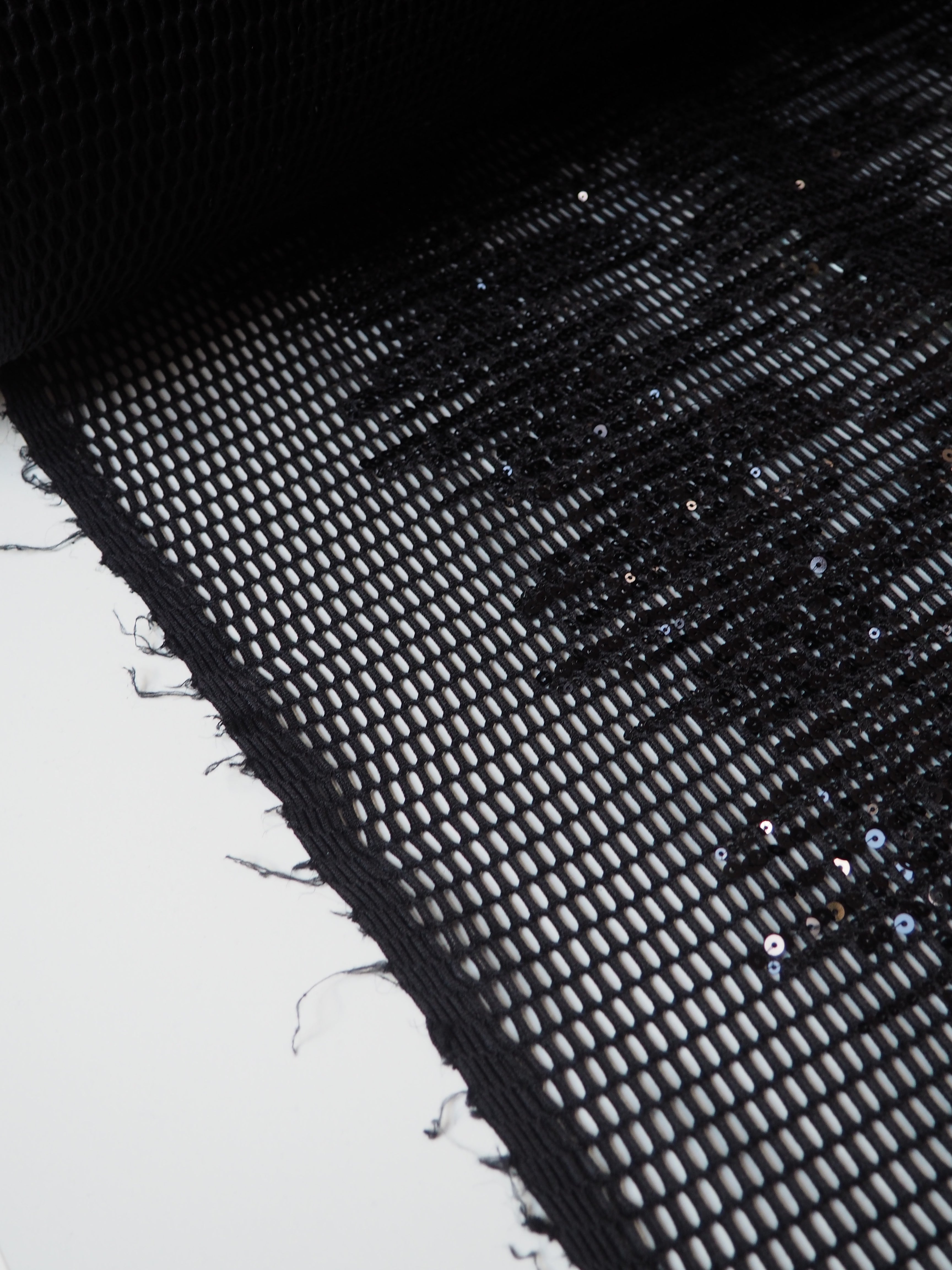This ex-designer fabric is a unique mesh. It's a black mesh with large holes, and black sequins stitched in abstract striped grouping across the cloth. It's lightweight and has a nice structure to play with. Great as an overlay, or to be used for a sheer top, or even a bag!