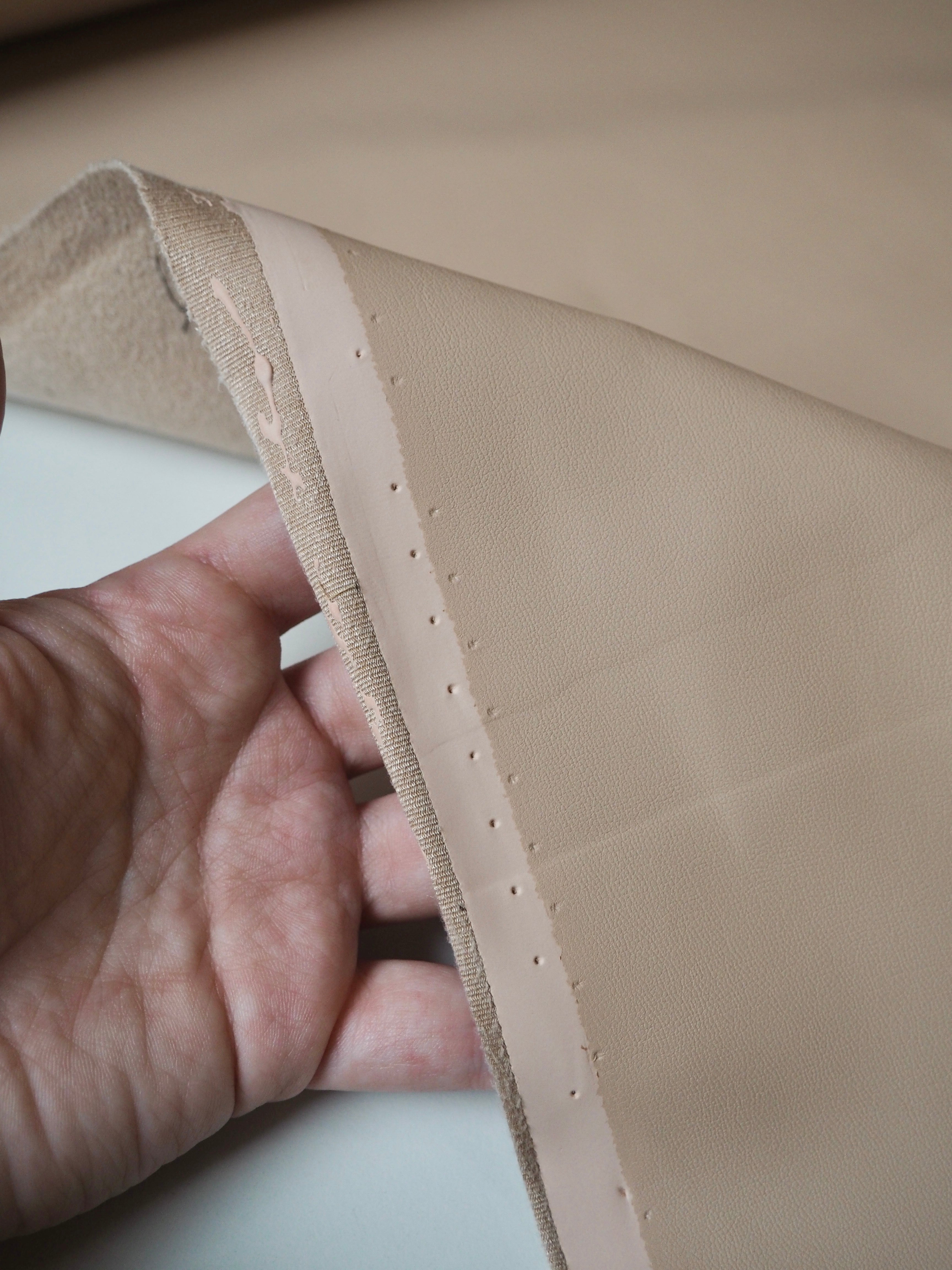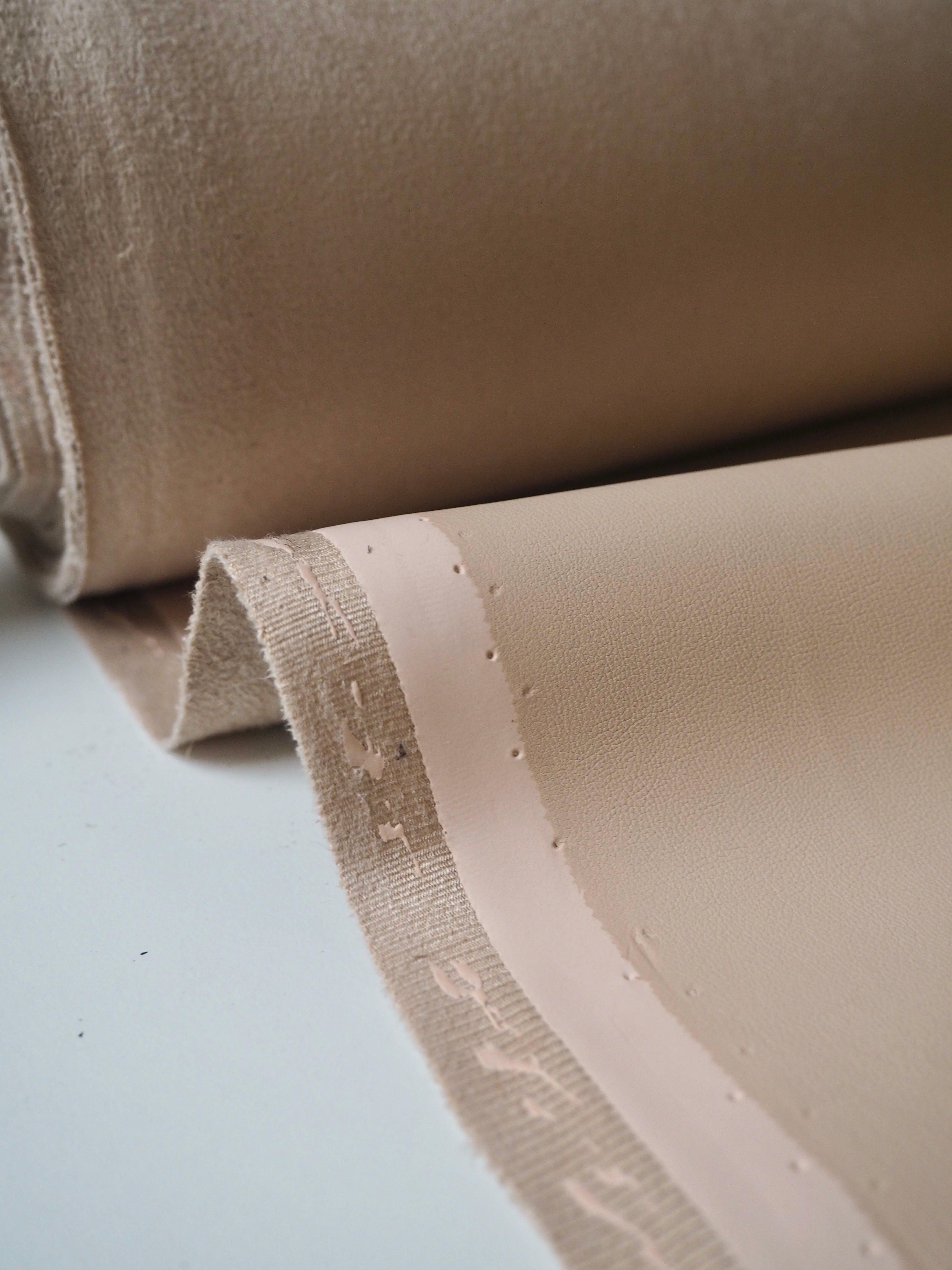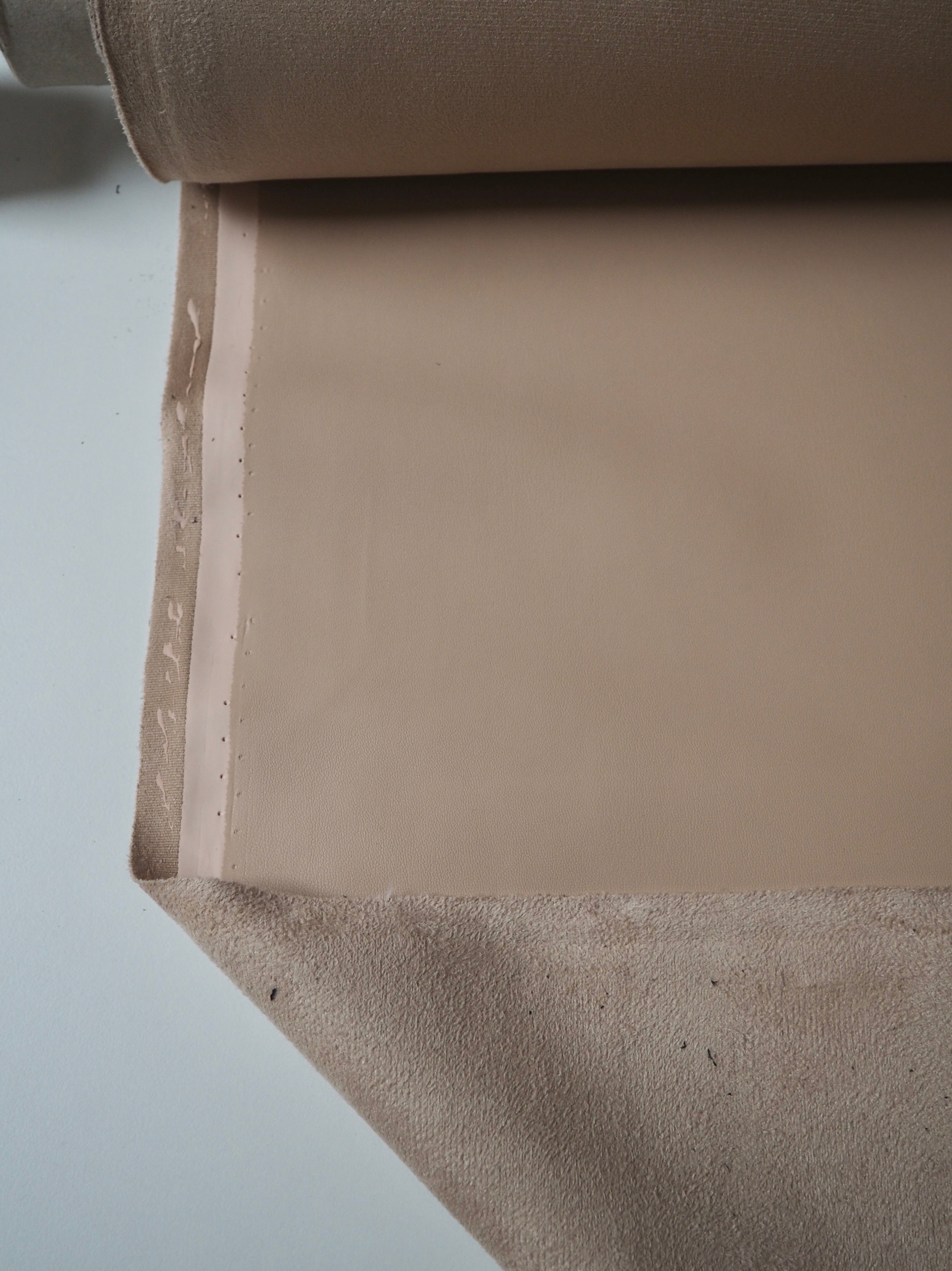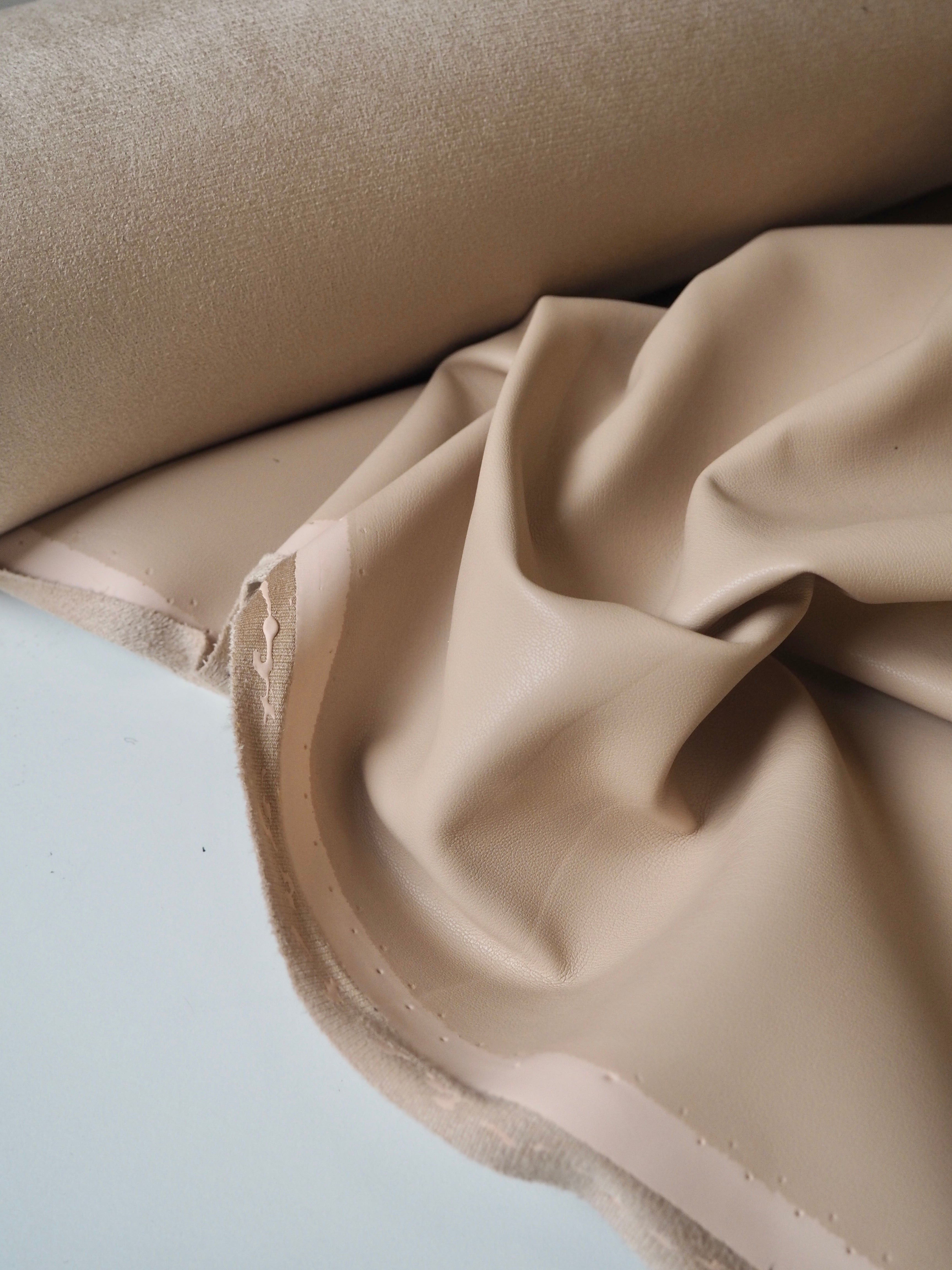 This ex-designer fabric is a stretch pleather. It's light to medium weight with a smooth finish. It has a polyurethane coating on a soft sueded beige jersey backing. Has about 10-20% stretch width-ways. Has a good structure and would hold shape well. We would love this in a structured jacket or for a bag!