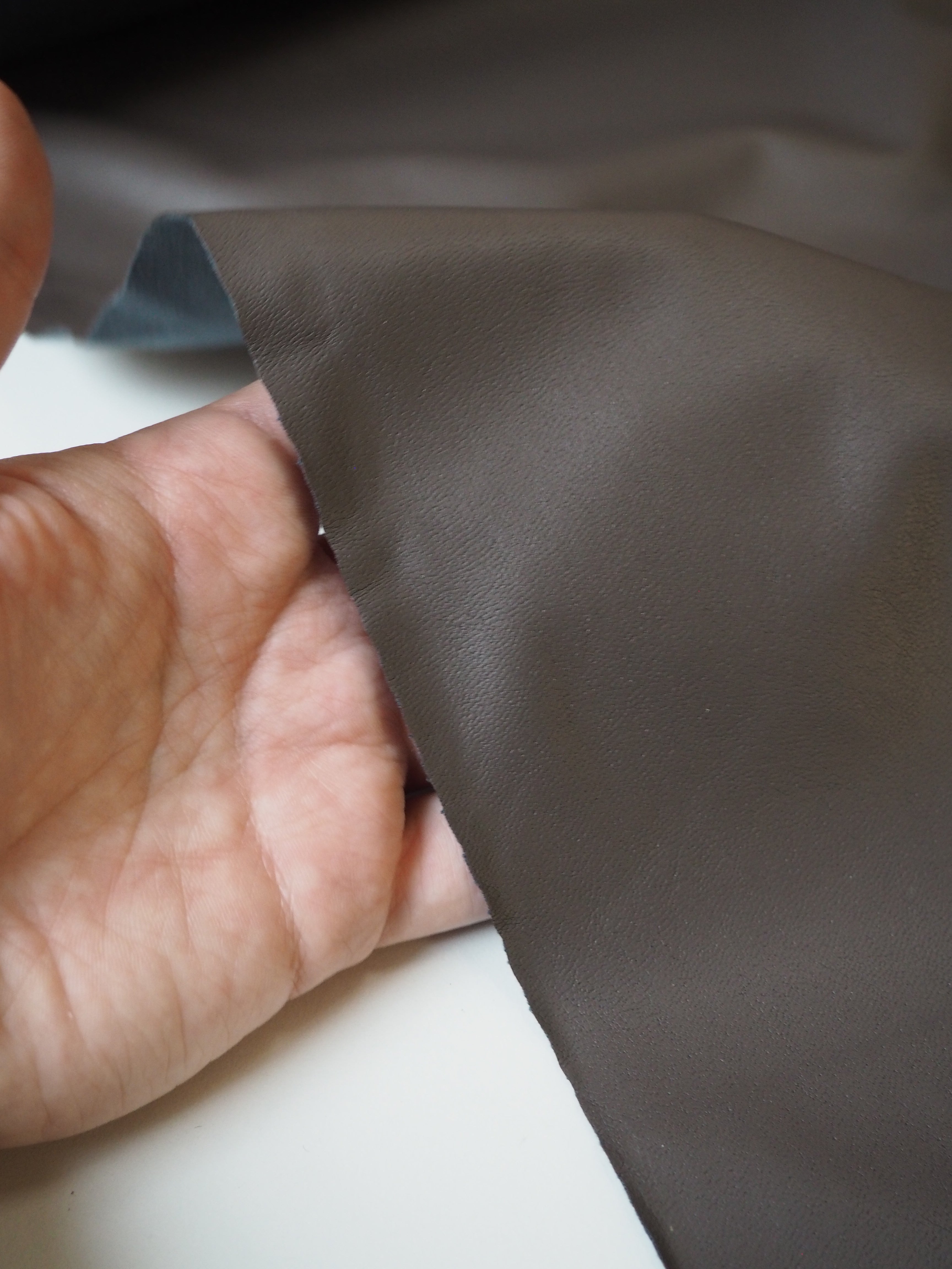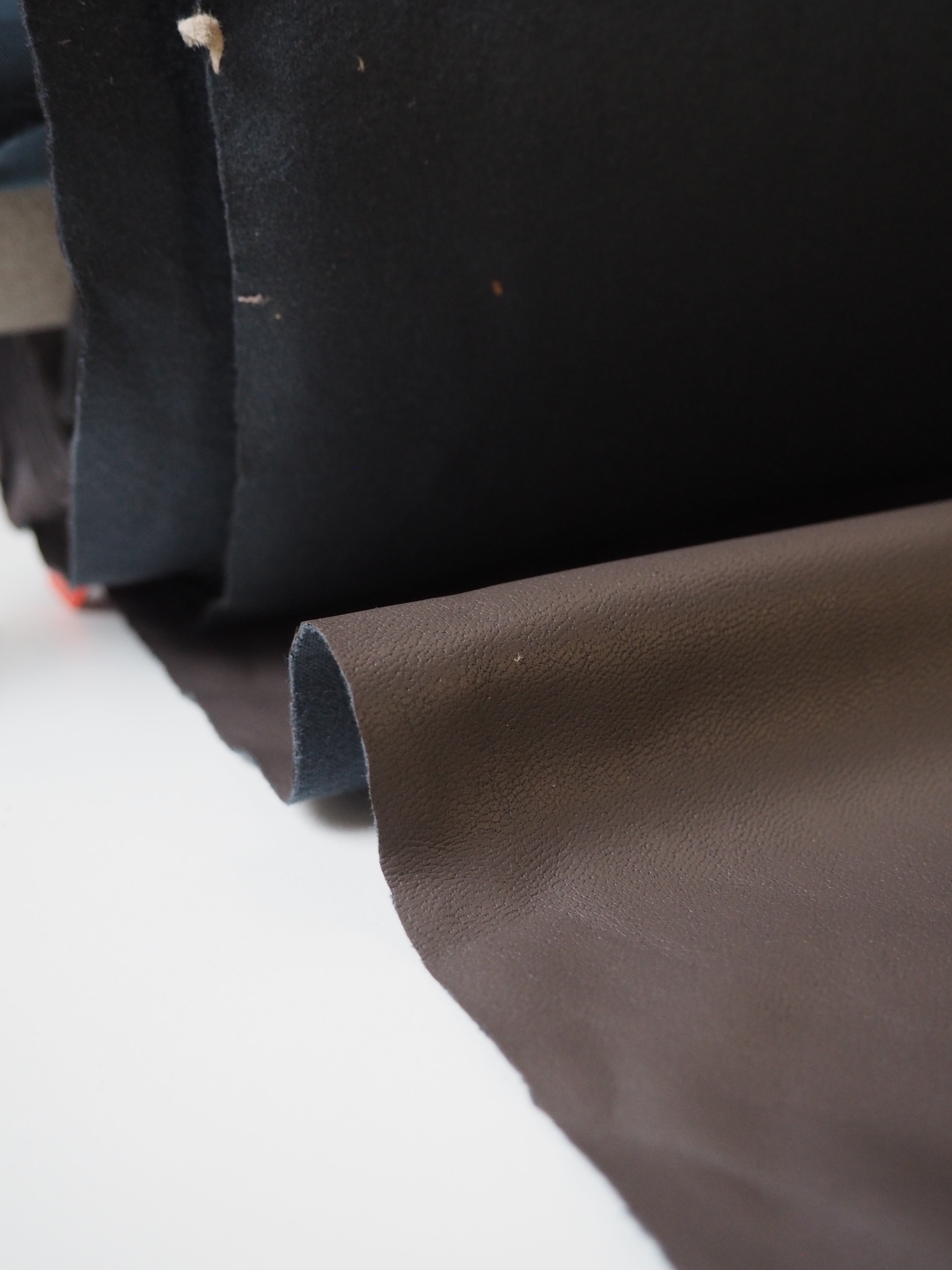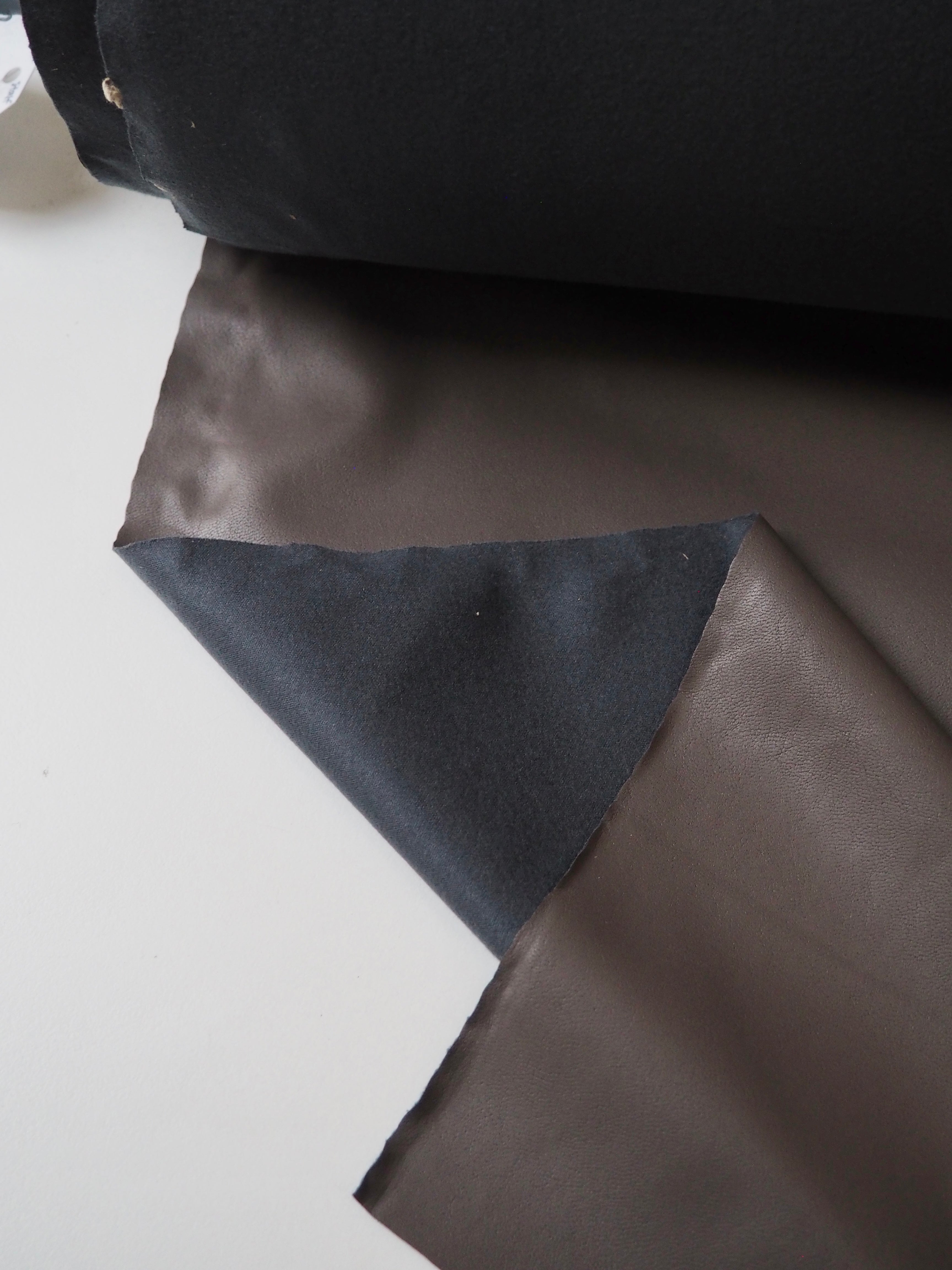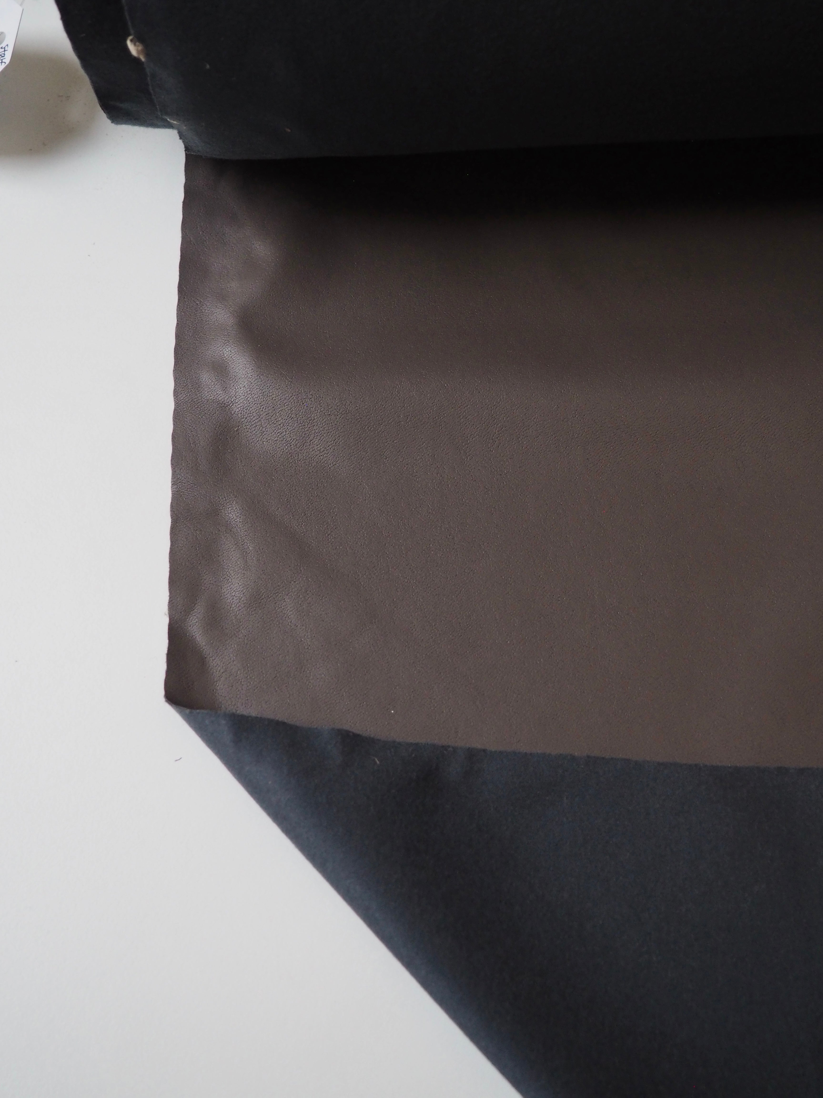This ex-designer fabric is a stretch pleather, or vegan leather. Light to medium weight and smooth, it is made from a thin dark taupe brown polyurethane coating on a grey jersey backing. It has a flat finish. Approximately 30% width way stretch. Would be perfect for form fitting garments as the stretch means you can move with ease. We would love this in a little mini skirt or even a light trench!