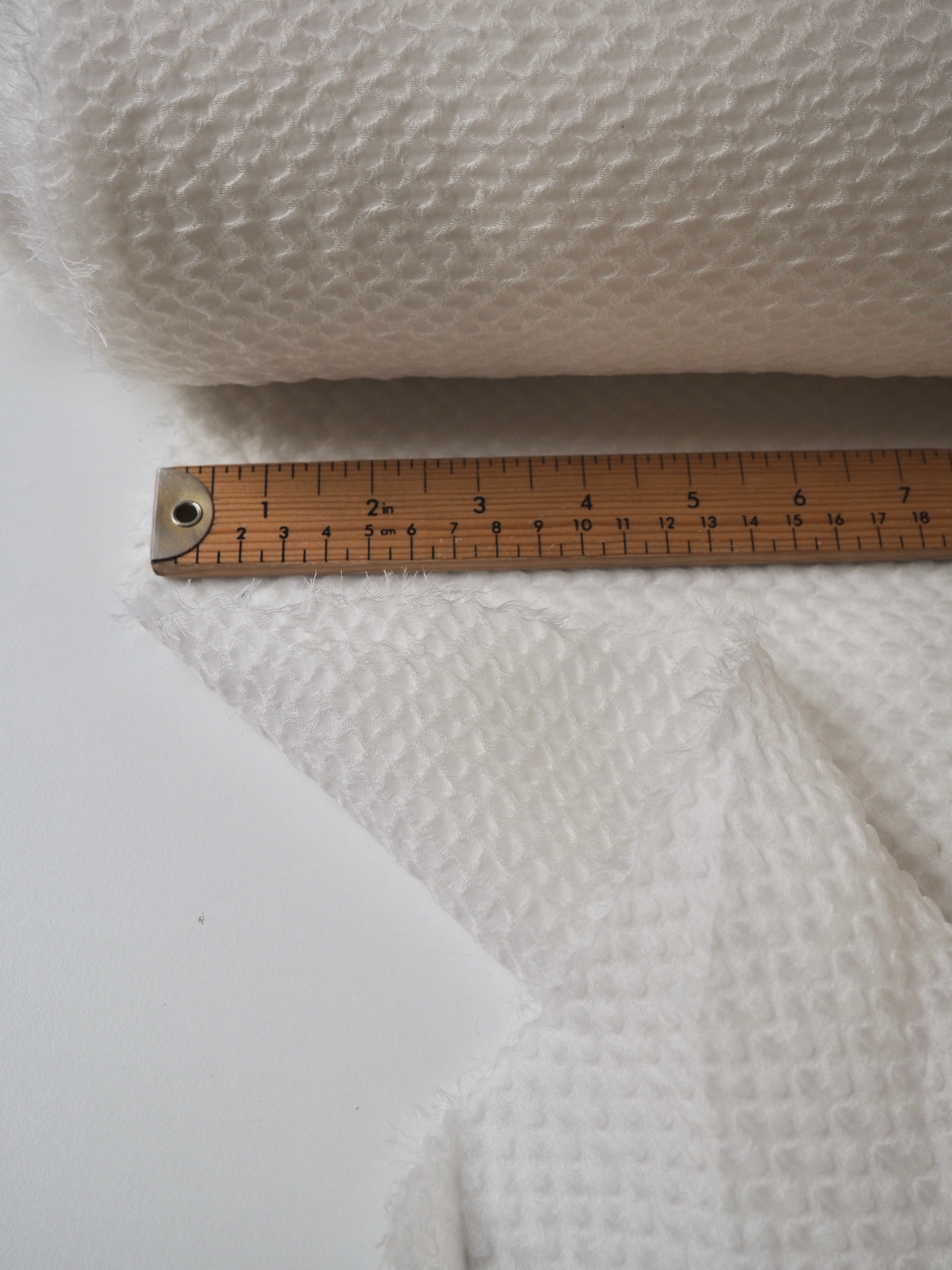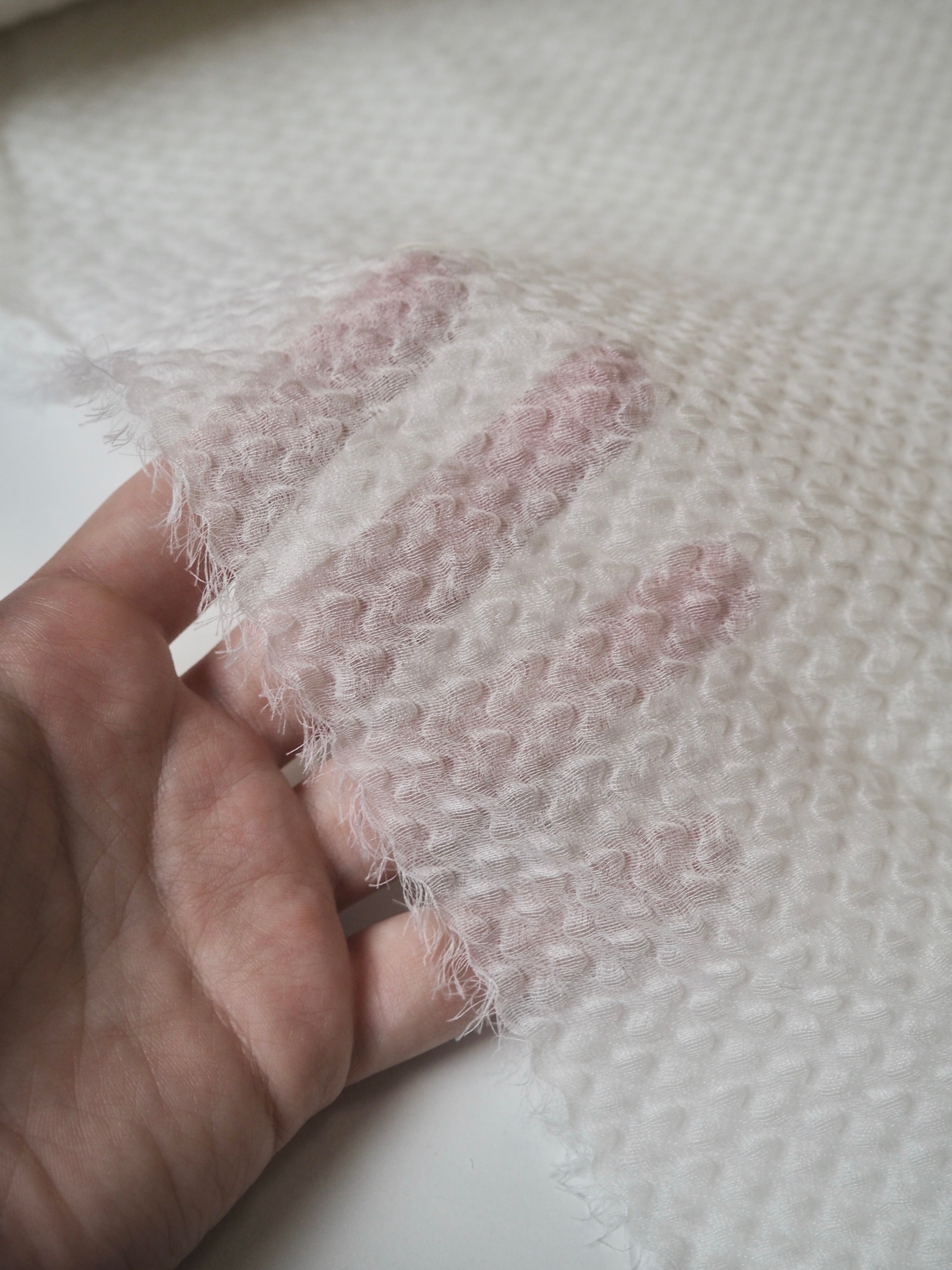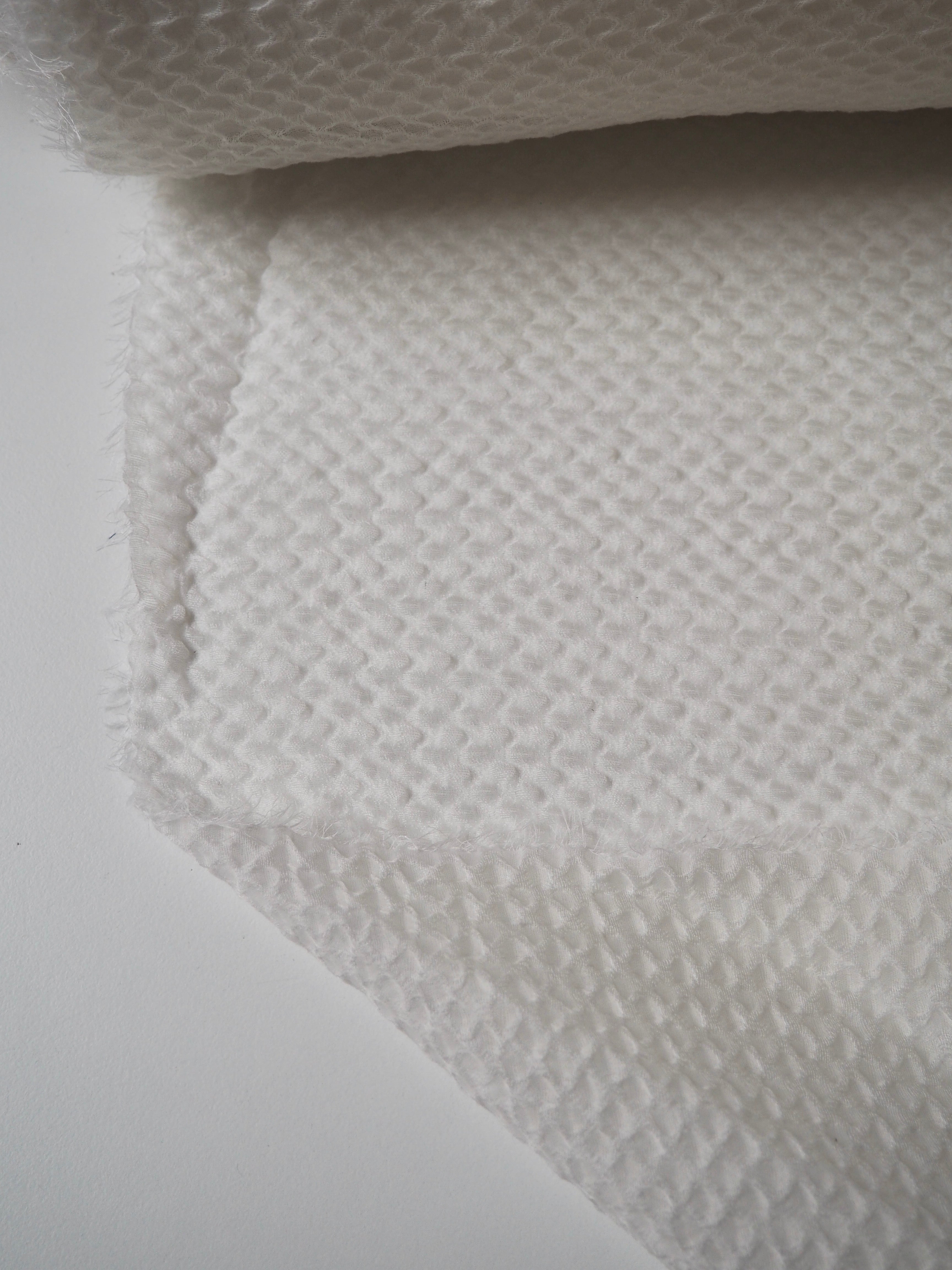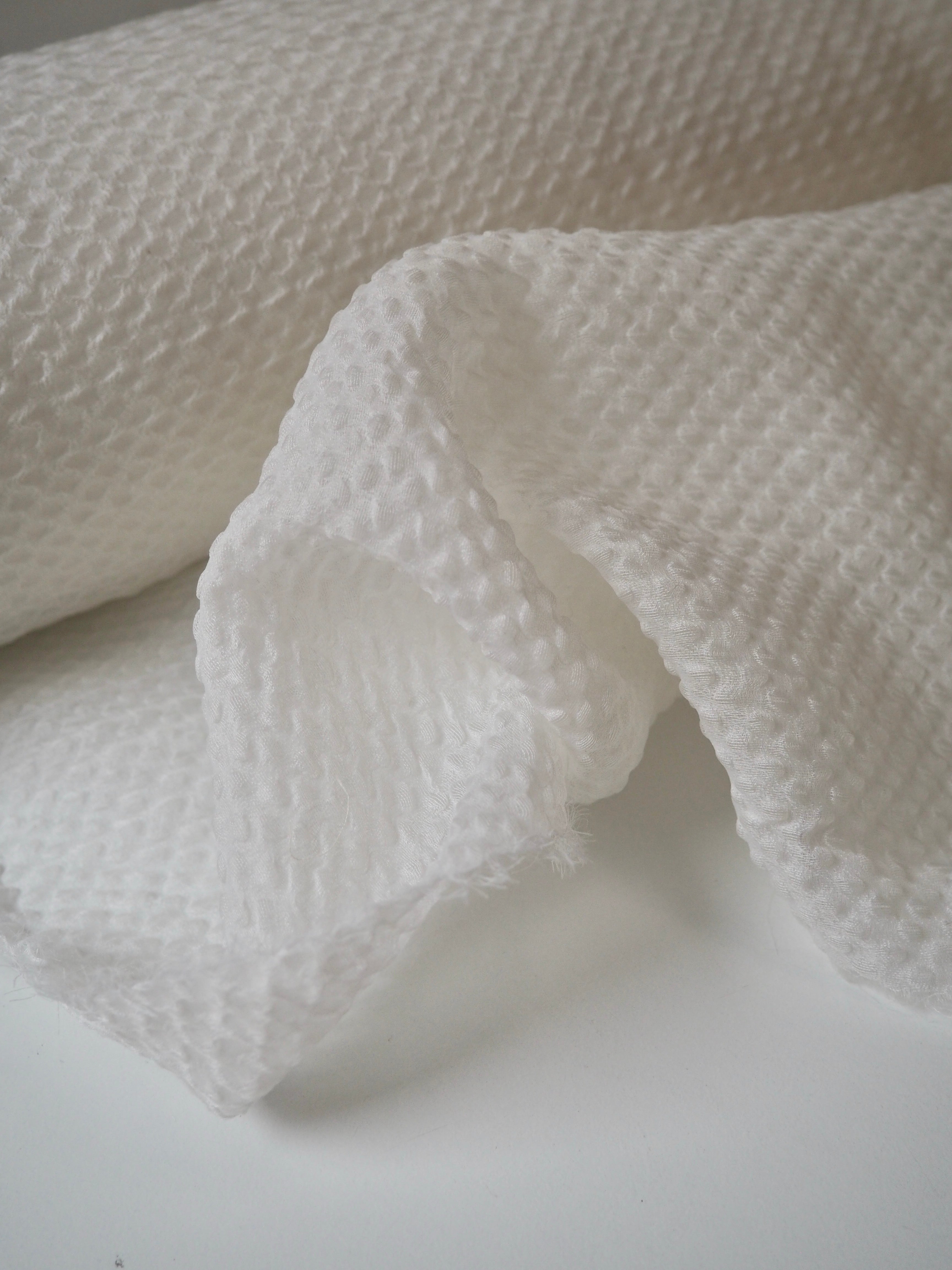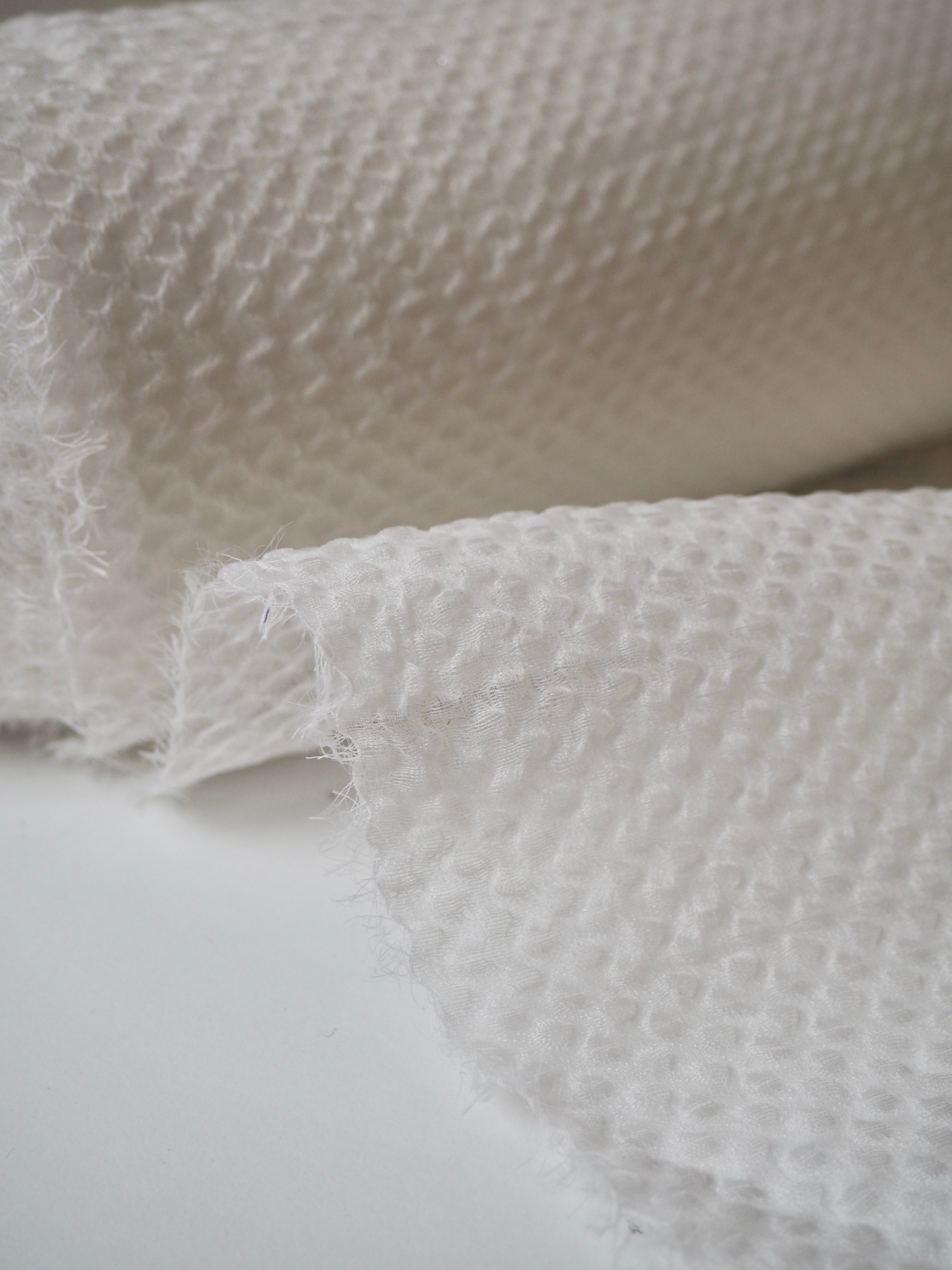 This ex-designer fabric is a cloqué. It's semi-sheer, with a raised, wavey cloqué weave. It's in a silk blend double organza layer, which makes it floaty and super lightweight. Has such a lovely texture and great natural structure to play with. Feels so luxurious and special! Has a slight sheen from the silk blend weave. Perfect for bridal looks or everyday wear alike!