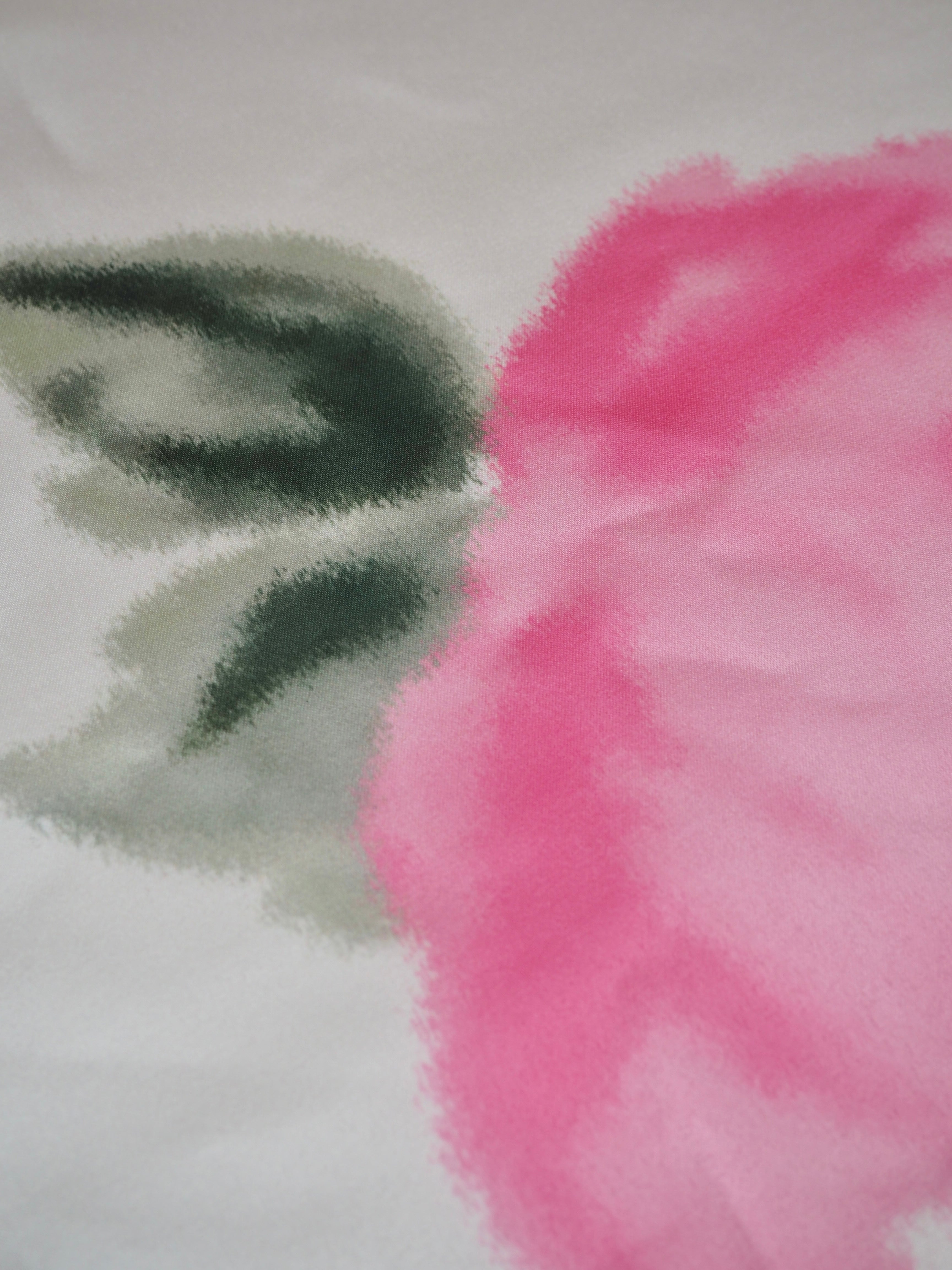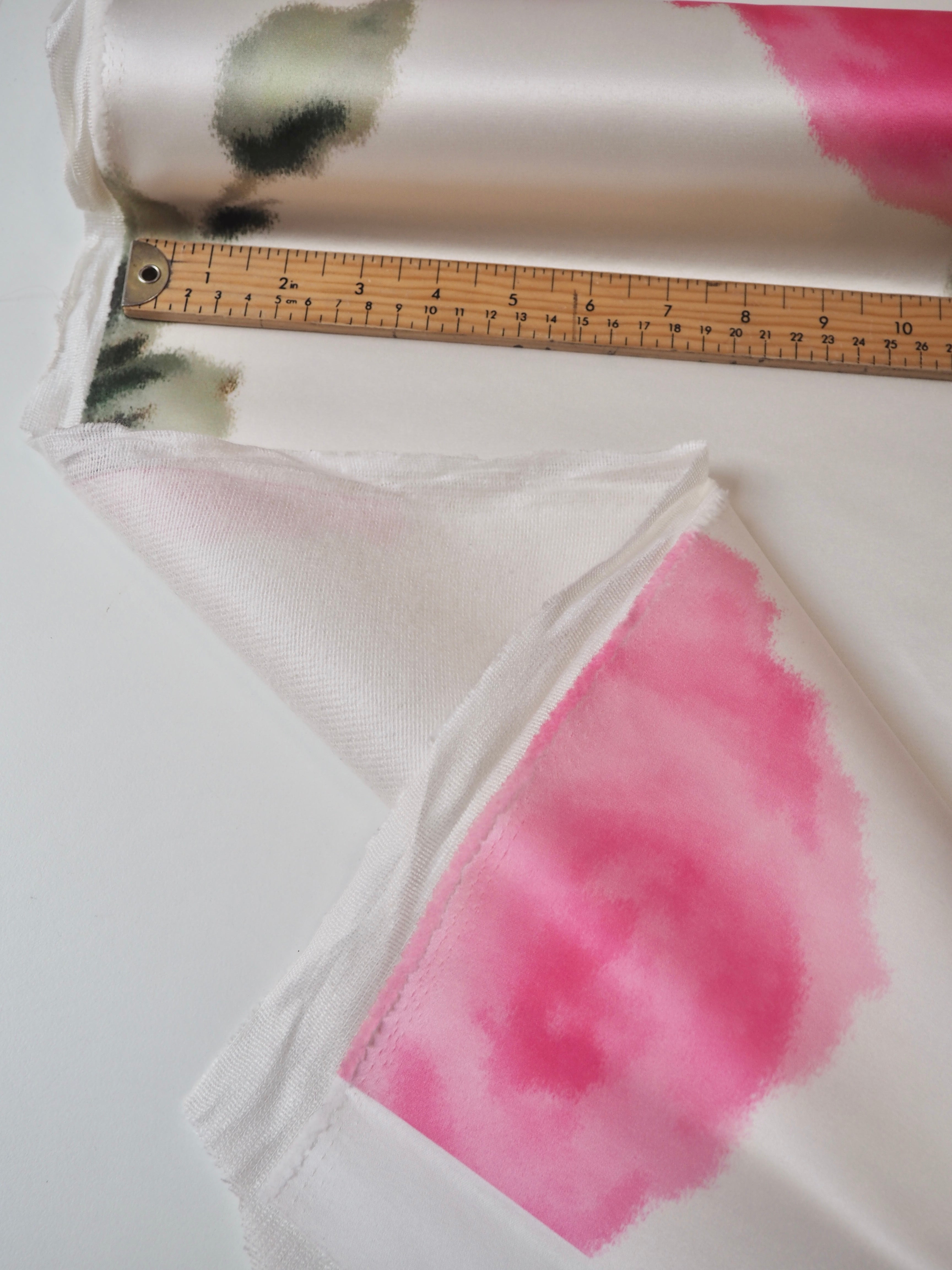 This ex-designer fabric is a lovely satin. It's a slightly warped rose print on a medium weight white satin. It's pre-interfaced, which gives it more structure to work with and fuller opacity. Lovely handle and gentle softness! Beautiful for a dress or top, or even a cropped jacket!