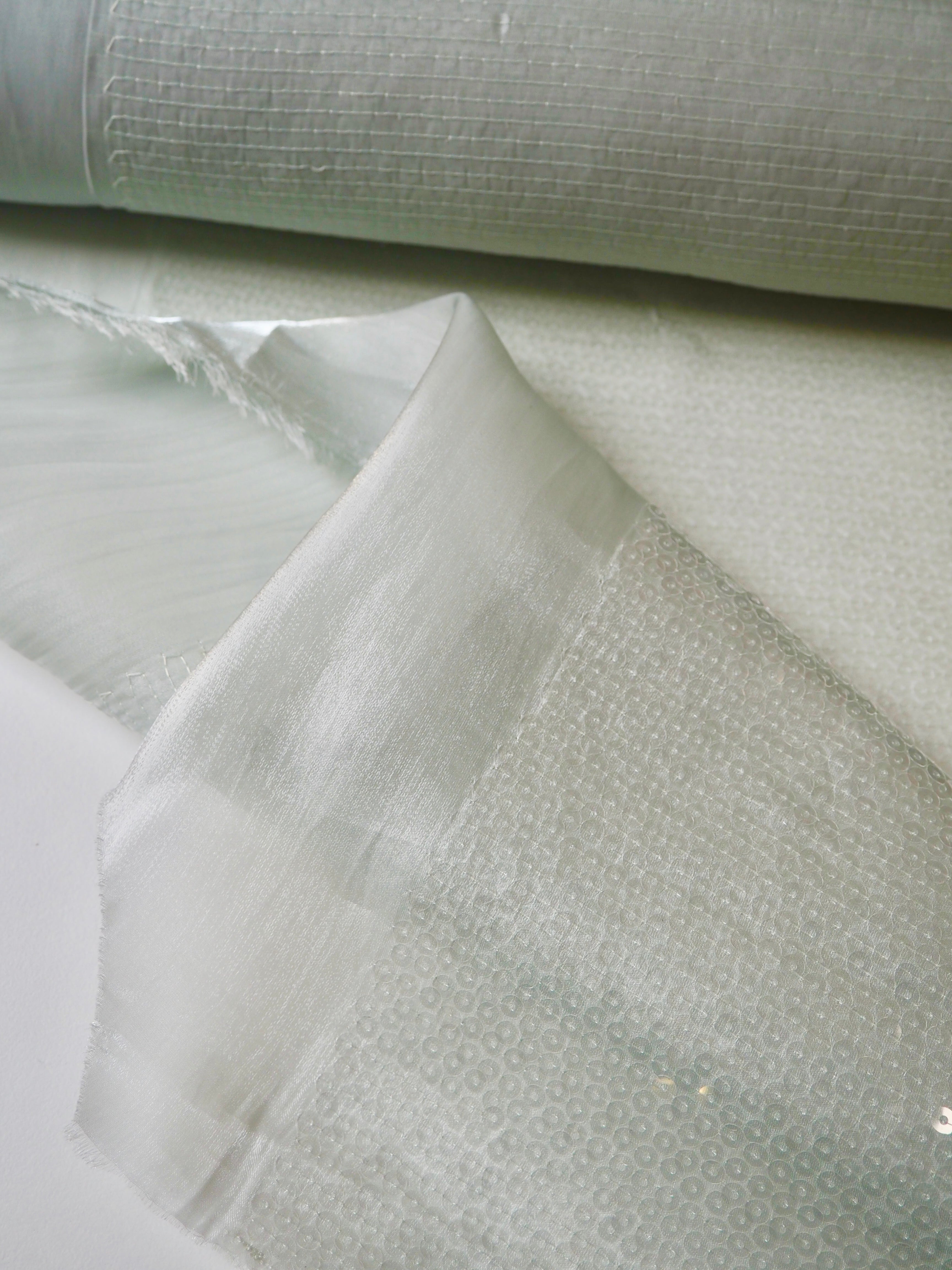 This ex-designer fabric is a sequin organza. Shiny clear sequins are woven in stripes onto this light-shifting sea glass green organza. It's really unique, with great movement and a beautiful drape. Lightweight, semi-sheer, and mesmerizing! Has a nice gentle handle. Would be perfect for a party dress or skirt!