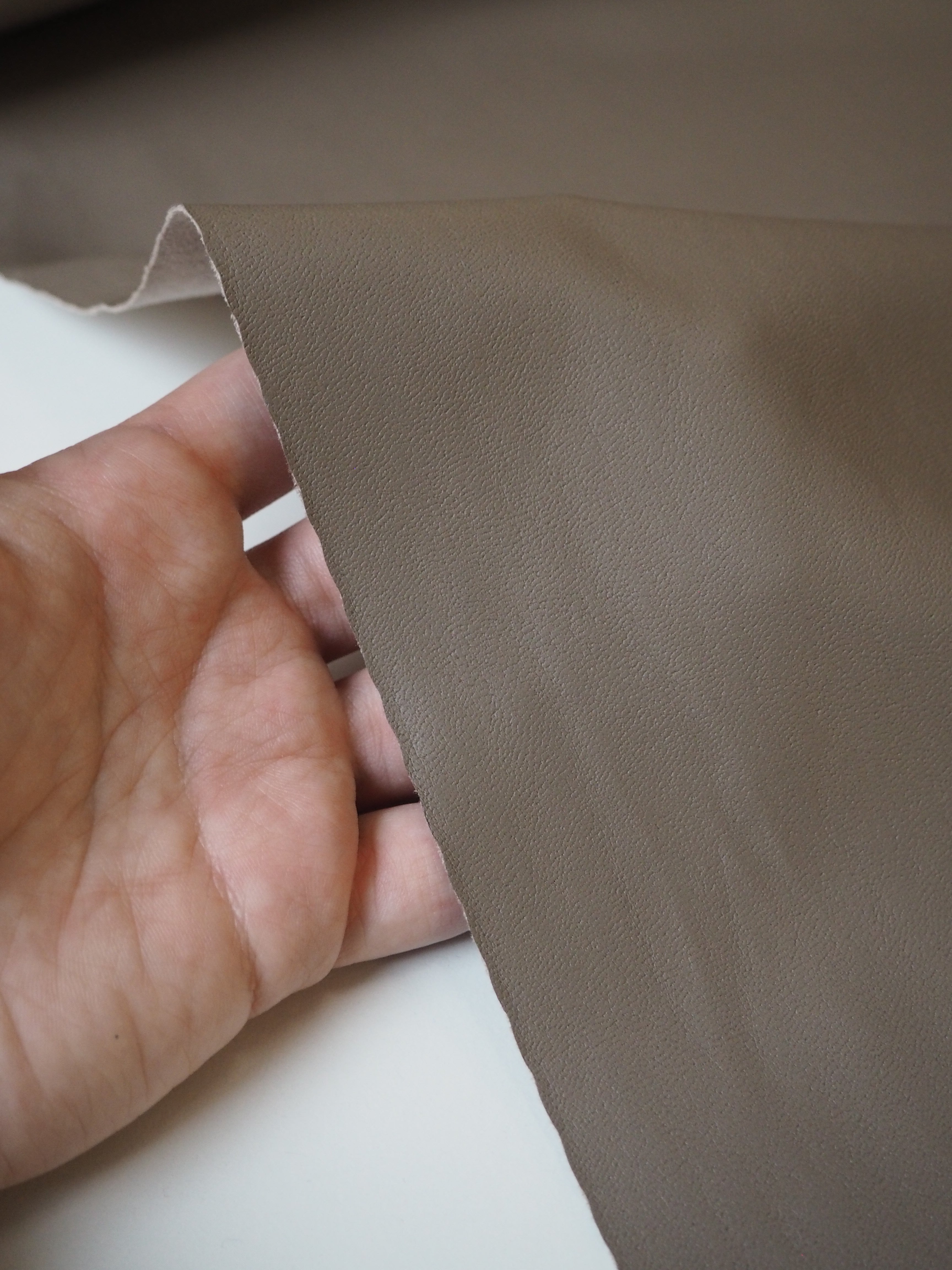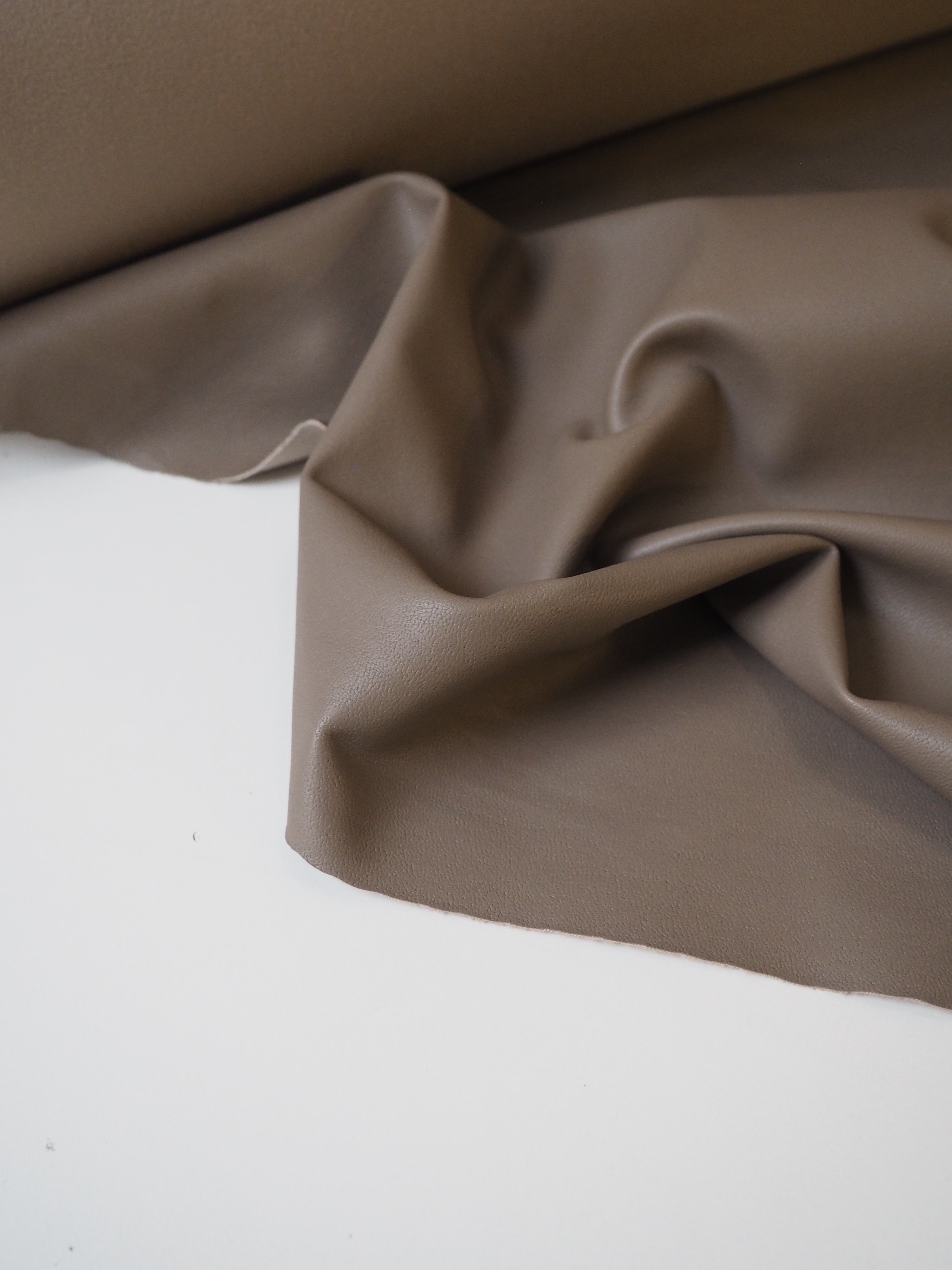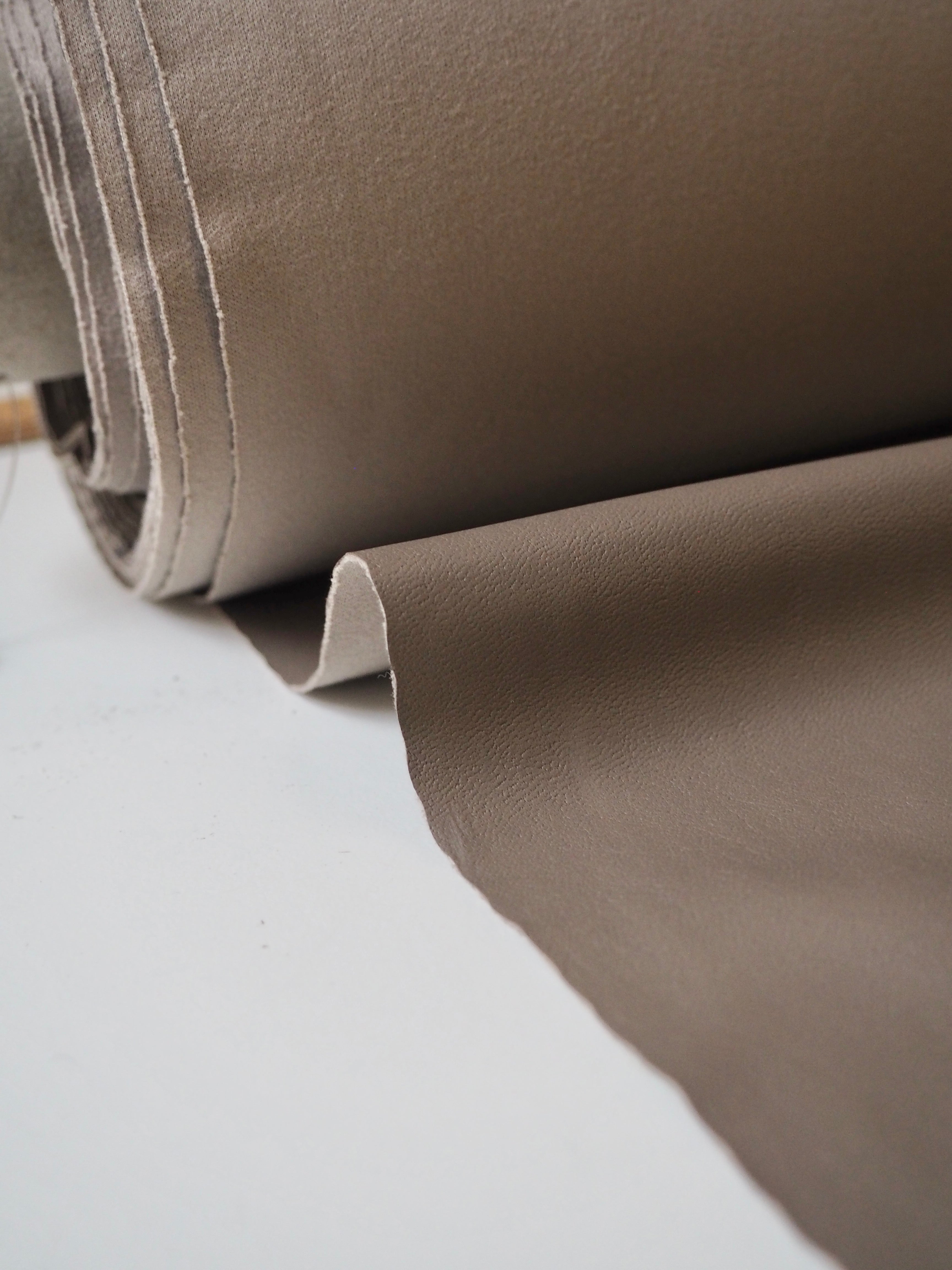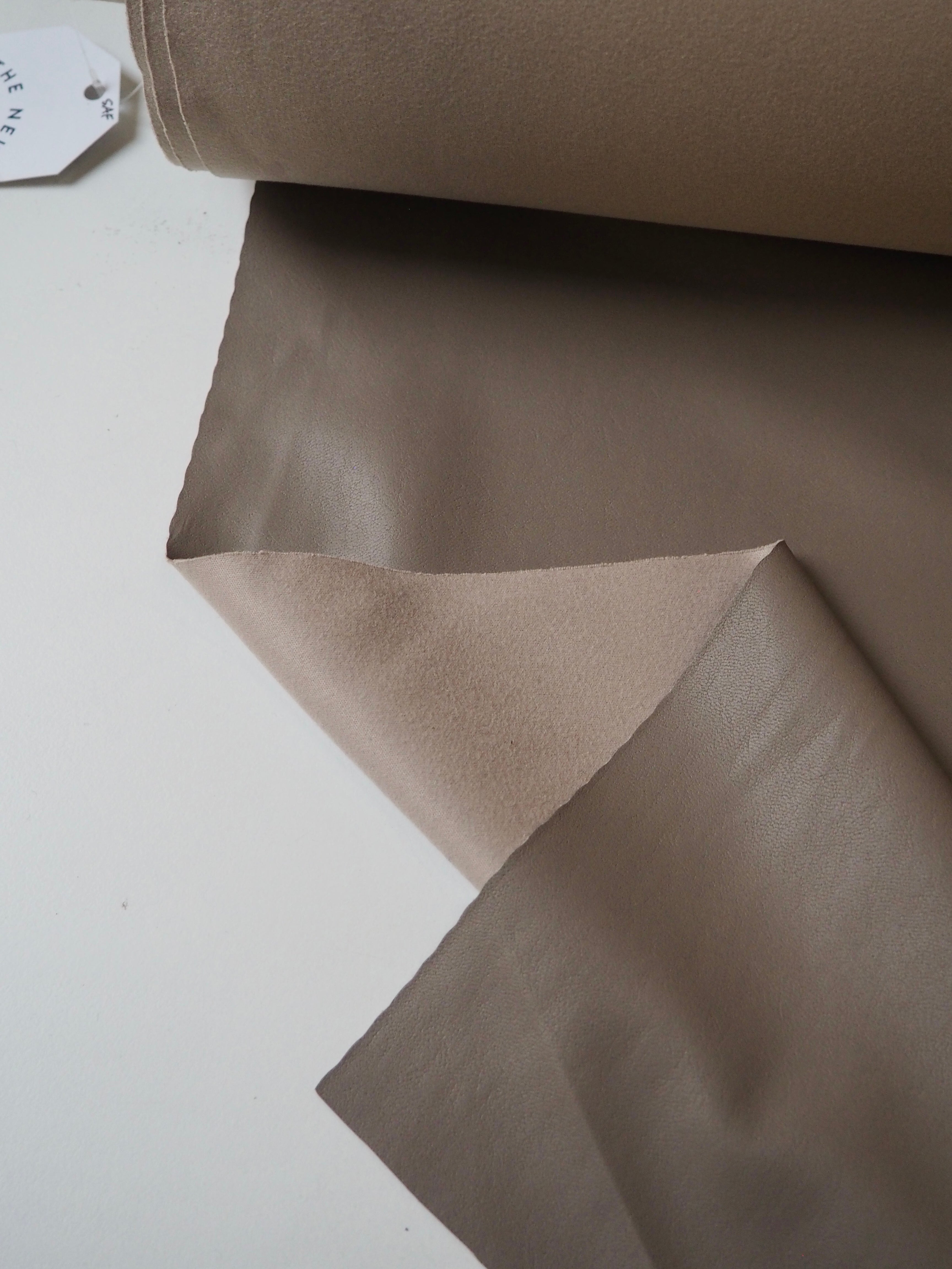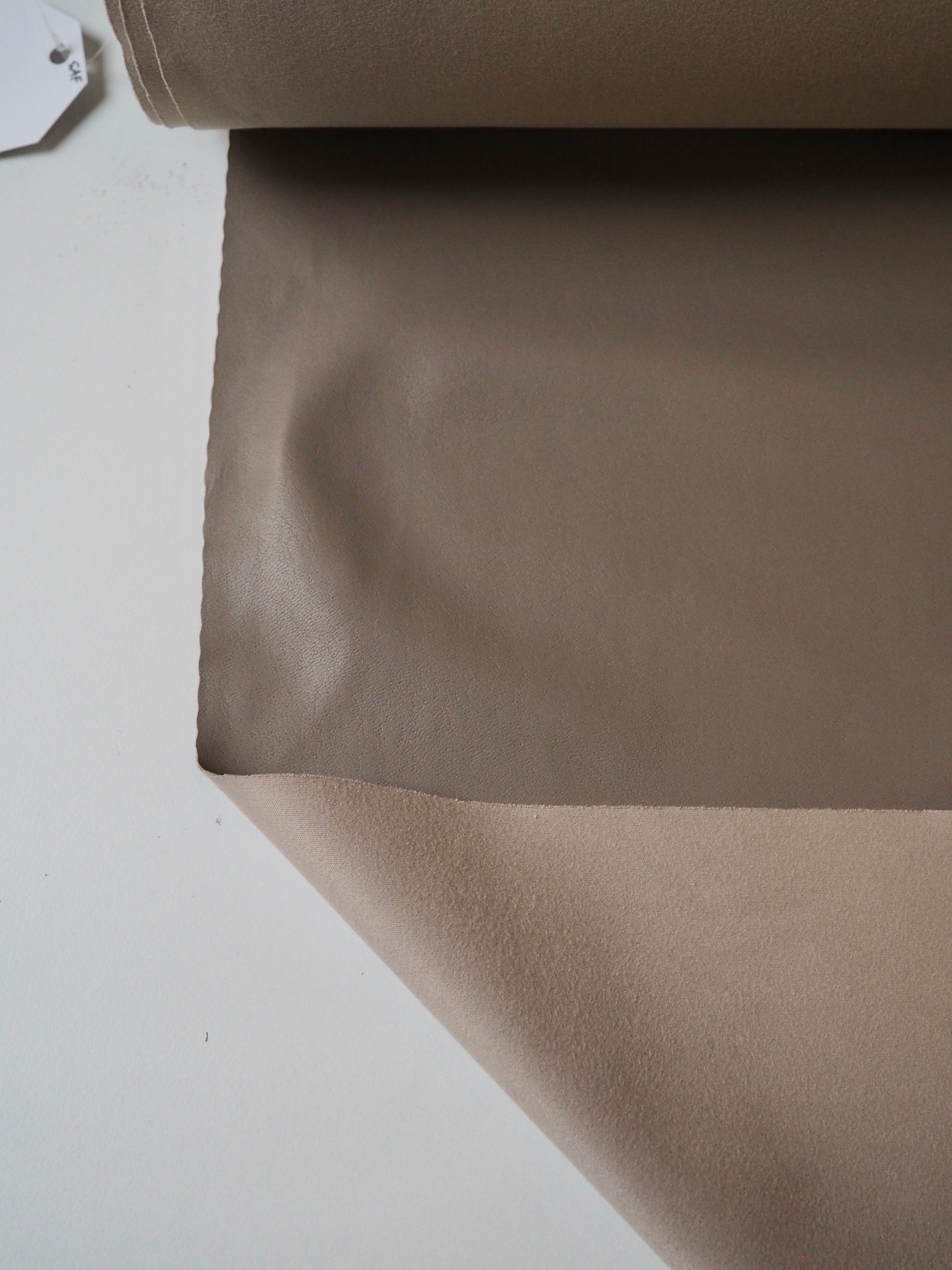 This ex-designer fabric is a stretch pleather, or vegan leather. Light to medium weight and smooth, it is made from a thin taupe brown polyurethane coating on a beige jersey backing. It has a flat finish. Approximately 30% width way stretch. Would be perfect for form fitting garments as the stretch means you can move with ease. We would love this in a little mini skirt or even a light trench!
