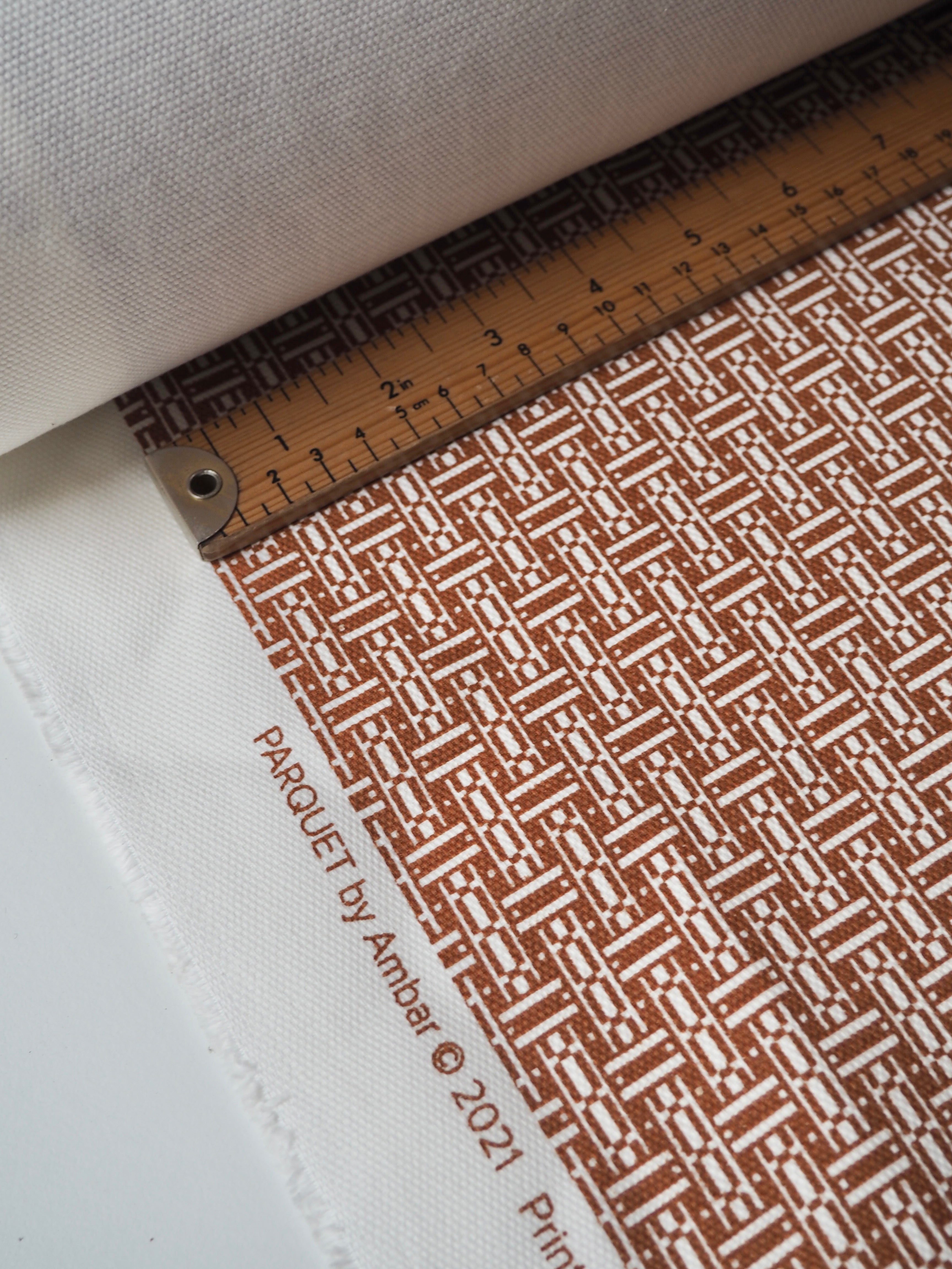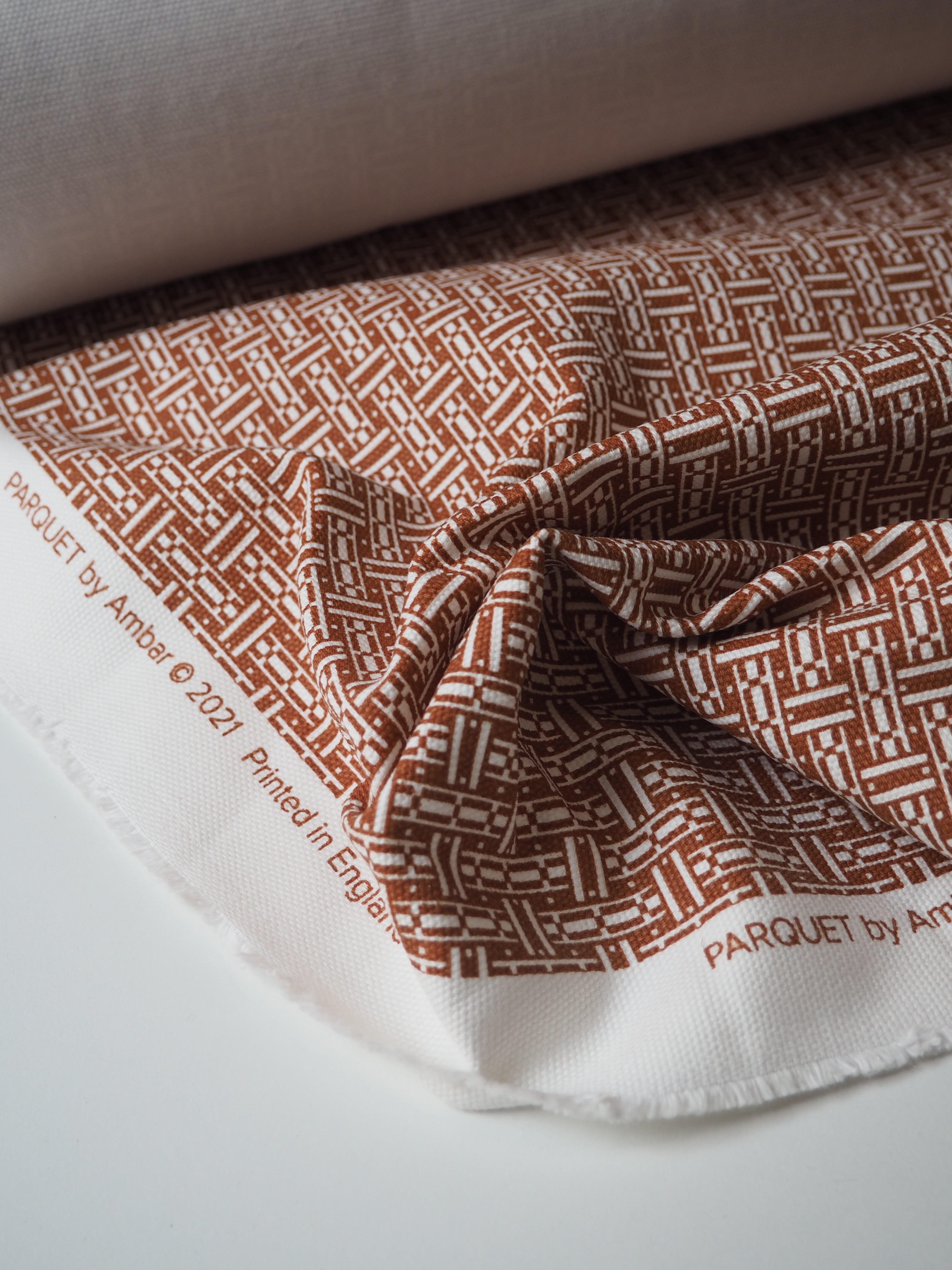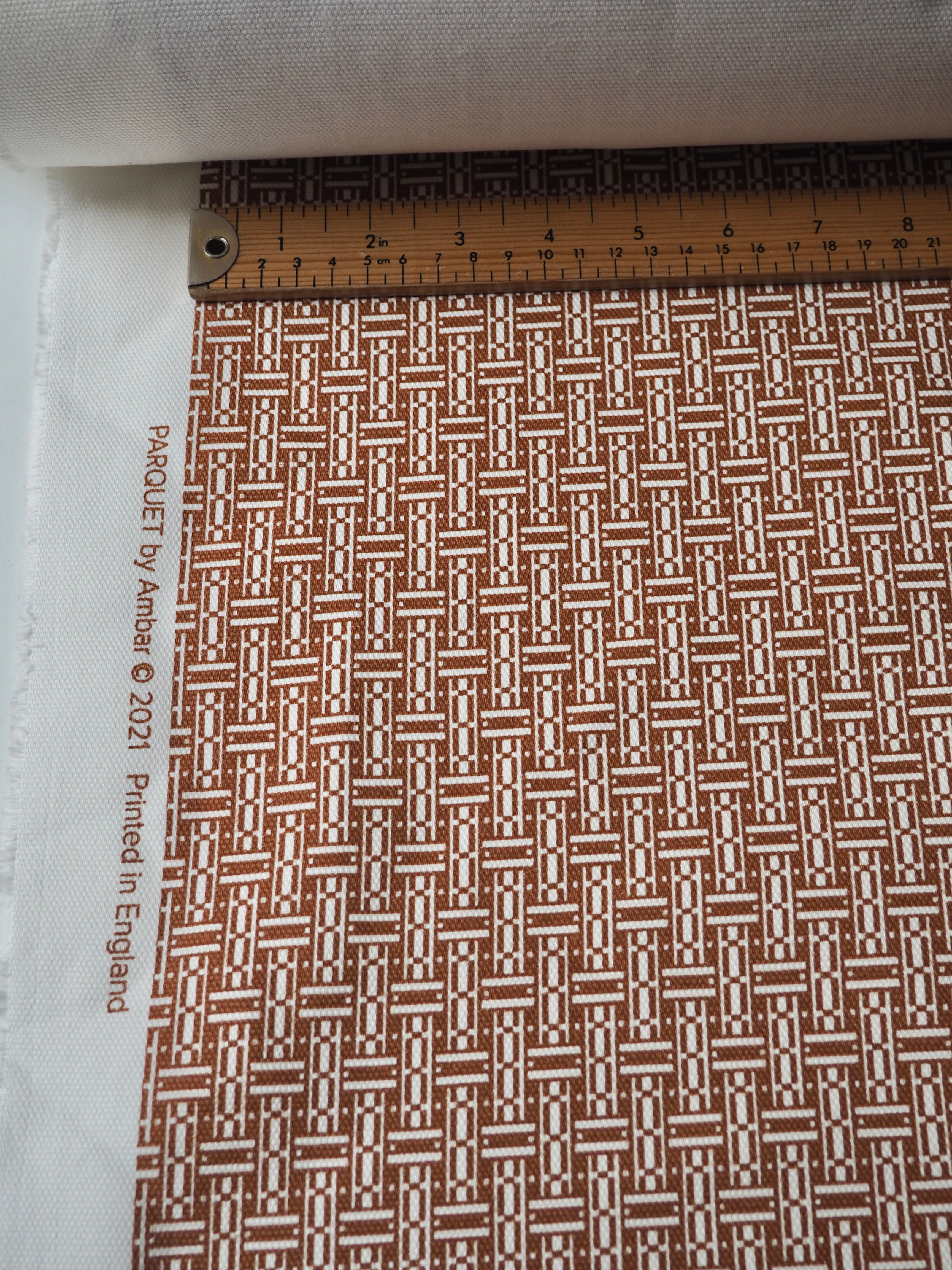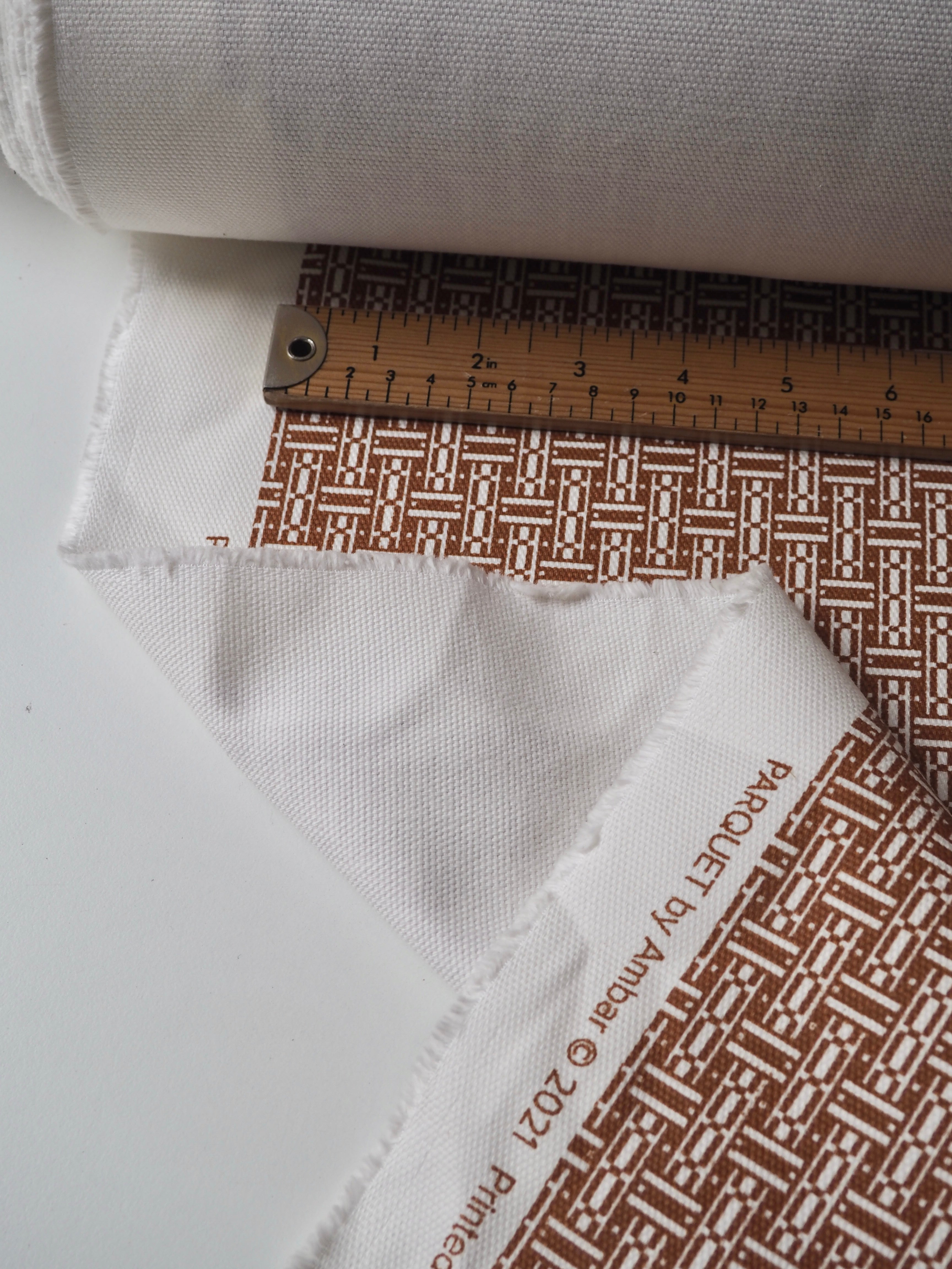 This ex-designer fabric is a cotton canvas. It's in a parquet floor-esque print in brown and white on this medium weight cotton canvas. It's a bespoke print from the designer. Has a great structure and pronounced plain canvas weave. Sturdy and lovely quality, in a typical cotton handle. Perfect for jackets, heavier-wearing trousers, totes, and even outdoor cushions!