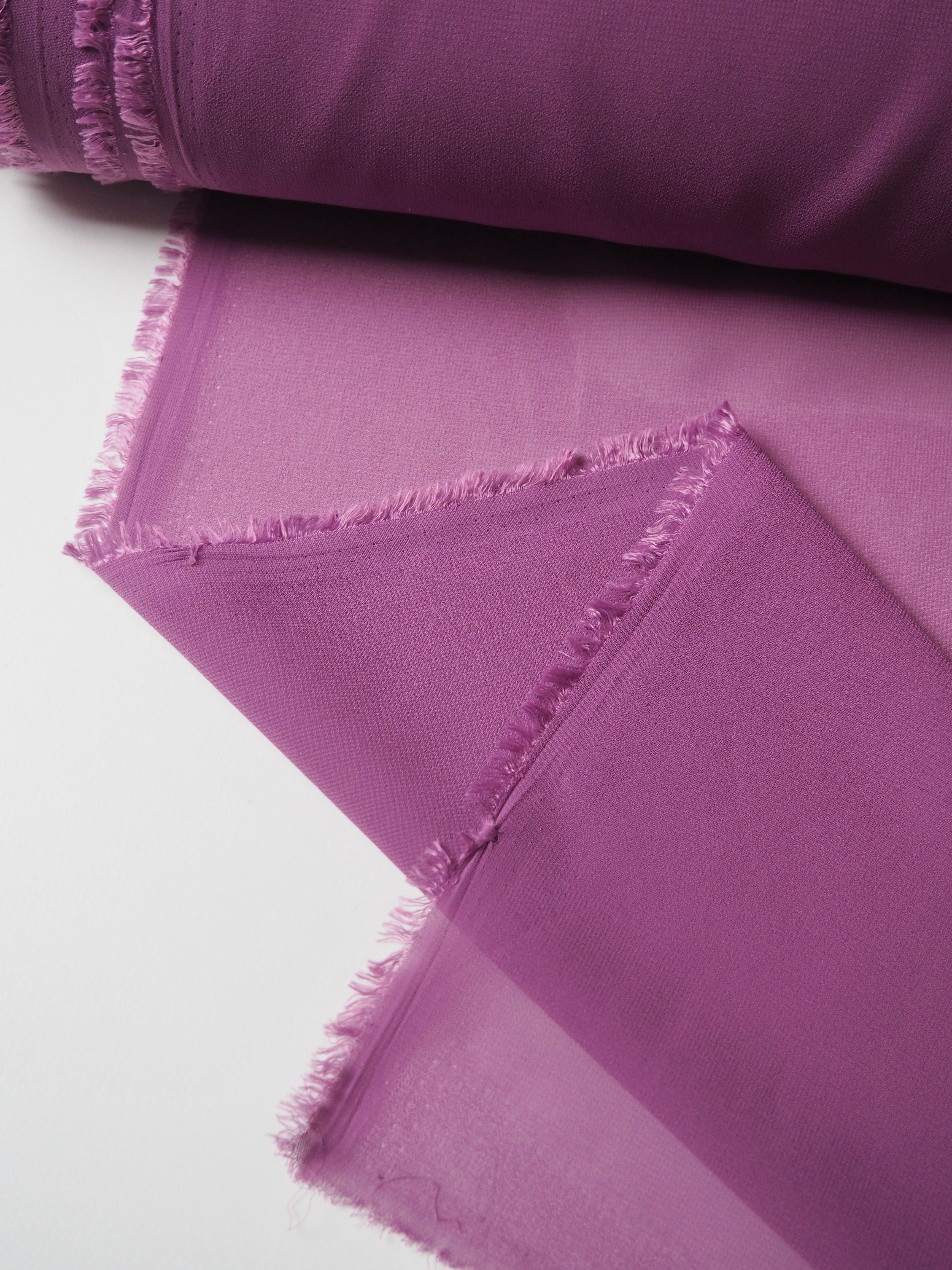 This ex-designer fabric is a georgette. It's in an orchid purple shade, with a subtle crepe-like texture. It's similar to a chiffon, but a little bit more opaque and a bit heavier. Semi-sheer, with a lovely handle. Lightweight with good drape. Perfect as overlay on a dress or as a lining!