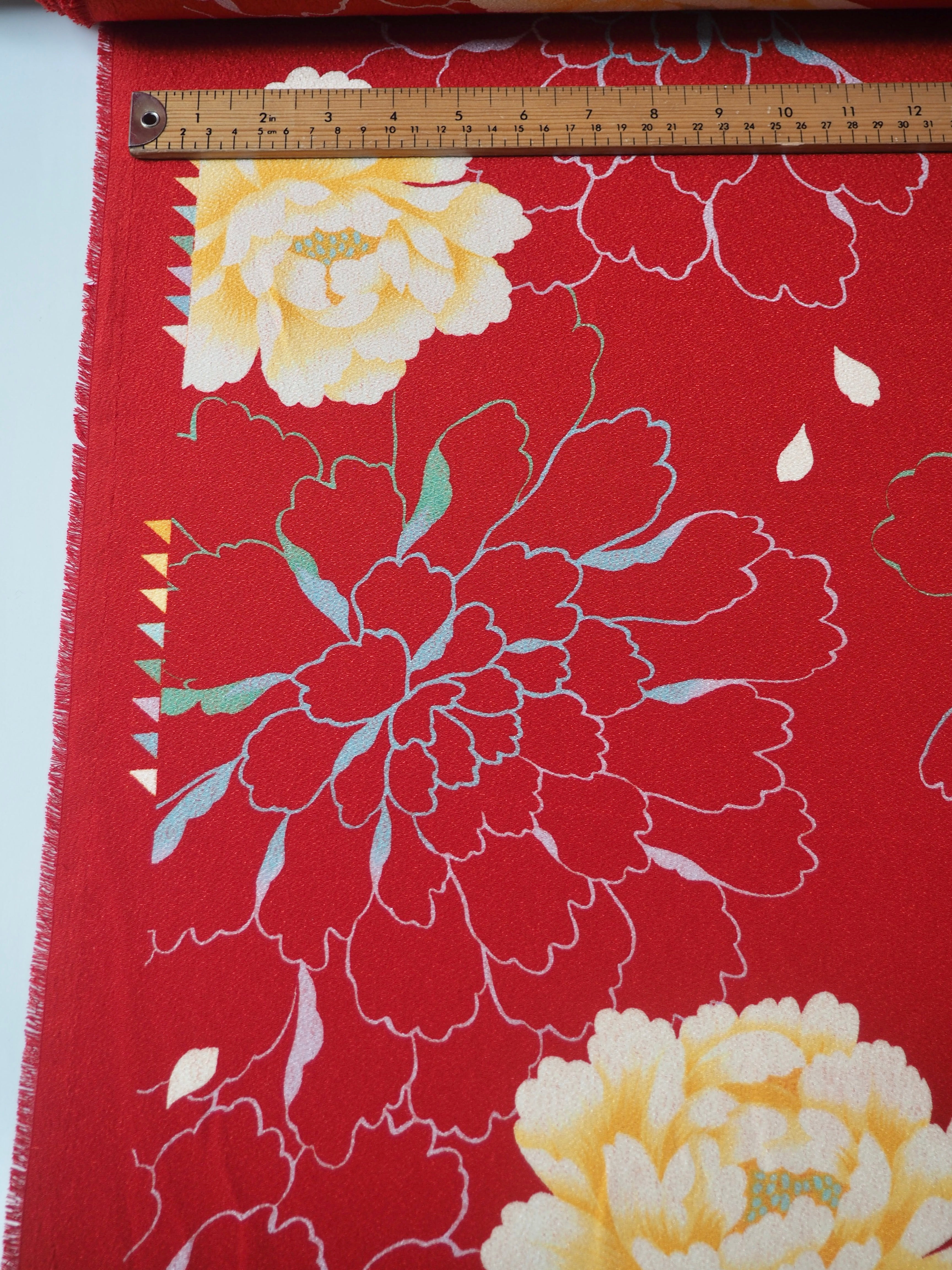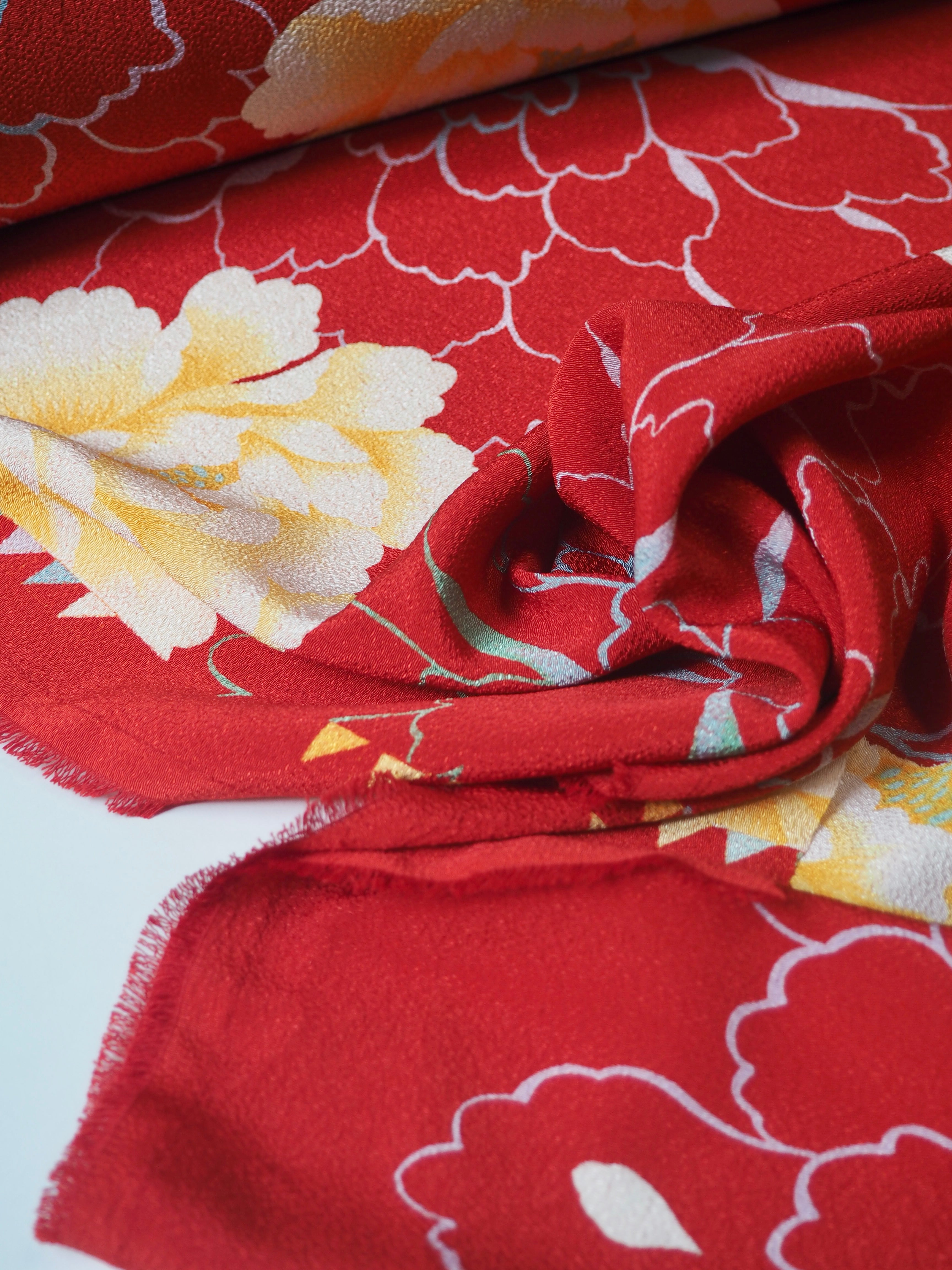 This ex-designer fabric is a floral crepe. It has a red base, with yellow flowers and multicolour outlined flowers spread across on both sides. It has a typical crepe handle and texture, and is soft on the skin. Finished with a lovely shine that makes the design really pop! Lightweight with a lovely drape. Opaque and perfect for an Everyday Top/Dress!