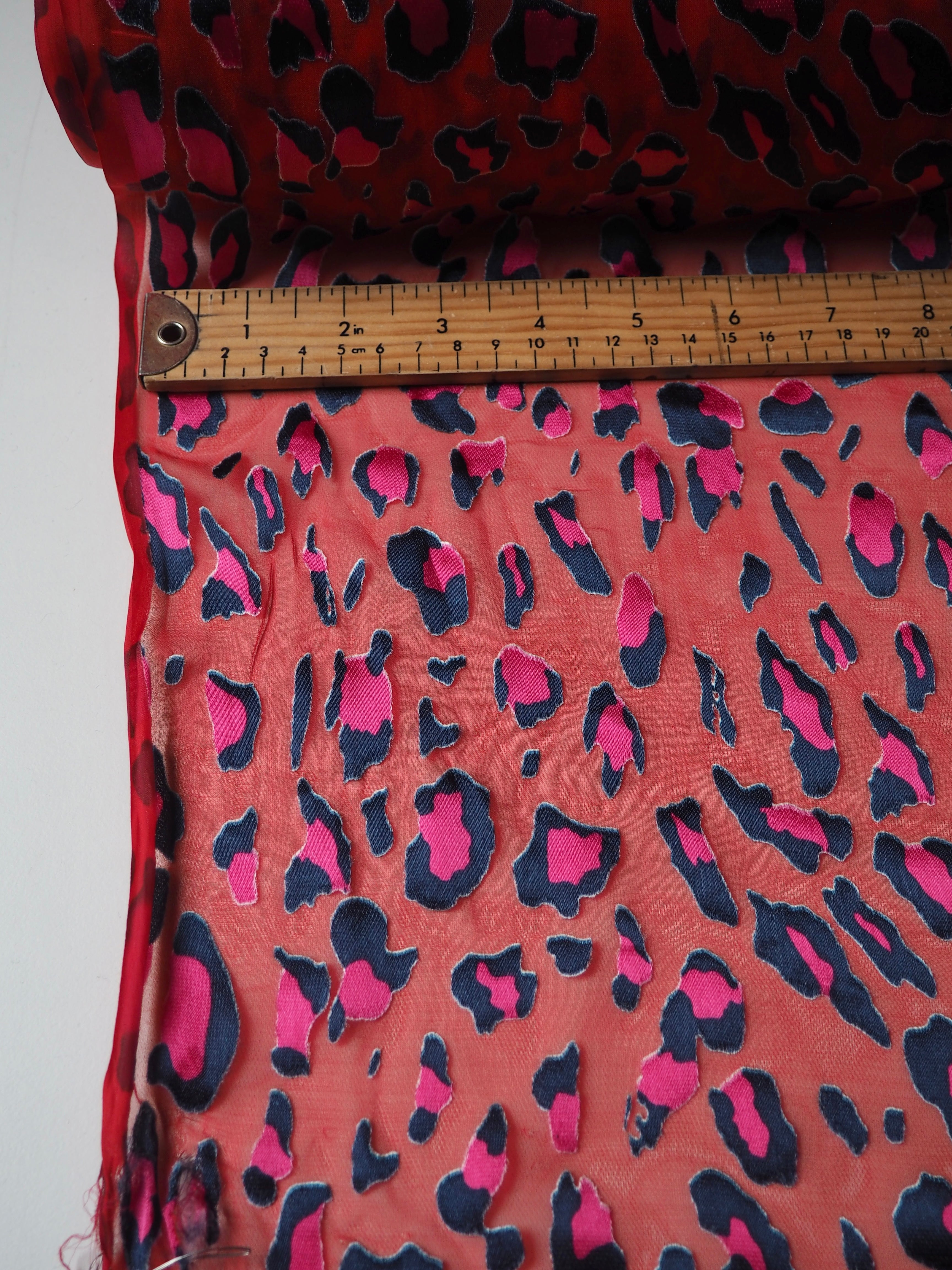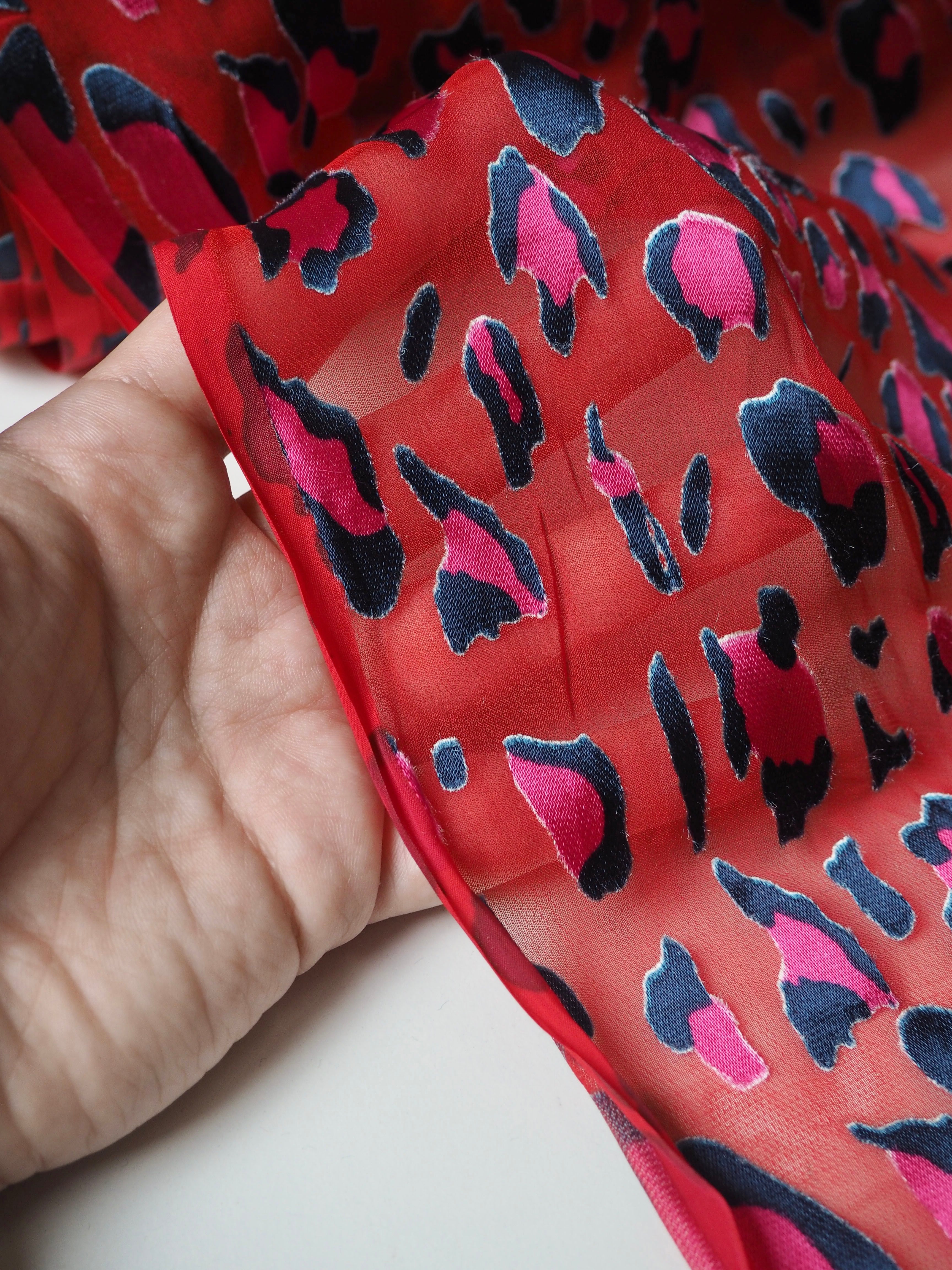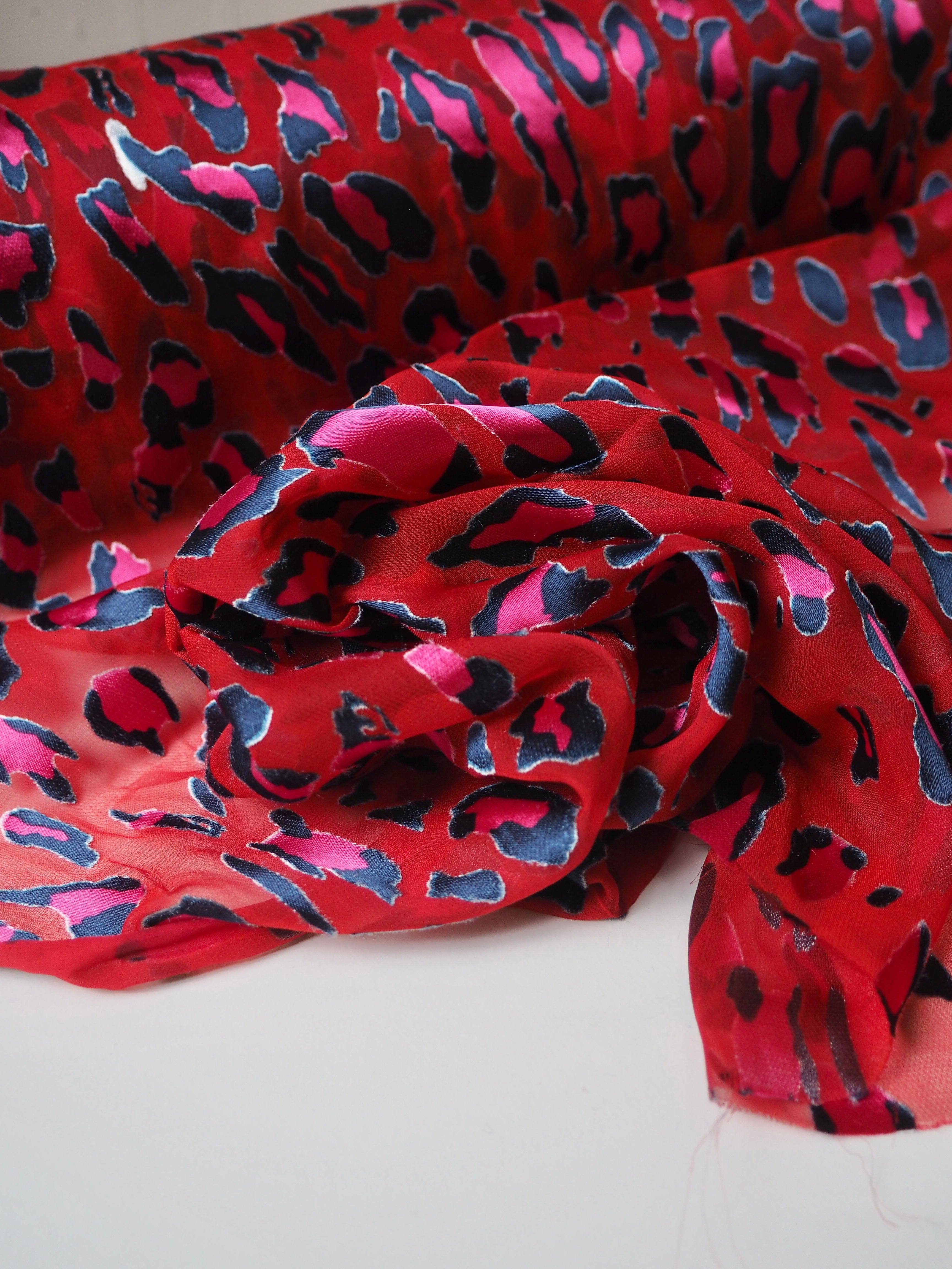 This ex-designer fabric is a beautiful burnout chiffon. Burnout fabrics, also known as devoré, are treated with a chemical process that burns away the pile in specific areas, in this case creating a medium scale leopard pattern. The pattern is a high shine satin whilst the burnout areas are sheer chiffon. Lightweight with a gorgeous airy drape. Has an incredible soft silky handle. Such a bold cloth that feels and looks amazing in the light! Wonderful movement! Would look amazing as a blouse or as the overlay of a dress!