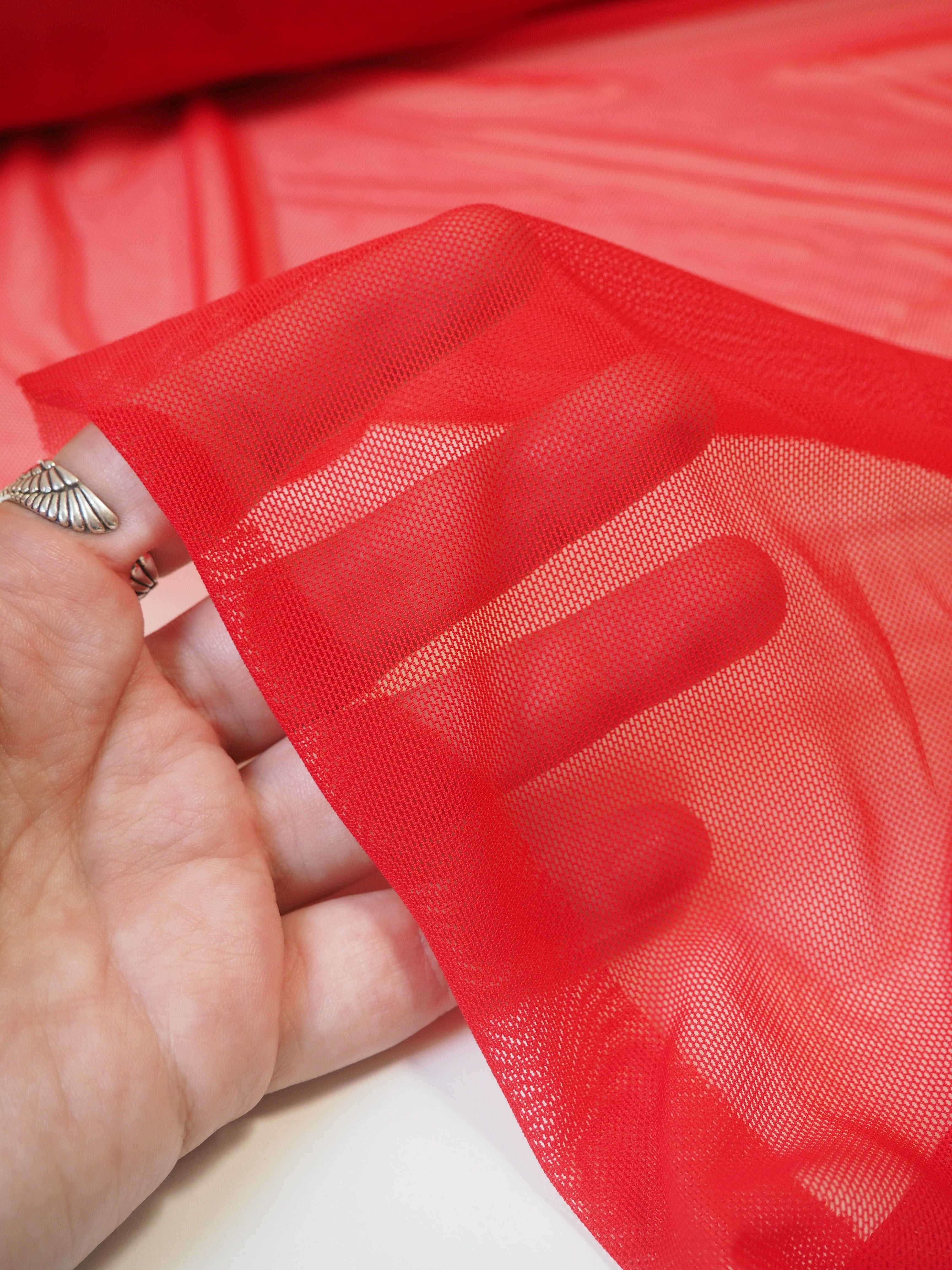 This ex-designer fabric is a stretch mesh. This super soft mesh is so comfortable! It has 4-way 40% stretch and great recovery. Lightweight and drapey, and semi-sheer. Perfect for our lingerie patterns! We also have bra findings kits!