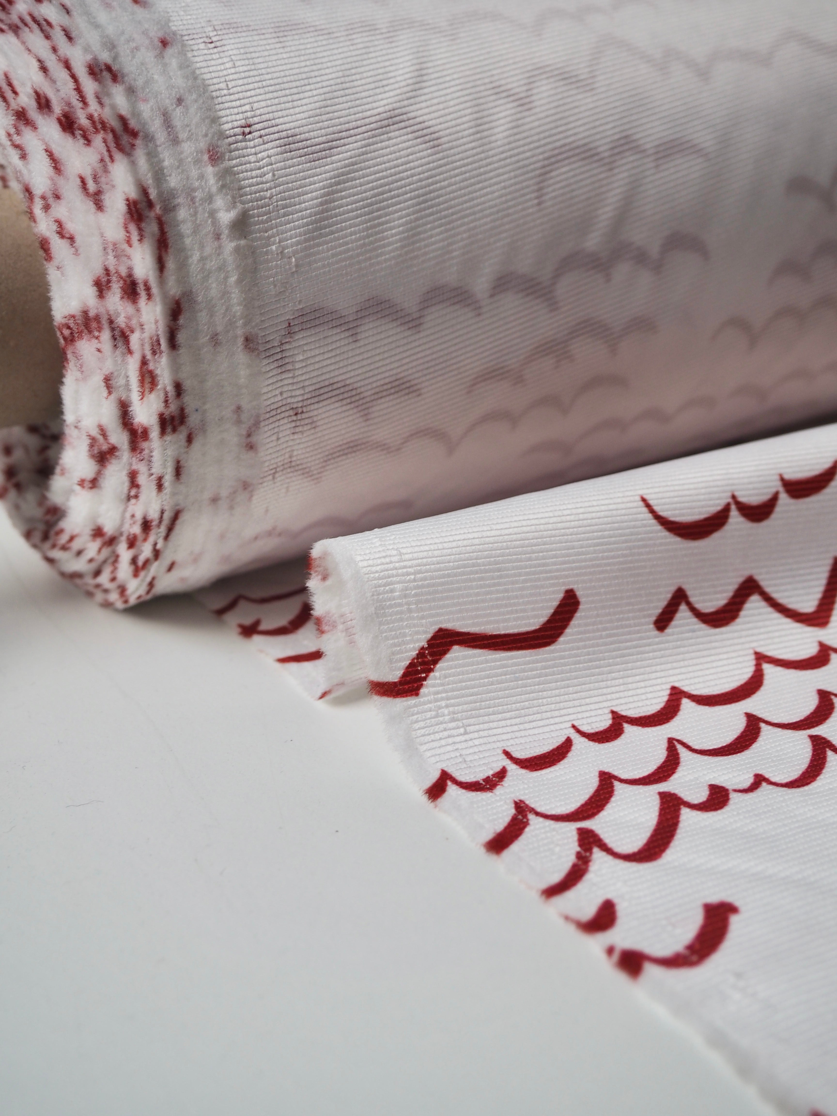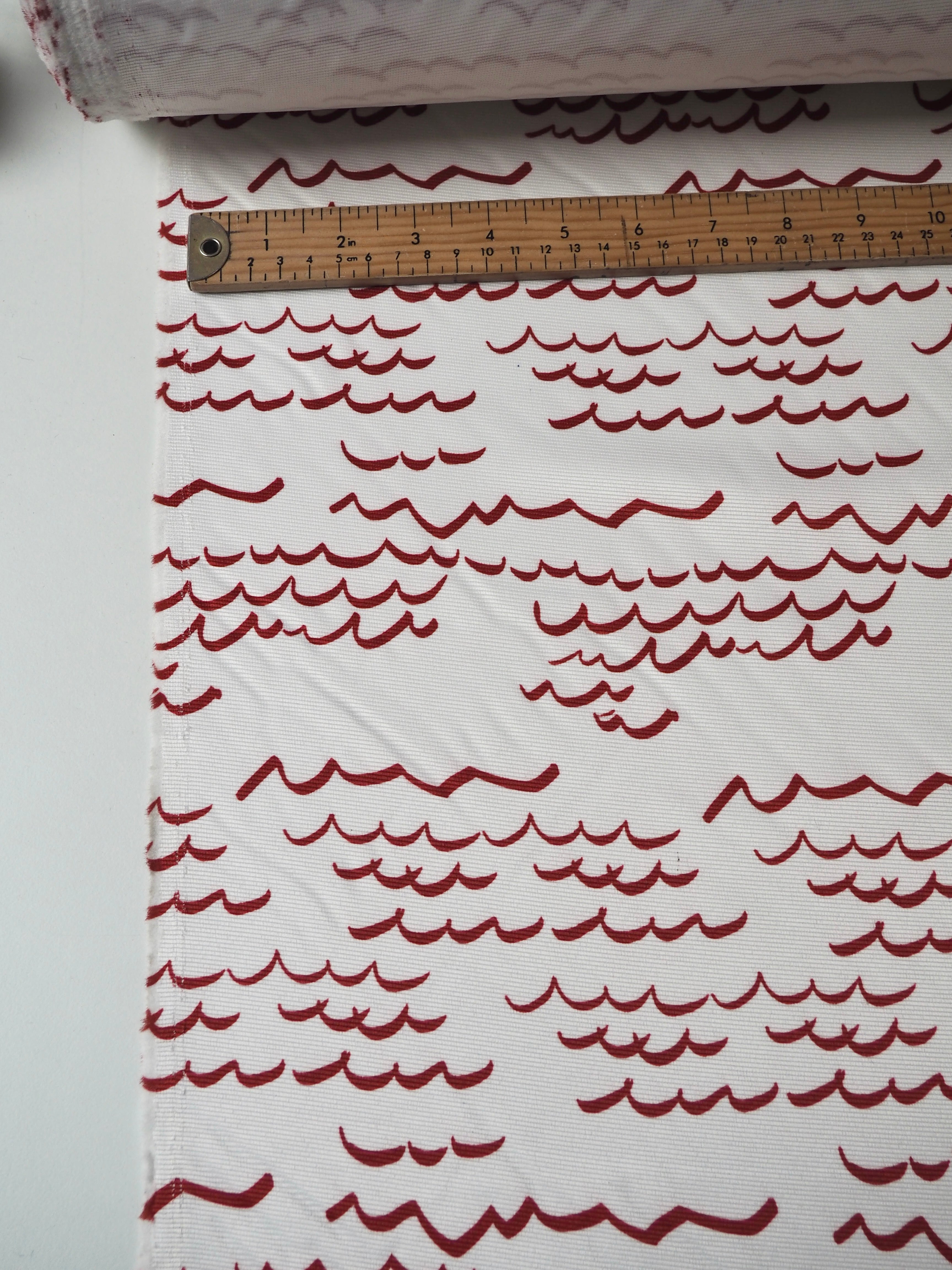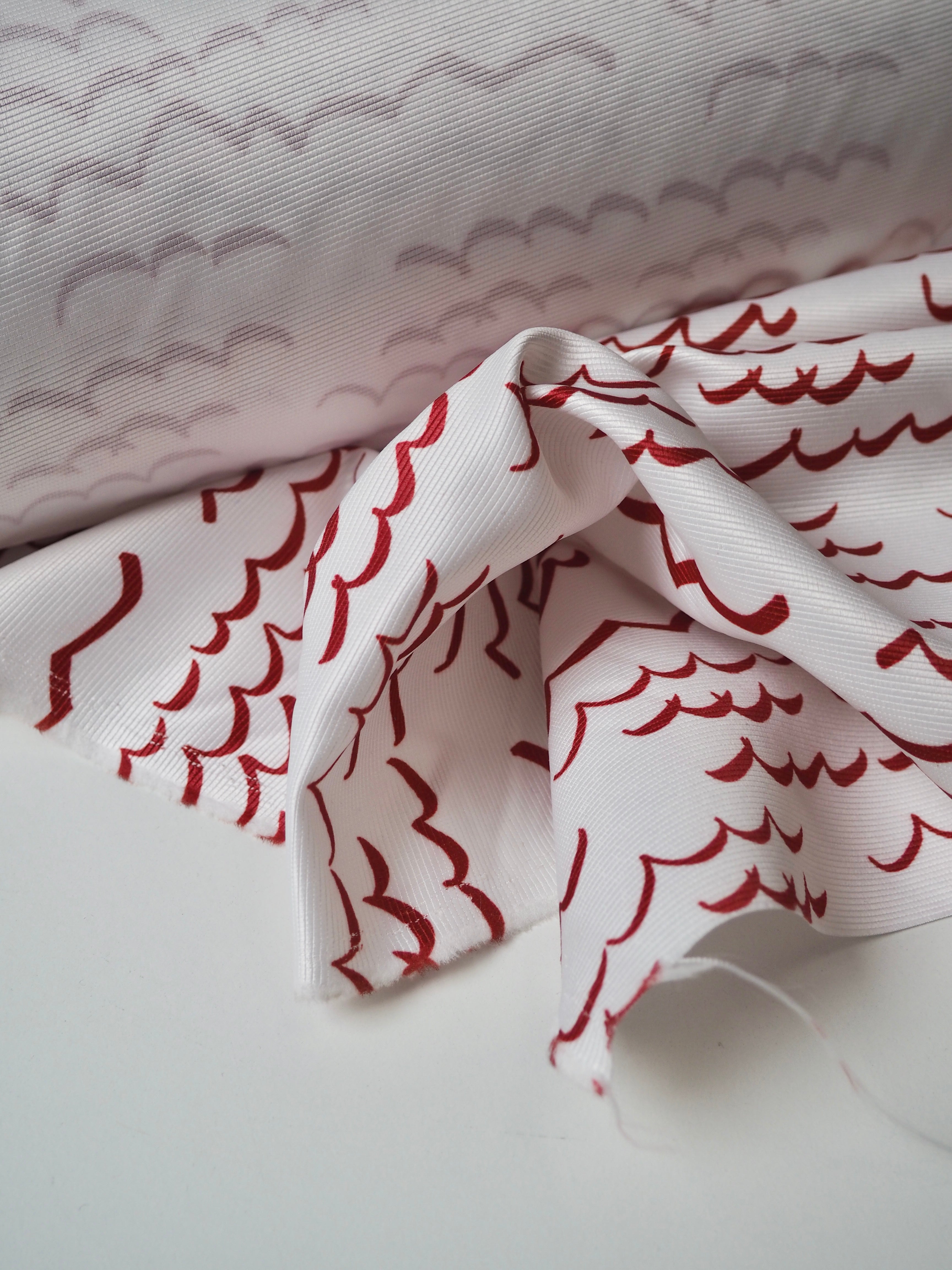 This ex-designer fabric is a satin faille. Red wavey lines are printed across a white background. It's a bespoke print from a popular London designer. It's medium weight with amazing structure and decent thickness. It has incredible sheen and a lovely sleek handle. Great for décor, upholstery, and structured garments and accessories!