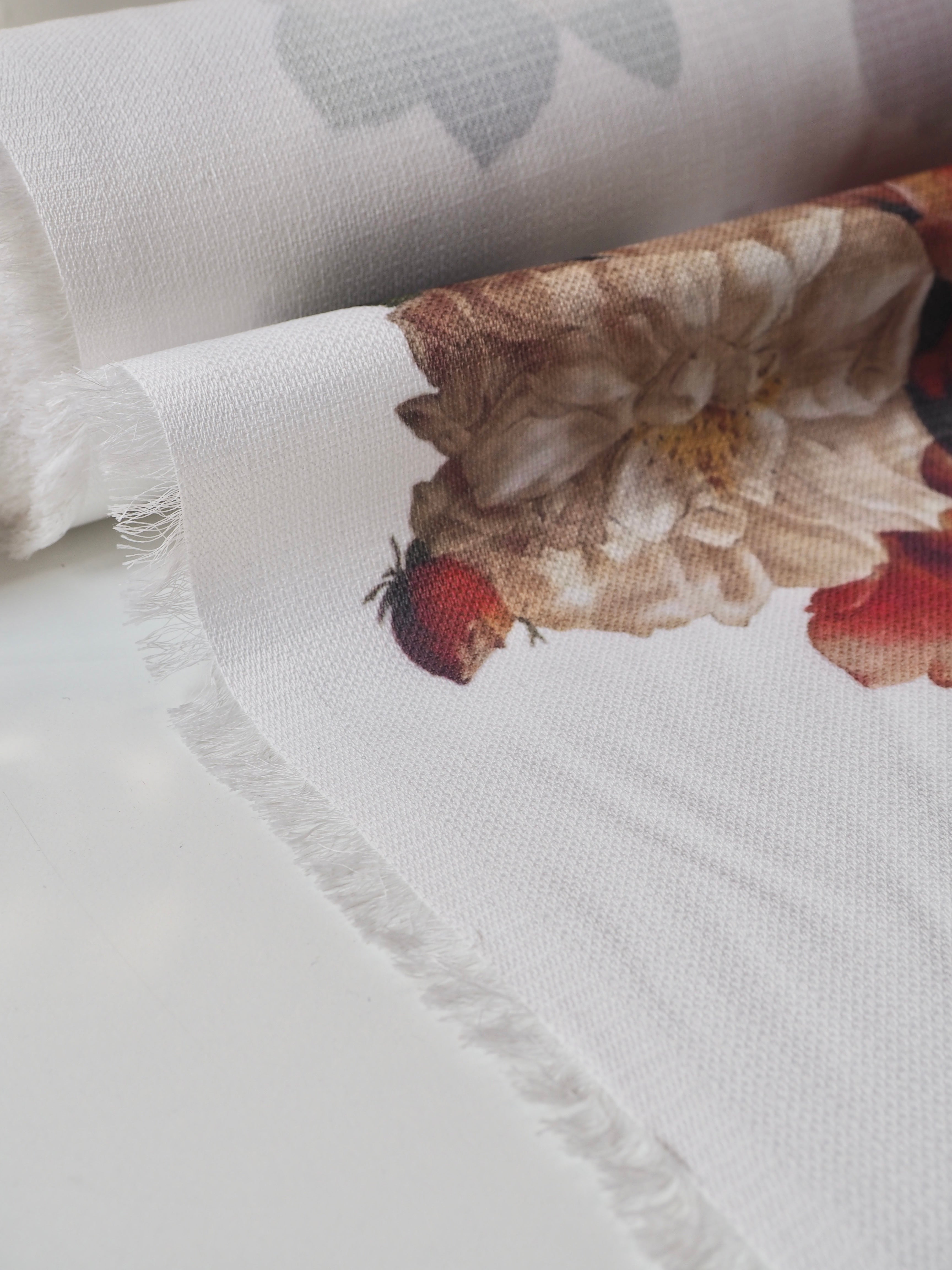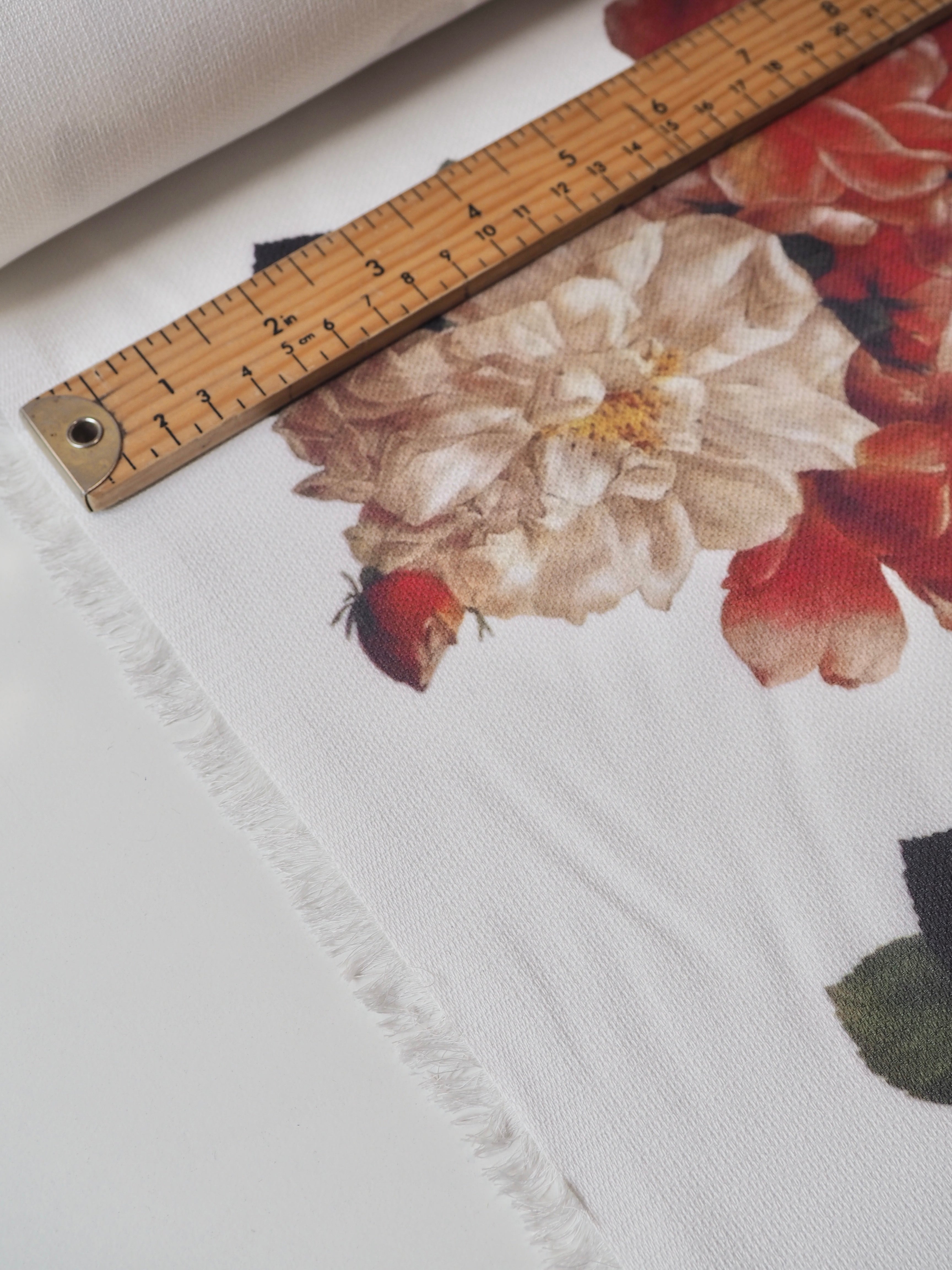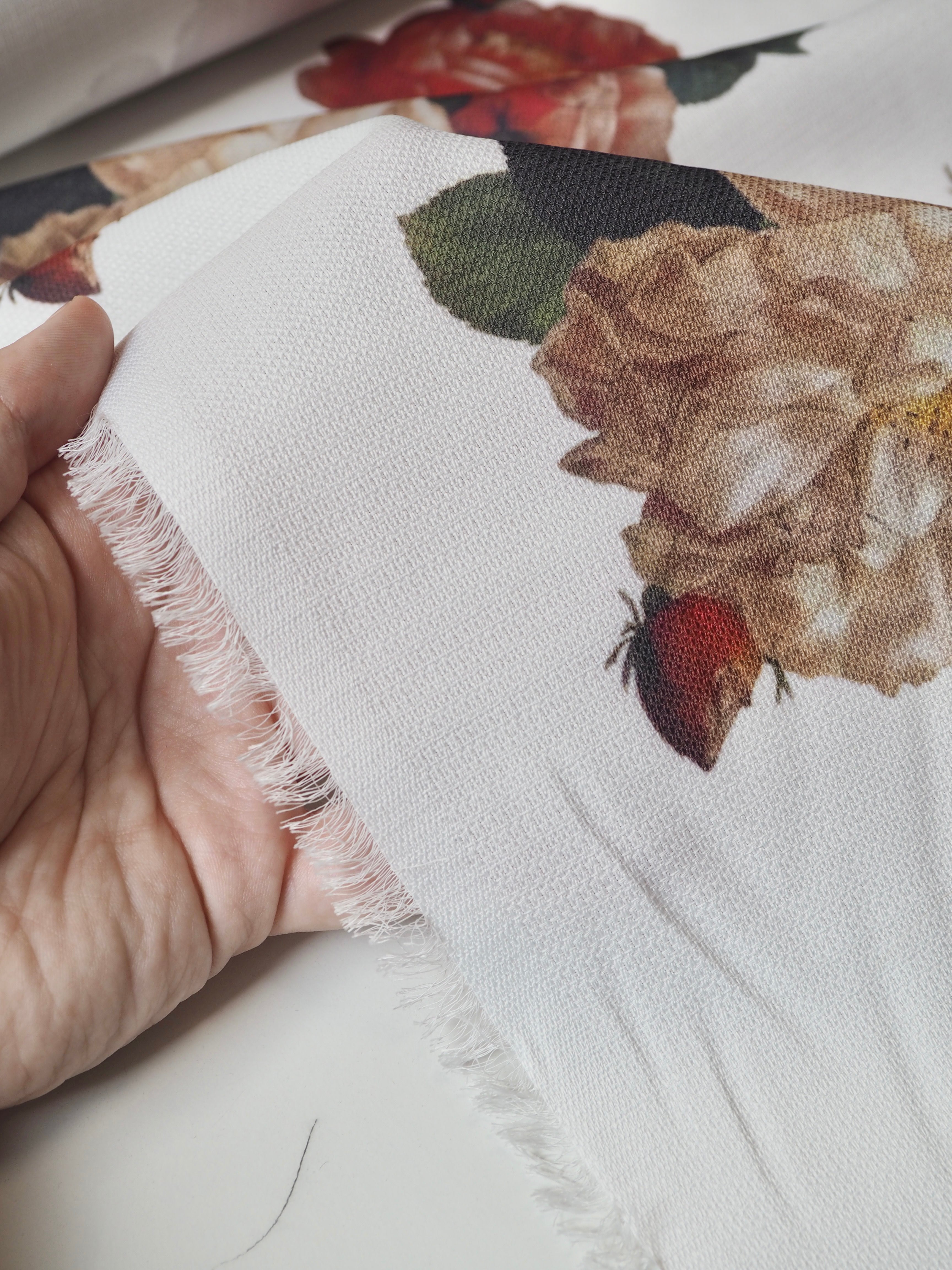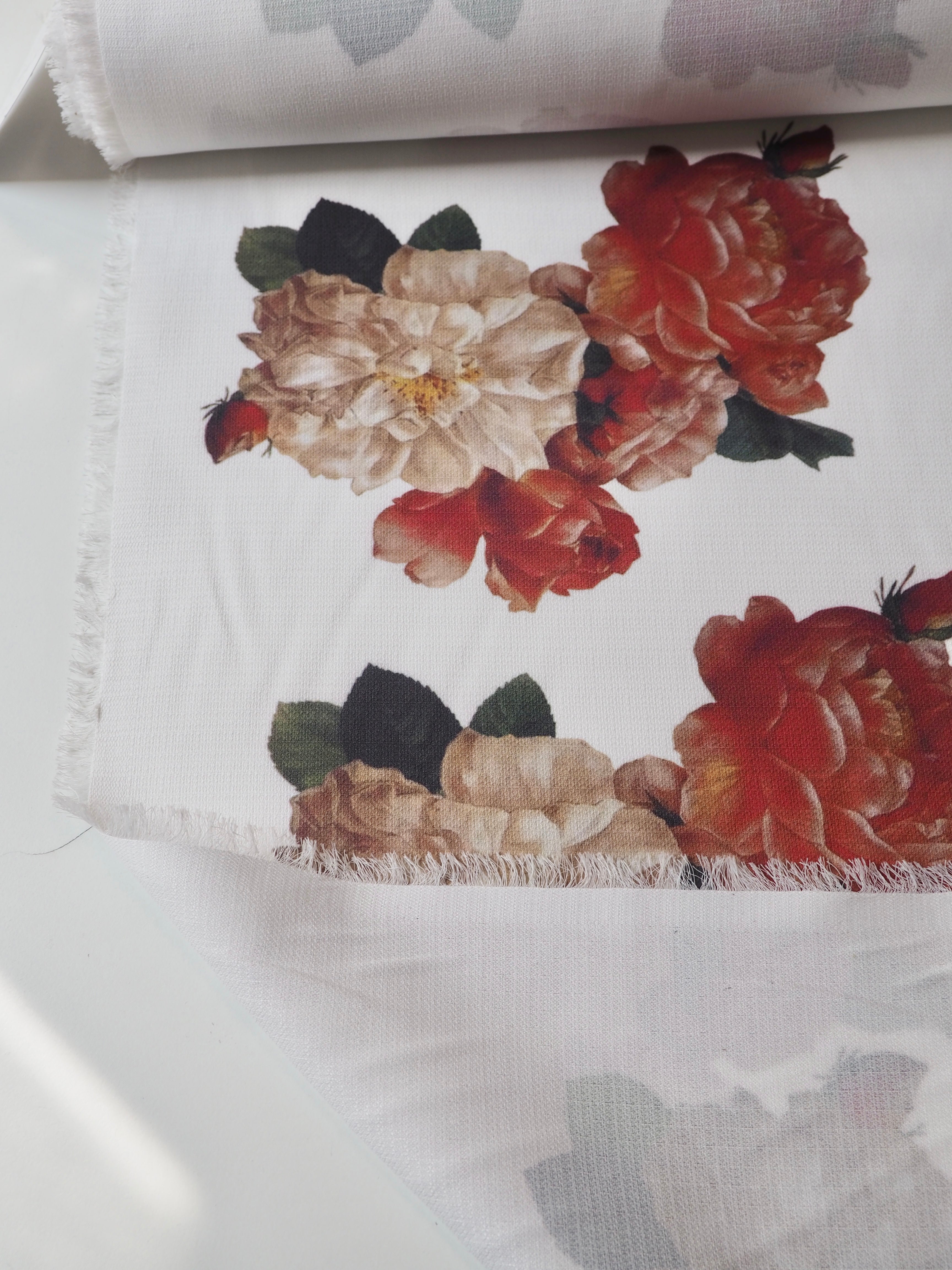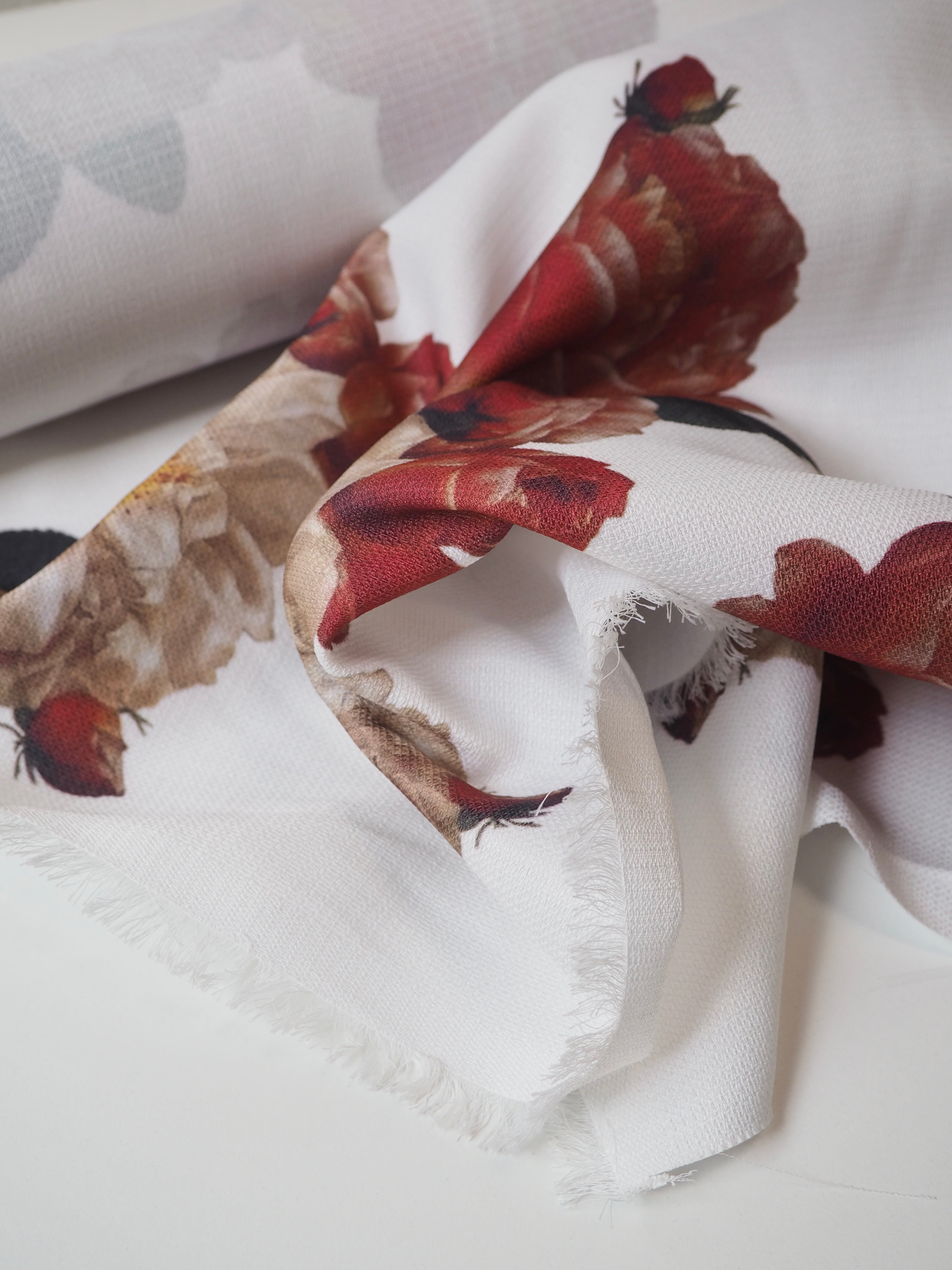 This ex-designer fabric is a floral crepe. Red and cream flowers are printed across a white background. It has smoother crepe handle and texture, and is quite sturdy. Light to medium weight with a nice drape and decent structure. Opaque and perfect for light jacket or cushion!
