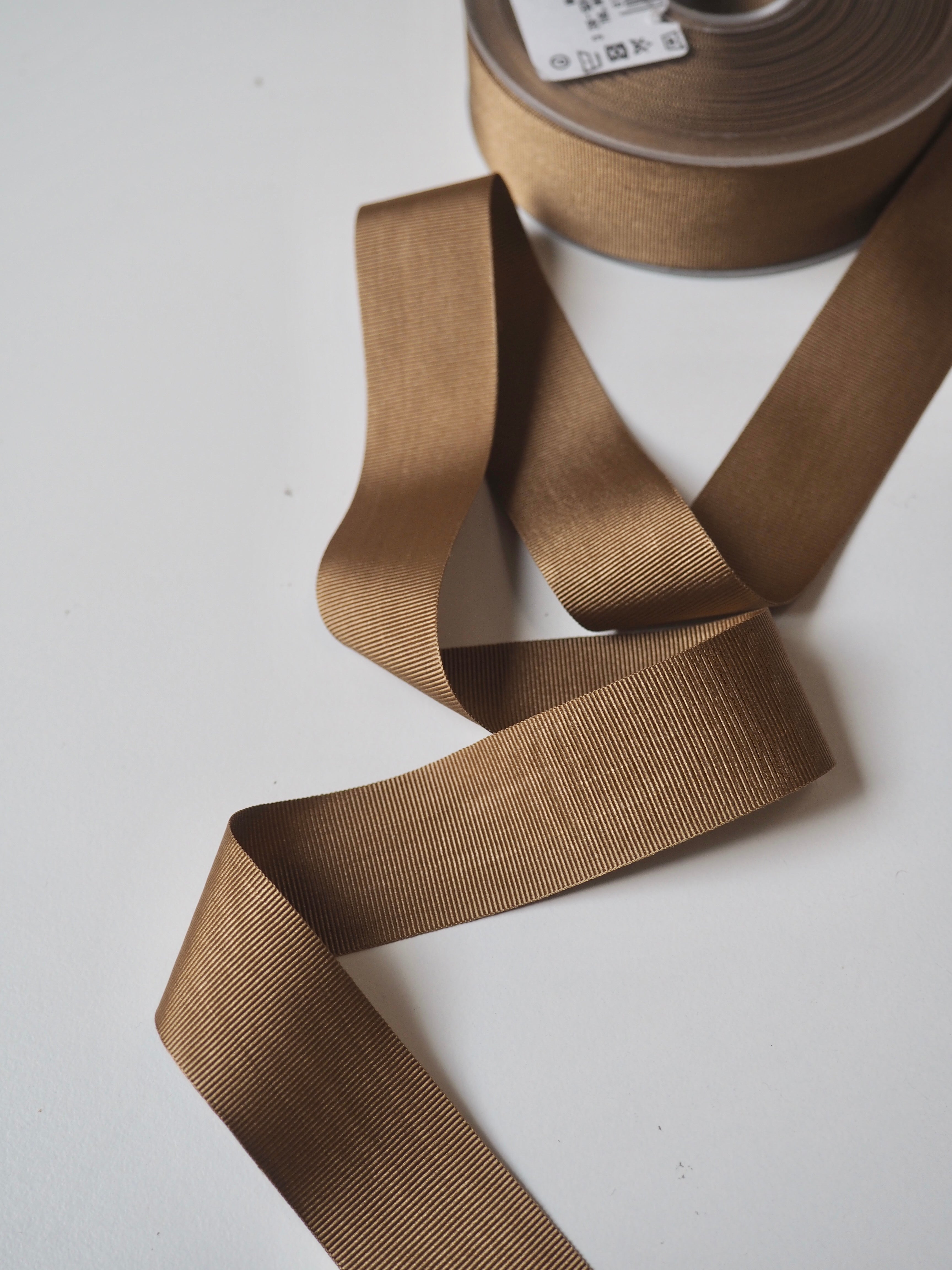 This ex-designer trim is a grosgrain ribbon. Both sides have a ribbed weave that runs width-ways across the ribbon, with a slight sheen finish. It has a soft drape so would be perfect as straps for a dress or even to wrap presents!