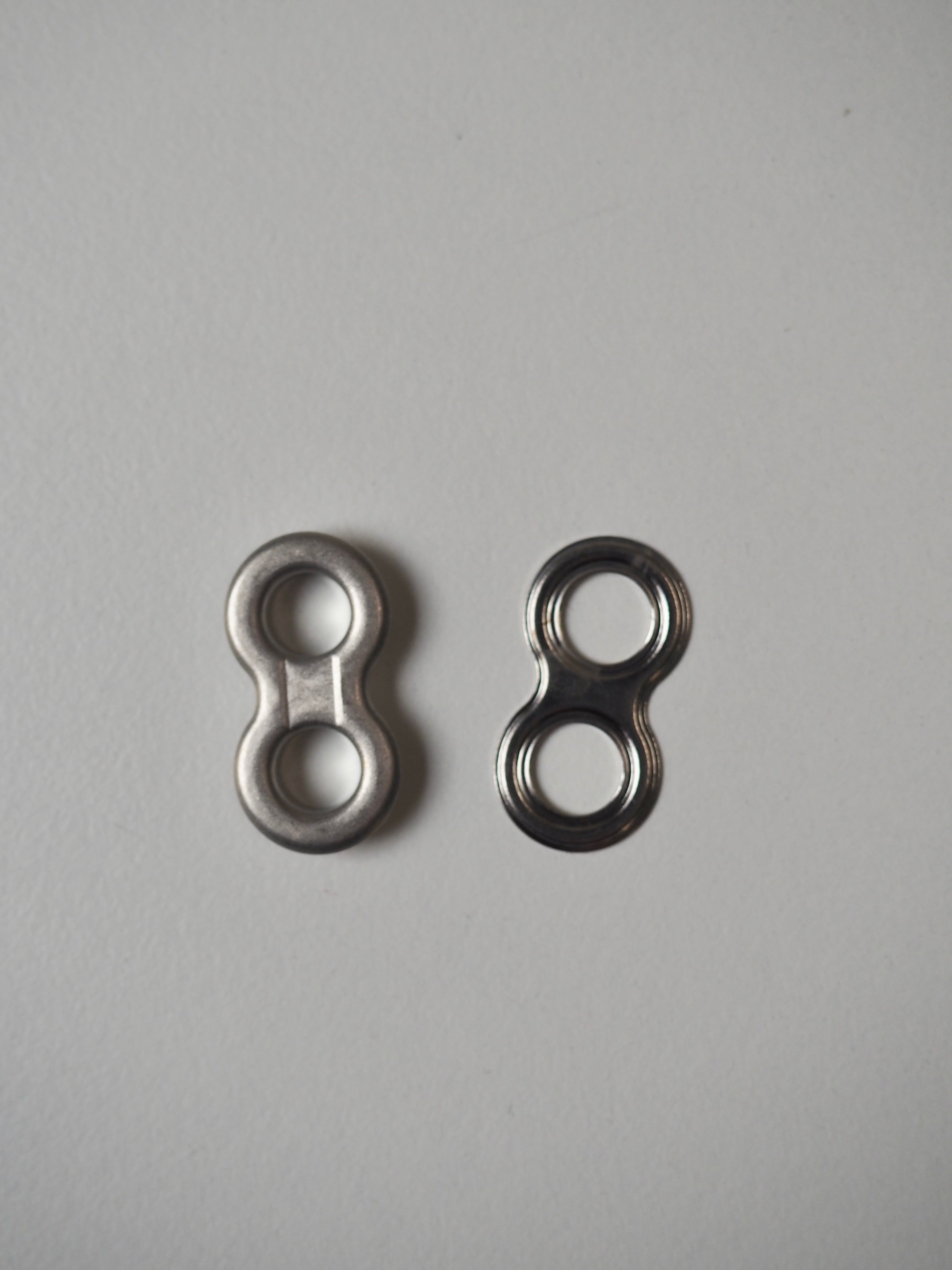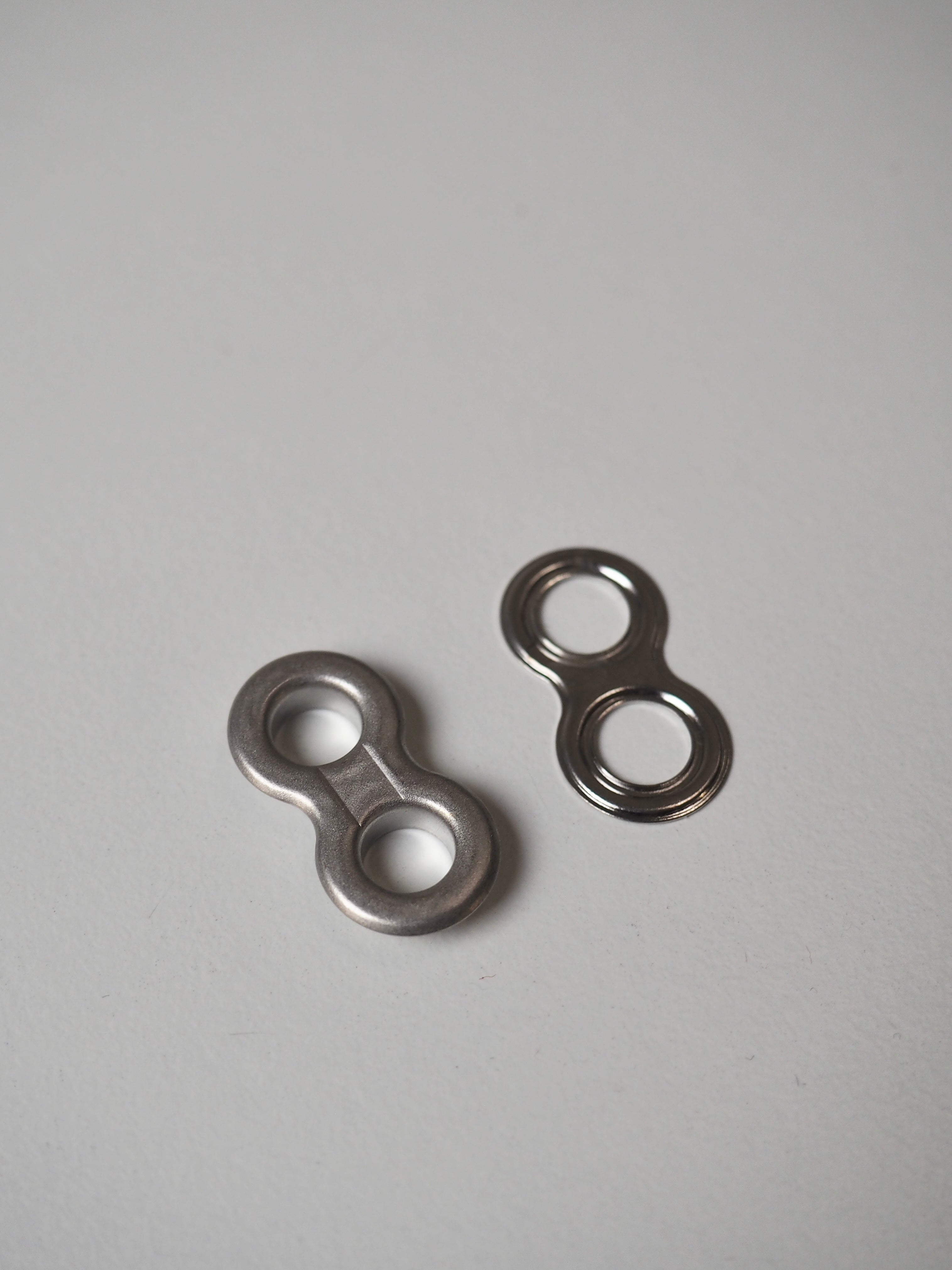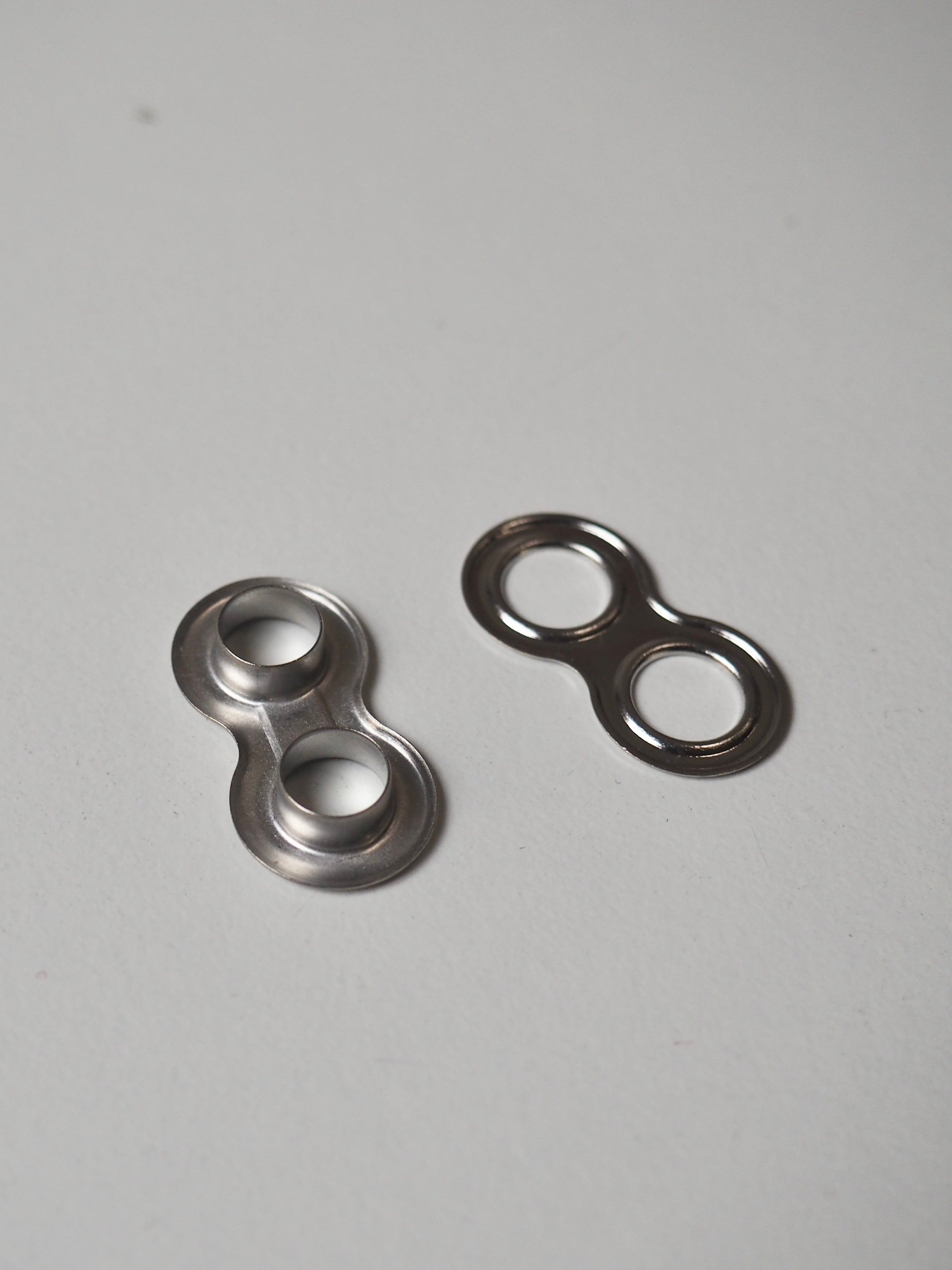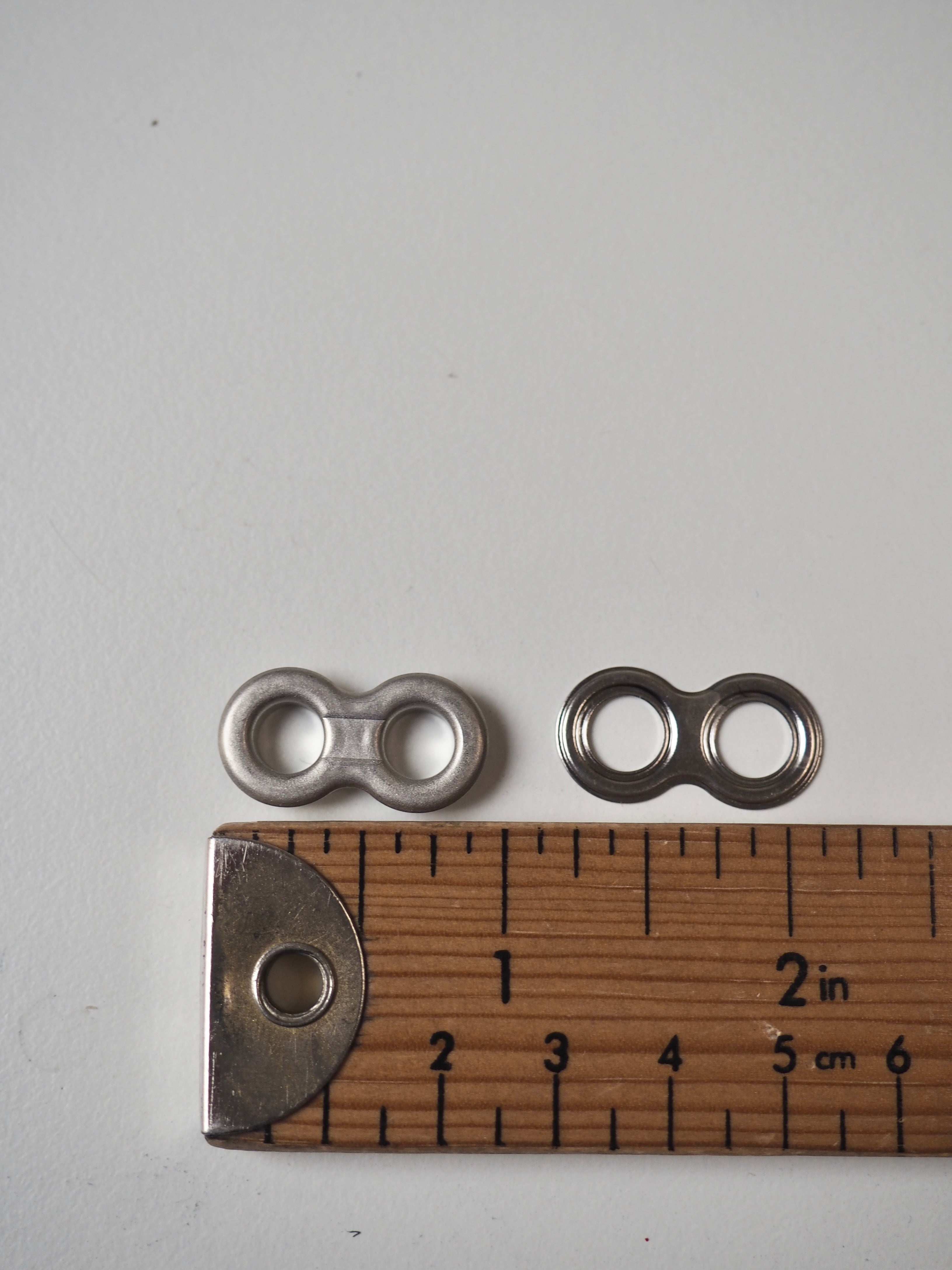 This ex-designer hardware is a double eyelet. It's lightweight, with a shiny finish. A great addition to your garment for lacing, attaching accessories, and being creative!