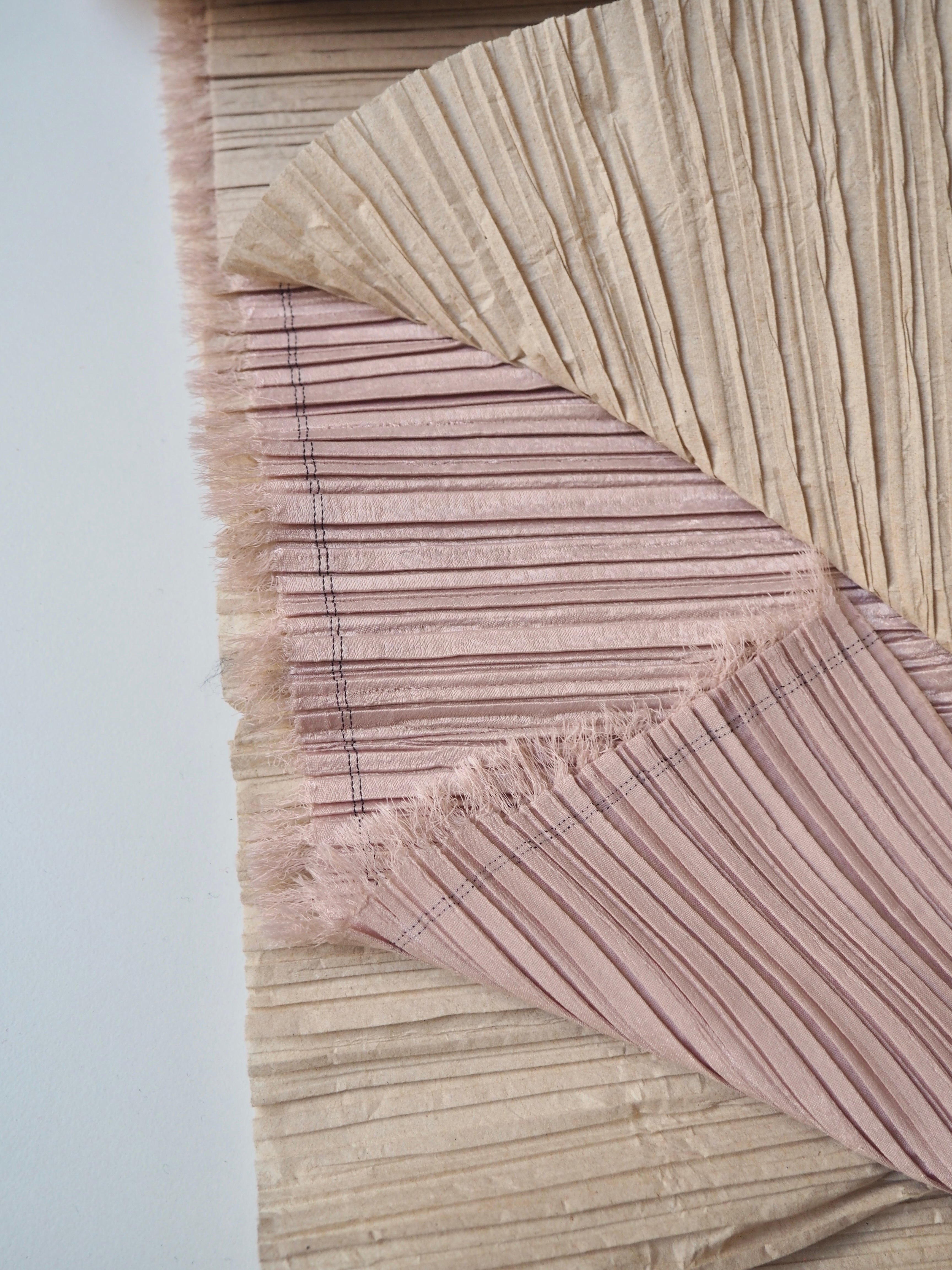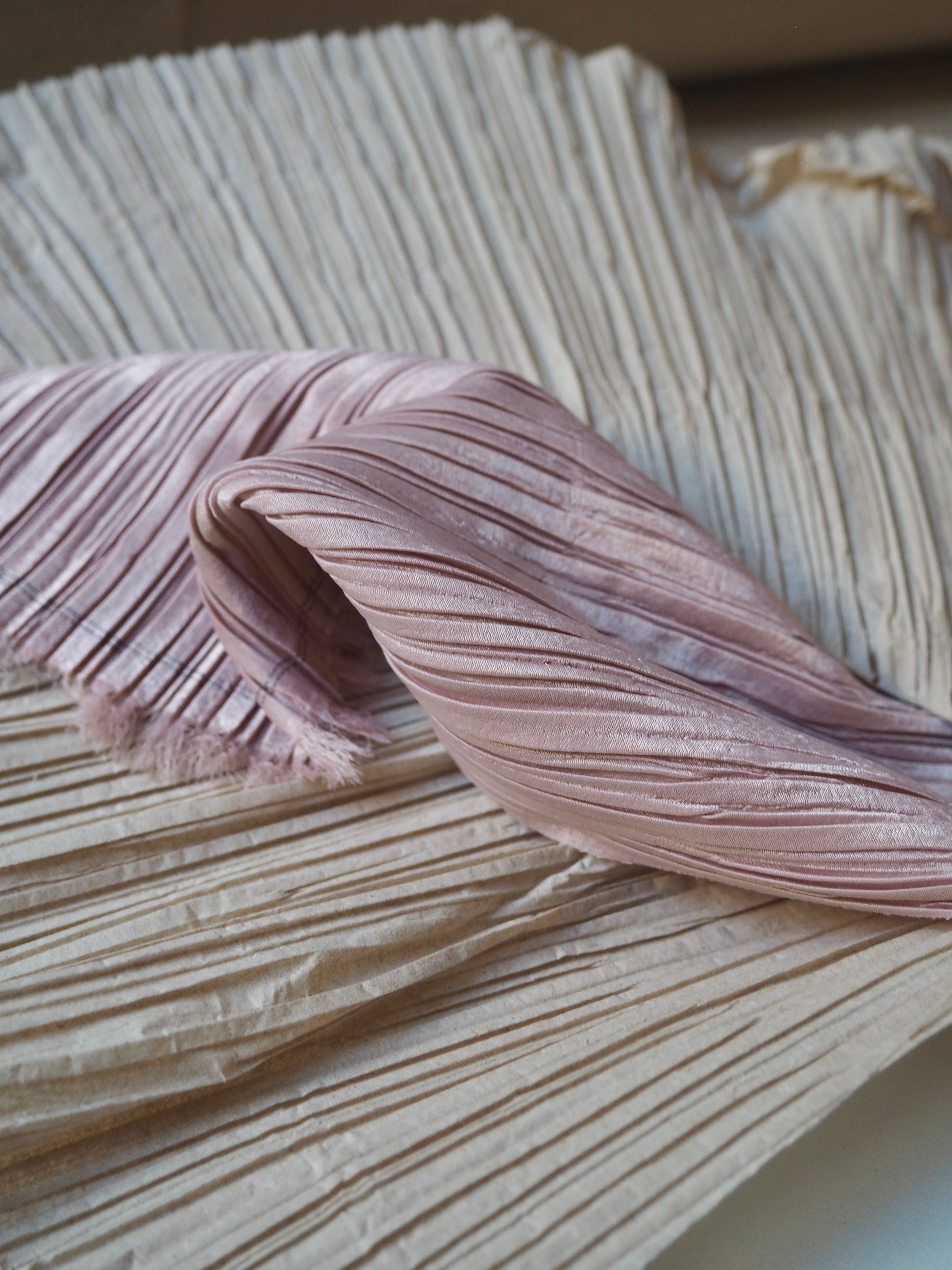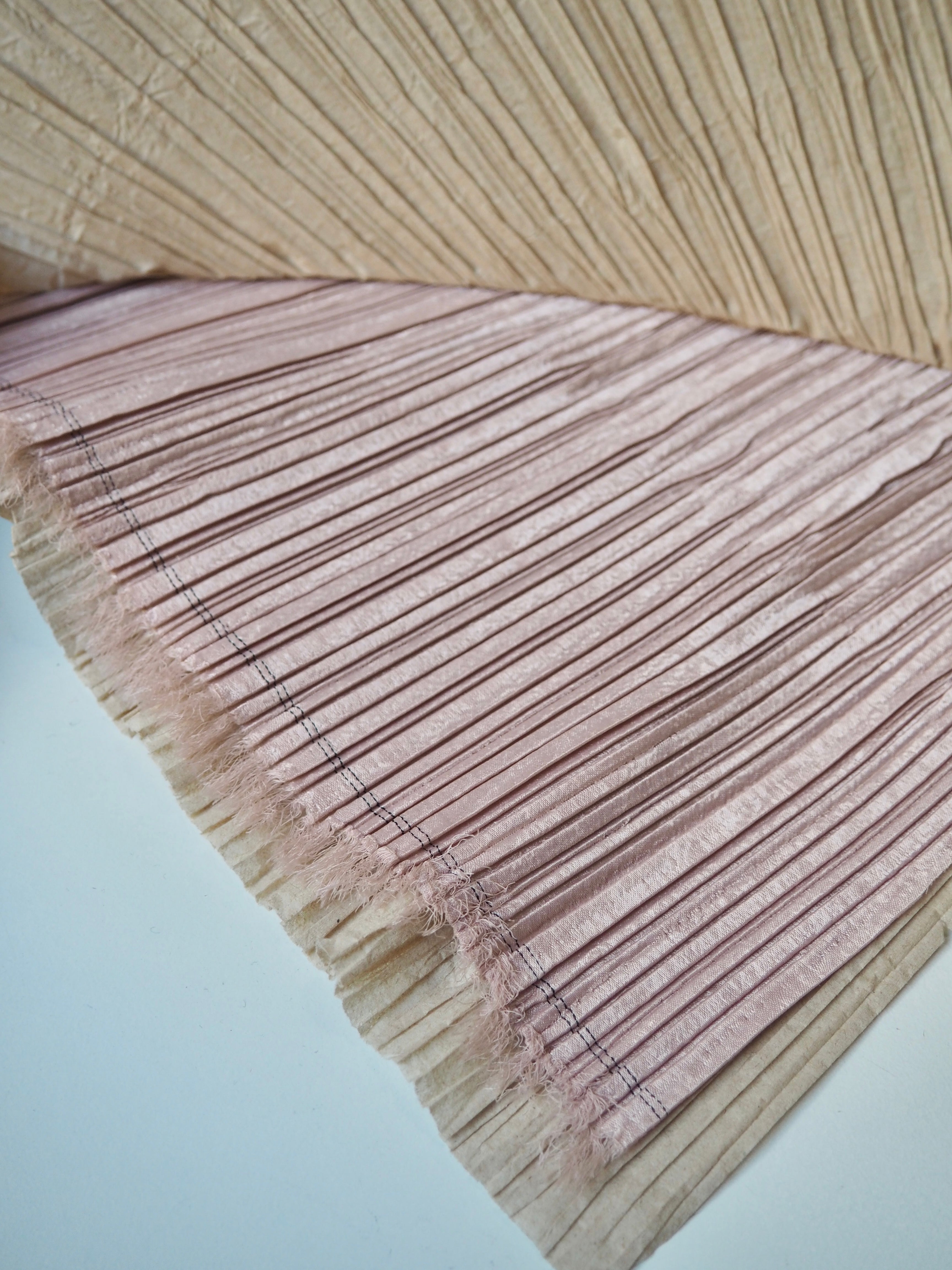 This ex-designer fabric is a pre-pleated satin. It's a luminous sheen pink-y beige satin with a plissé pleated finish. The pleating transforms this cloth to give it a unique structure with wonderful movement. Opaque with a soft and pliant handle. Has the perfect bounce for an elevated skirt or dress! Perfect for a bridesmaids! We sell this cloth by the metre pre-pleated, but stretched out it becomes up to 50% more than it's cut length.