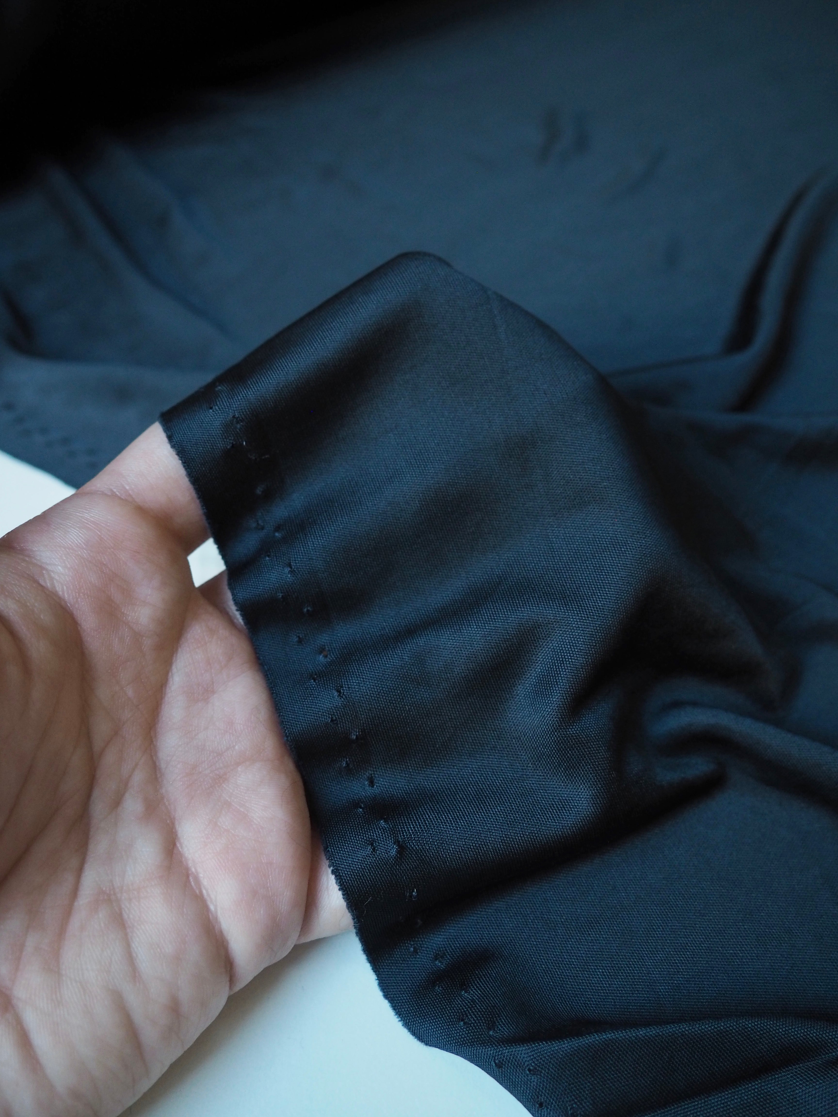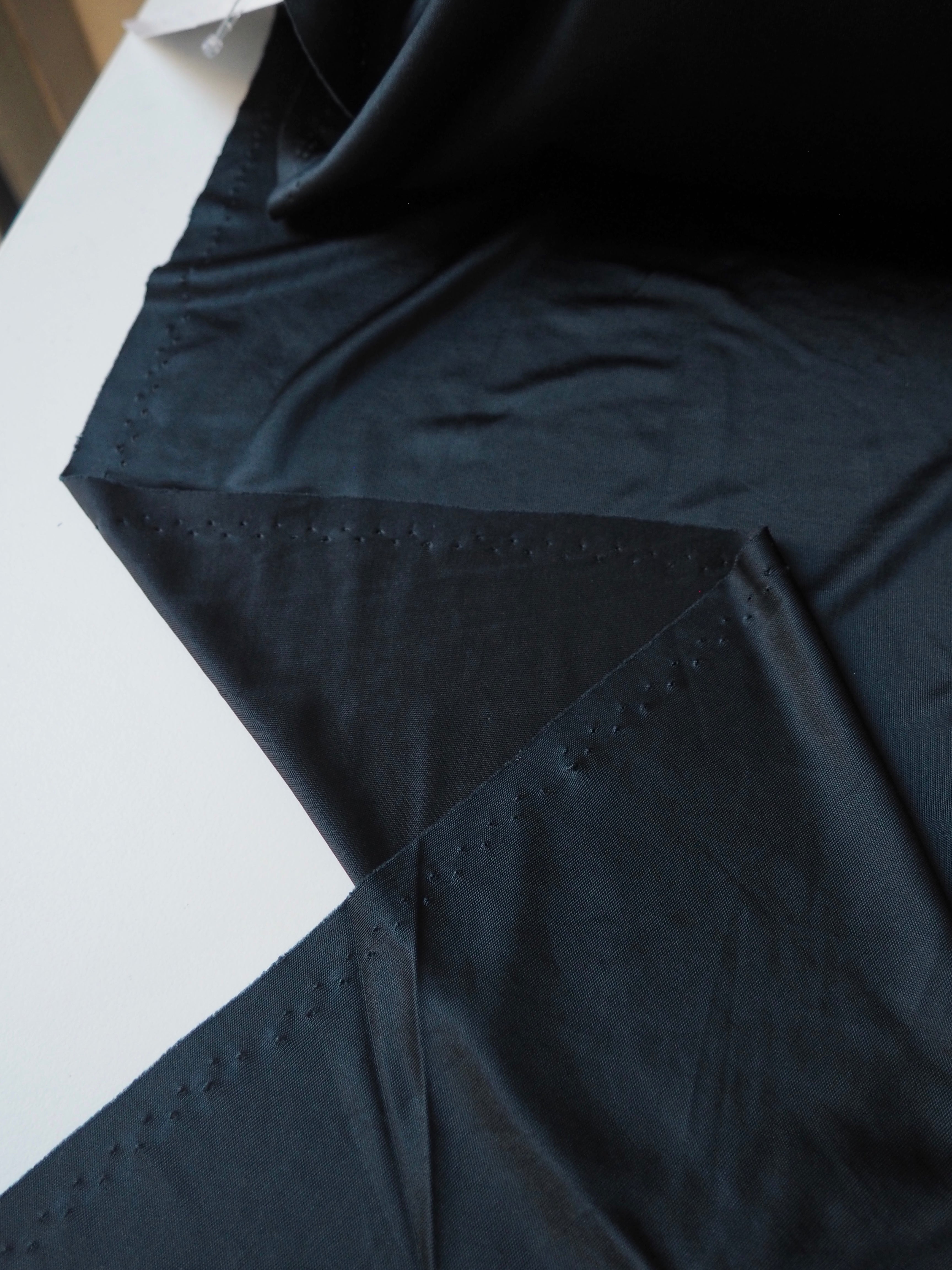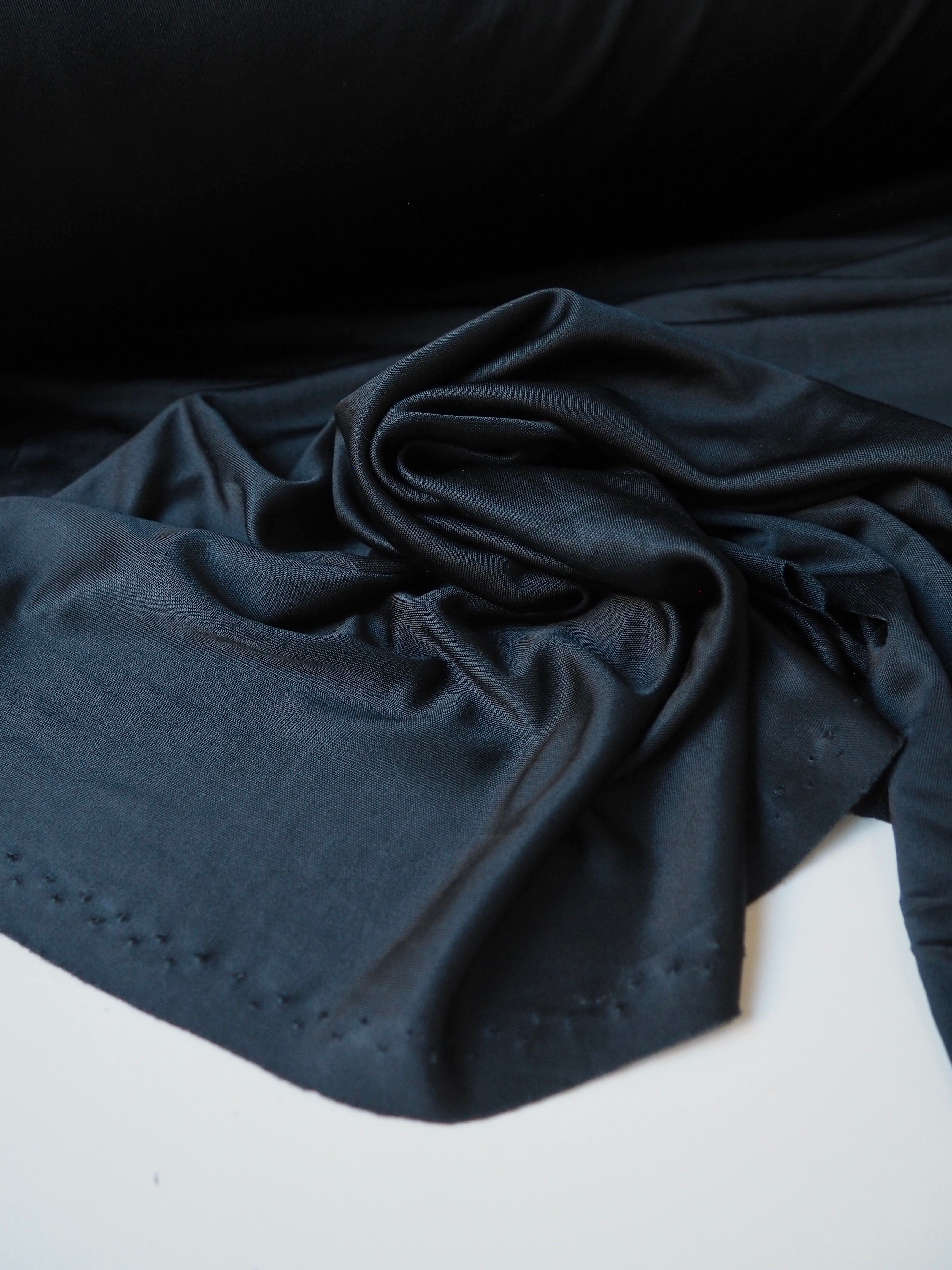 This ex-designer fabric is a viscose jersey. Smooth and drapey, it's so lovely and eye-catching with a satin finish. It's lightweight and opaque. About 30% stretch width-ways and amazing recovery. So sleek, comfortable and breathable. In a rich dark navy/black shade. Would be perfect for fitted tops but also slinky dresses!